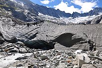 Dammagletscher: Gesteinsmaterial vom Gletschervorfeld und der Gletscherzunge des Dammagletschers bei etwa 2100 m. ü. M. in der Zentralschweiz. Das Gletschervorfeld ist frei von Pflanzen und besteht aus steinigem Untergrund. Die Gletscherzunge ist mit feinem Gestein bedeckt.