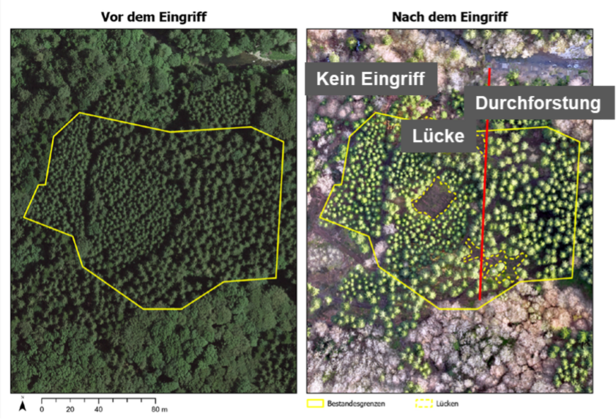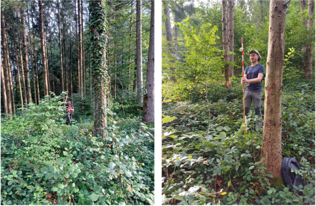 Das Projekt basiert auf Vorarbeiten seitens WSL und dem Kanton Fribourg (FR). In einzelnen Pilotbeständen des Kantons Fribourg wurden sogenannte «experimentelle Holzschläge» durchgeführt (Abb. 1), deren Erfolg jetzt mittels einer Pilotinventur des Bestandes und der Verjüngung geprüft wird (Abb. 2).