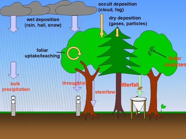 - Erfassen der Gesamtdeposition (total atmospheric deposition) und somit der atmosphärischen Belastung, welcher das Waldökosystem ausgesetzt ist. Aus Freiland- und Bestandesniederschlag können mit Hilfe des Kronenaustauschmodells die Trocken- und Nassdeposition berechnet werden.