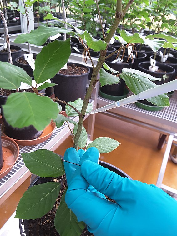 Um die Anfälligkeit von mitteleuropäischen forst- und landwirtschaftlichen Gehölzen zu testen, werden Infektionsversuche mit verschiedenen Stämmen des Bakteriums im Hochsicherheitsgewächshaus der WSL durchgeführt.