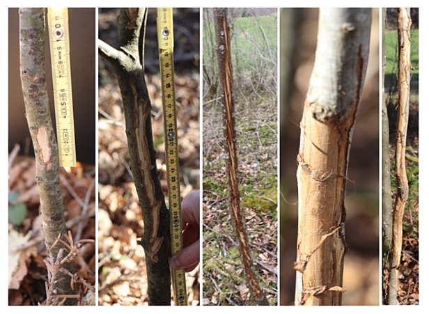 Die Breite der Schälungen wird in Kategorien beurteilt (Abb. Schälbreite) und die maximale Ausdehnung der Schälungen entlang der Stammachse gemessen.