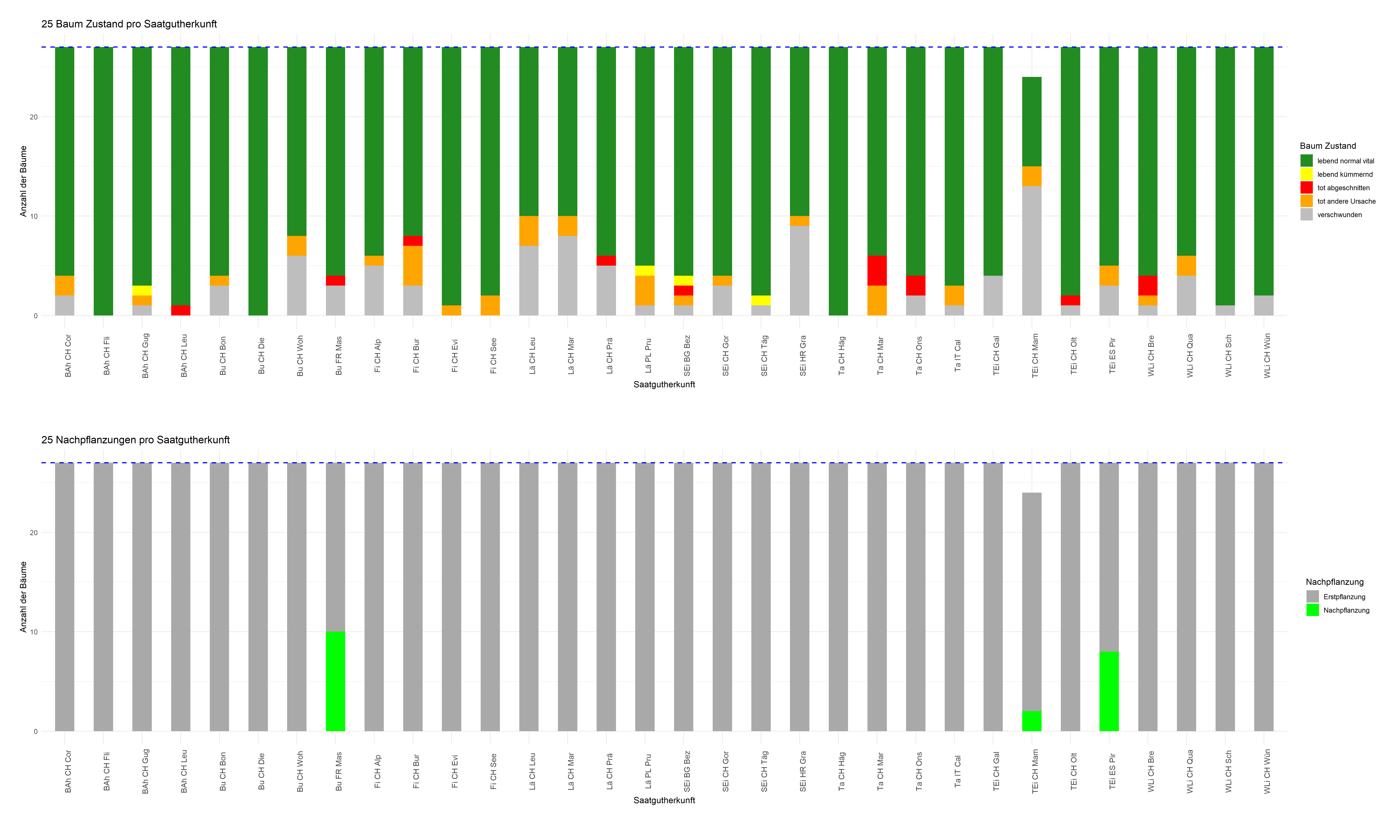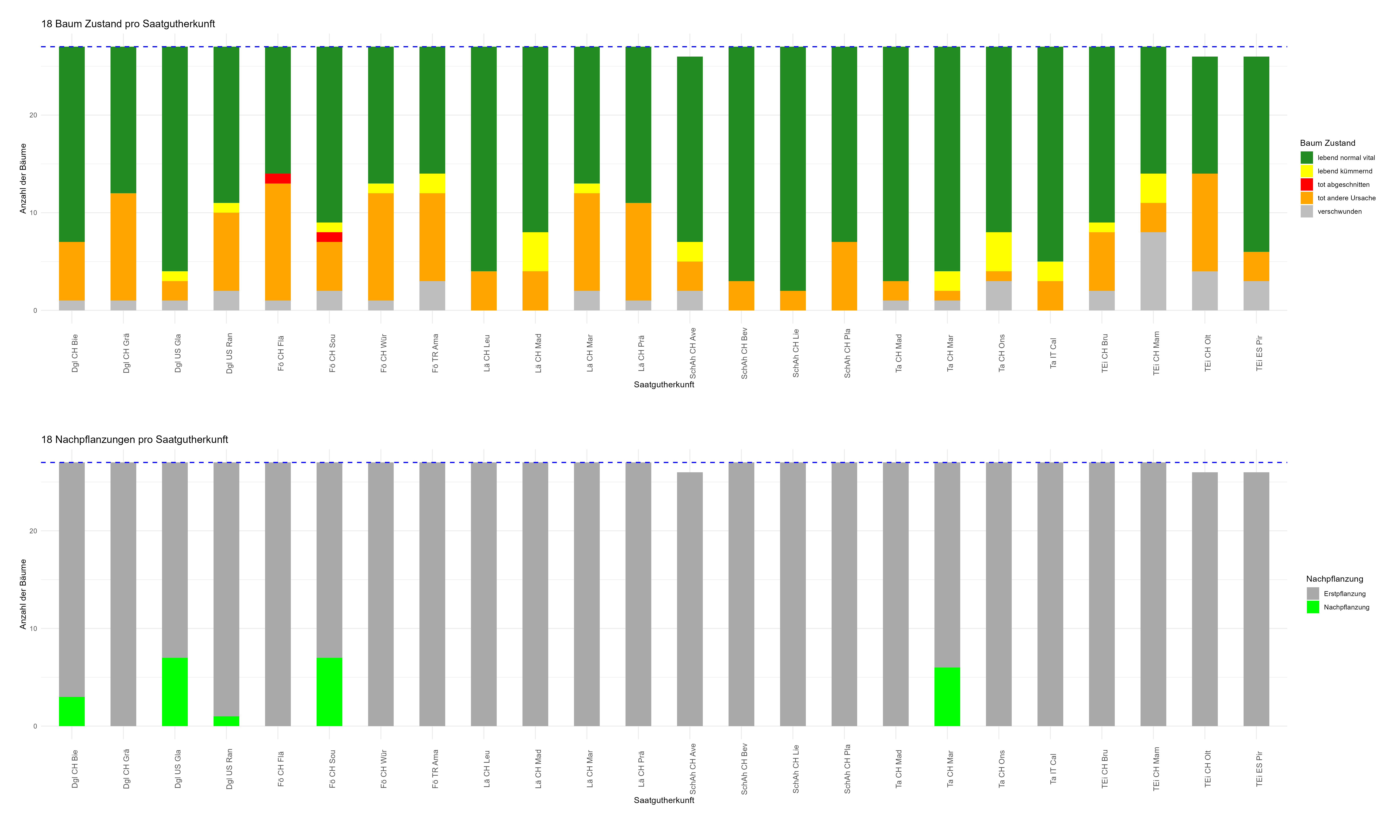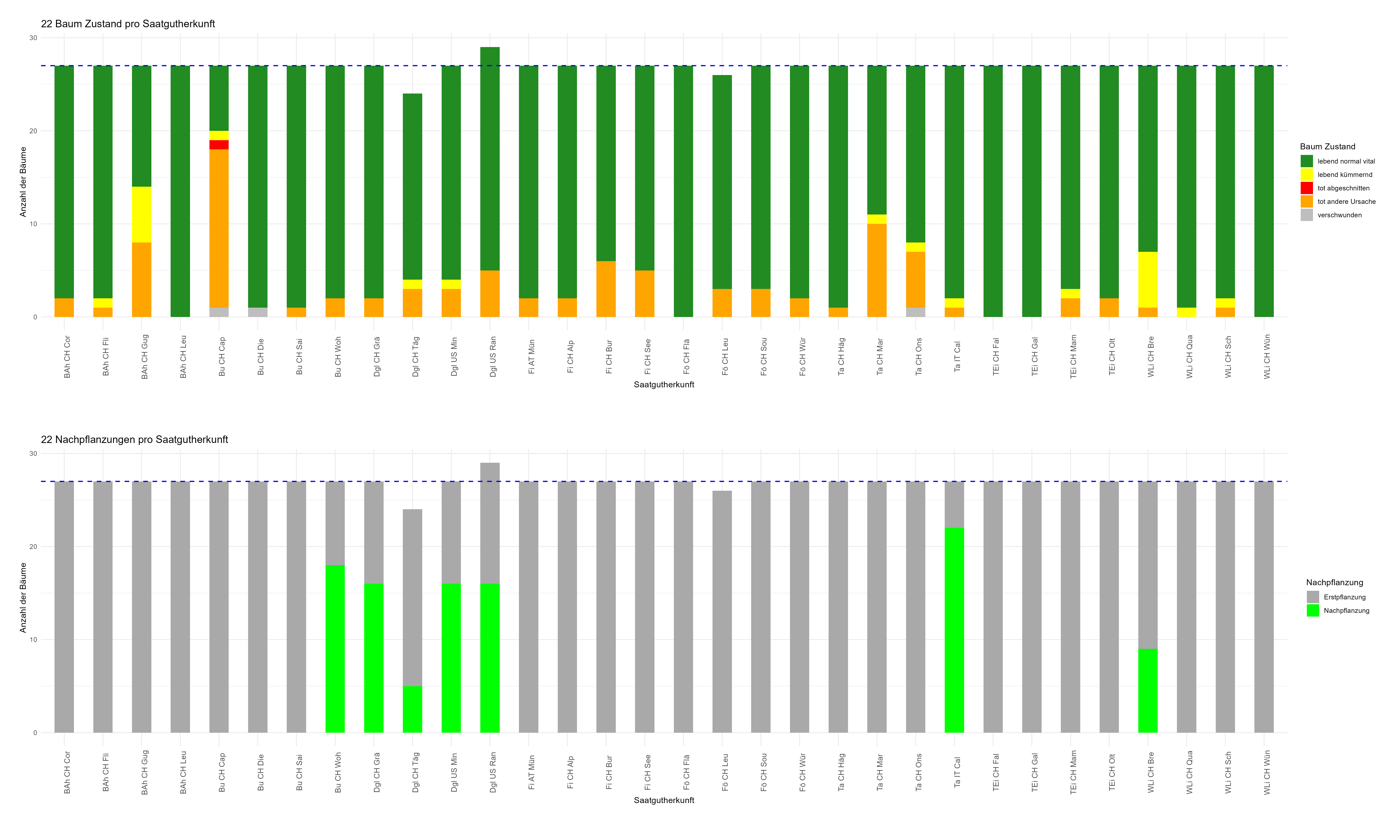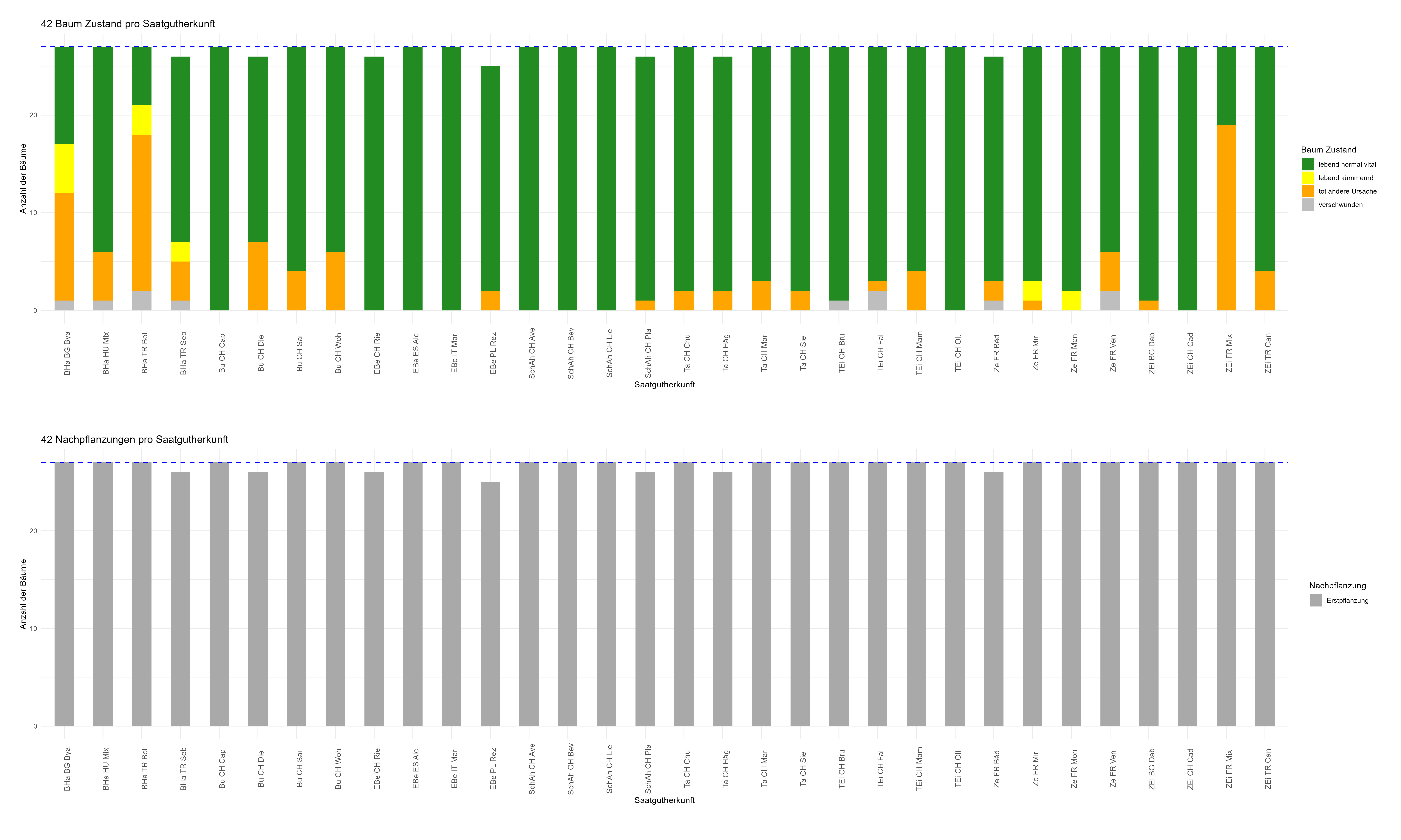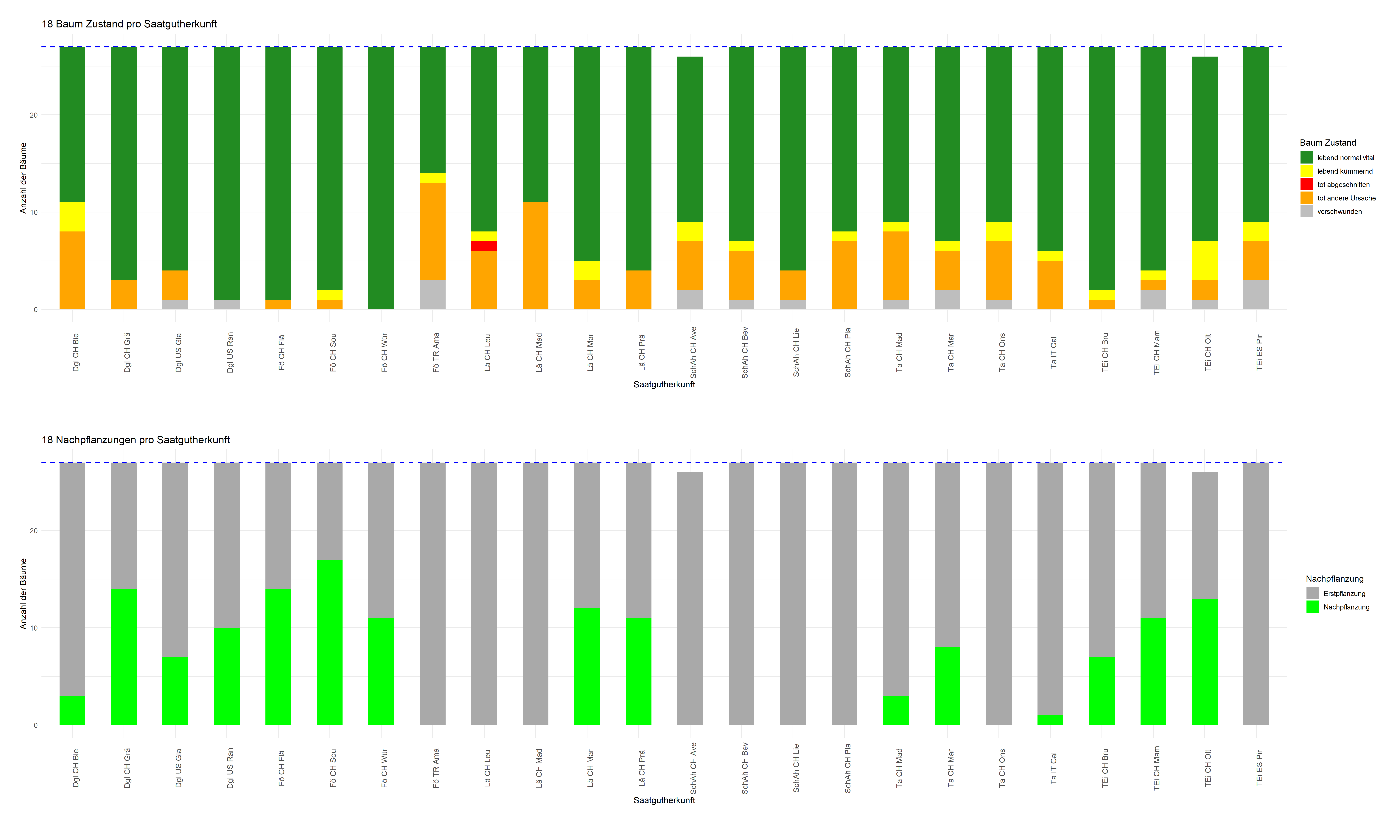 Anzahl BA = Anzahl der in einer Testpflanzung getesteten Baumarten, PP = Pflanzperiode, in welcher eine Testpflanzung eingerichtet wurde: 1 bedeutet Herbst 20 - Frühjahr 21, 2 bedeutet Herbst 21 - Frühjahr 22, 3 bedeutet Herbst 22 - Frühjahr 23. Flächendoku: Folien zu Boden und Klima pro Fläche. Zustand: pro Inventurzeitpunkt (Jahreszahl) Link zu 2 Figuren: Fig 1 Beurteilung des Zustands aller Pflanzen pro Saatgutherkunft pro Fläche (3 Wiederholungsblöcke x 9 Pflanzen= 27 Pflanzen pro Saatgutherkunft pro Fläche) Kategorien: lebend normal vital, lebend kümmernd, tot, abgeschnitten und verschwunden; Fig 2 Anzahl Pflanzen welche zum Inventurzeitpunkt bereits nachgepflanzt waren. Die Bezeichnung der Saatgutherkunft setzt sich auch dem Baumartenkürzel dem Herkunftsland und den ersten 3 Buchstaben der Herkunftsgemeinde zusammen. Baumartenkürzel: BAh Bergahorn, BHa Baumhasel, Bu Buche, Dgl Douglasie, EBe Elsbeere, Fi Fichte, Fö Föhre, Ki Kirsche, Lä Lärche, Nu Nussbaum, SAh Spitzahorn, SchAh Schneeballblättriger Ahorn, SEi Stieleiche, Ta Tanne, TEi Traubeneiche, WLi Winterlinde, Ze Zeder, ZEi Zerreiche