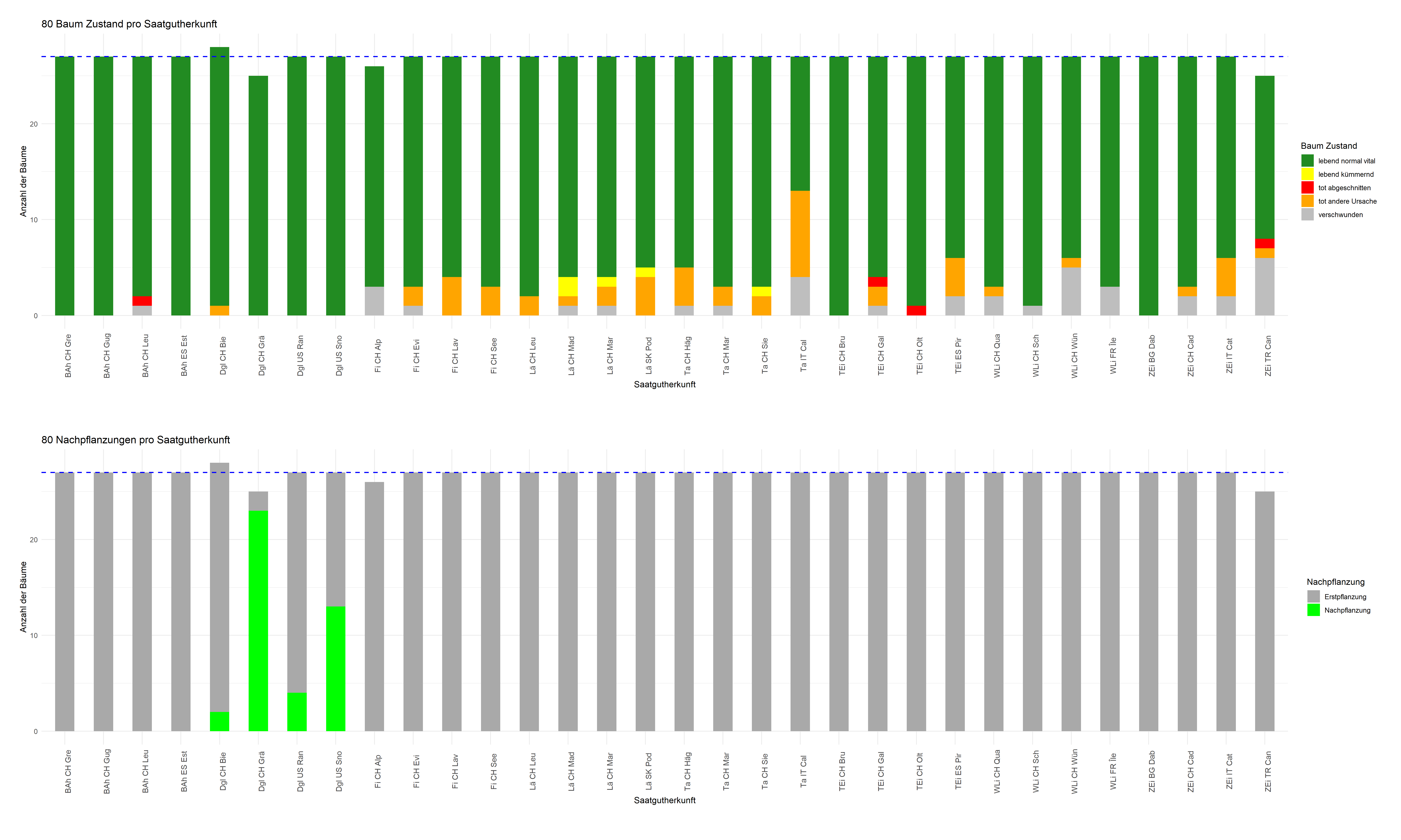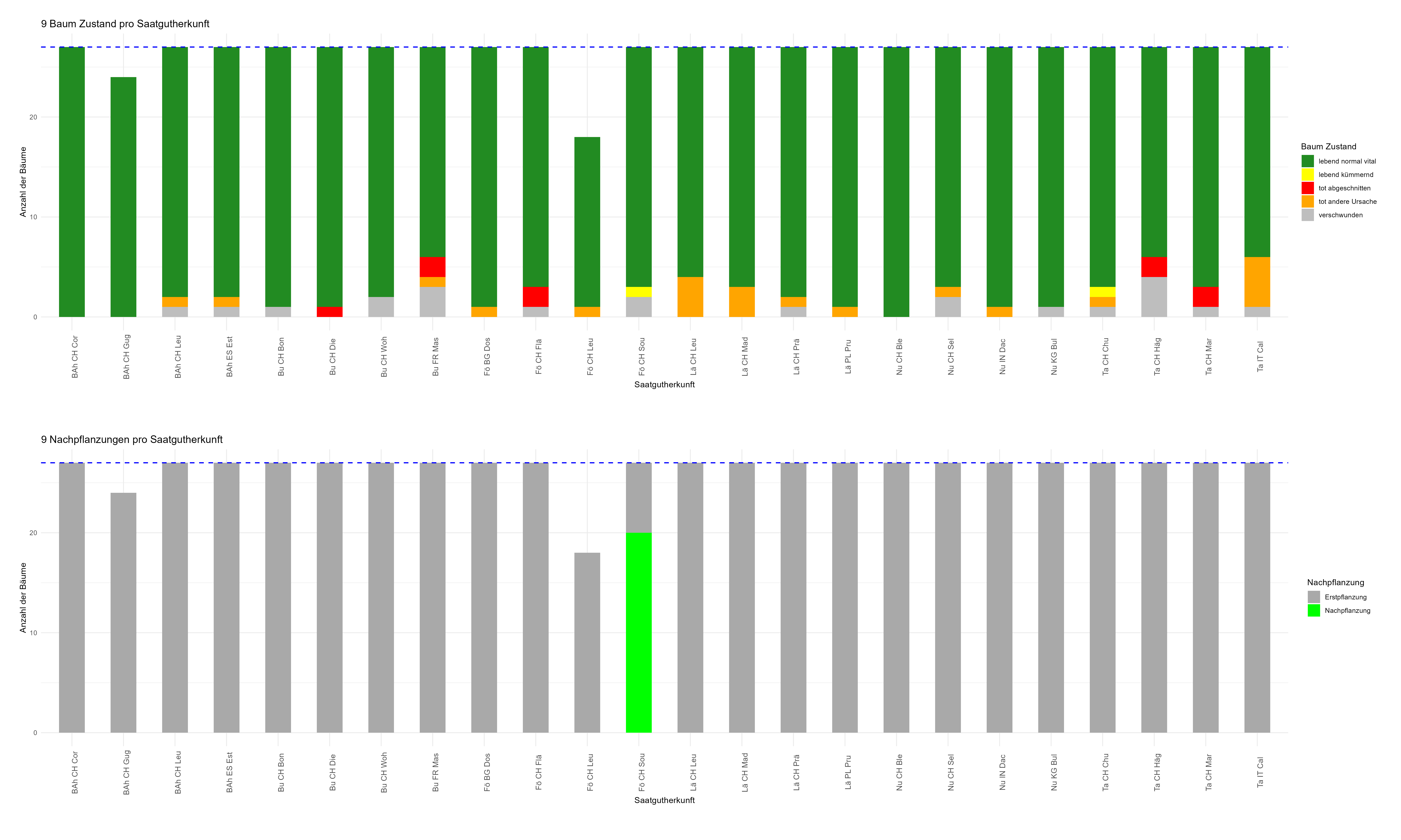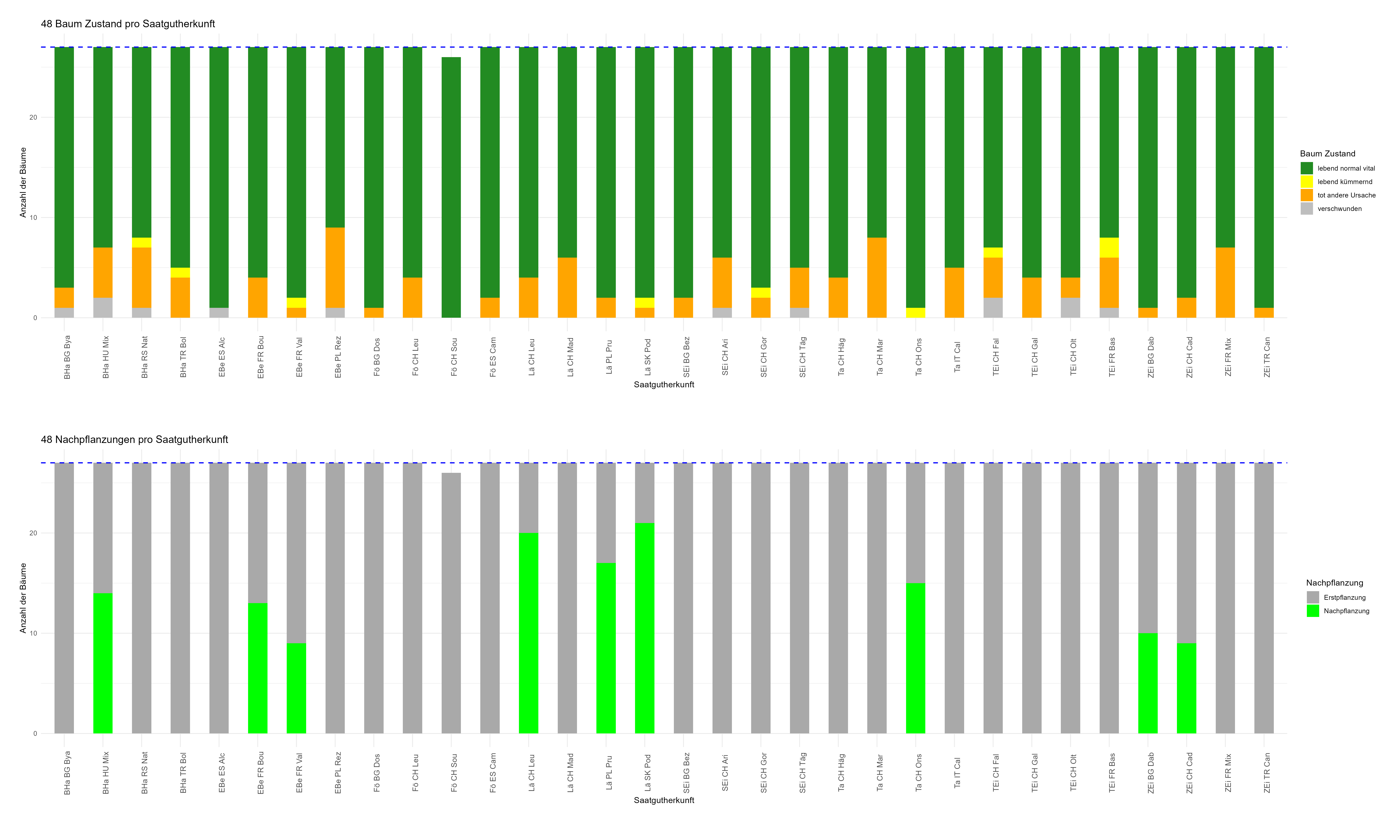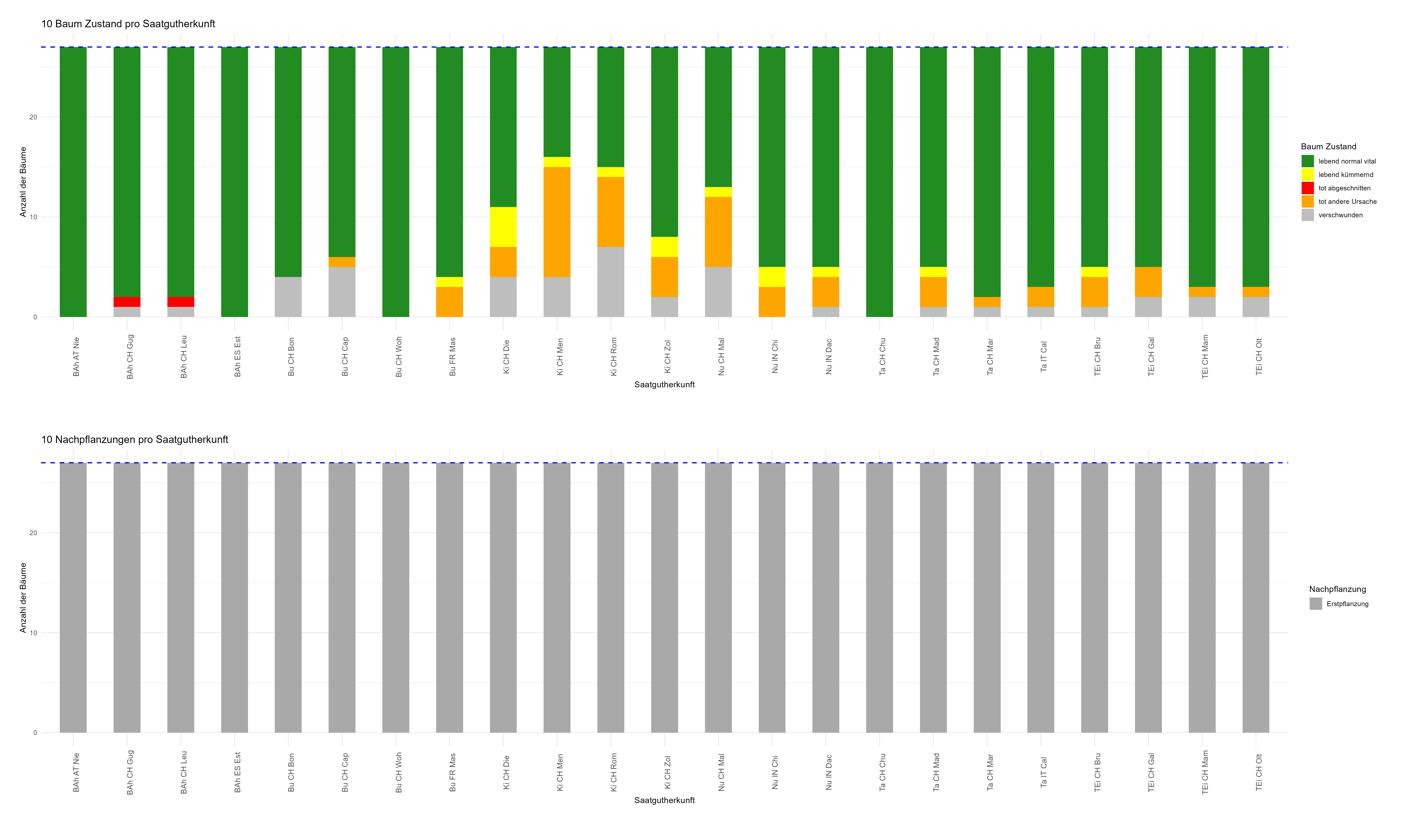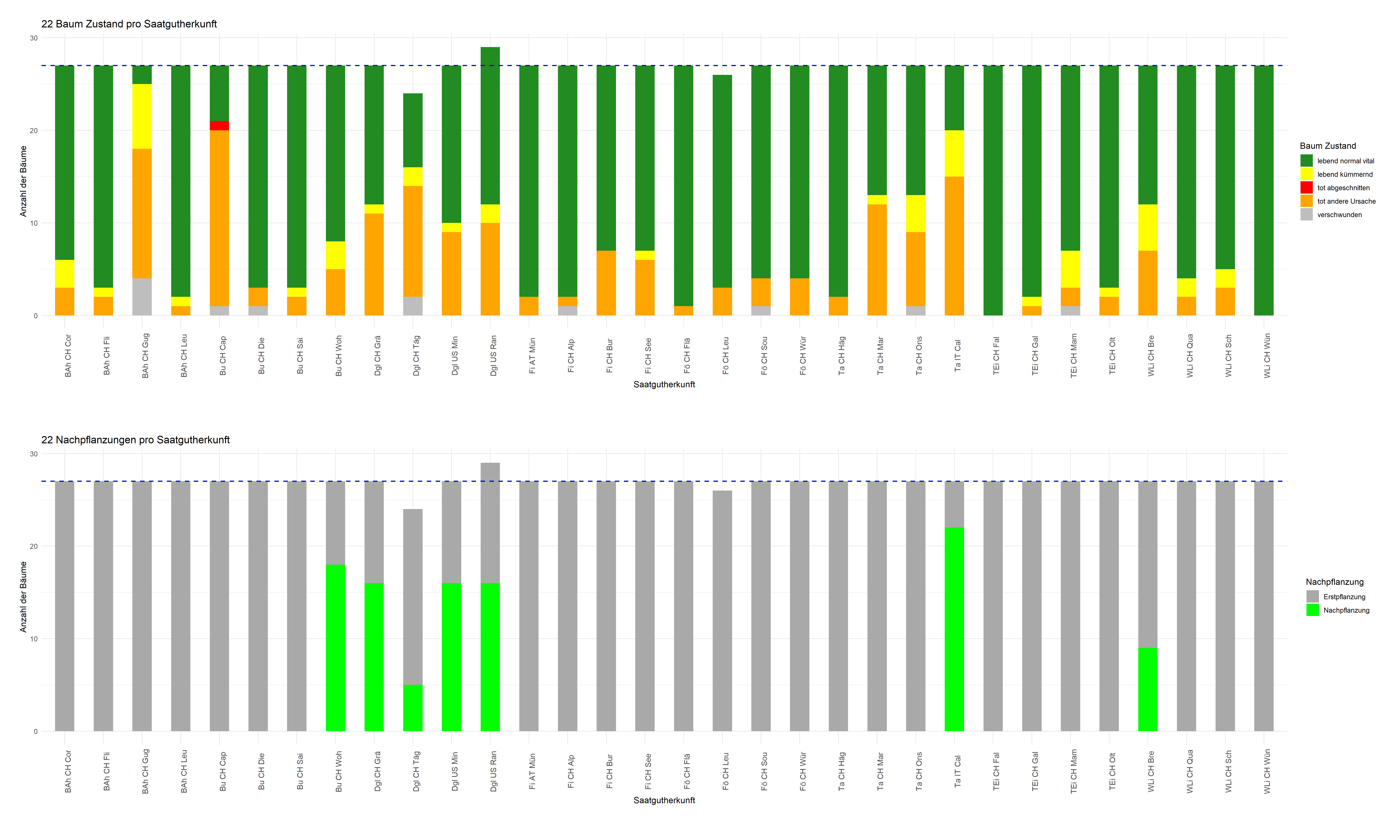 Anzahl BA = Anzahl der in einer Testpflanzung getesteten Baumarten, PP = Pflanzperiode, in welcher eine Testpflanzung eingerichtet wurde: 1 bedeutet Herbst 20 - Frühjahr 21, 2 bedeutet Herbst 21 - Frühjahr 22, 3 bedeutet Herbst 22 - Frühjahr 23. Flächendoku: Folien zu Boden und Klima pro Fläche. Zustand: pro Inventurzeitpunkt (Jahreszahl) Link zu 2 Figuren: Fig 1 Beurteilung des Zustands aller Pflanzen pro Saatgutherkunft pro Fläche (3 Wiederholungsblöcke x 9 Pflanzen= 27 Pflanzen pro Saatgutherkunft pro Fläche) Kategorien: lebend normal vital, lebend kümmernd, tot, abgeschnitten und verschwunden; Fig 2 Anzahl Pflanzen welche zum Inventurzeitpunkt bereits nachgepflanzt waren. Die Bezeichnung der Saatgutherkunft setzt sich auch dem Baumartenkürzel dem Herkunftsland und den ersten 3 Buchstaben der Herkunftsgemeinde zusammen. Baumartenkürzel: BAh Bergahorn, BHa Baumhasel, Bu Buche, Dgl Douglasie, EBe Elsbeere, Fi Fichte, Fö Föhre, Ki Kirsche, Lä Lärche, Nu Nussbaum, SAh Spitzahorn, SchAh Schneeballblättriger Ahorn, SEi Stieleiche, Ta Tanne, TEi Traubeneiche, WLi Winterlinde, Ze Zeder, ZEi Zerreiche