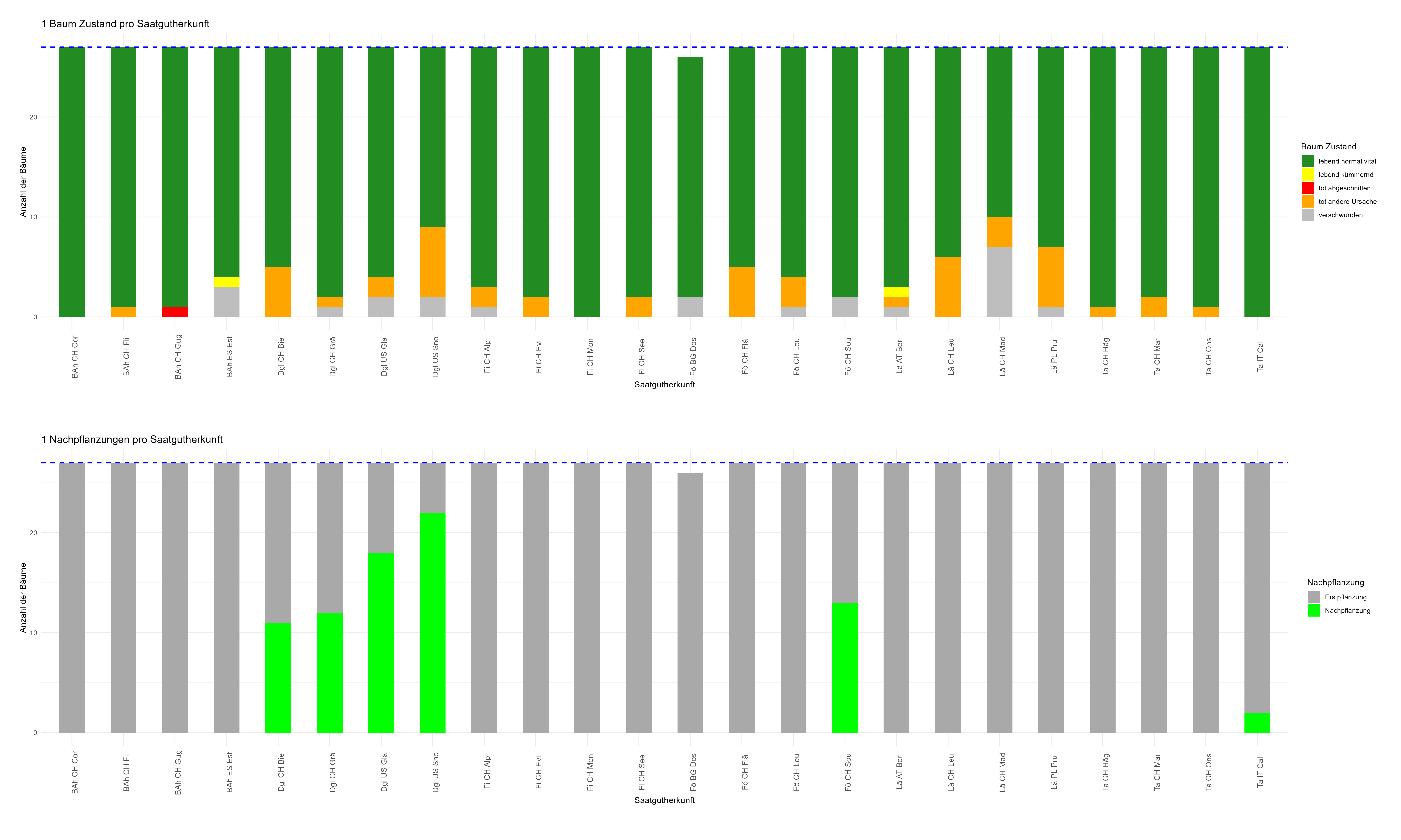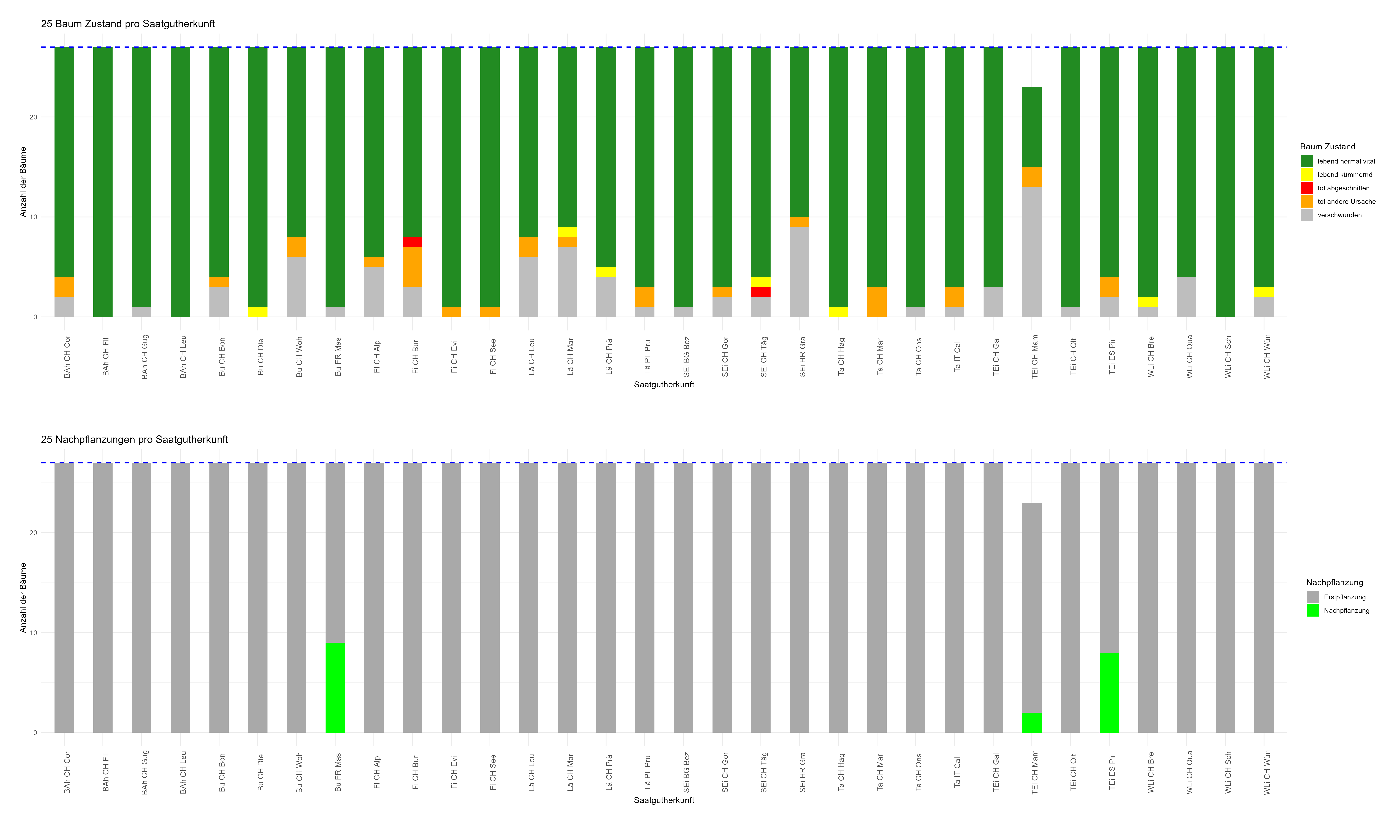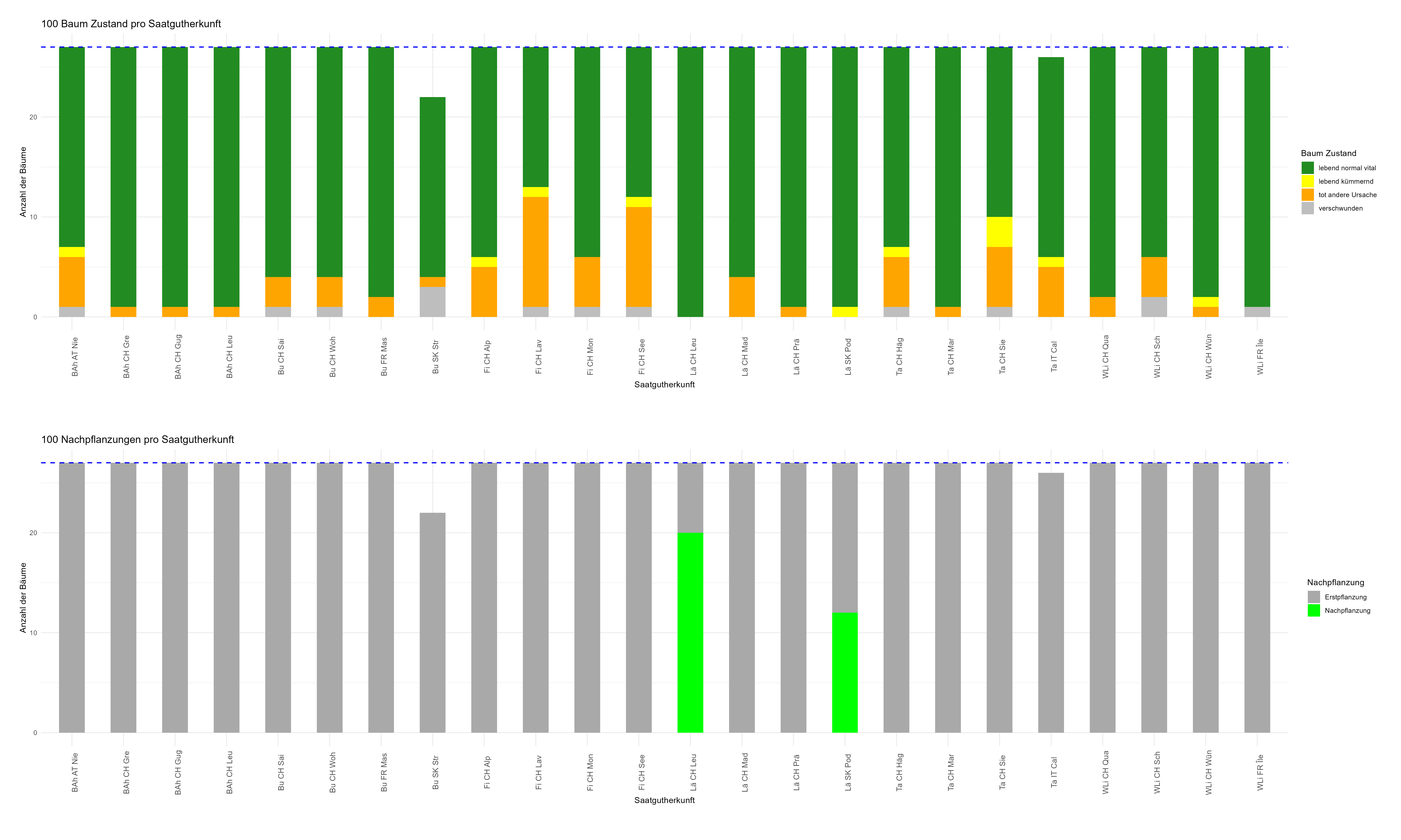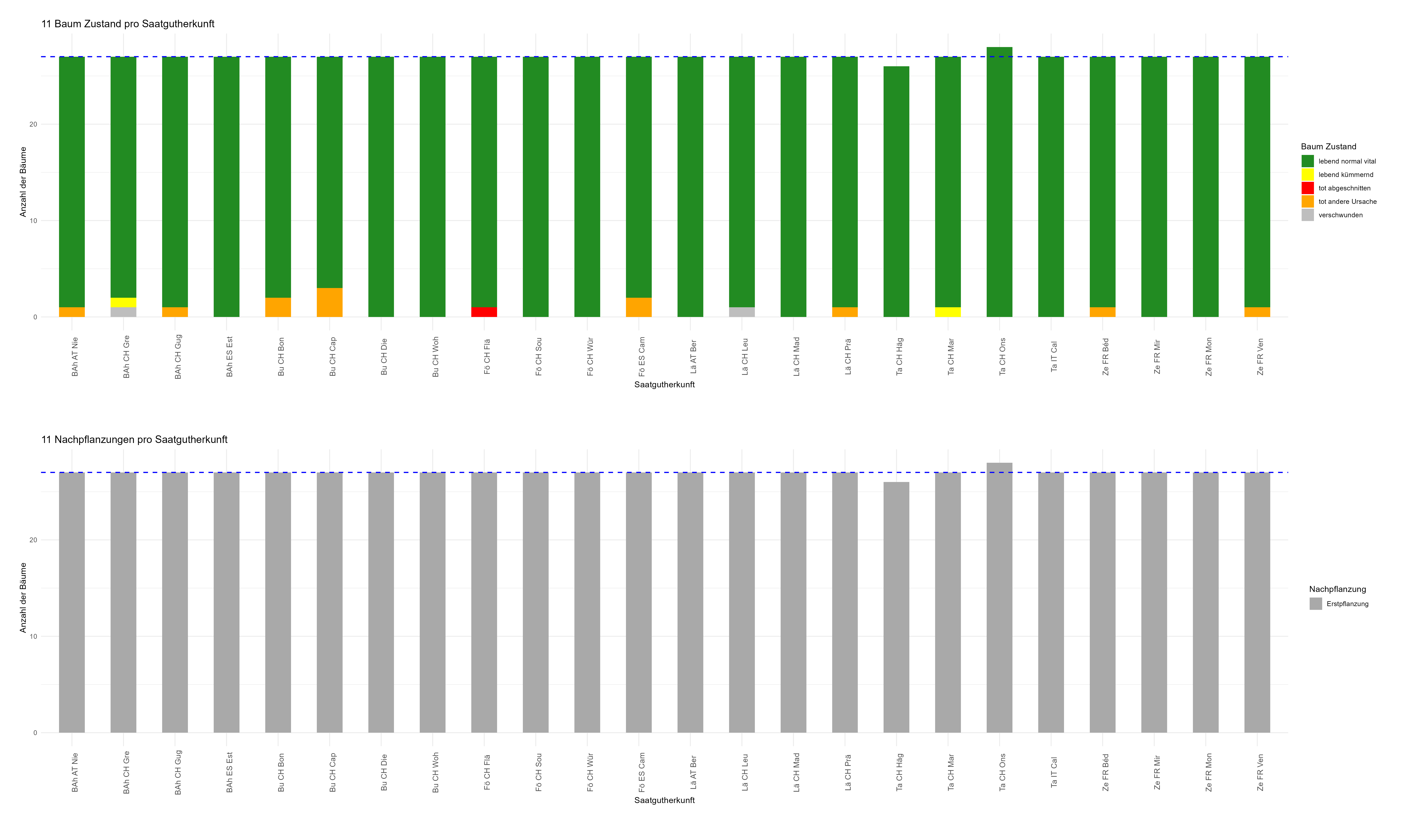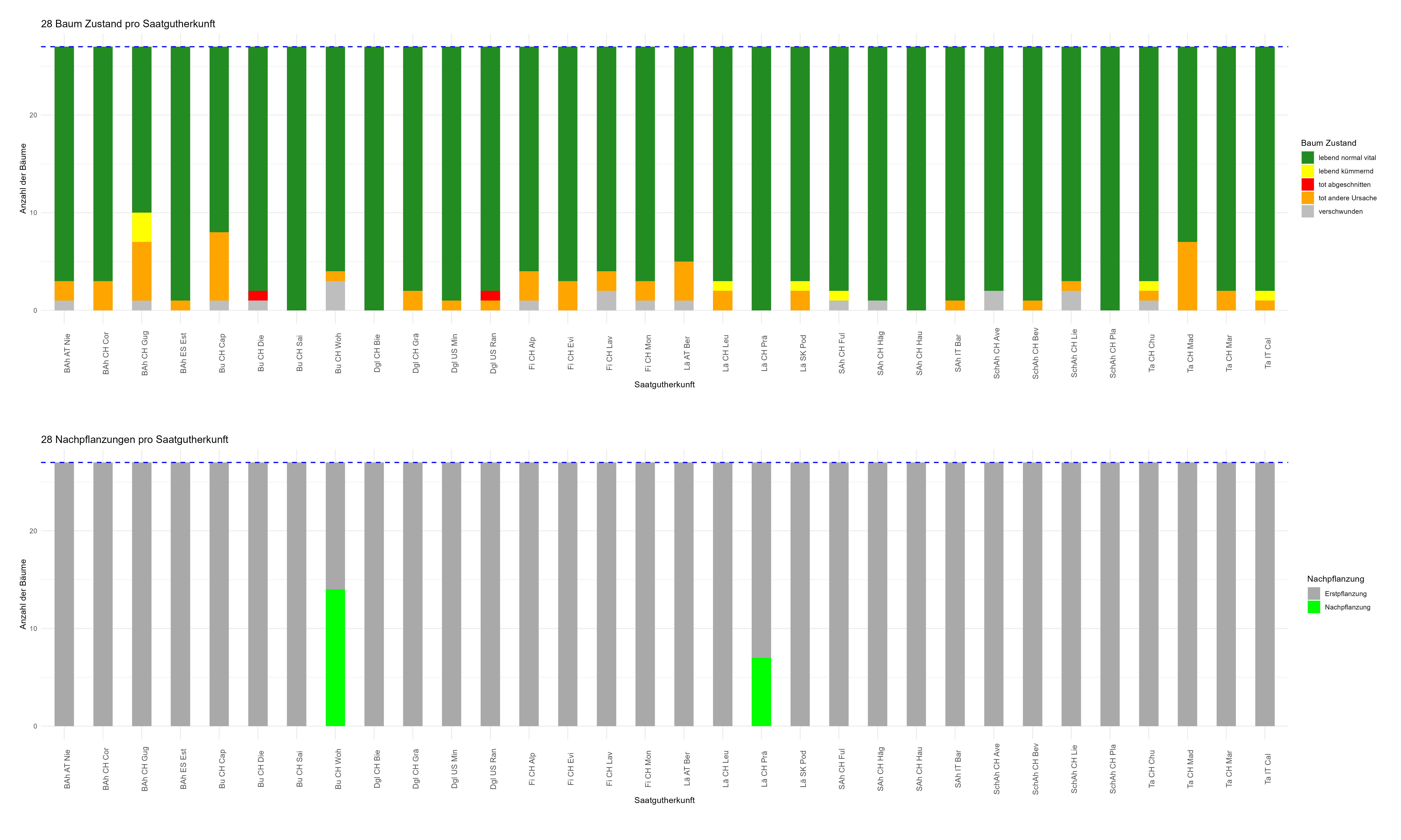 Anzahl BA = Anzahl der in einer Testpflanzung getesteten Baumarten, PP = Pflanzperiode, in welcher eine Testpflanzung eingerichtet wurde: 1 bedeutet Herbst 20 - Frühjahr 21, 2 bedeutet Herbst 21 - Frühjahr 22, 3 bedeutet Herbst 22 - Frühjahr 23. Flächendoku: Folien zu Boden und Klima pro Fläche. Zustand: pro Inventurzeitpunkt (Jahreszahl) Link zu 2 Figuren: Fig 1 Beurteilung des Zustands aller Pflanzen pro Saatgutherkunft pro Fläche (3 Wiederholungsblöcke x 9 Pflanzen= 27 Pflanzen pro Saatgutherkunft pro Fläche) Kategorien: lebend normal vital, lebend kümmernd, tot, abgeschnitten und verschwunden; Fig 2 Anzahl Pflanzen welche zum Inventurzeitpunkt bereits nachgepflanzt waren. Die Bezeichnung der Saatgutherkunft setzt sich auch dem Baumartenkürzel dem Herkunftsland und den ersten 3 Buchstaben der Herkunftsgemeinde zusammen. Baumartenkürzel: BAh Bergahorn, BHa Baumhasel, Bu Buche, Dgl Douglasie, EBe Elsbeere, Fi Fichte, Fö Föhre, Ki Kirsche, Lä Lärche, Nu Nussbaum, SAh Spitzahorn, SchAh Schneeballblättriger Ahorn, SEi Stieleiche, Ta Tanne, TEi Traubeneiche, WLi Winterlinde, Ze Zeder, ZEi Zerreiche