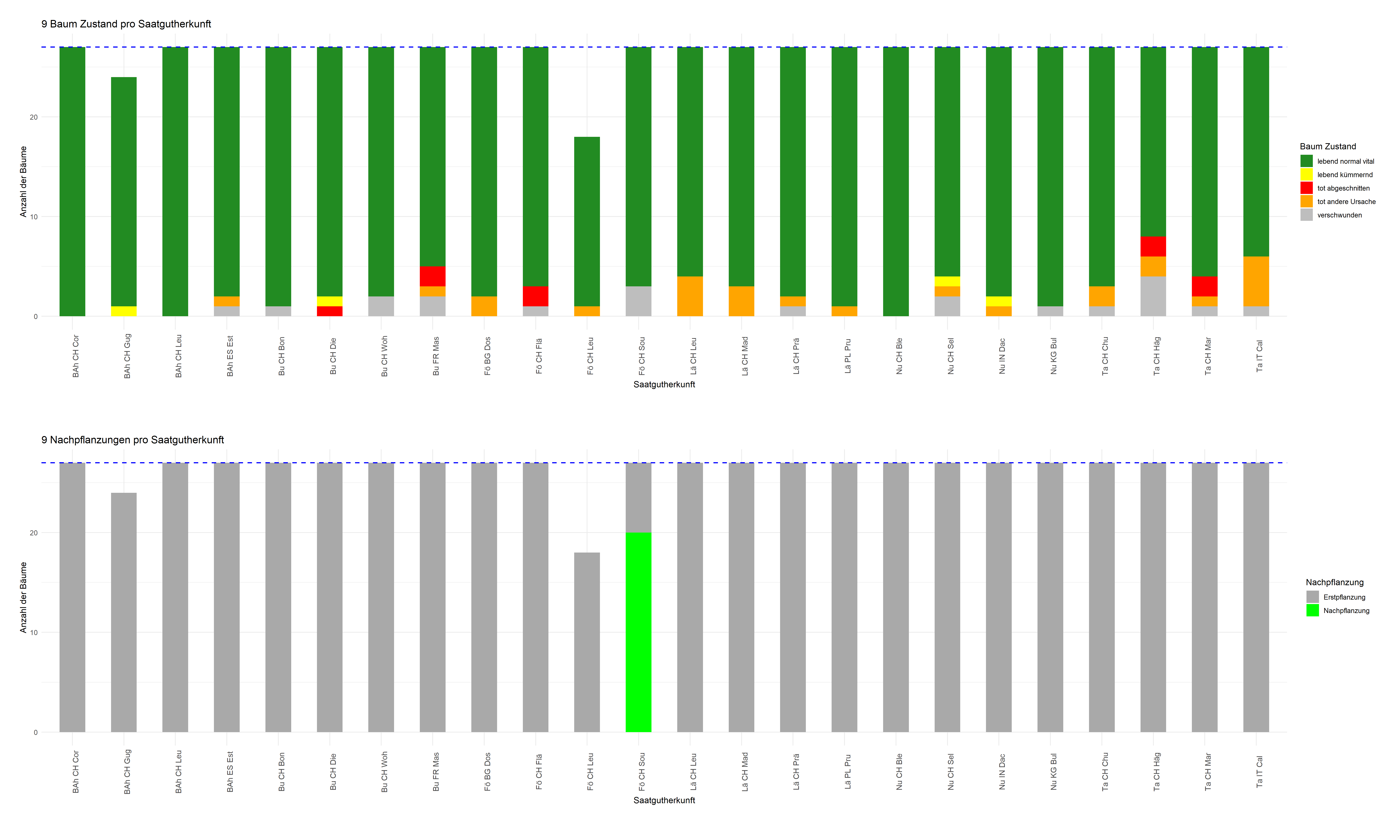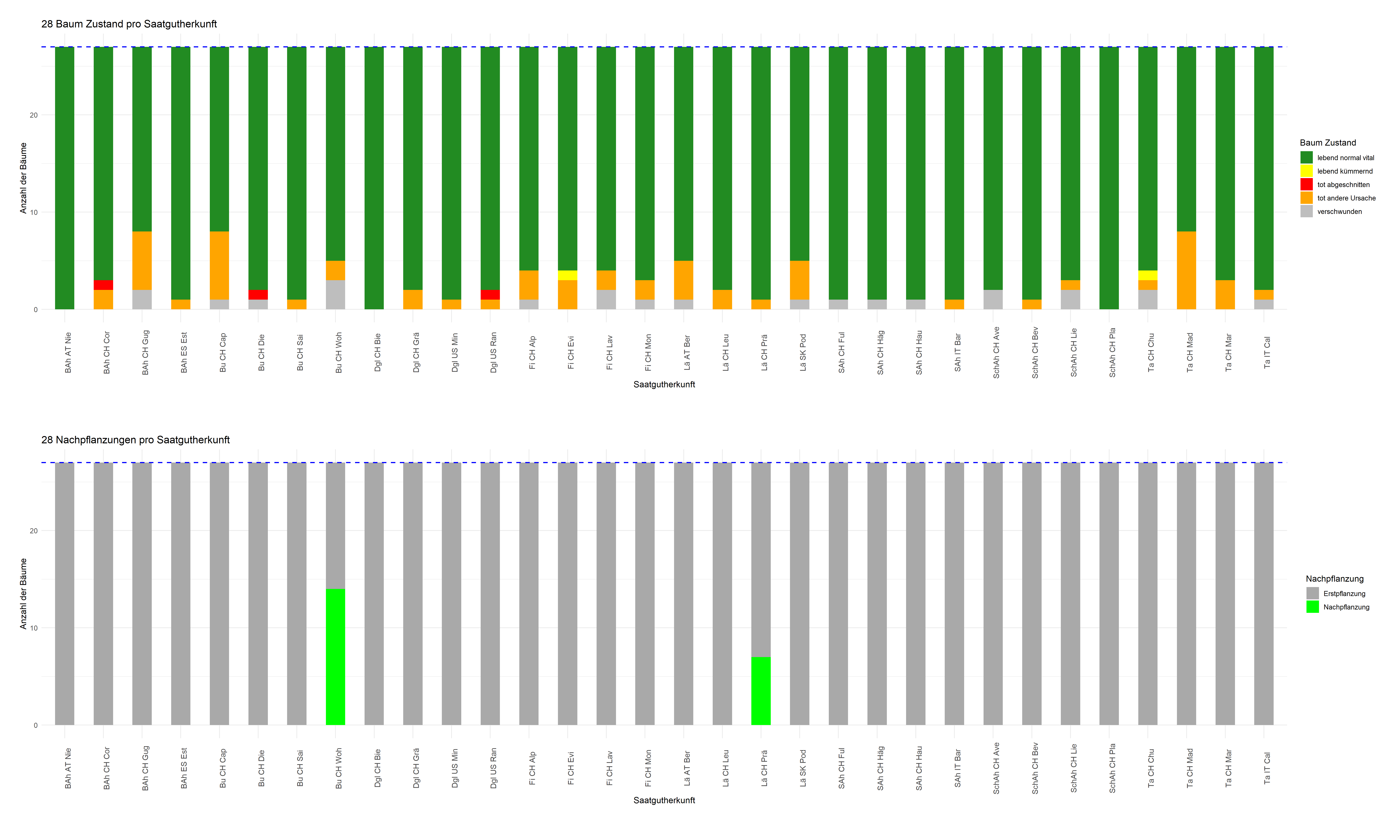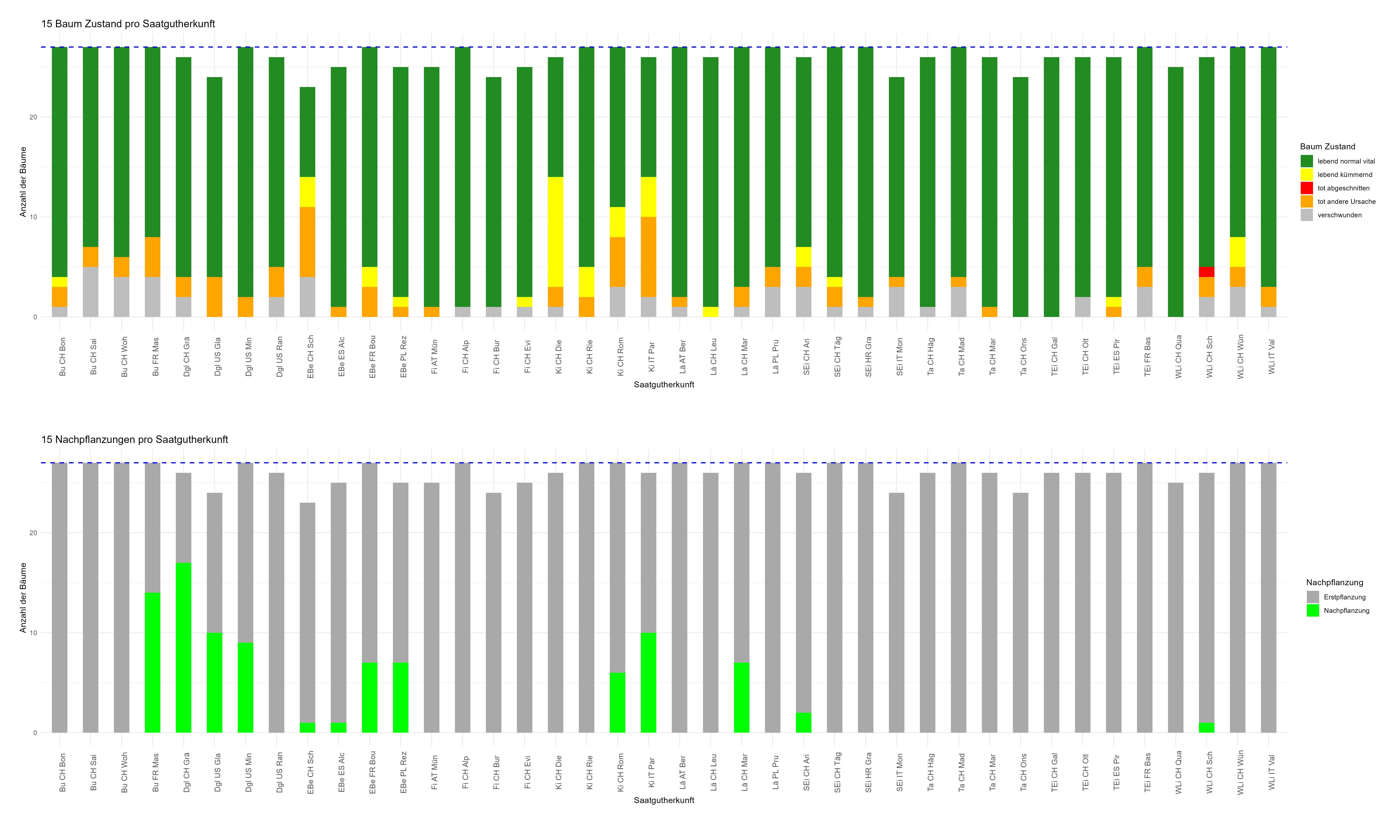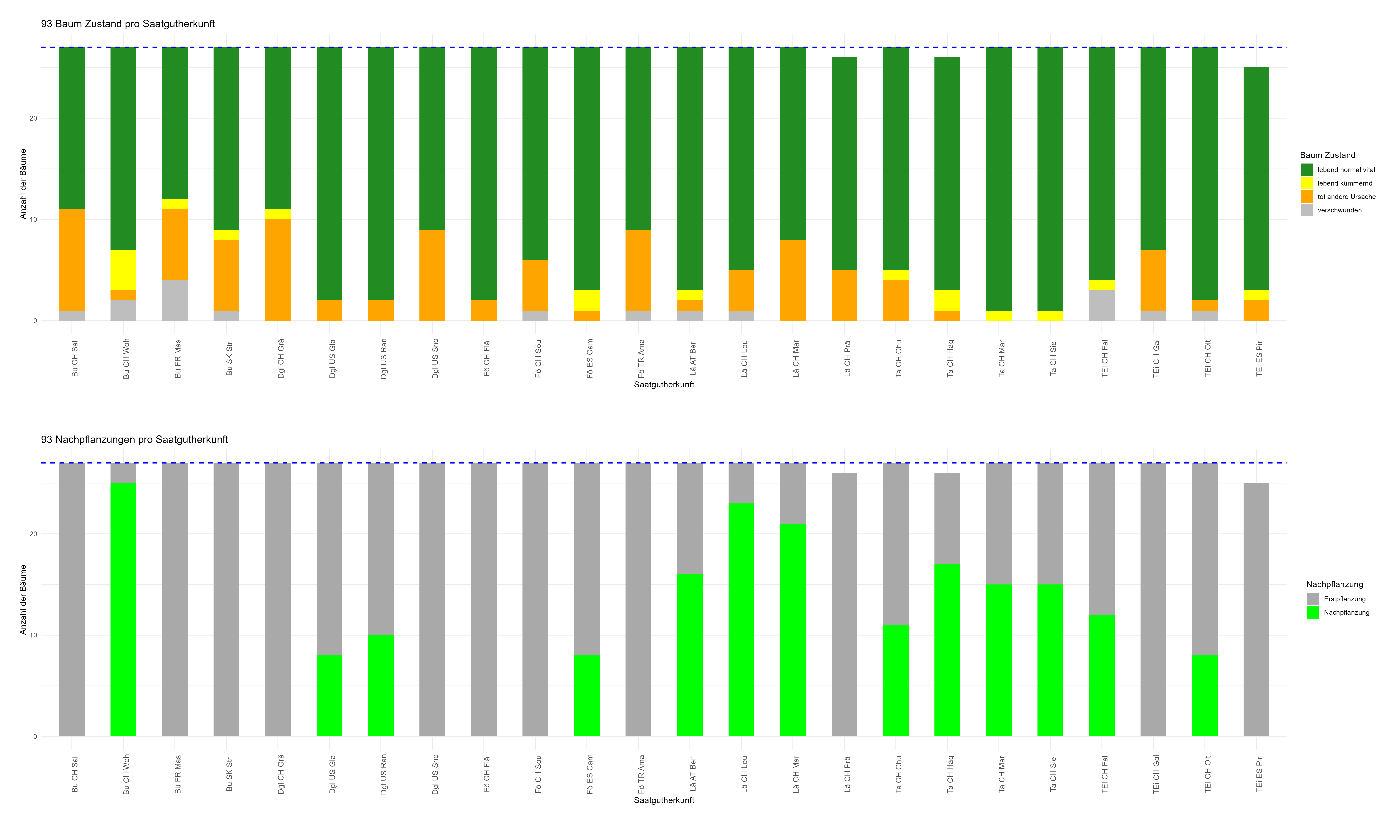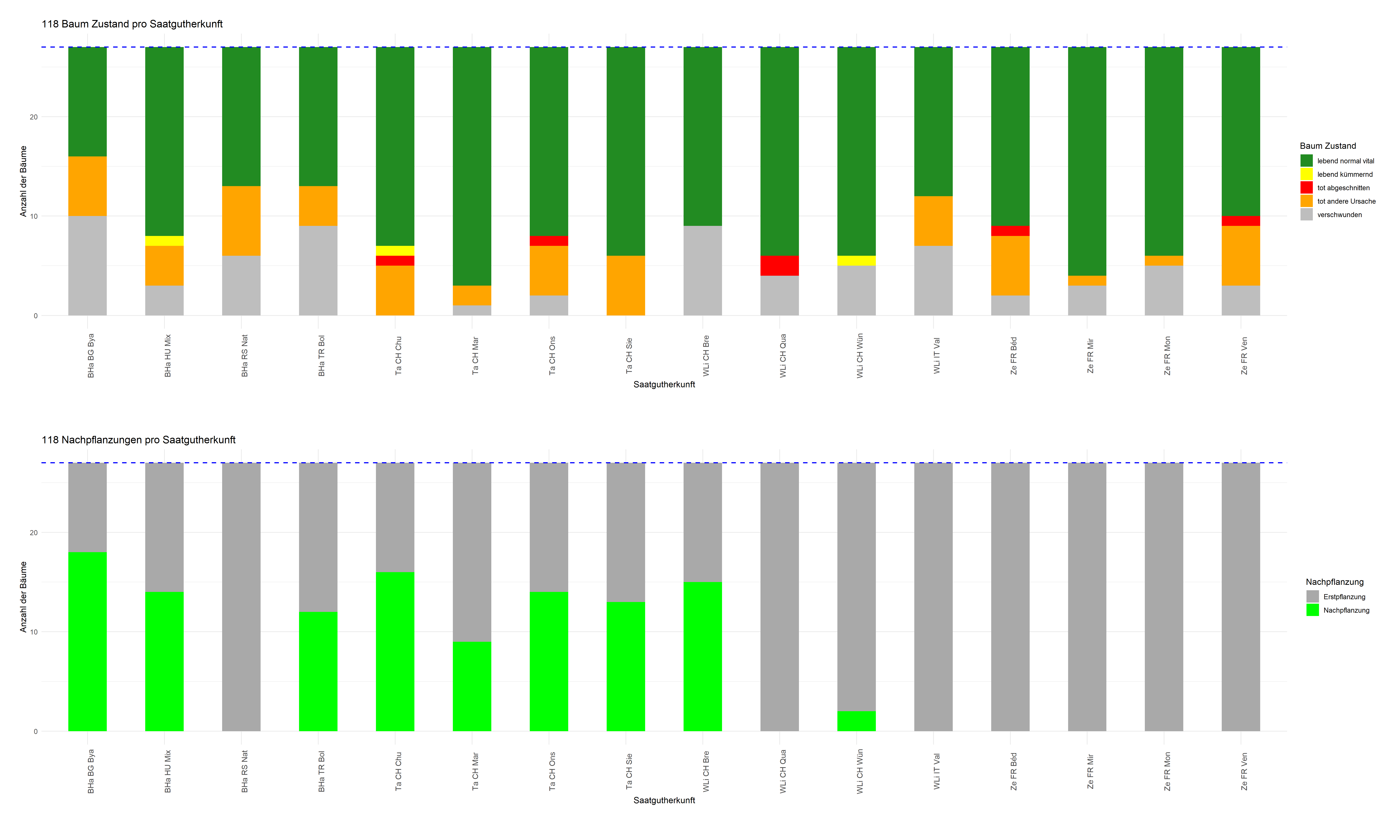 Anzahl BA = Anzahl der in einer Testpflanzung getesteten Baumarten, PP = Pflanzperiode, in welcher eine Testpflanzung eingerichtet wurde: 1 bedeutet Herbst 20 - Frühjahr 21, 2 bedeutet Herbst 21 - Frühjahr 22, 3 bedeutet Herbst 22 - Frühjahr 23. Flächendoku: Folien zu Boden und Klima pro Fläche. Zustand: pro Inventurzeitpunkt (Jahreszahl) Link zu 2 Figuren: Fig 1 Beurteilung des Zustands aller Pflanzen pro Saatgutherkunft pro Fläche (3 Wiederholungsblöcke x 9 Pflanzen= 27 Pflanzen pro Saatgutherkunft pro Fläche) Kategorien: lebend normal vital, lebend kümmernd, tot, abgeschnitten und verschwunden; Fig 2 Anzahl Pflanzen welche zum Inventurzeitpunkt bereits nachgepflanzt waren. Die Bezeichnung der Saatgutherkunft setzt sich auch dem Baumartenkürzel dem Herkunftsland und den ersten 3 Buchstaben der Herkunftsgemeinde zusammen. Baumartenkürzel: BAh Bergahorn, BHa Baumhasel, Bu Buche, Dgl Douglasie, EBe Elsbeere, Fi Fichte, Fö Föhre, Ki Kirsche, Lä Lärche, Nu Nussbaum, SAh Spitzahorn, SchAh Schneeballblättriger Ahorn, SEi Stieleiche, Ta Tanne, TEi Traubeneiche, WLi Winterlinde, Ze Zeder, ZEi Zerreiche