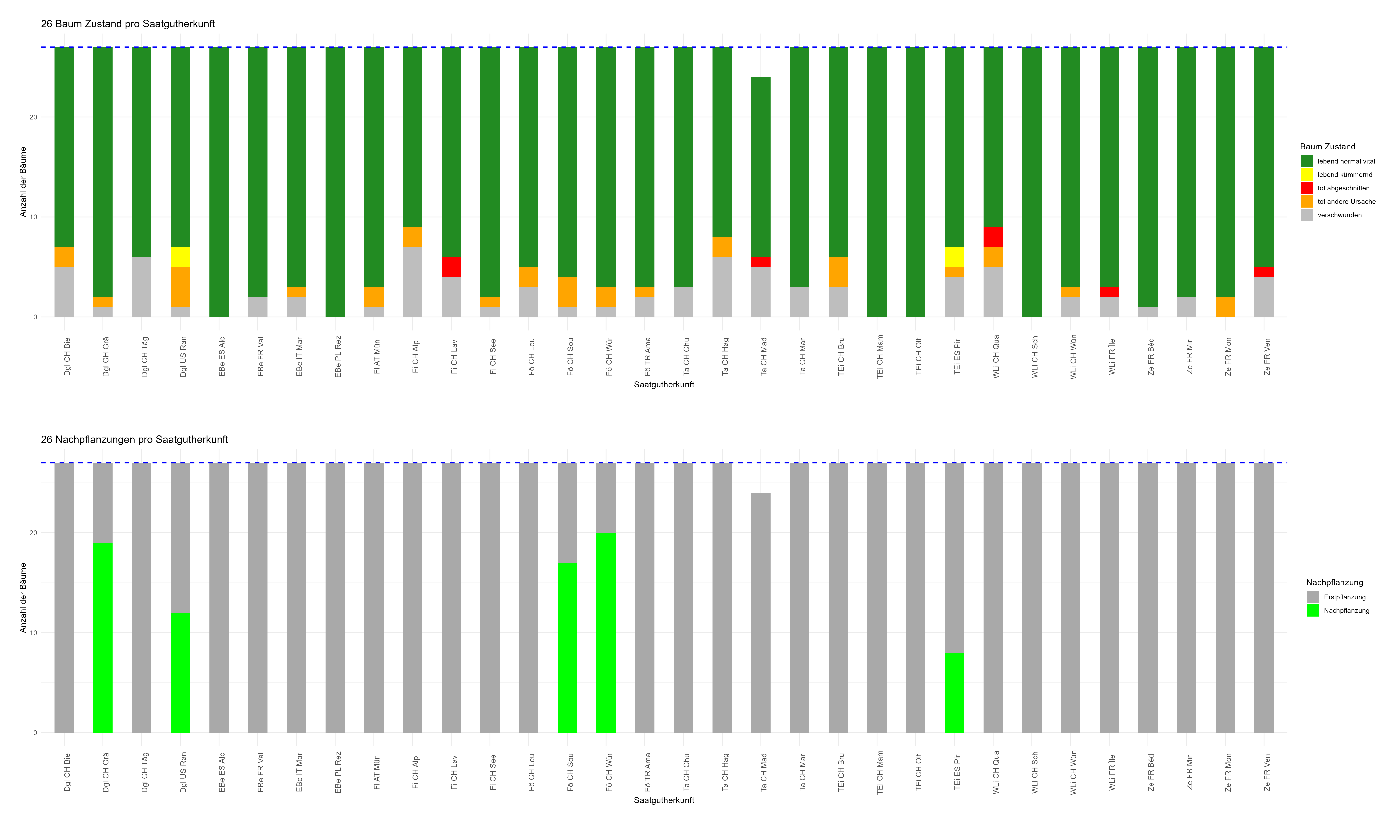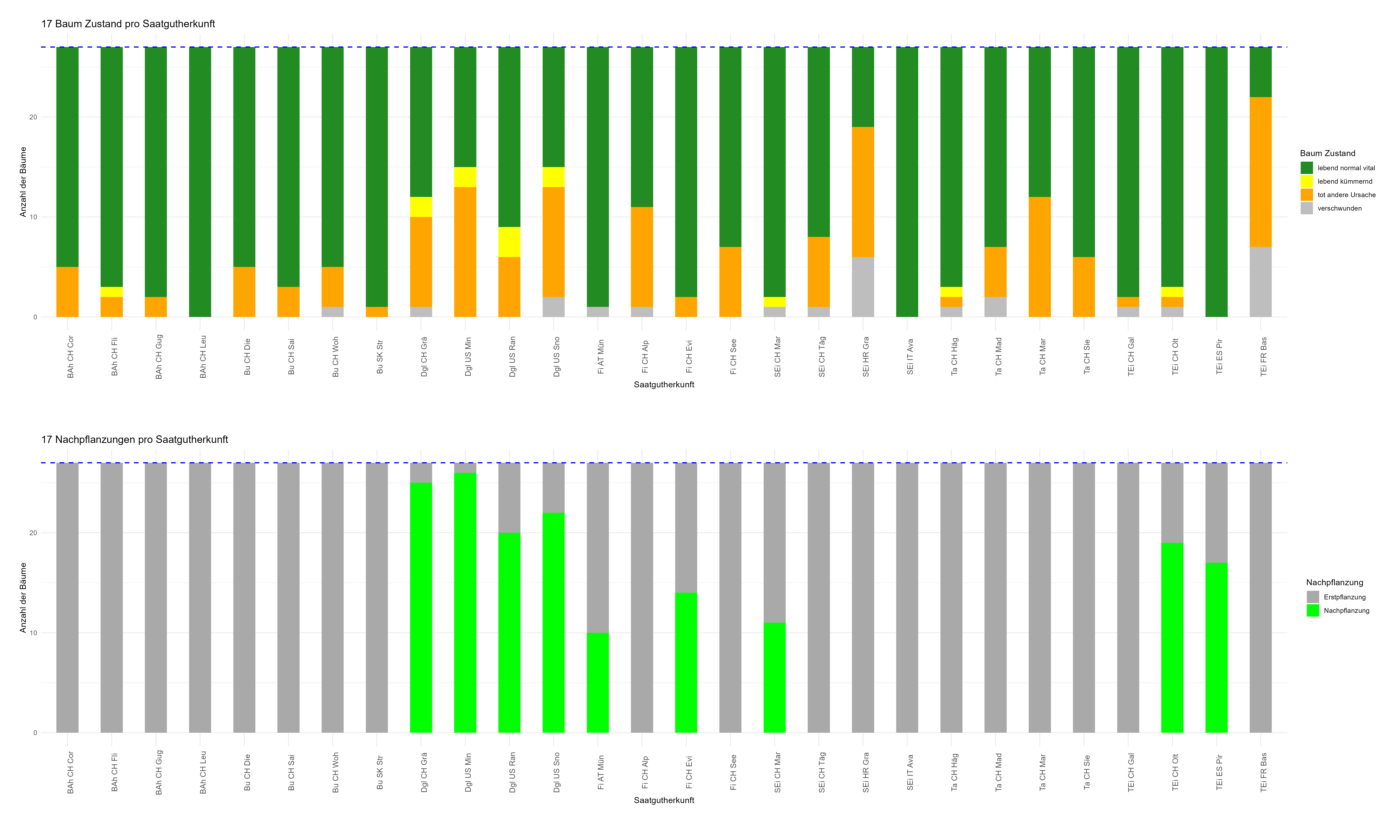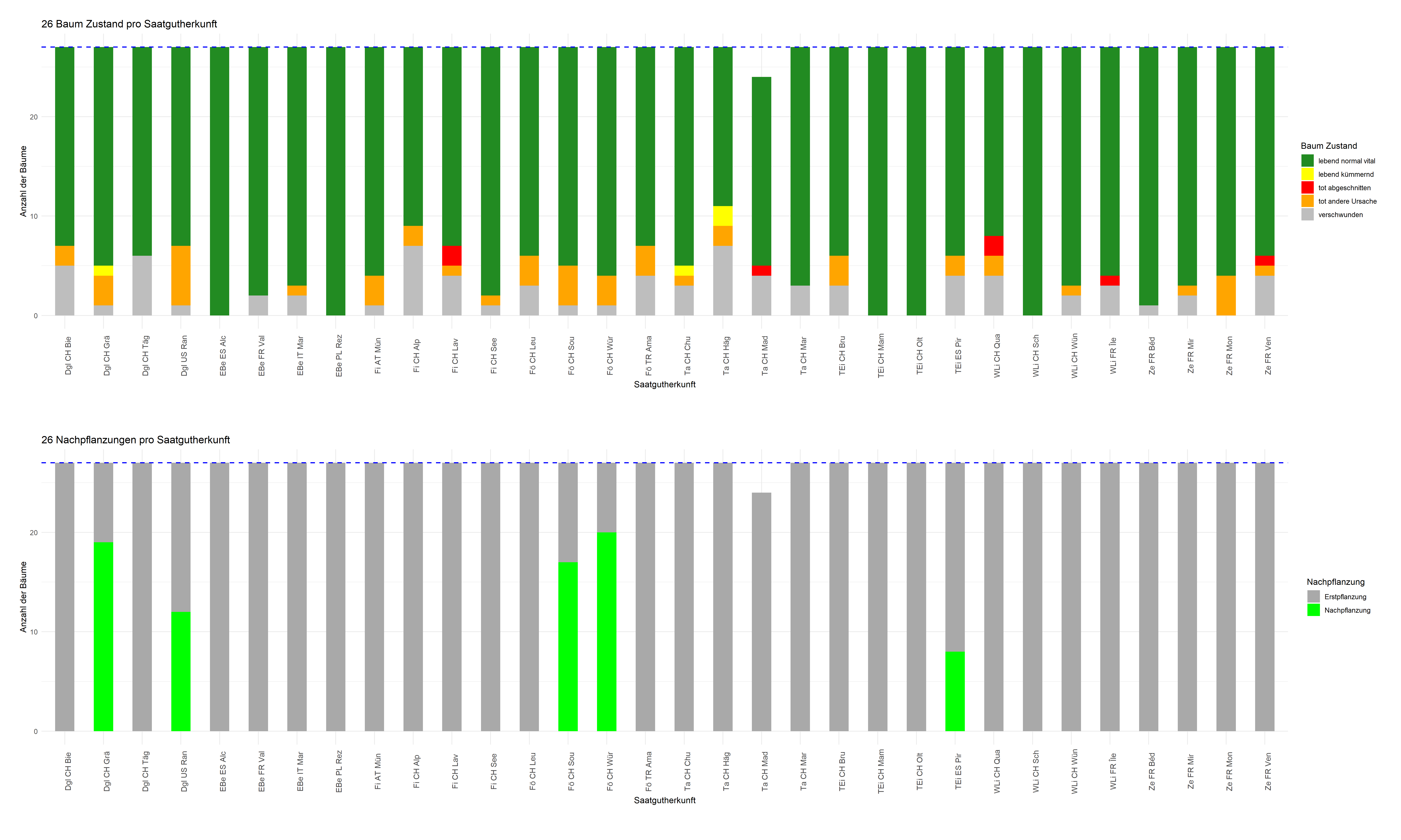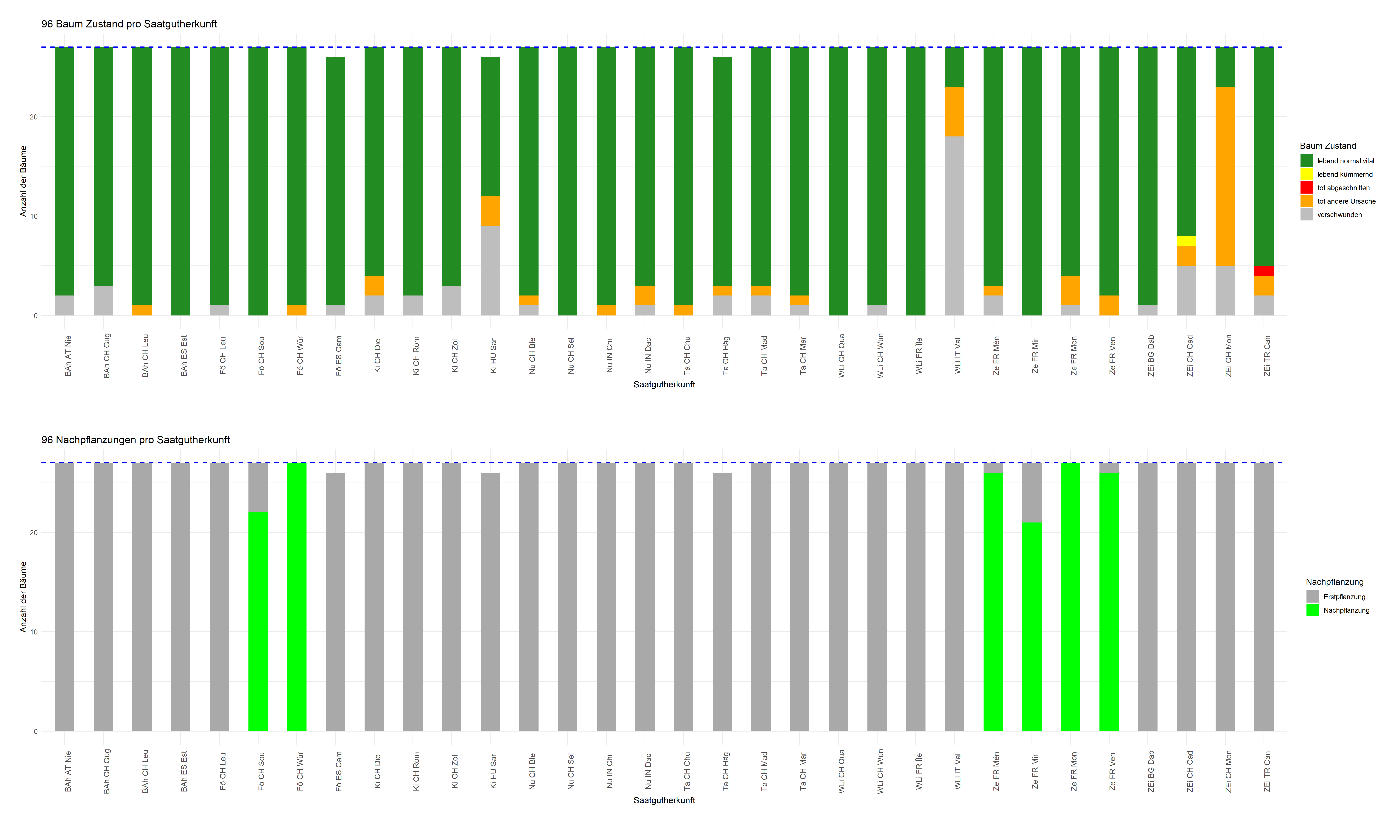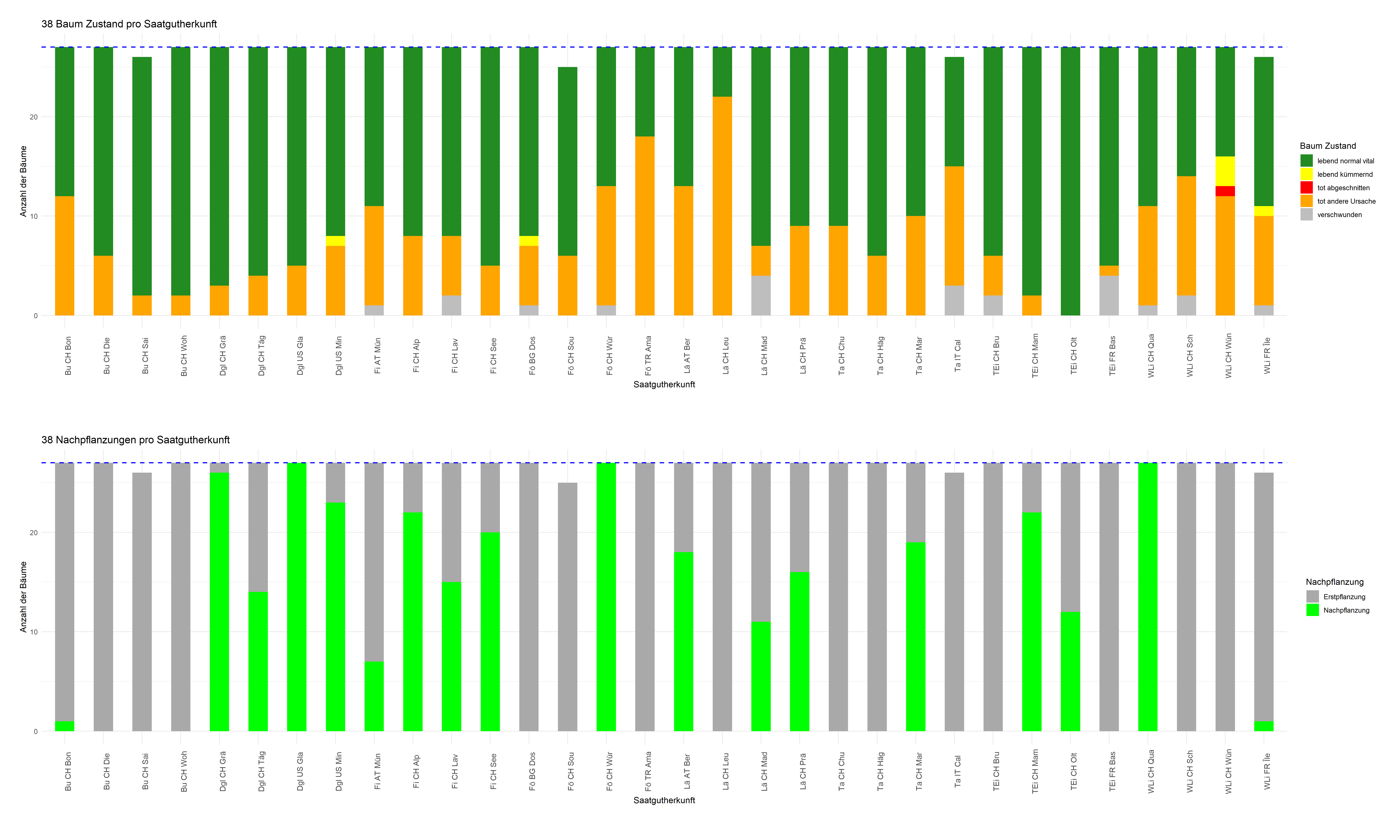 Anzahl BA = Anzahl der in einer Testpflanzung getesteten Baumarten, PP = Pflanzperiode, in welcher eine Testpflanzung eingerichtet wurde: 1 bedeutet Herbst 20 - Frühjahr 21, 2 bedeutet Herbst 21 - Frühjahr 22, 3 bedeutet Herbst 22 - Frühjahr 23. Flächendoku: Folien zu Boden und Klima pro Fläche. Zustand: pro Inventurzeitpunkt (Jahreszahl) Link zu 2 Figuren: Fig 1 Beurteilung des Zustands aller Pflanzen pro Saatgutherkunft pro Fläche (3 Wiederholungsblöcke x 9 Pflanzen= 27 Pflanzen pro Saatgutherkunft pro Fläche) Kategorien: lebend normal vital, lebend kümmernd, tot, abgeschnitten und verschwunden; Fig 2 Anzahl Pflanzen welche zum Inventurzeitpunkt bereits nachgepflanzt waren. Die Bezeichnung der Saatgutherkunft setzt sich auch dem Baumartenkürzel dem Herkunftsland und den ersten 3 Buchstaben der Herkunftsgemeinde zusammen. Baumartenkürzel: BAh Bergahorn, BHa Baumhasel, Bu Buche, Dgl Douglasie, EBe Elsbeere, Fi Fichte, Fö Föhre, Ki Kirsche, Lä Lärche, Nu Nussbaum, SAh Spitzahorn, SchAh Schneeballblättriger Ahorn, SEi Stieleiche, Ta Tanne, TEi Traubeneiche, WLi Winterlinde, Ze Zeder, ZEi Zerreiche