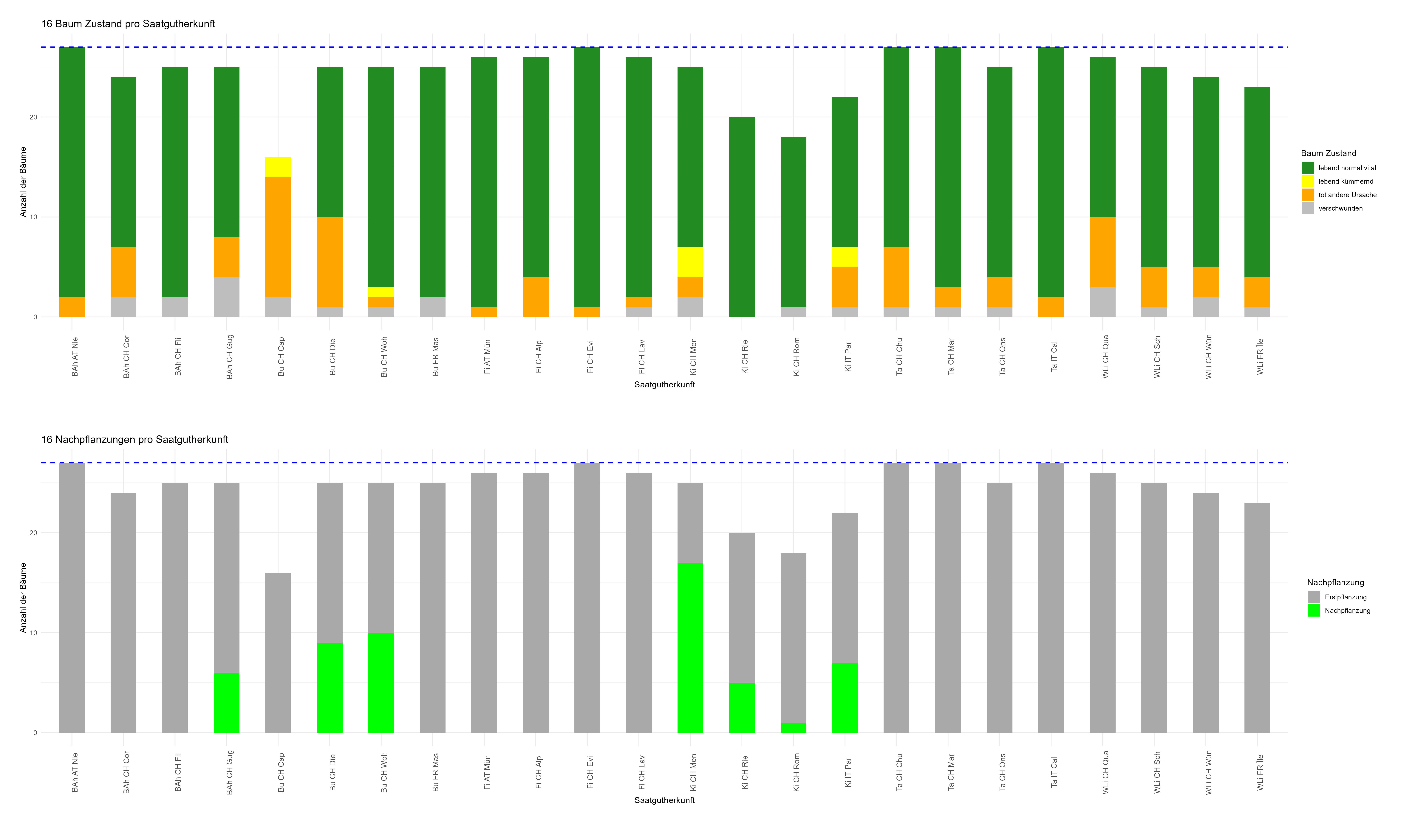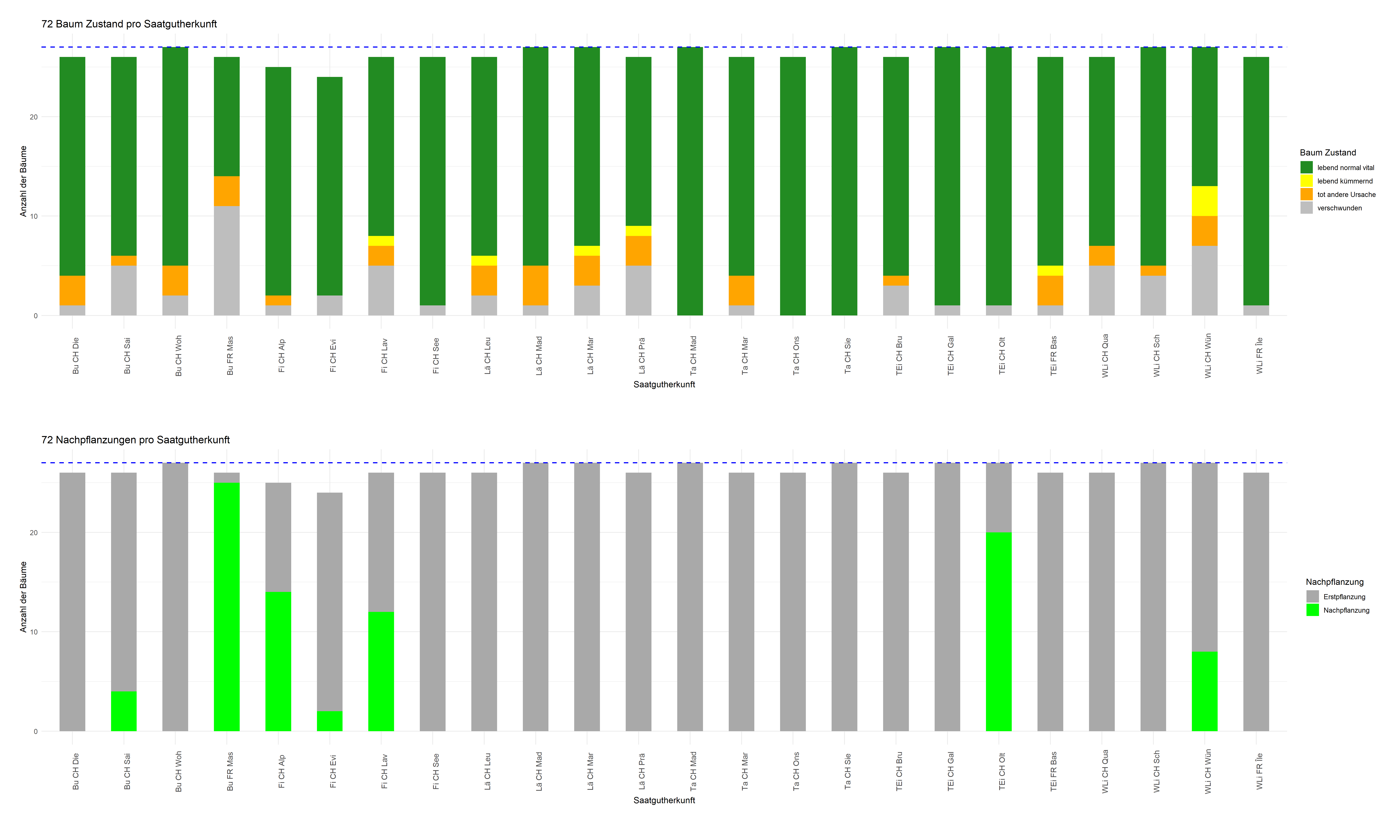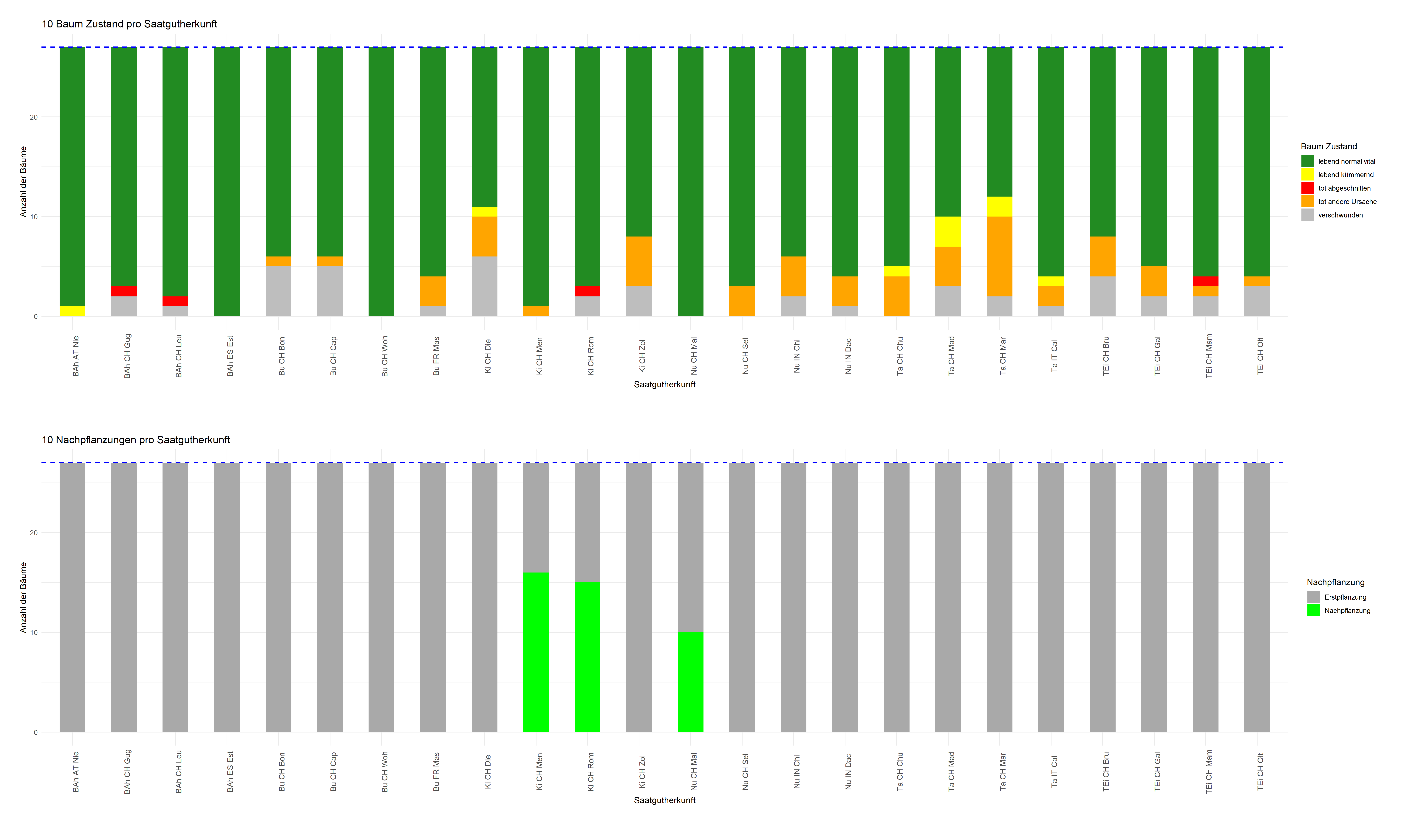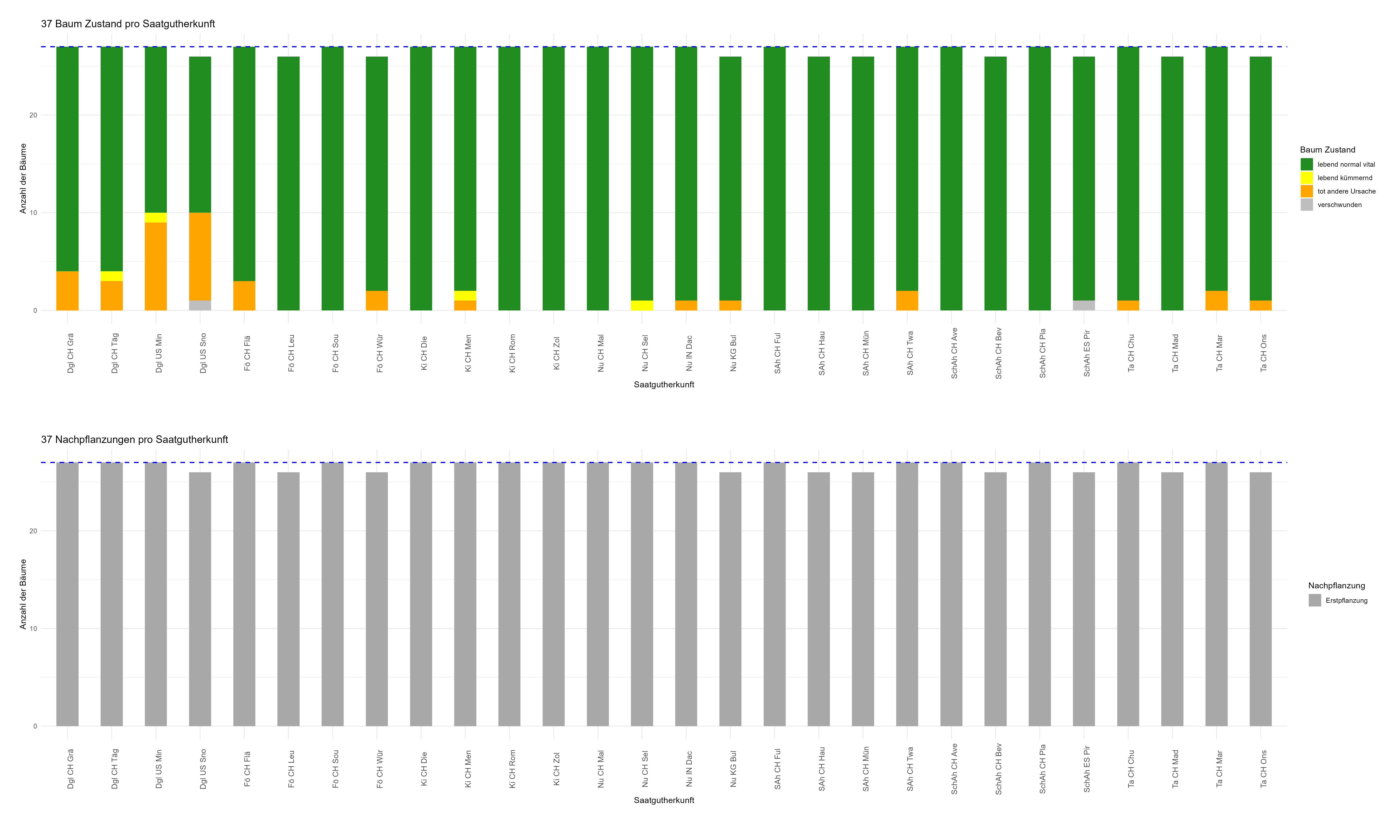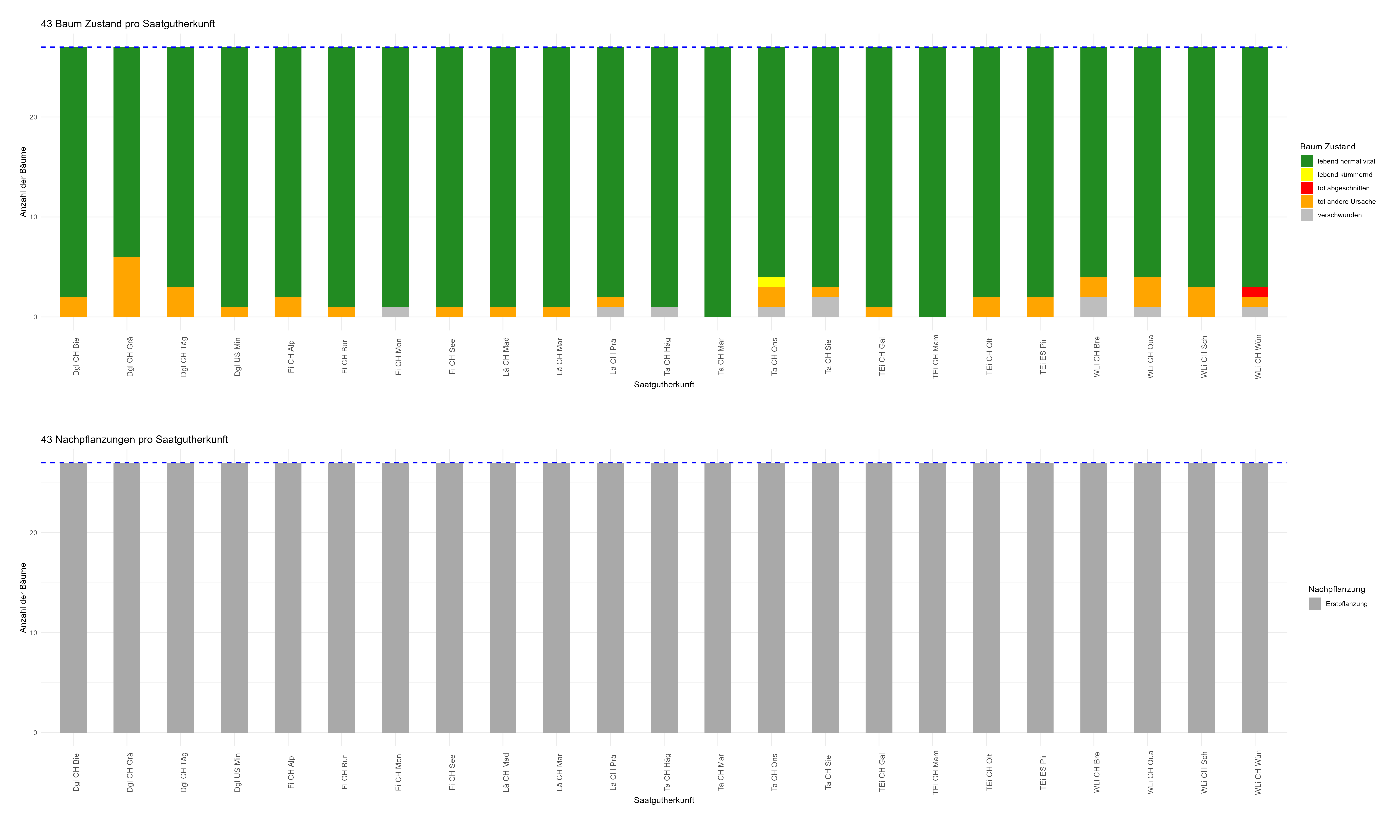 Anzahl BA = Anzahl der in einer Testpflanzung getesteten Baumarten, PP = Pflanzperiode, in welcher eine Testpflanzung eingerichtet wurde: 1 bedeutet Herbst 20 - Frühjahr 21, 2 bedeutet Herbst 21 - Frühjahr 22, 3 bedeutet Herbst 22 - Frühjahr 23. Flächendoku: Folien zu Boden und Klima pro Fläche. Zustand: pro Inventurzeitpunkt (Jahreszahl) Link zu 2 Figuren: Fig 1 Beurteilung des Zustands aller Pflanzen pro Saatgutherkunft pro Fläche (3 Wiederholungsblöcke x 9 Pflanzen= 27 Pflanzen pro Saatgutherkunft pro Fläche) Kategorien: lebend normal vital, lebend kümmernd, tot, abgeschnitten und verschwunden; Fig 2 Anzahl Pflanzen welche zum Inventurzeitpunkt bereits nachgepflanzt waren. Die Bezeichnung der Saatgutherkunft setzt sich auch dem Baumartenkürzel dem Herkunftsland und den ersten 3 Buchstaben der Herkunftsgemeinde zusammen. Baumartenkürzel: BAh Bergahorn, BHa Baumhasel, Bu Buche, Dgl Douglasie, EBe Elsbeere, Fi Fichte, Fö Föhre, Ki Kirsche, Lä Lärche, Nu Nussbaum, SAh Spitzahorn, SchAh Schneeballblättriger Ahorn, SEi Stieleiche, Ta Tanne, TEi Traubeneiche, WLi Winterlinde, Ze Zeder, ZEi Zerreiche