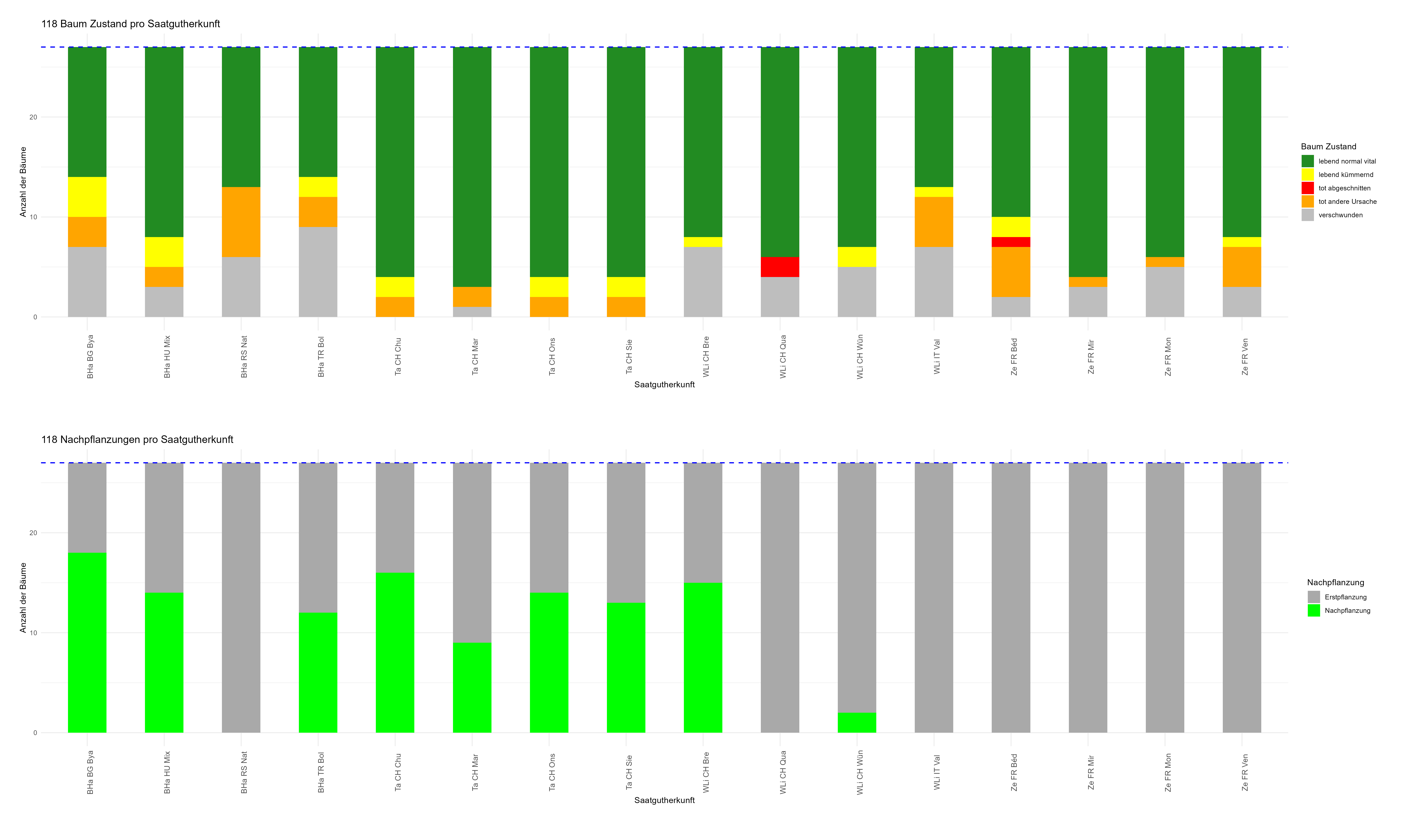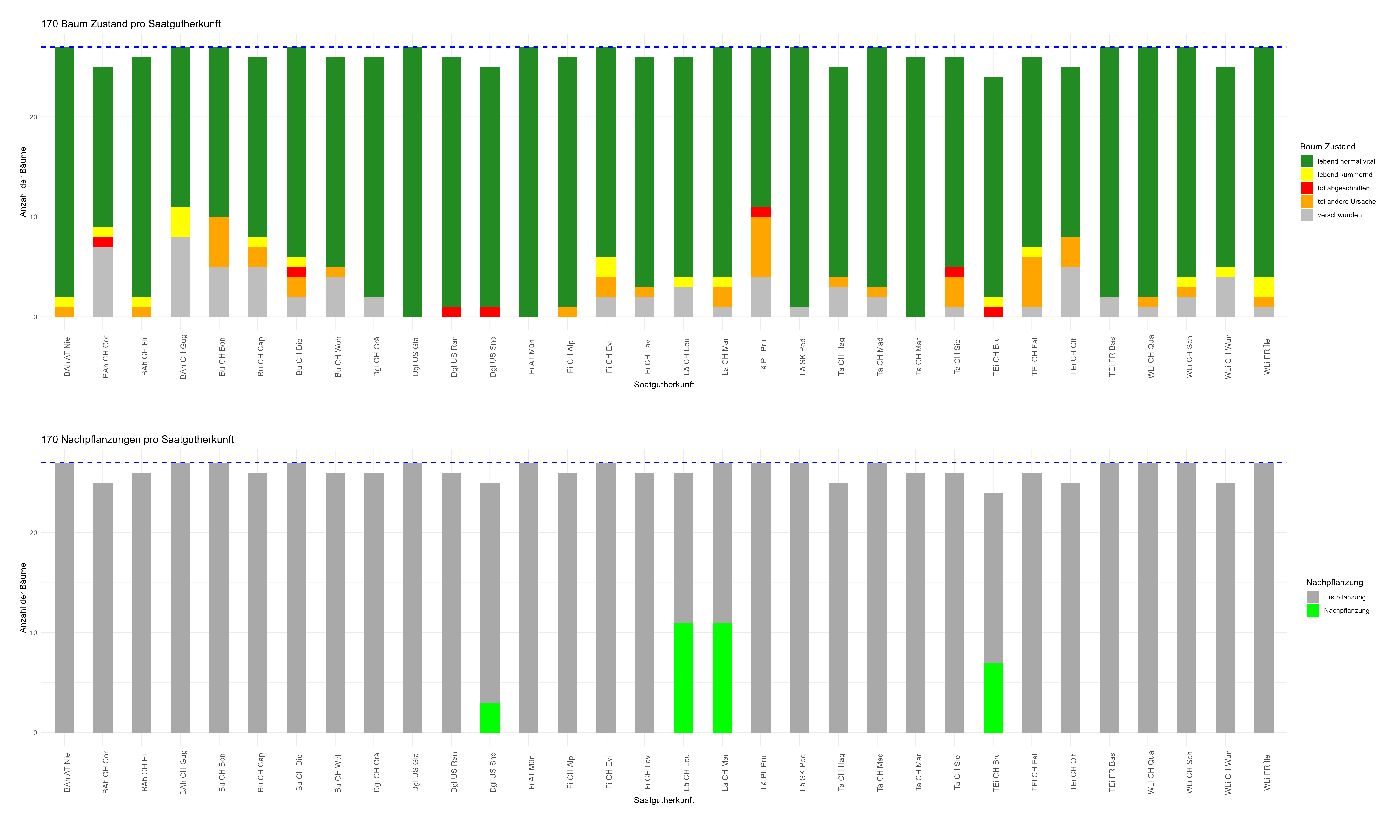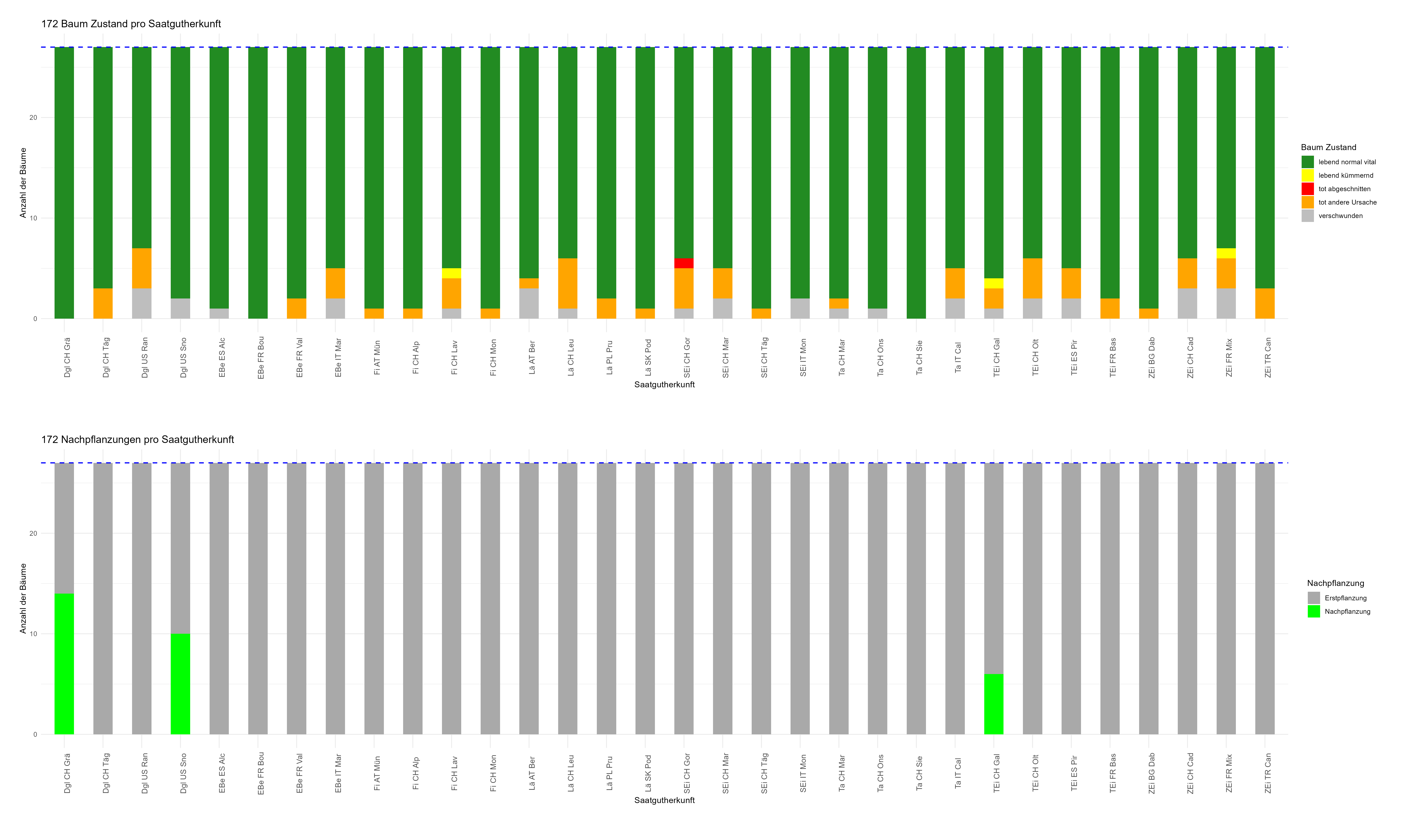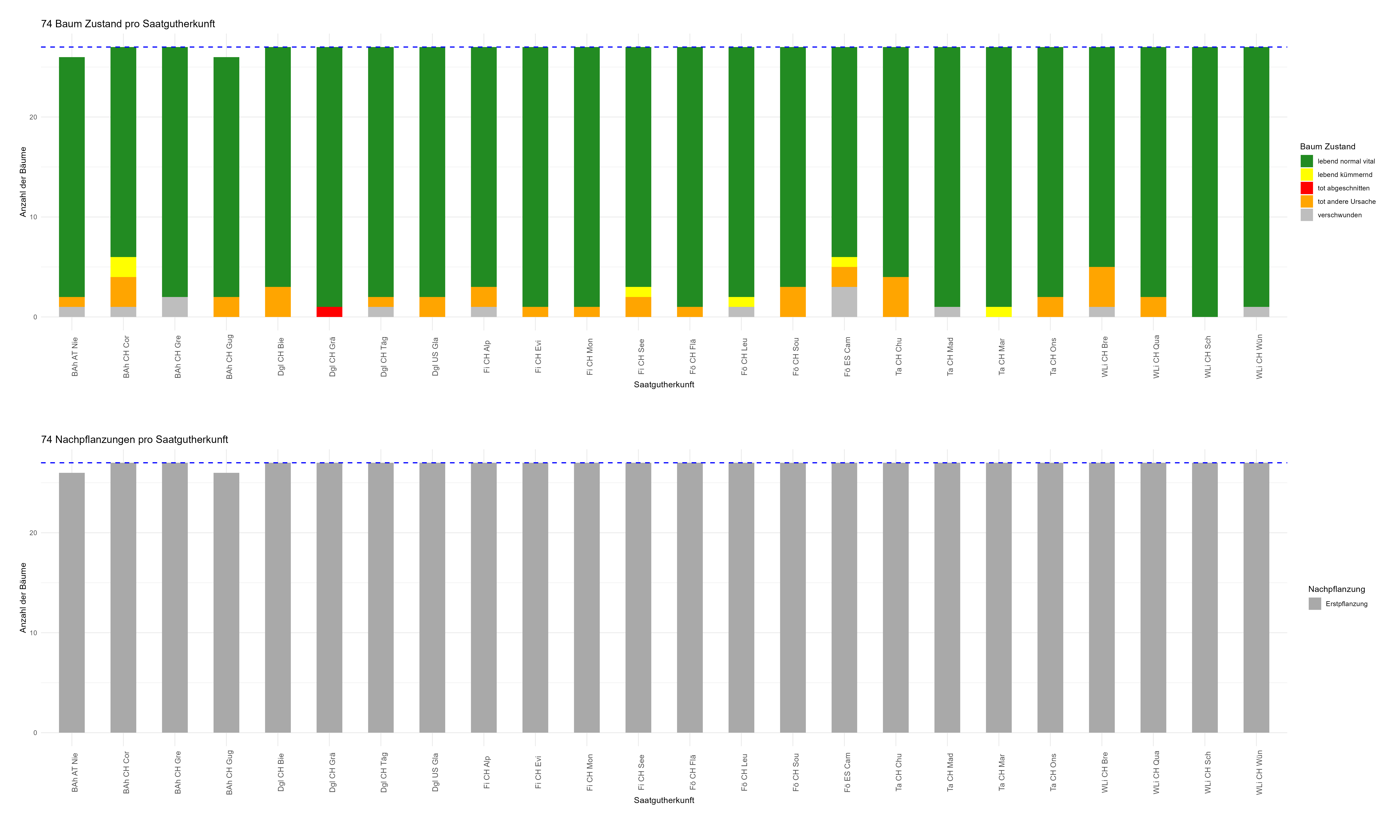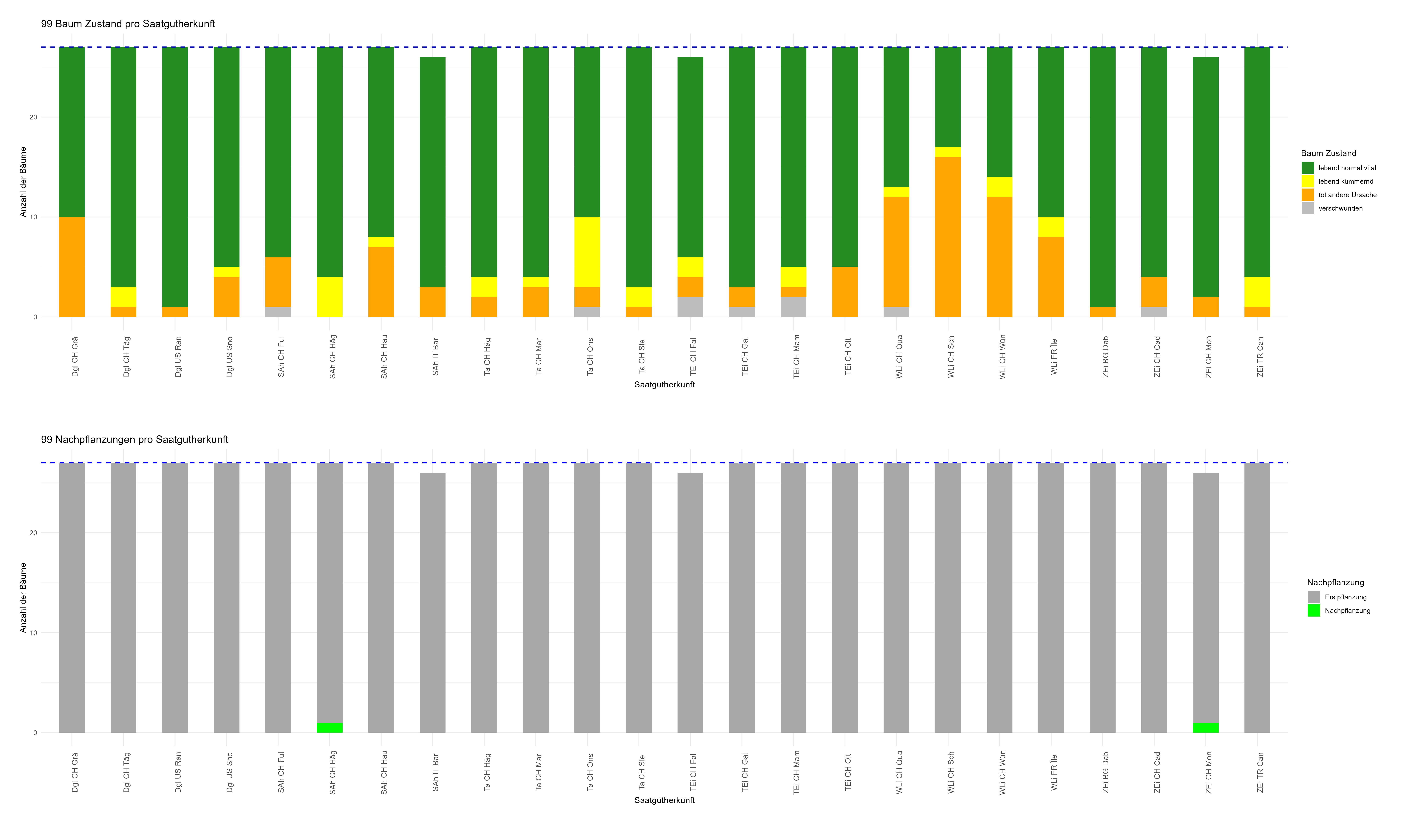 Anzahl BA = Anzahl der in einer Testpflanzung getesteten Baumarten, PP = Pflanzperiode, in welcher eine Testpflanzung eingerichtet wurde: 1 bedeutet Herbst 20 - Frühjahr 21, 2 bedeutet Herbst 21 - Frühjahr 22, 3 bedeutet Herbst 22 - Frühjahr 23. Flächendoku: Folien zu Boden und Klima pro Fläche. Zustand: pro Inventurzeitpunkt (Jahreszahl) Link zu 2 Figuren: Fig 1 Beurteilung des Zustands aller Pflanzen pro Saatgutherkunft pro Fläche (3 Wiederholungsblöcke x 9 Pflanzen= 27 Pflanzen pro Saatgutherkunft pro Fläche) Kategorien: lebend normal vital, lebend kümmernd, tot, abgeschnitten und verschwunden; Fig 2 Anzahl Pflanzen welche zum Inventurzeitpunkt bereits nachgepflanzt waren. Die Bezeichnung der Saatgutherkunft setzt sich auch dem Baumartenkürzel dem Herkunftsland und den ersten 3 Buchstaben der Herkunftsgemeinde zusammen. Baumartenkürzel: BAh Bergahorn, BHa Baumhasel, Bu Buche, Dgl Douglasie, EBe Elsbeere, Fi Fichte, Fö Föhre, Ki Kirsche, Lä Lärche, Nu Nussbaum, SAh Spitzahorn, SchAh Schneeballblättriger Ahorn, SEi Stieleiche, Ta Tanne, TEi Traubeneiche, WLi Winterlinde, Ze Zeder, ZEi Zerreiche