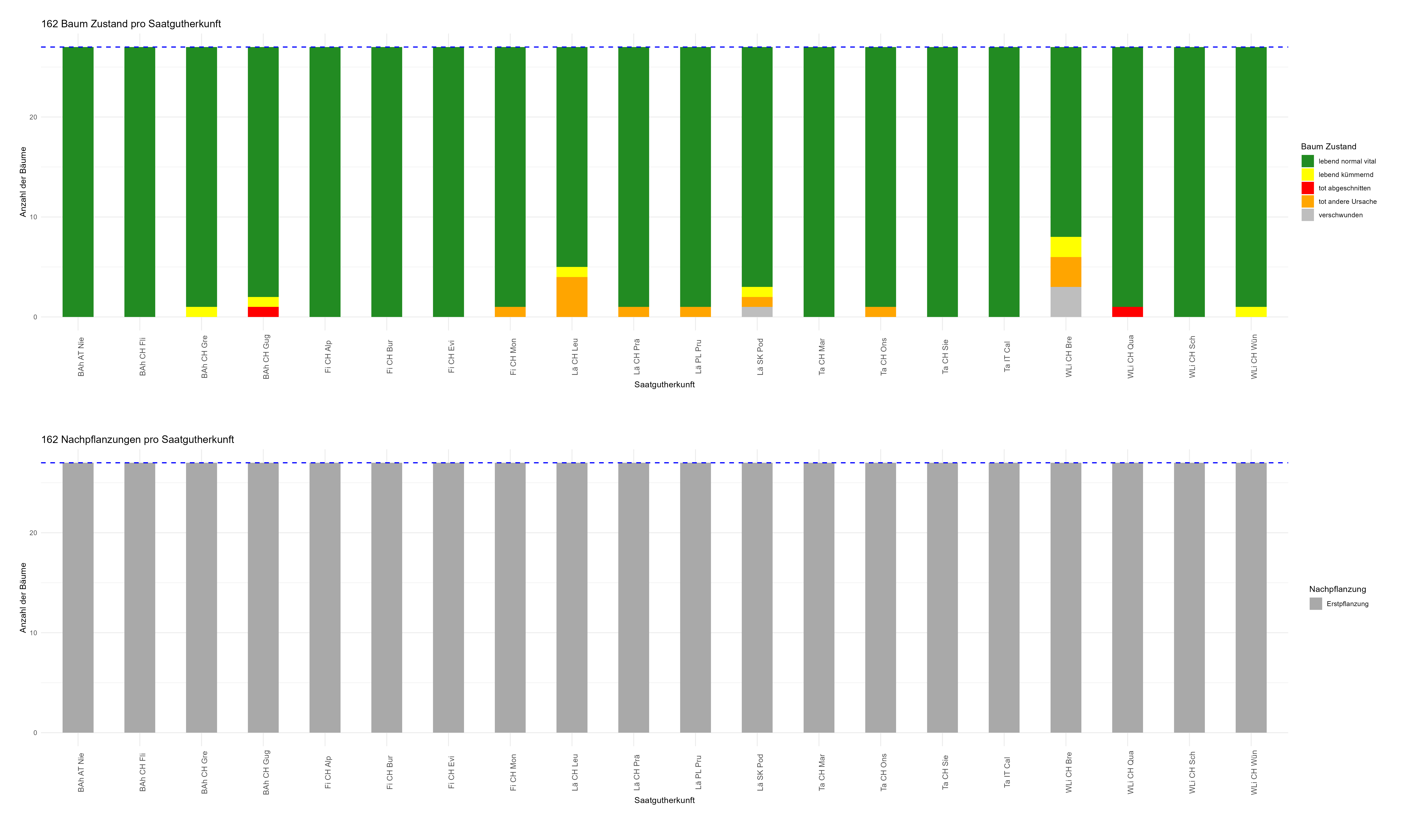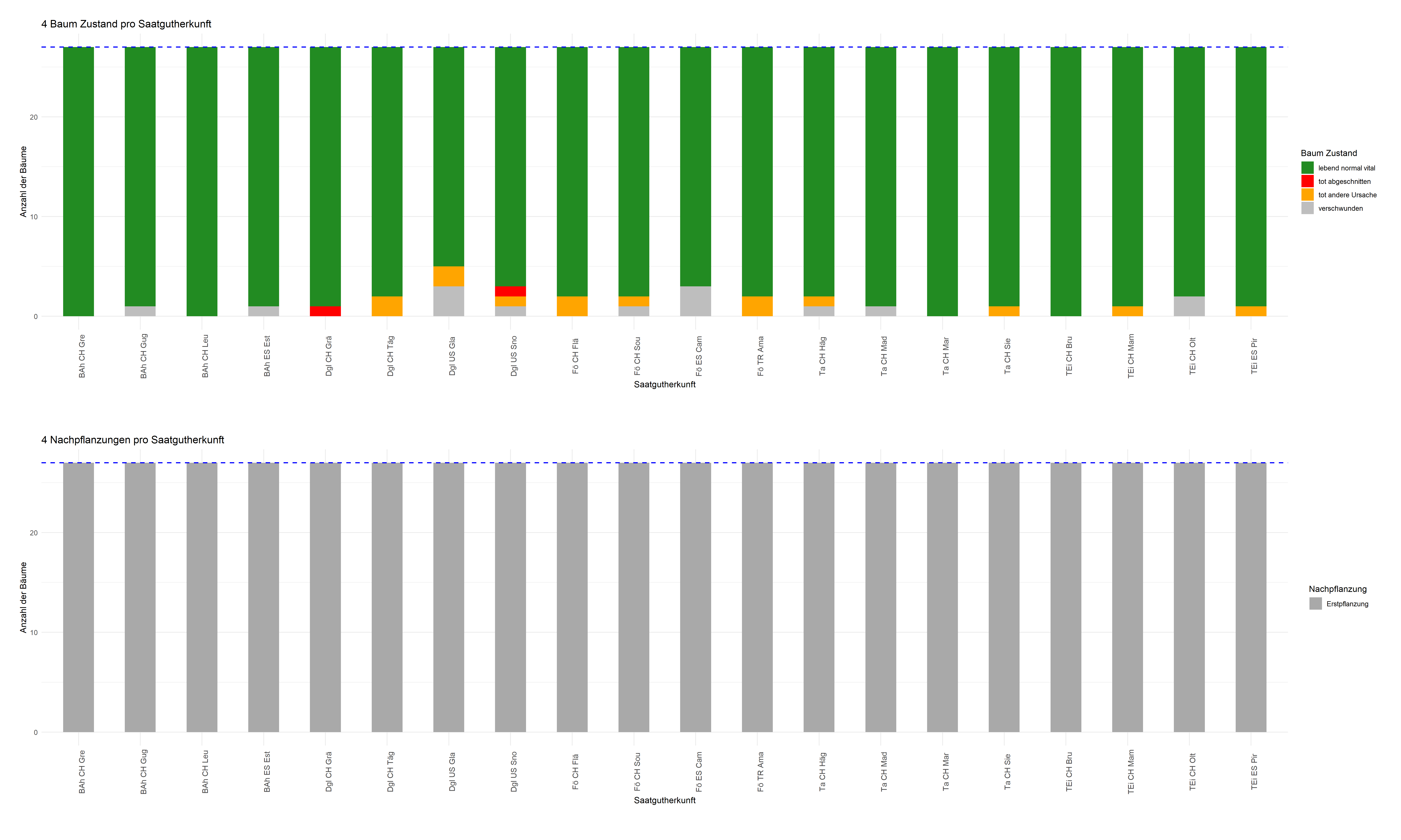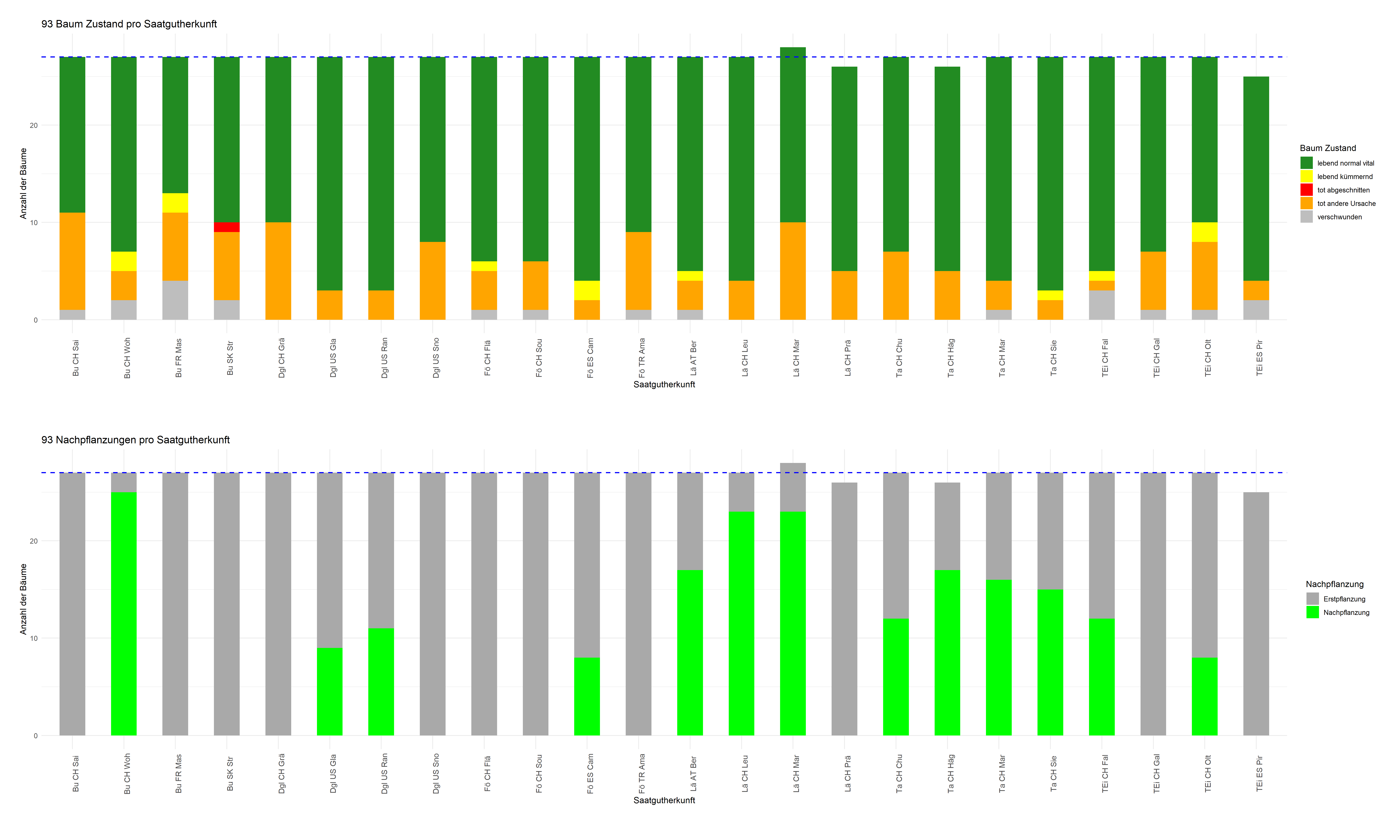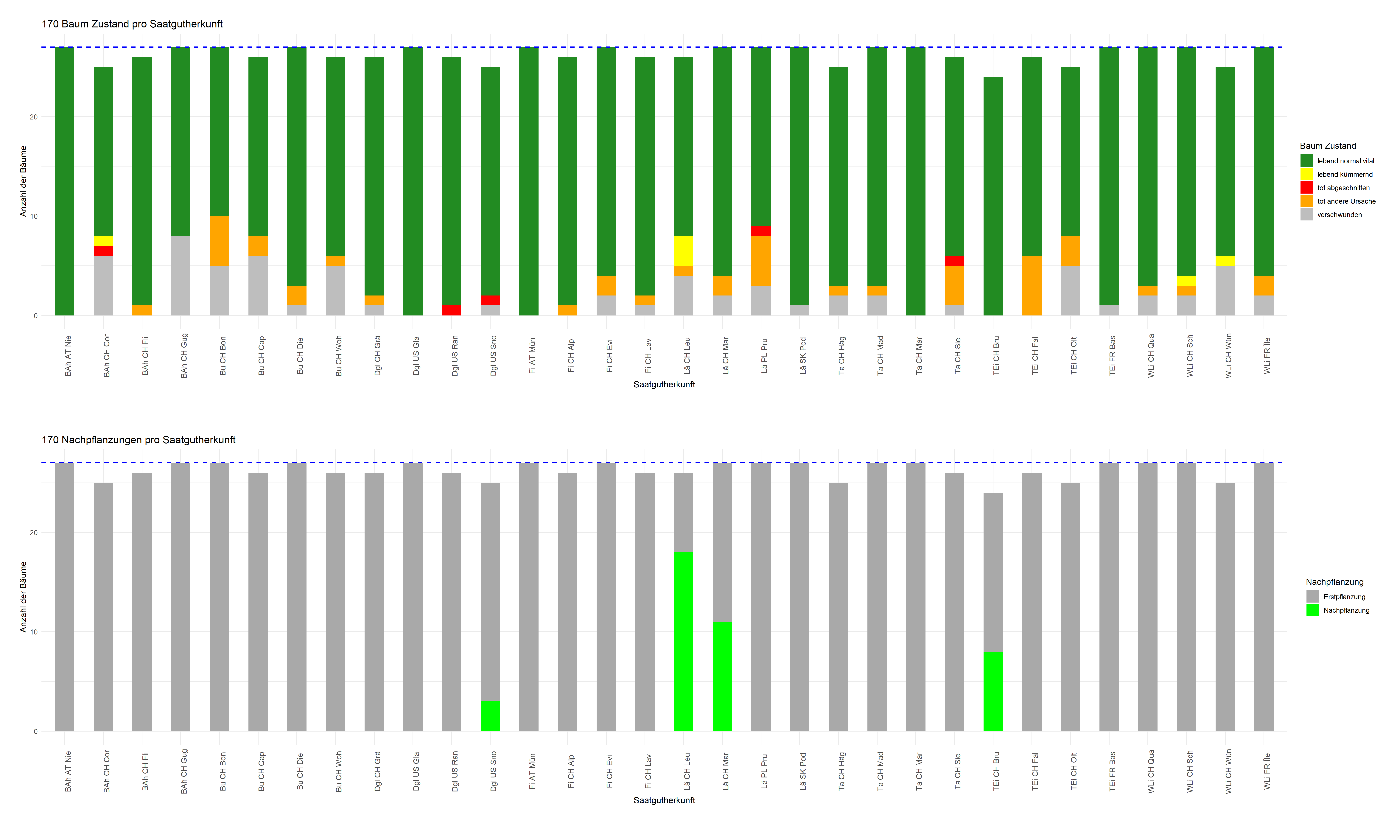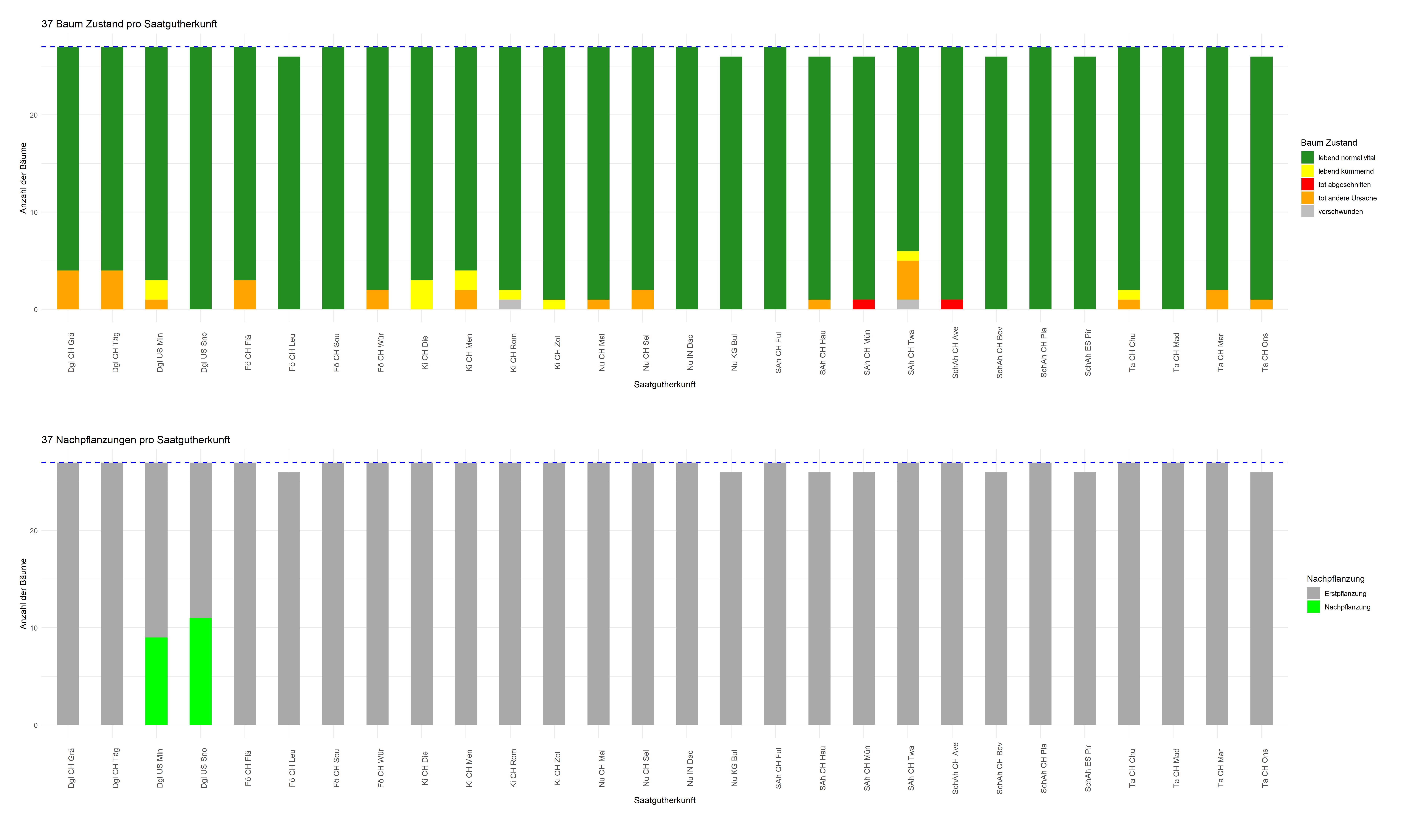 Anzahl BA = Anzahl der in einer Testpflanzung getesteten Baumarten, PP = Pflanzperiode, in welcher eine Testpflanzung eingerichtet wurde: 1 bedeutet Herbst 20 - Frühjahr 21, 2 bedeutet Herbst 21 - Frühjahr 22, 3 bedeutet Herbst 22 - Frühjahr 23. Flächendoku: Folien zu Boden und Klima pro Fläche. Zustand: pro Inventurzeitpunkt (Jahreszahl) Link zu 2 Figuren: Fig 1 Beurteilung des Zustands aller Pflanzen pro Saatgutherkunft pro Fläche (3 Wiederholungsblöcke x 9 Pflanzen= 27 Pflanzen pro Saatgutherkunft pro Fläche) Kategorien: lebend normal vital, lebend kümmernd, tot, abgeschnitten und verschwunden; Fig 2 Anzahl Pflanzen welche zum Inventurzeitpunkt bereits nachgepflanzt waren. Die Bezeichnung der Saatgutherkunft setzt sich auch dem Baumartenkürzel dem Herkunftsland und den ersten 3 Buchstaben der Herkunftsgemeinde zusammen. Baumartenkürzel: BAh Bergahorn, BHa Baumhasel, Bu Buche, Dgl Douglasie, EBe Elsbeere, Fi Fichte, Fö Föhre, Ki Kirsche, Lä Lärche, Nu Nussbaum, SAh Spitzahorn, SchAh Schneeballblättriger Ahorn, SEi Stieleiche, Ta Tanne, TEi Traubeneiche, WLi Winterlinde, Ze Zeder, ZEi Zerreiche