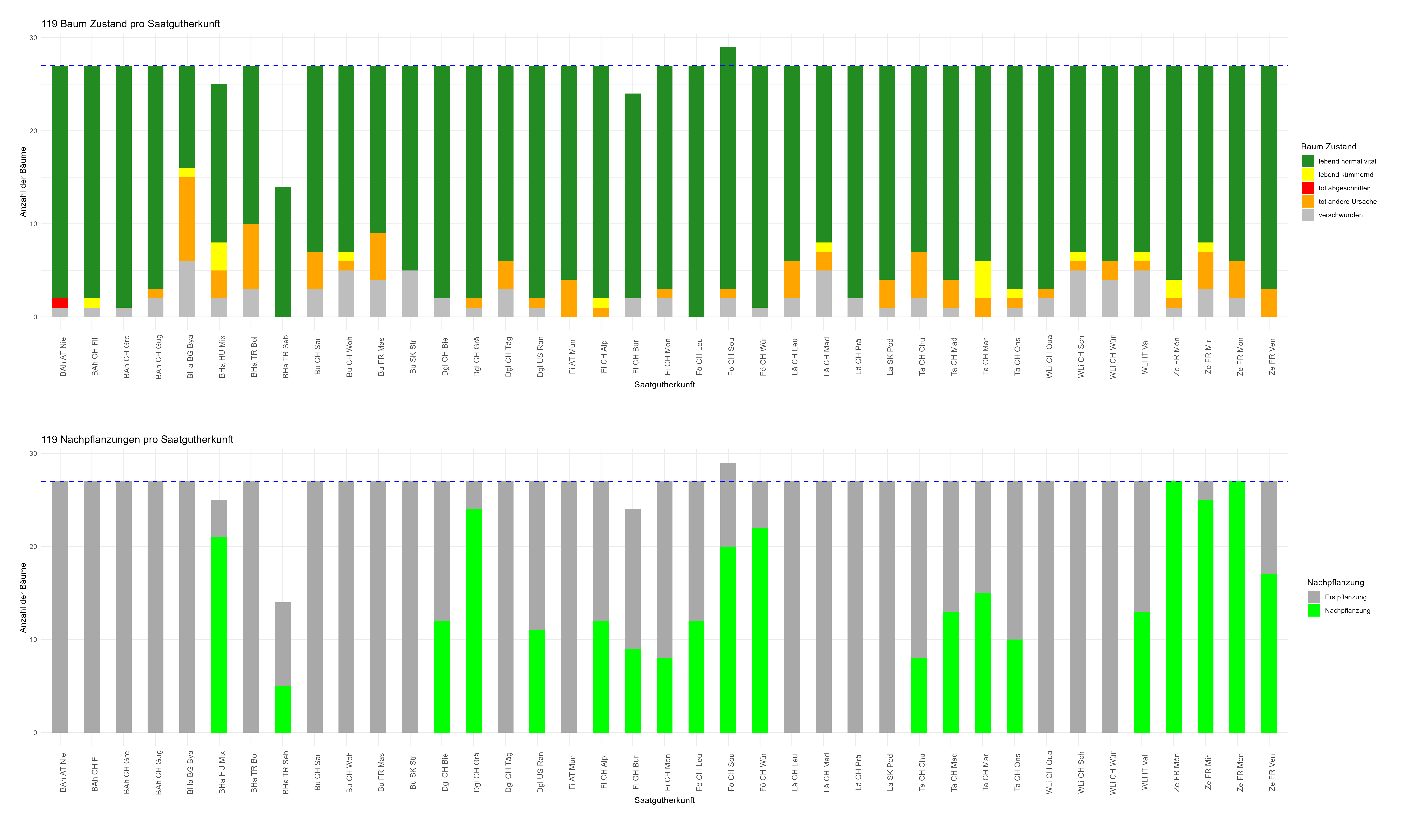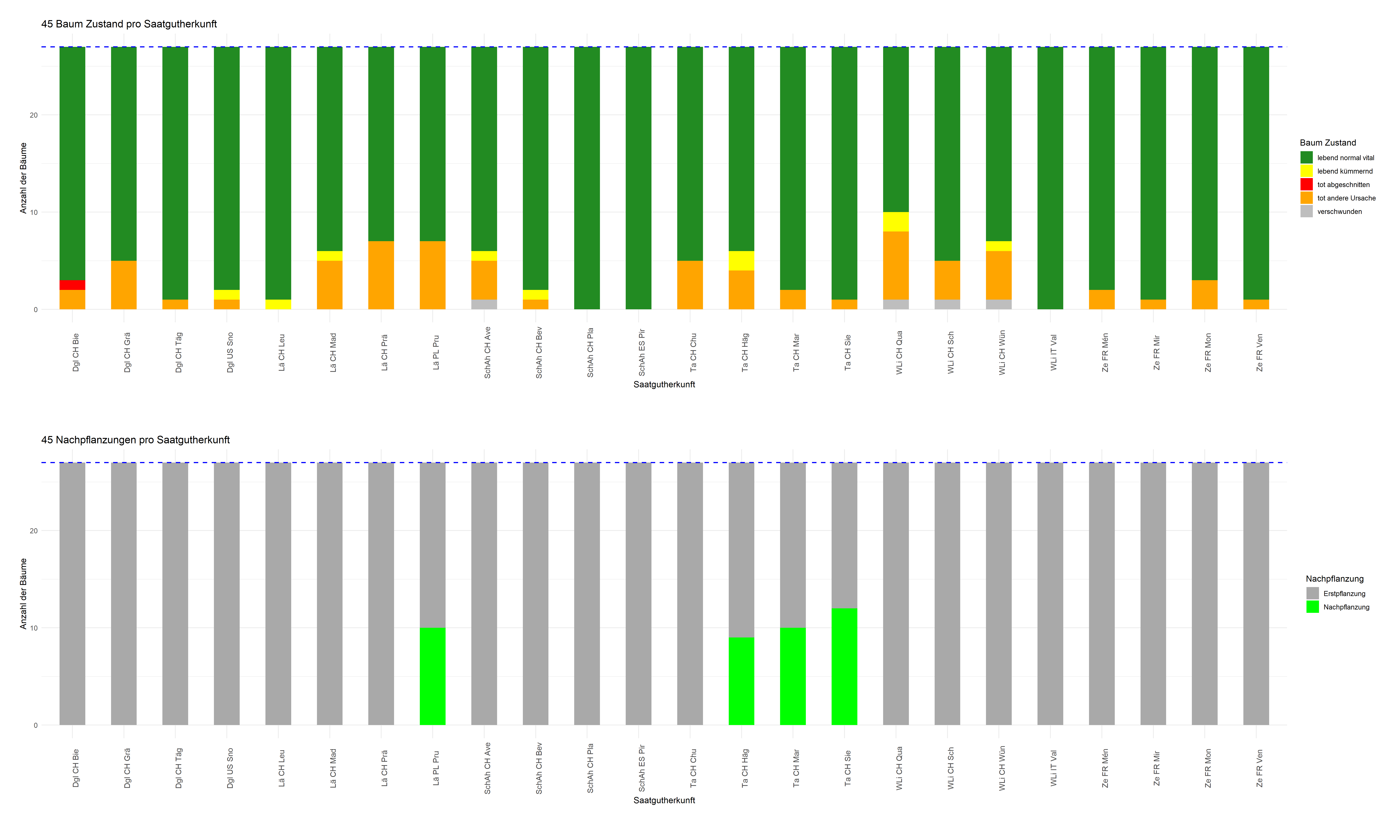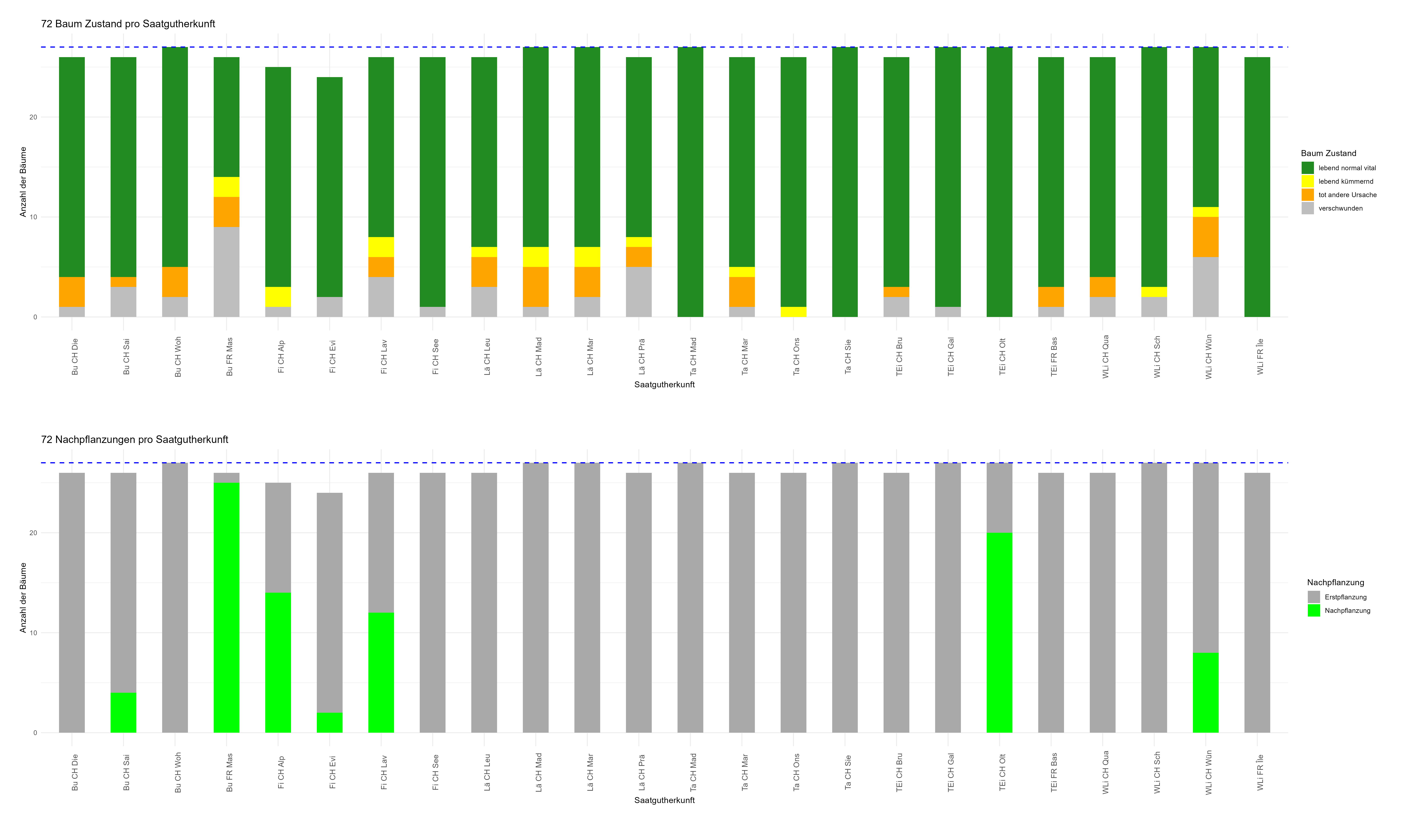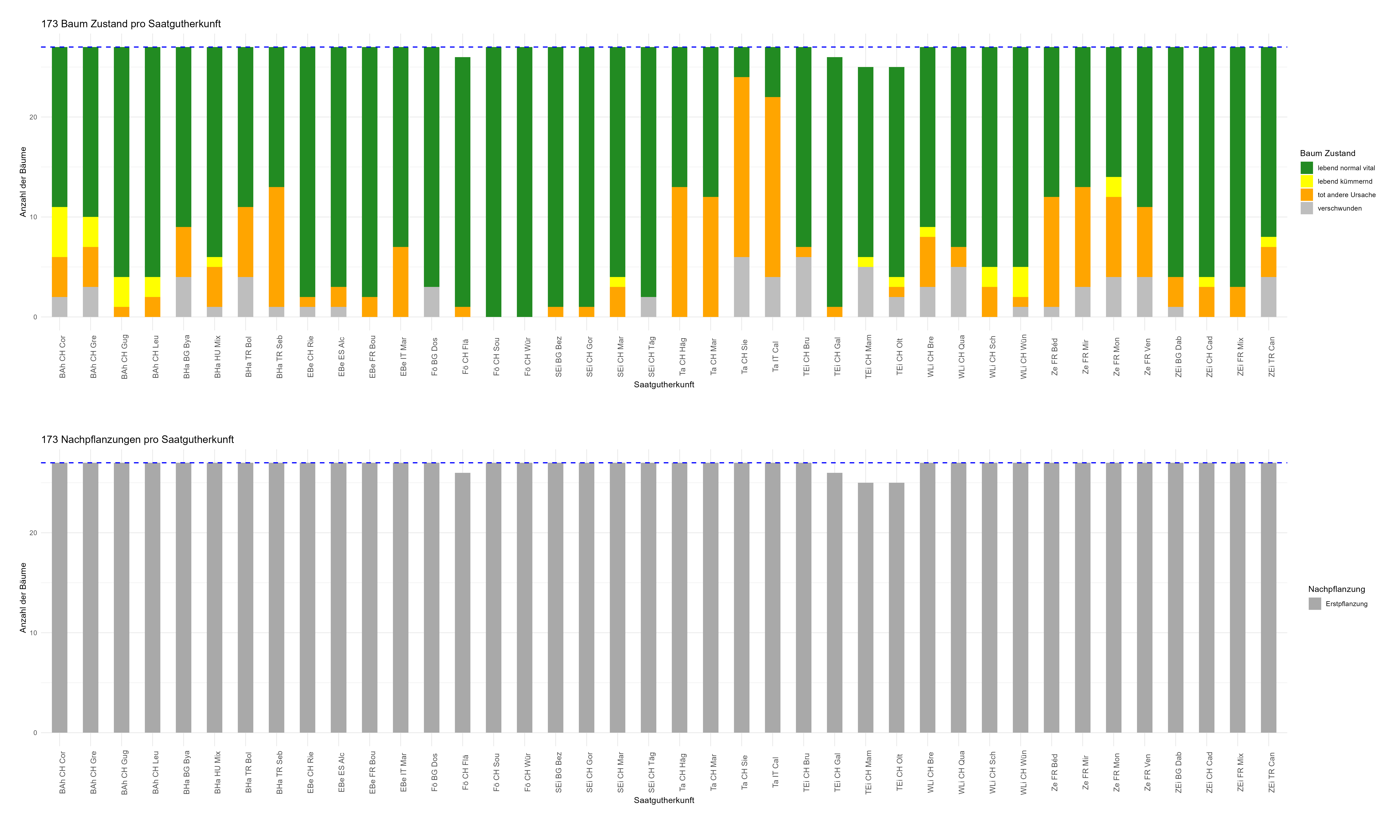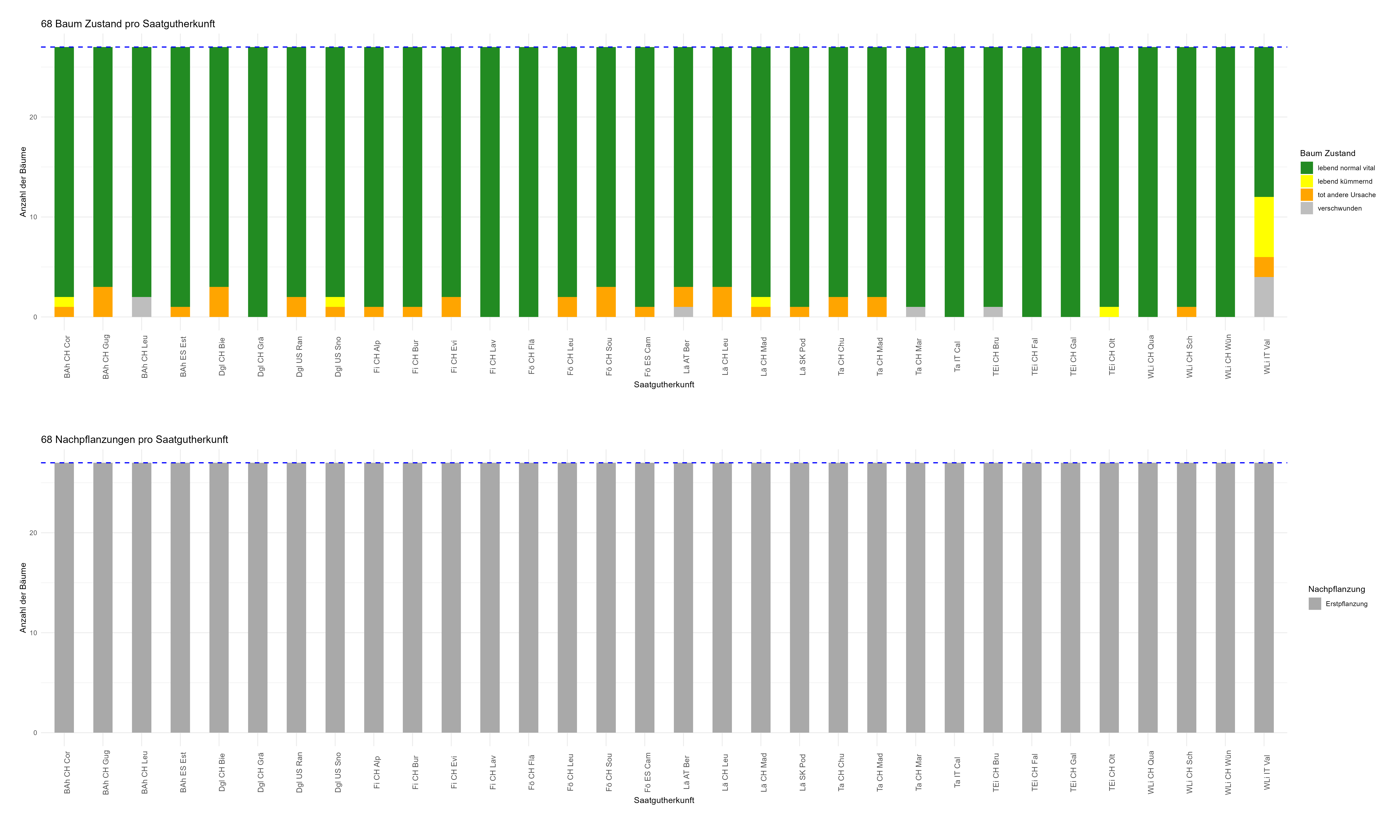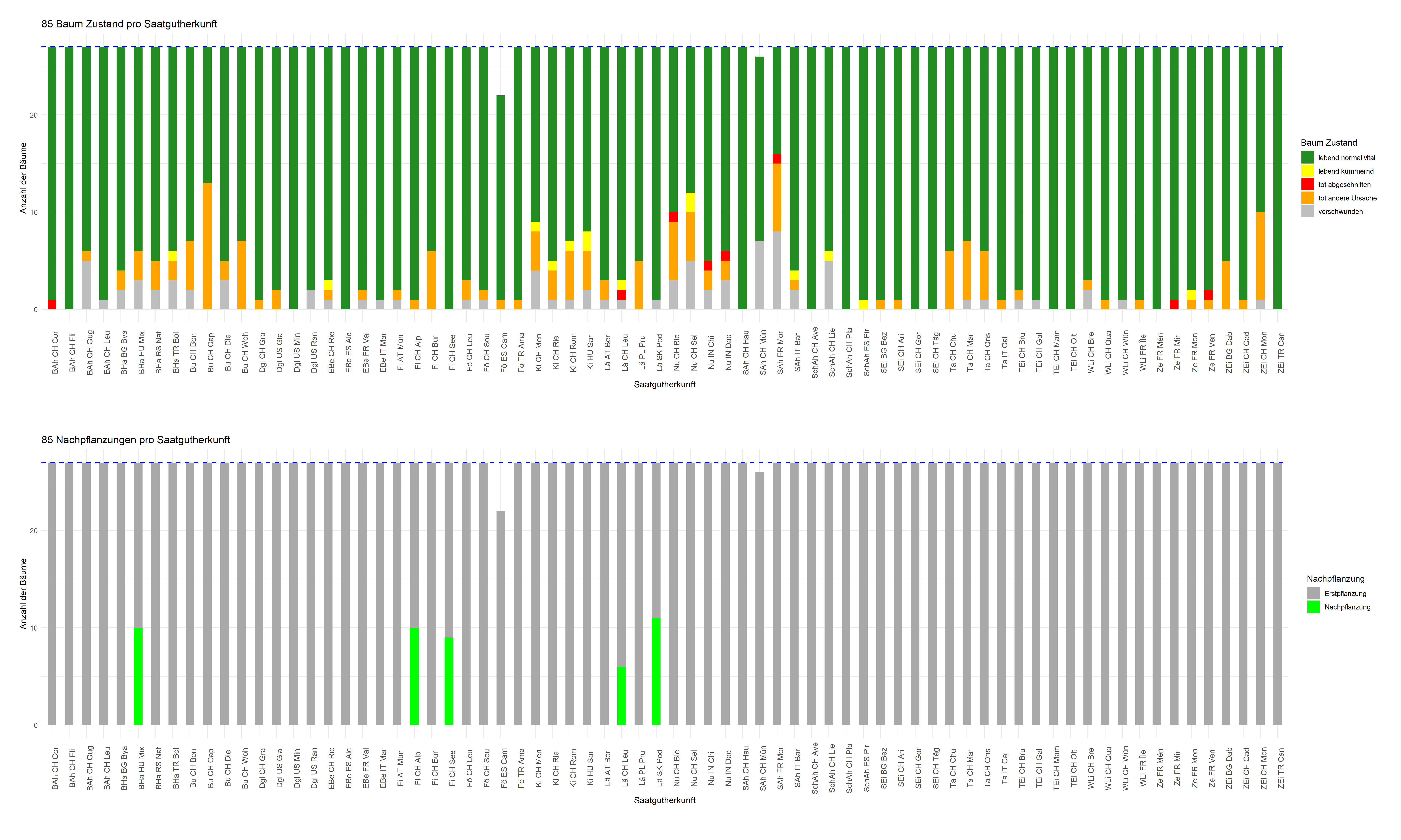 Anzahl BA = Anzahl der in einer Testpflanzung getesteten Baumarten, PP = Pflanzperiode, in welcher eine Testpflanzung eingerichtet wurde: 1 bedeutet Herbst 20 - Frühjahr 21, 2 bedeutet Herbst 21 - Frühjahr 22, 3 bedeutet Herbst 22 - Frühjahr 23. Flächendoku: Folien zu Boden und Klima pro Fläche. Zustand: pro Inventurzeitpunkt (Jahreszahl) Link zu 2 Figuren: Fig 1 Beurteilung des Zustands aller Pflanzen pro Saatgutherkunft pro Fläche (3 Wiederholungsblöcke x 9 Pflanzen= 27 Pflanzen pro Saatgutherkunft pro Fläche) Kategorien: lebend normal vital, lebend kümmernd, tot, abgeschnitten und verschwunden; Fig 2 Anzahl Pflanzen welche zum Inventurzeitpunkt bereits nachgepflanzt waren. Die Bezeichnung der Saatgutherkunft setzt sich auch dem Baumartenkürzel dem Herkunftsland und den ersten 3 Buchstaben der Herkunftsgemeinde zusammen. Baumartenkürzel: BAh Bergahorn, BHa Baumhasel, Bu Buche, Dgl Douglasie, EBe Elsbeere, Fi Fichte, Fö Föhre, Ki Kirsche, Lä Lärche, Nu Nussbaum, SAh Spitzahorn, SchAh Schneeballblättriger Ahorn, SEi Stieleiche, Ta Tanne, TEi Traubeneiche, WLi Winterlinde, Ze Zeder, ZEi Zerreiche