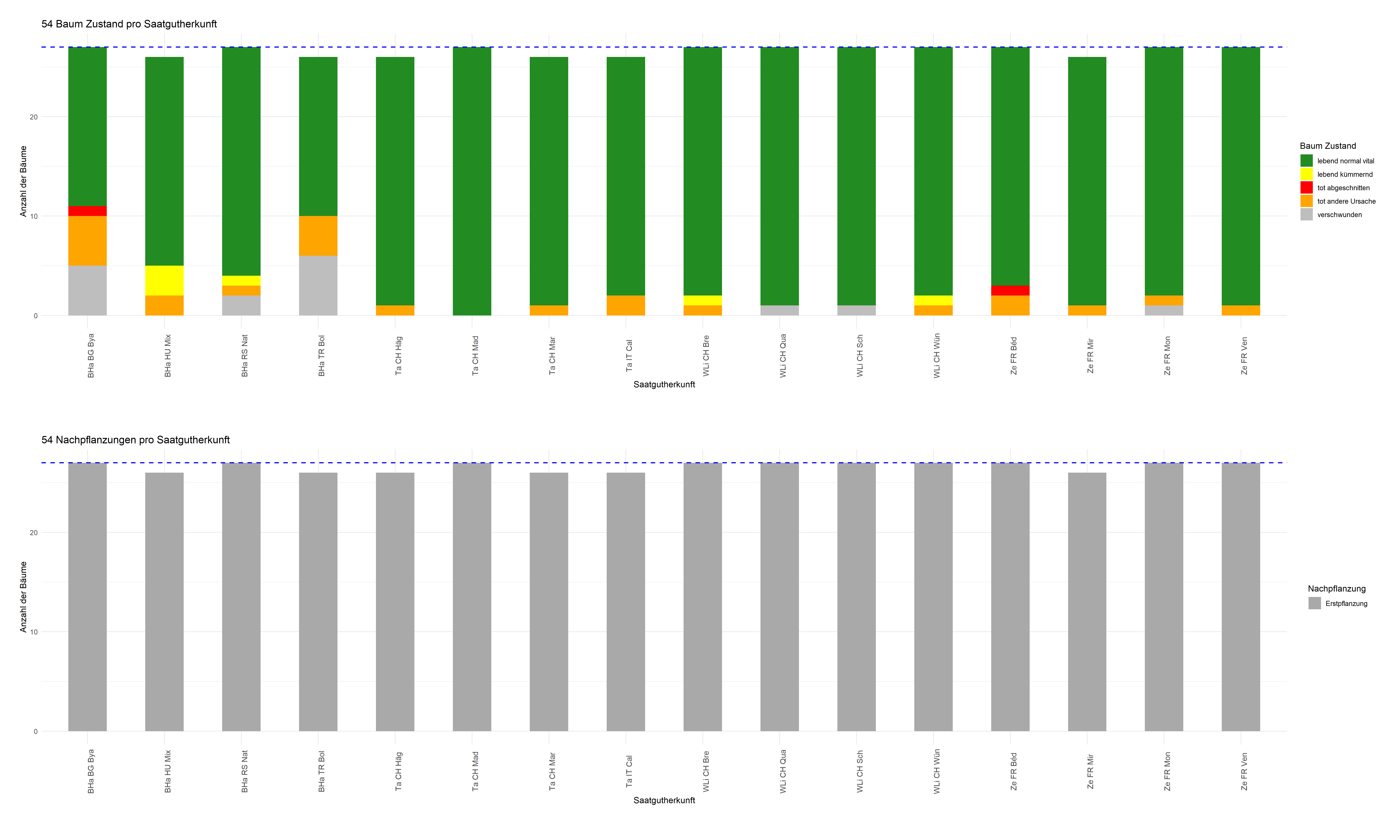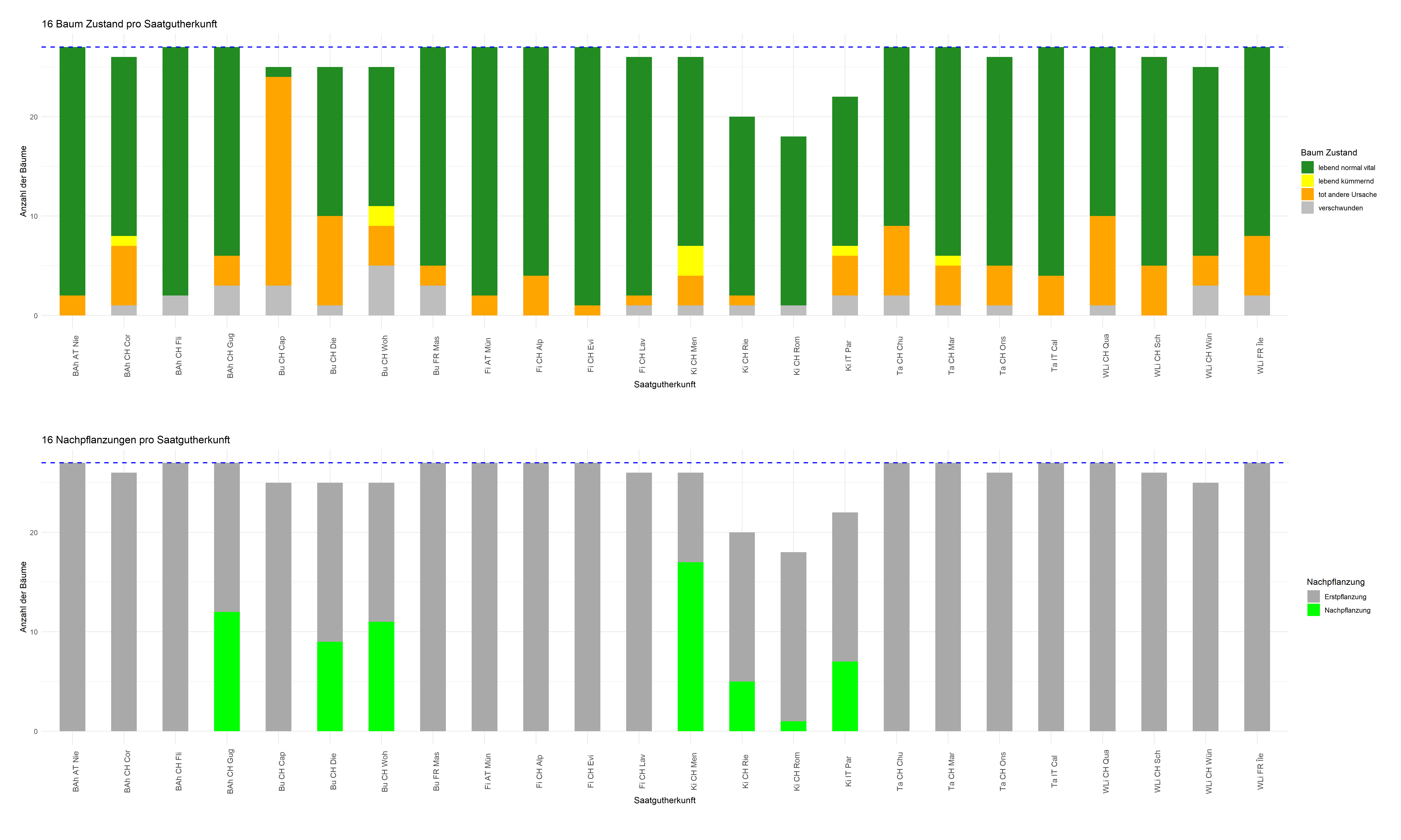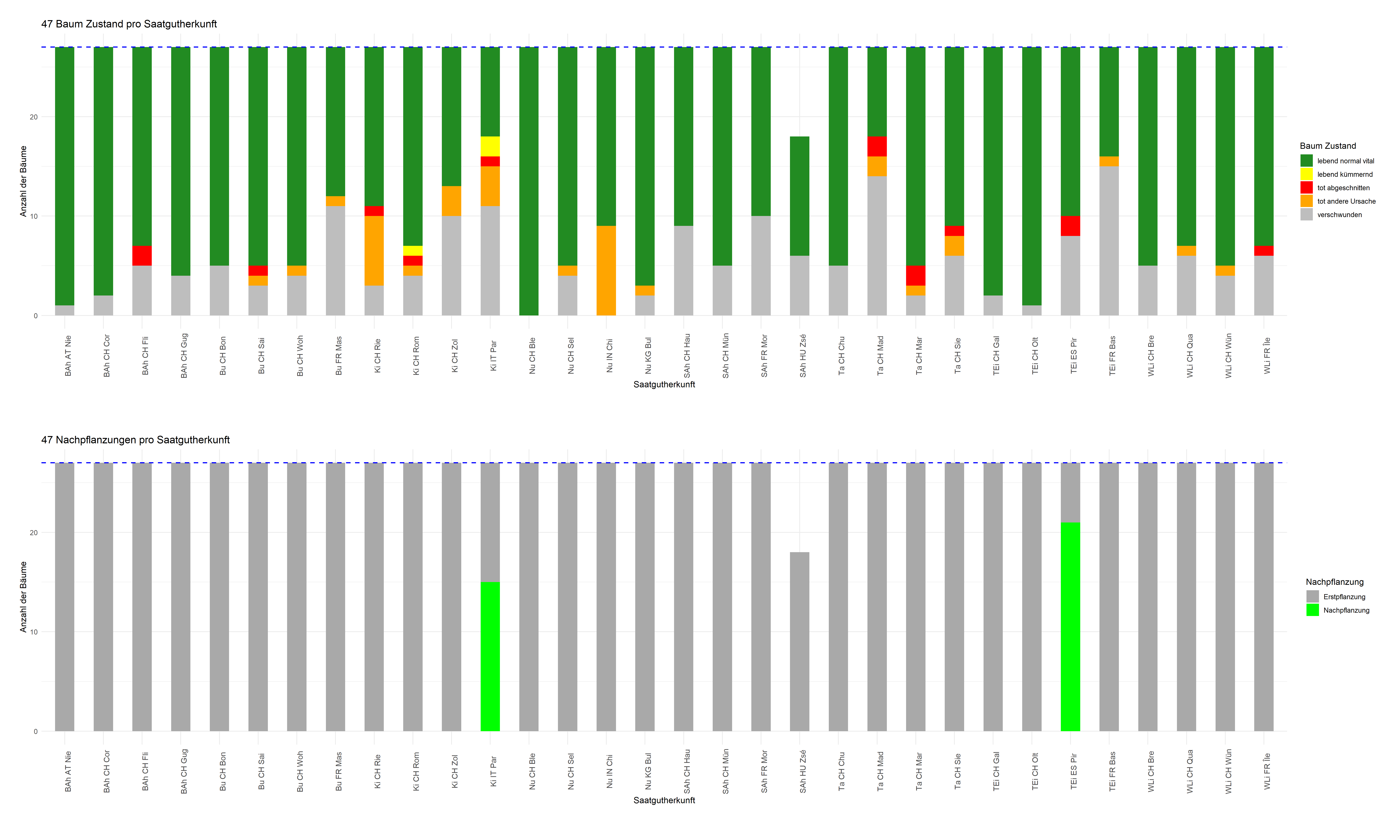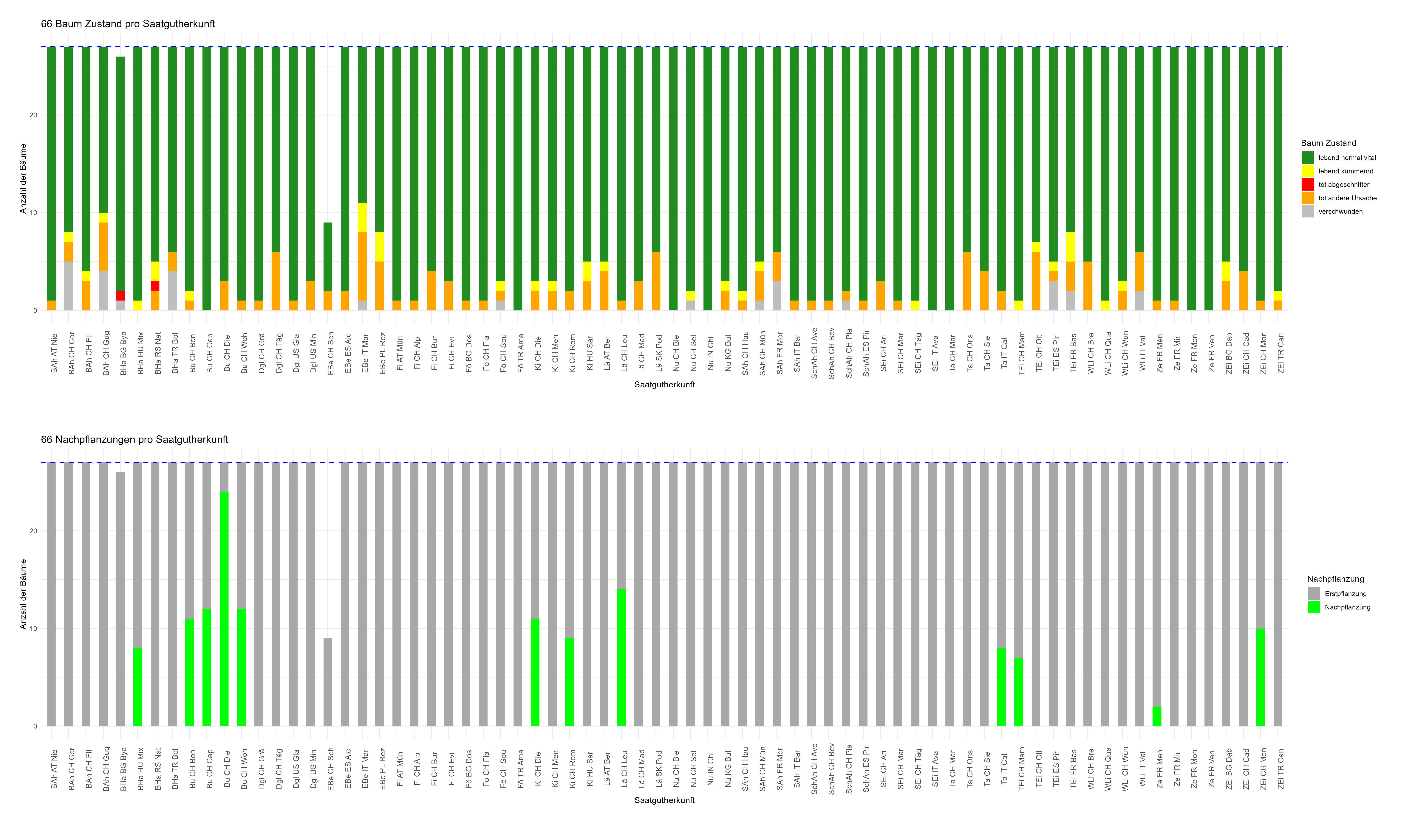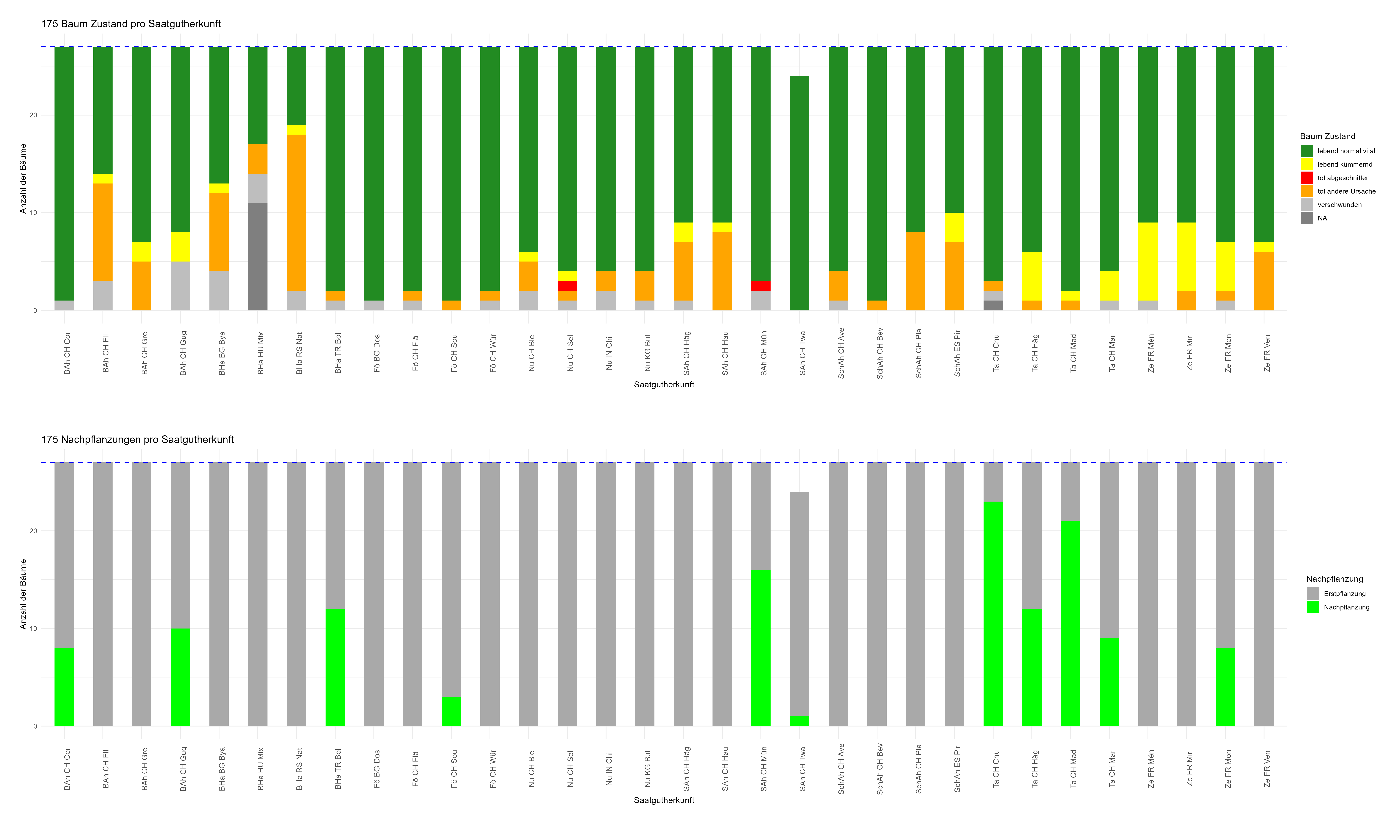 Anzahl BA = Anzahl der in einer Testpflanzung getesteten Baumarten, PP = Pflanzperiode, in welcher eine Testpflanzung eingerichtet wurde: 1 bedeutet Herbst 20 - Frühjahr 21, 2 bedeutet Herbst 21 - Frühjahr 22, 3 bedeutet Herbst 22 - Frühjahr 23. Flächendoku: Folien zu Boden und Klima pro Fläche. Zustand: pro Inventurzeitpunkt (Jahreszahl) Link zu 2 Figuren: Fig 1 Beurteilung des Zustands aller Pflanzen pro Saatgutherkunft pro Fläche (3 Wiederholungsblöcke x 9 Pflanzen= 27 Pflanzen pro Saatgutherkunft pro Fläche) Kategorien: lebend normal vital, lebend kümmernd, tot, abgeschnitten und verschwunden; Fig 2 Anzahl Pflanzen welche zum Inventurzeitpunkt bereits nachgepflanzt waren. Die Bezeichnung der Saatgutherkunft setzt sich auch dem Baumartenkürzel dem Herkunftsland und den ersten 3 Buchstaben der Herkunftsgemeinde zusammen. Baumartenkürzel: BAh Bergahorn, BHa Baumhasel, Bu Buche, Dgl Douglasie, EBe Elsbeere, Fi Fichte, Fö Föhre, Ki Kirsche, Lä Lärche, Nu Nussbaum, SAh Spitzahorn, SchAh Schneeballblättriger Ahorn, SEi Stieleiche, Ta Tanne, TEi Traubeneiche, WLi Winterlinde, Ze Zeder, ZEi Zerreiche