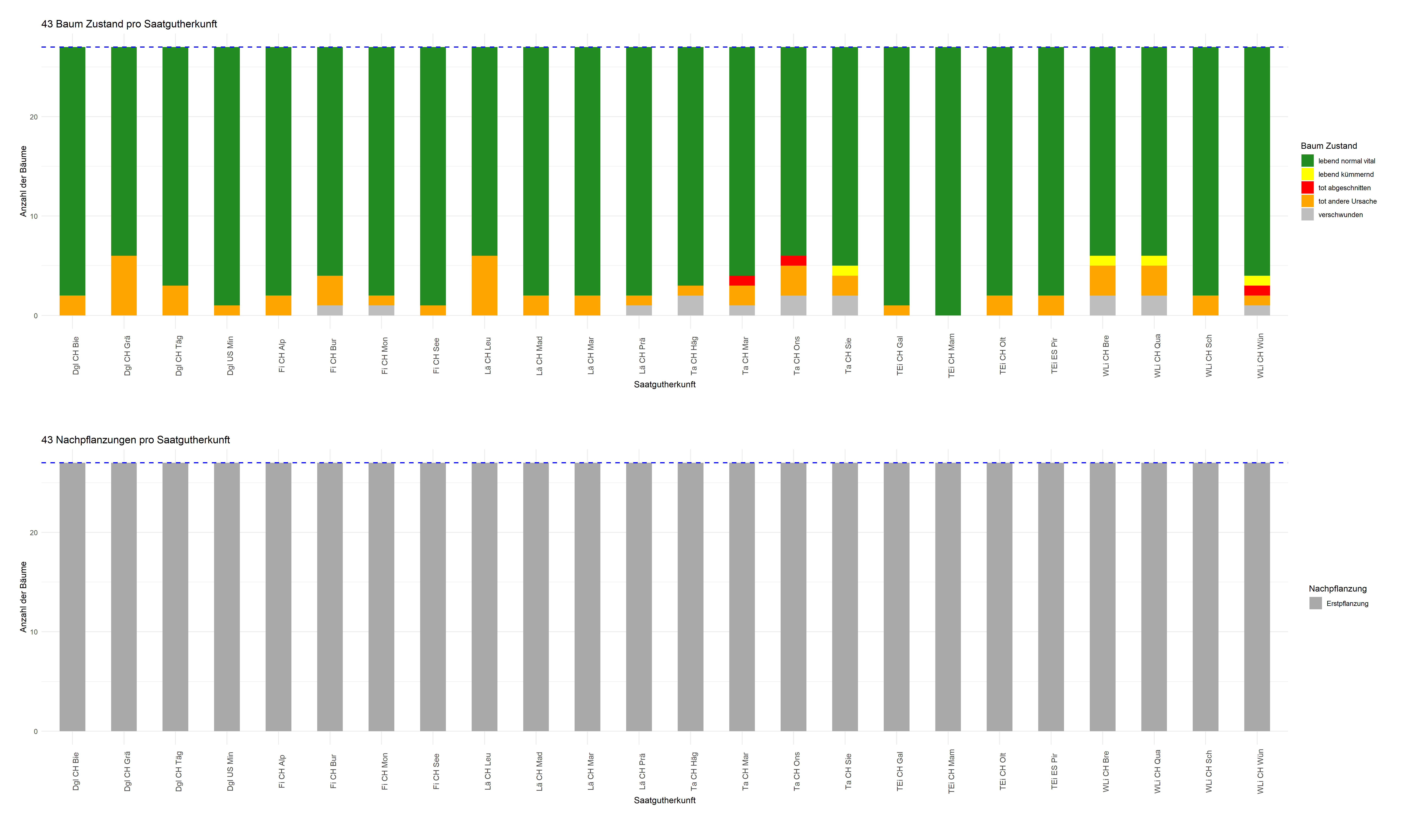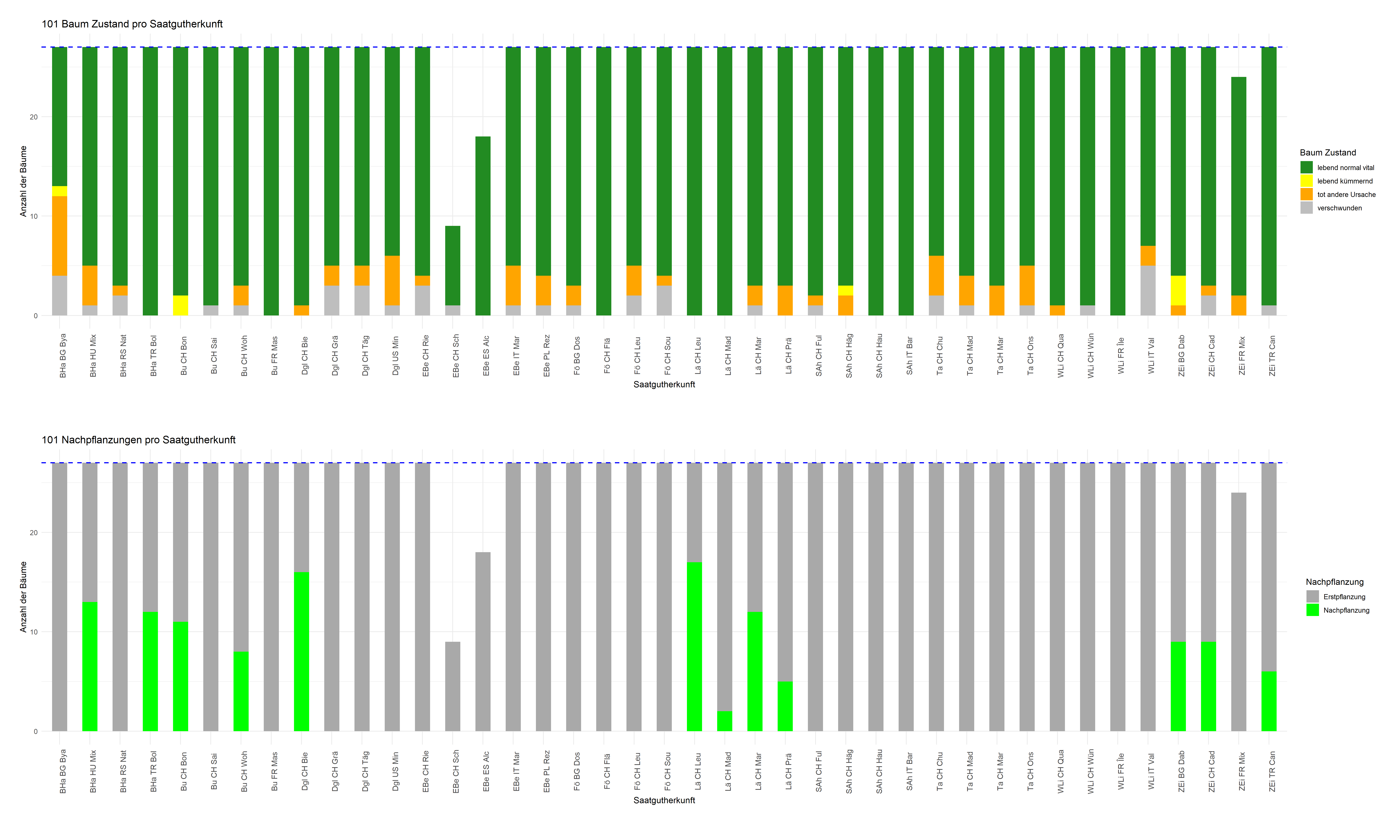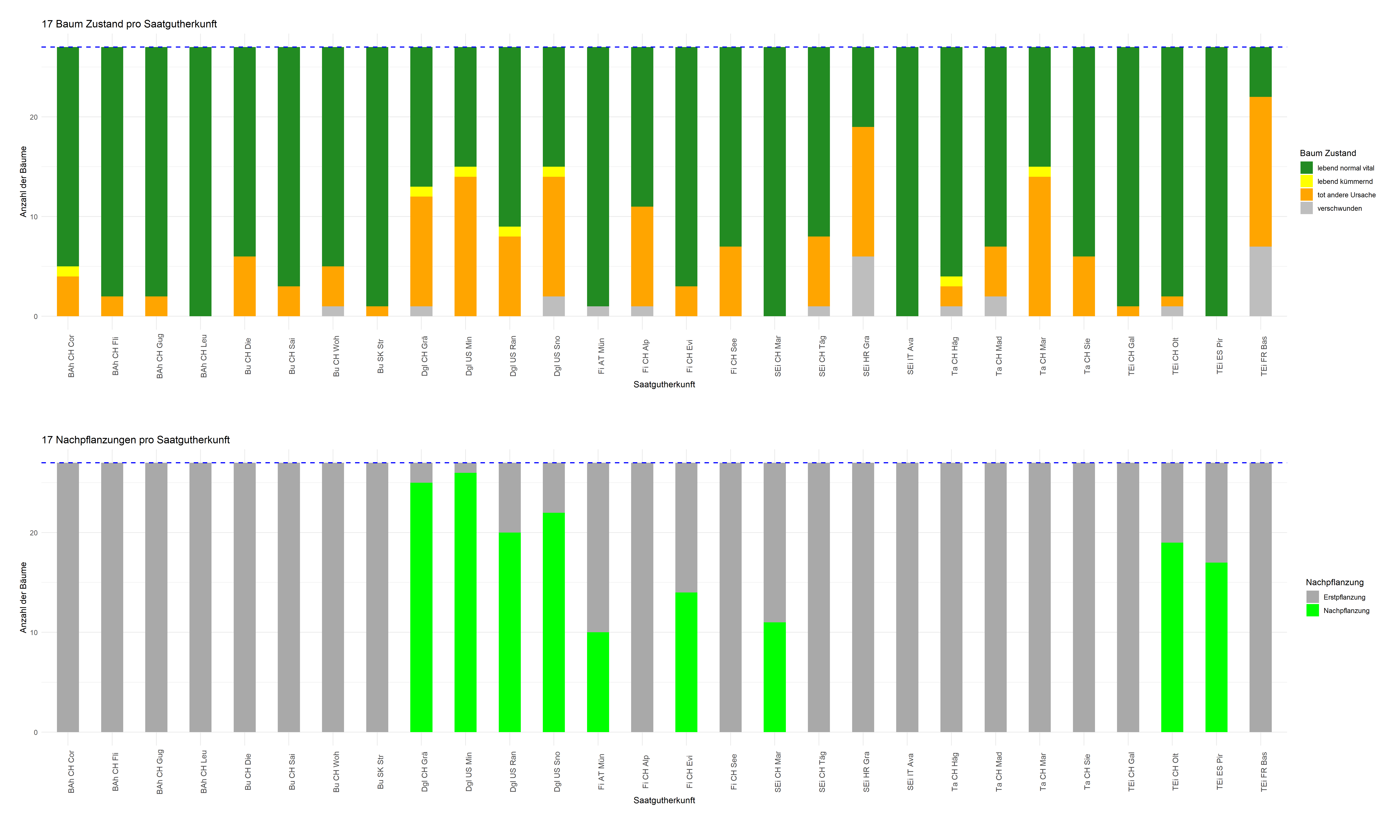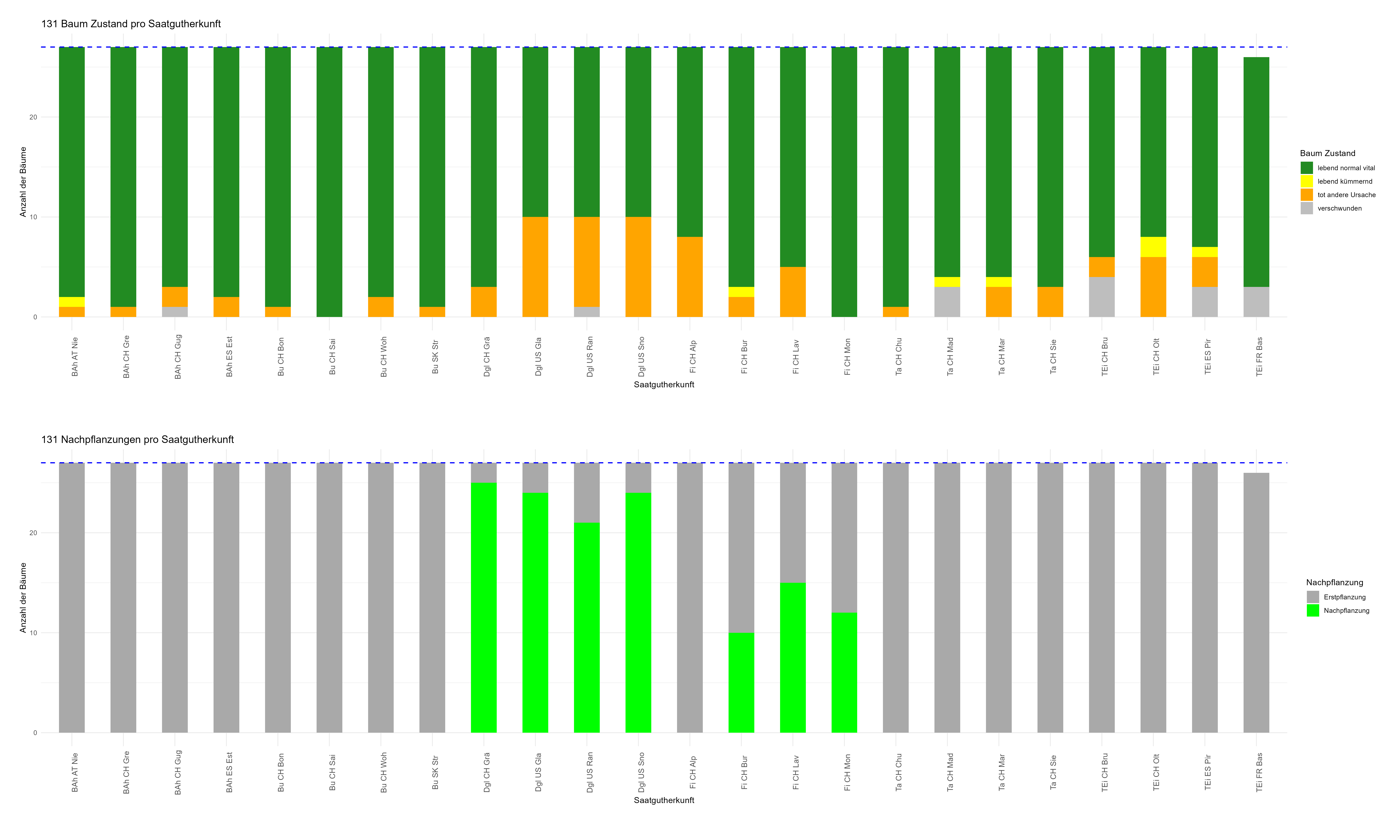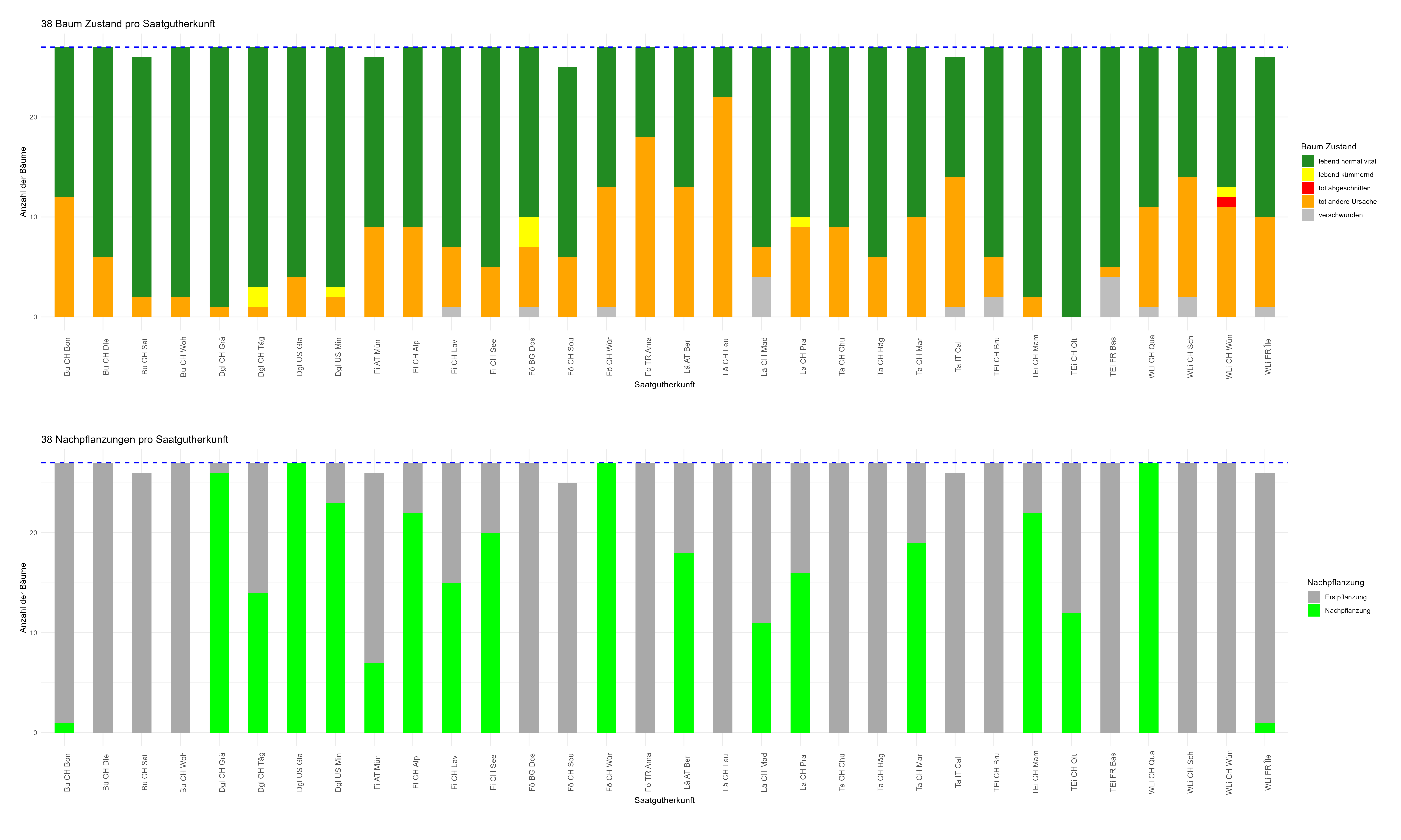 Anzahl BA = Anzahl der in einer Testpflanzung getesteten Baumarten, PP = Pflanzperiode, in welcher eine Testpflanzung eingerichtet wurde: 1 bedeutet Herbst 20 - Frühjahr 21, 2 bedeutet Herbst 21 - Frühjahr 22, 3 bedeutet Herbst 22 - Frühjahr 23. Flächendoku: Folien zu Boden und Klima pro Fläche. Zustand: pro Inventurzeitpunkt (Jahreszahl) Link zu 2 Figuren: Fig 1 Beurteilung des Zustands aller Pflanzen pro Saatgutherkunft pro Fläche (3 Wiederholungsblöcke x 9 Pflanzen= 27 Pflanzen pro Saatgutherkunft pro Fläche) Kategorien: lebend normal vital, lebend kümmernd, tot, abgeschnitten und verschwunden; Fig 2 Anzahl Pflanzen welche zum Inventurzeitpunkt bereits nachgepflanzt waren. Die Bezeichnung der Saatgutherkunft setzt sich auch dem Baumartenkürzel dem Herkunftsland und den ersten 3 Buchstaben der Herkunftsgemeinde zusammen. Baumartenkürzel: BAh Bergahorn, BHa Baumhasel, Bu Buche, Dgl Douglasie, EBe Elsbeere, Fi Fichte, Fö Föhre, Ki Kirsche, Lä Lärche, Nu Nussbaum, SAh Spitzahorn, SchAh Schneeballblättriger Ahorn, SEi Stieleiche, Ta Tanne, TEi Traubeneiche, WLi Winterlinde, Ze Zeder, ZEi Zerreiche