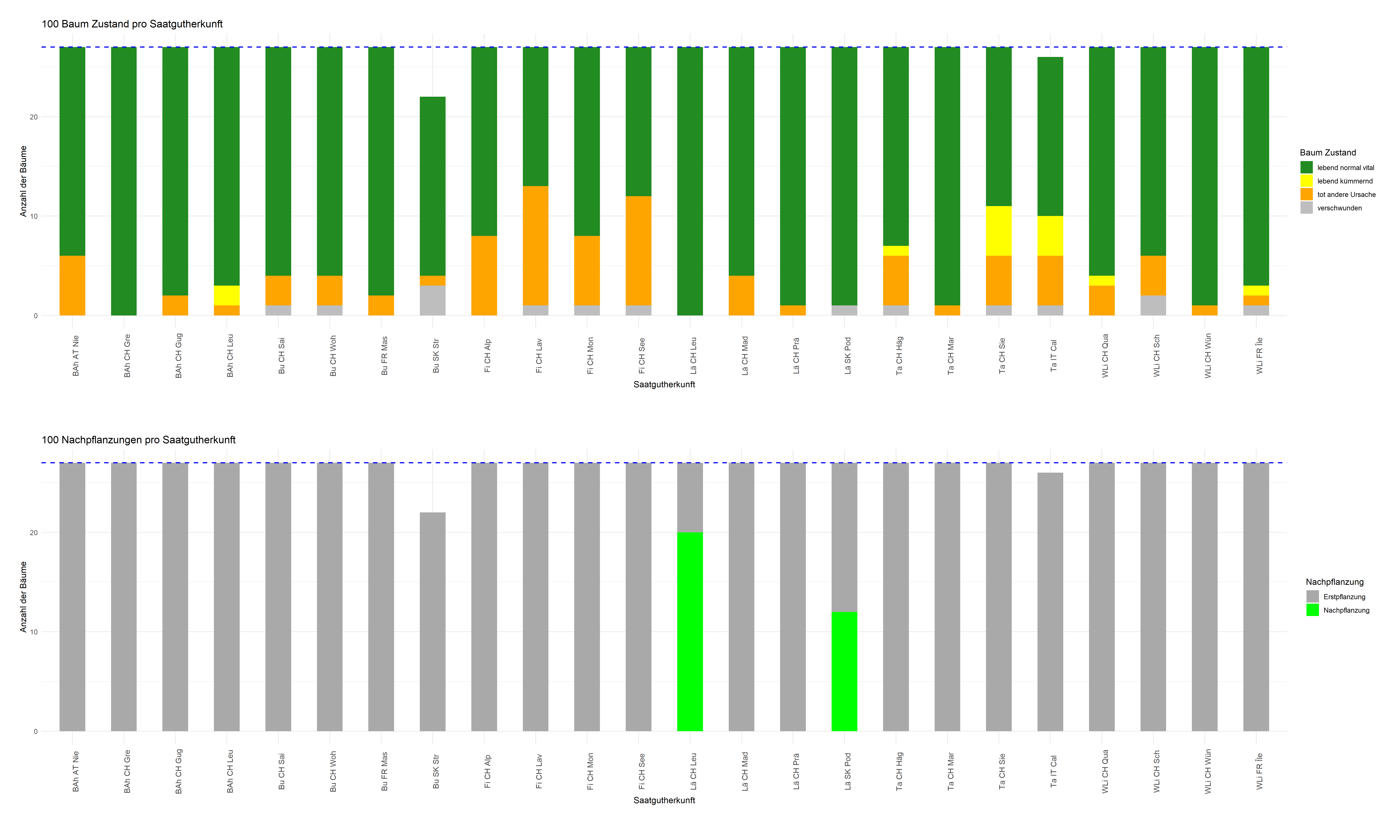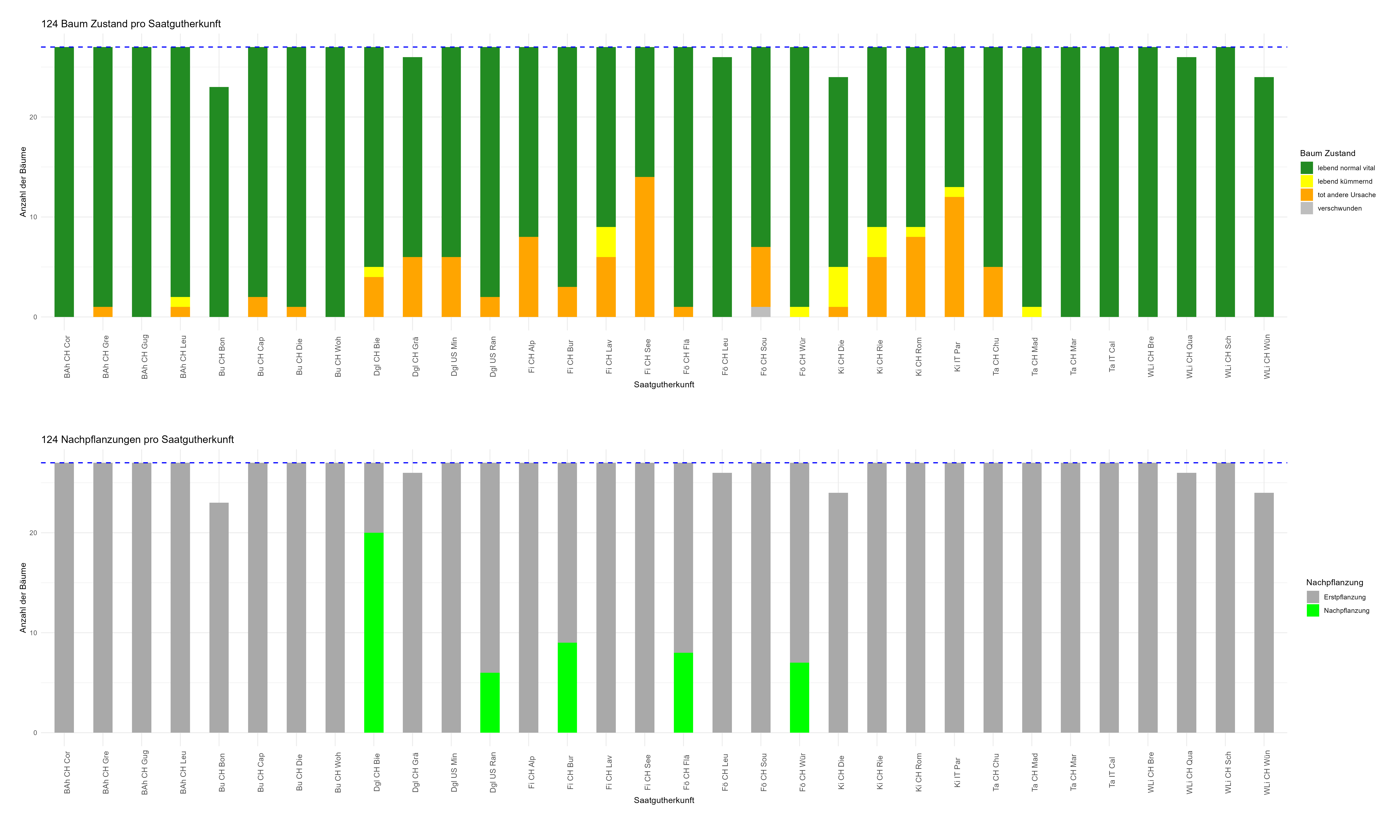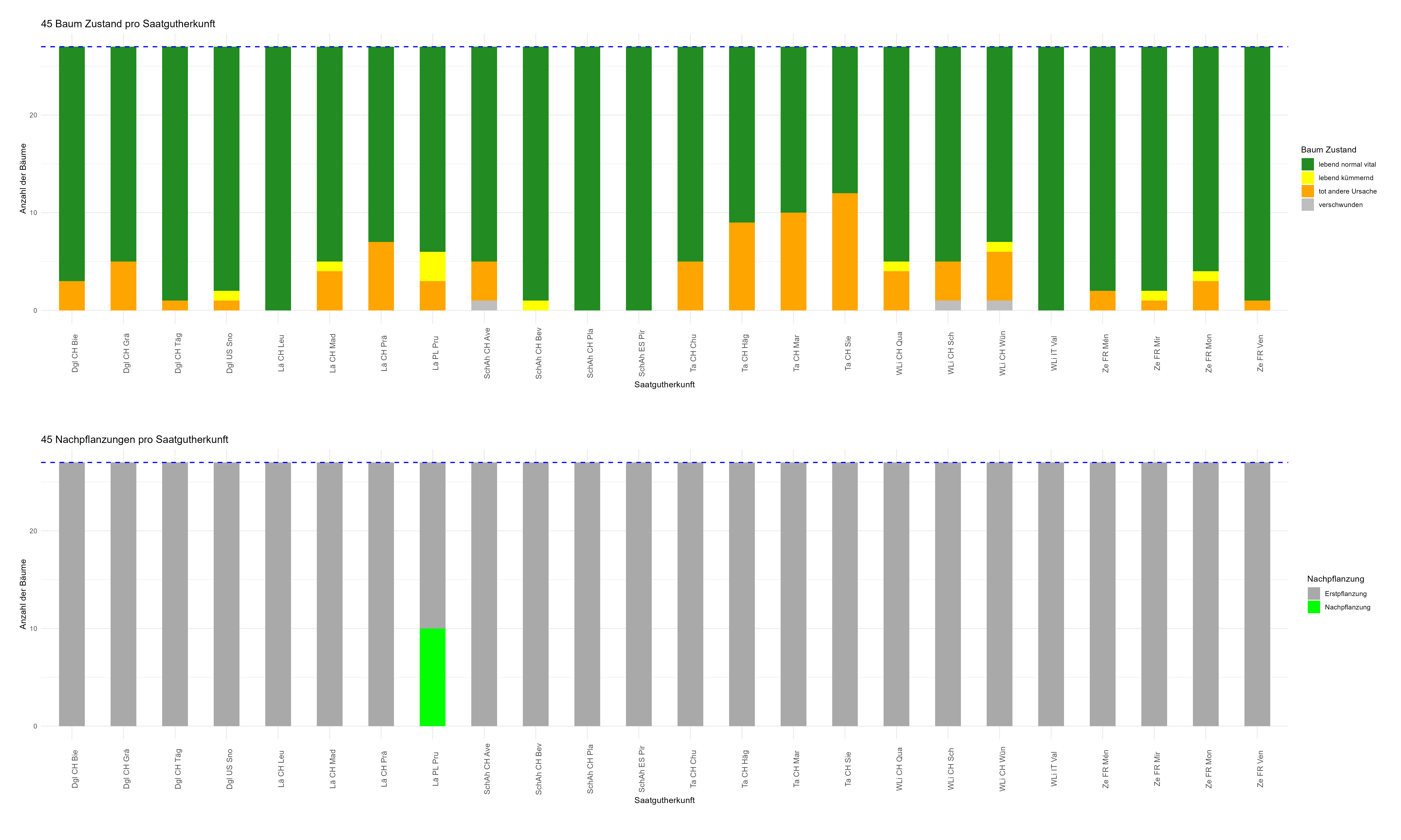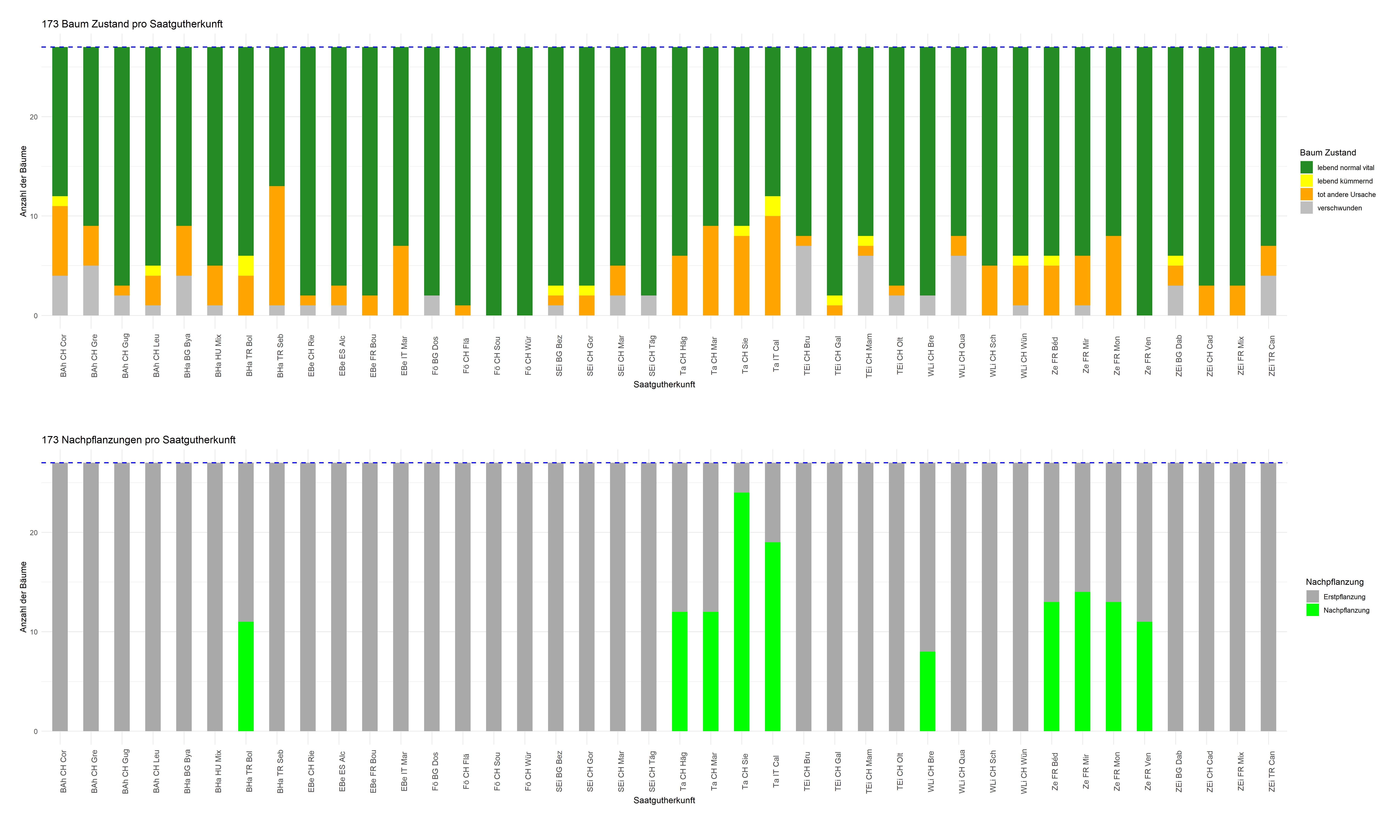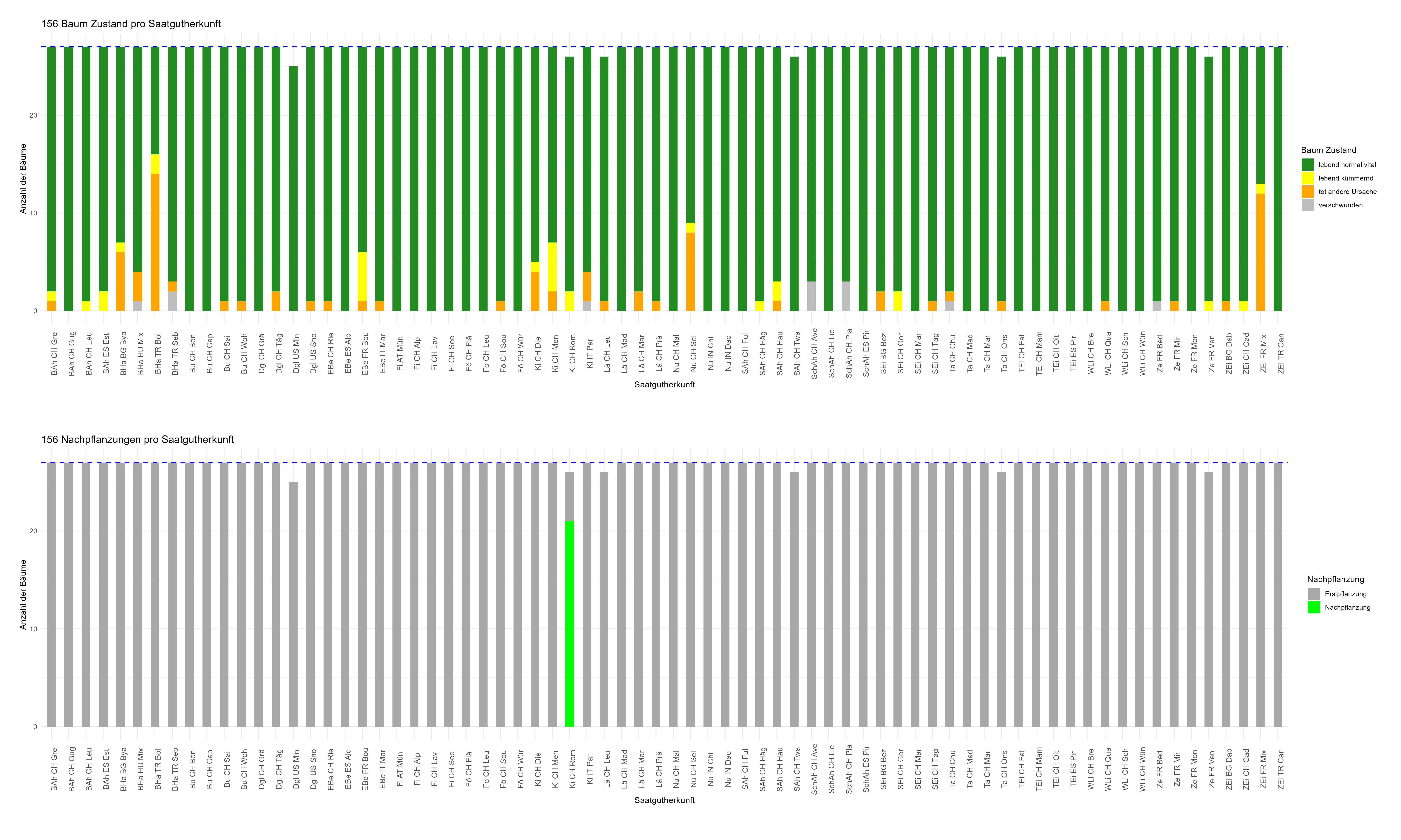 Anzahl BA = Anzahl der in einer Testpflanzung getesteten Baumarten, PP = Pflanzperiode, in welcher eine Testpflanzung eingerichtet wurde: 1 bedeutet Herbst 20 - Frühjahr 21, 2 bedeutet Herbst 21 - Frühjahr 22, 3 bedeutet Herbst 22 - Frühjahr 23. Flächendoku: Folien zu Boden und Klima pro Fläche. Zustand: pro Inventurzeitpunkt (Jahreszahl) Link zu 2 Figuren: Fig 1 Beurteilung des Zustands aller Pflanzen pro Saatgutherkunft pro Fläche (3 Wiederholungsblöcke x 9 Pflanzen= 27 Pflanzen pro Saatgutherkunft pro Fläche) Kategorien: lebend normal vital, lebend kümmernd, tot, abgeschnitten und verschwunden; Fig 2 Anzahl Pflanzen welche zum Inventurzeitpunkt bereits nachgepflanzt waren. Die Bezeichnung der Saatgutherkunft setzt sich auch dem Baumartenkürzel dem Herkunftsland und den ersten 3 Buchstaben der Herkunftsgemeinde zusammen. Baumartenkürzel: BAh Bergahorn, BHa Baumhasel, Bu Buche, Dgl Douglasie, EBe Elsbeere, Fi Fichte, Fö Föhre, Ki Kirsche, Lä Lärche, Nu Nussbaum, SAh Spitzahorn, SchAh Schneeballblättriger Ahorn, SEi Stieleiche, Ta Tanne, TEi Traubeneiche, WLi Winterlinde, Ze Zeder, ZEi Zerreiche
