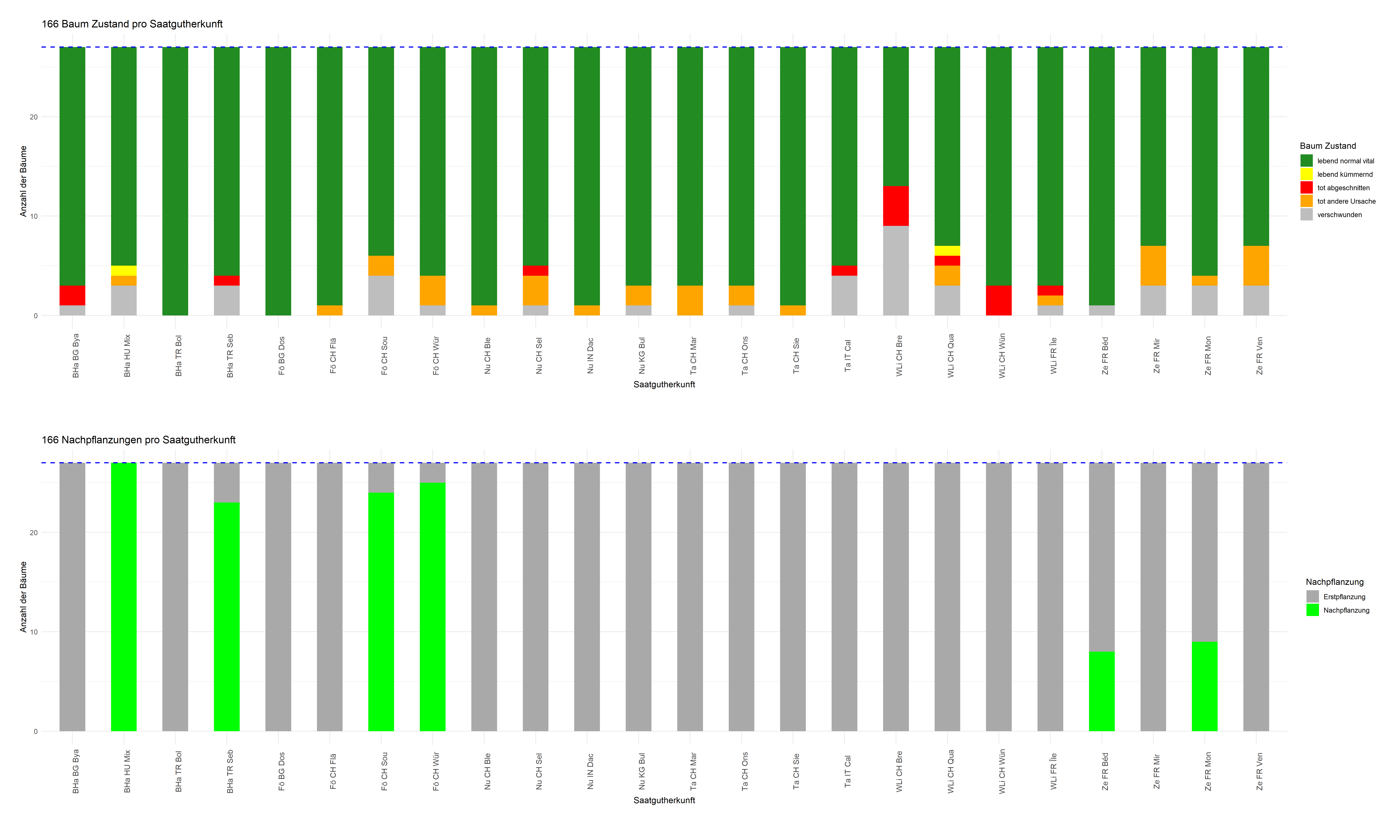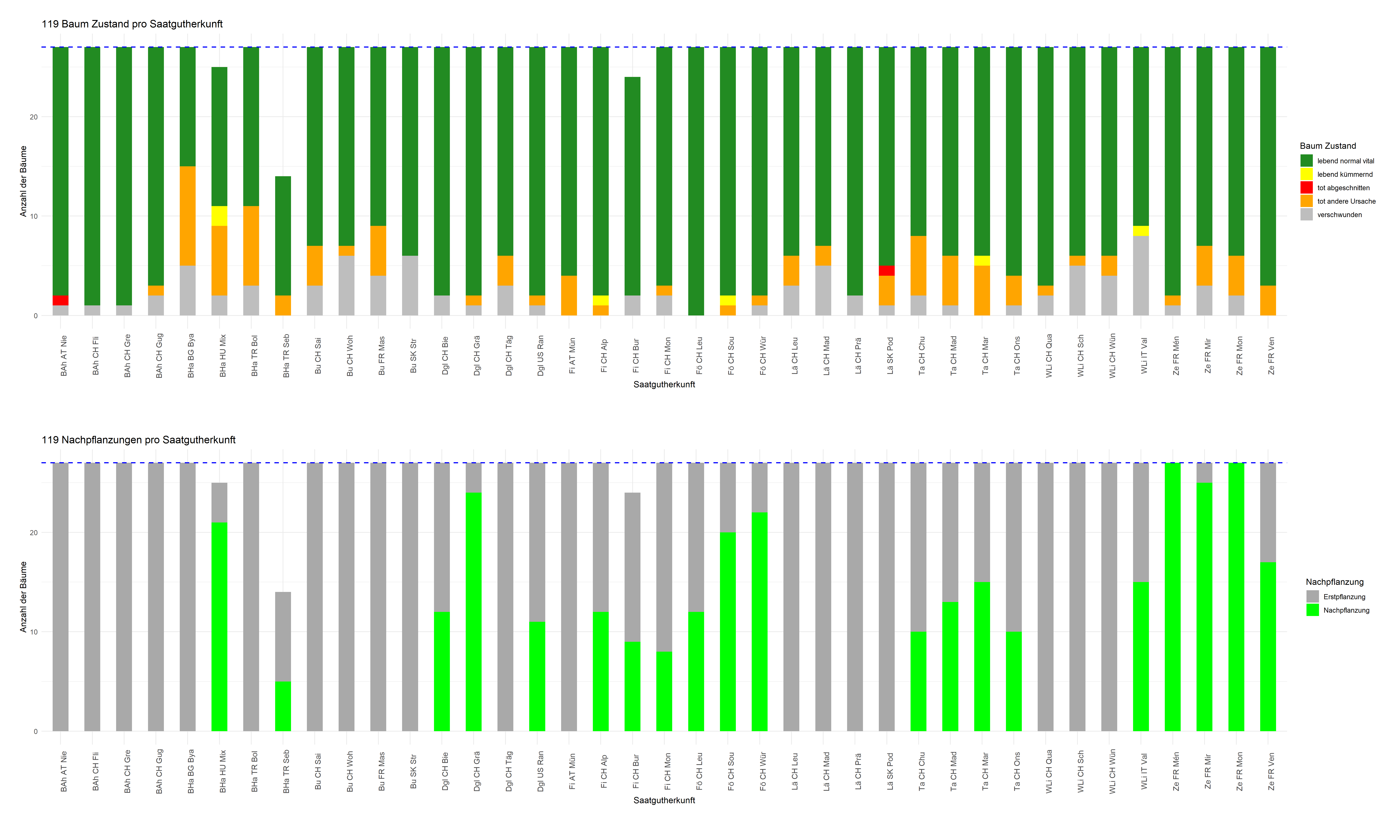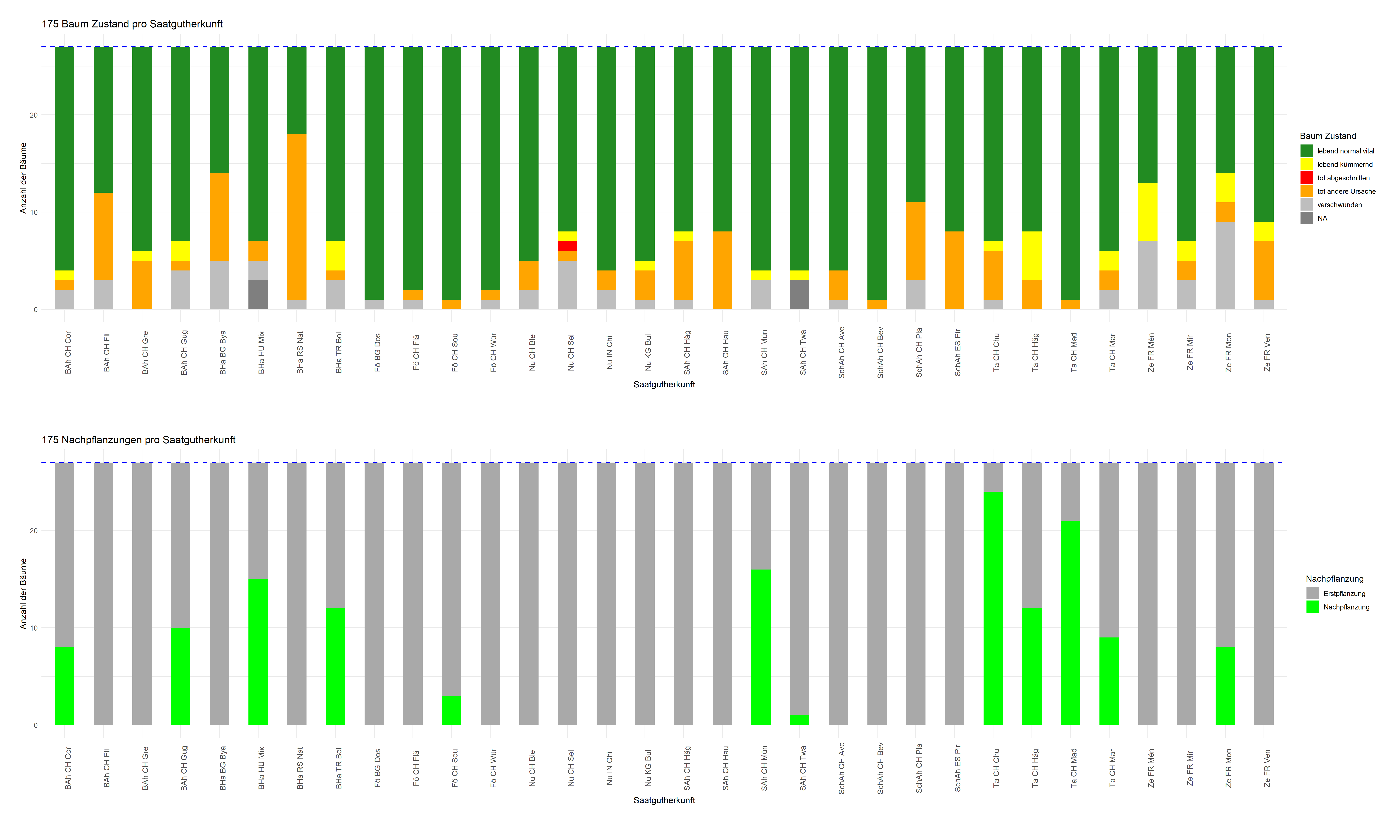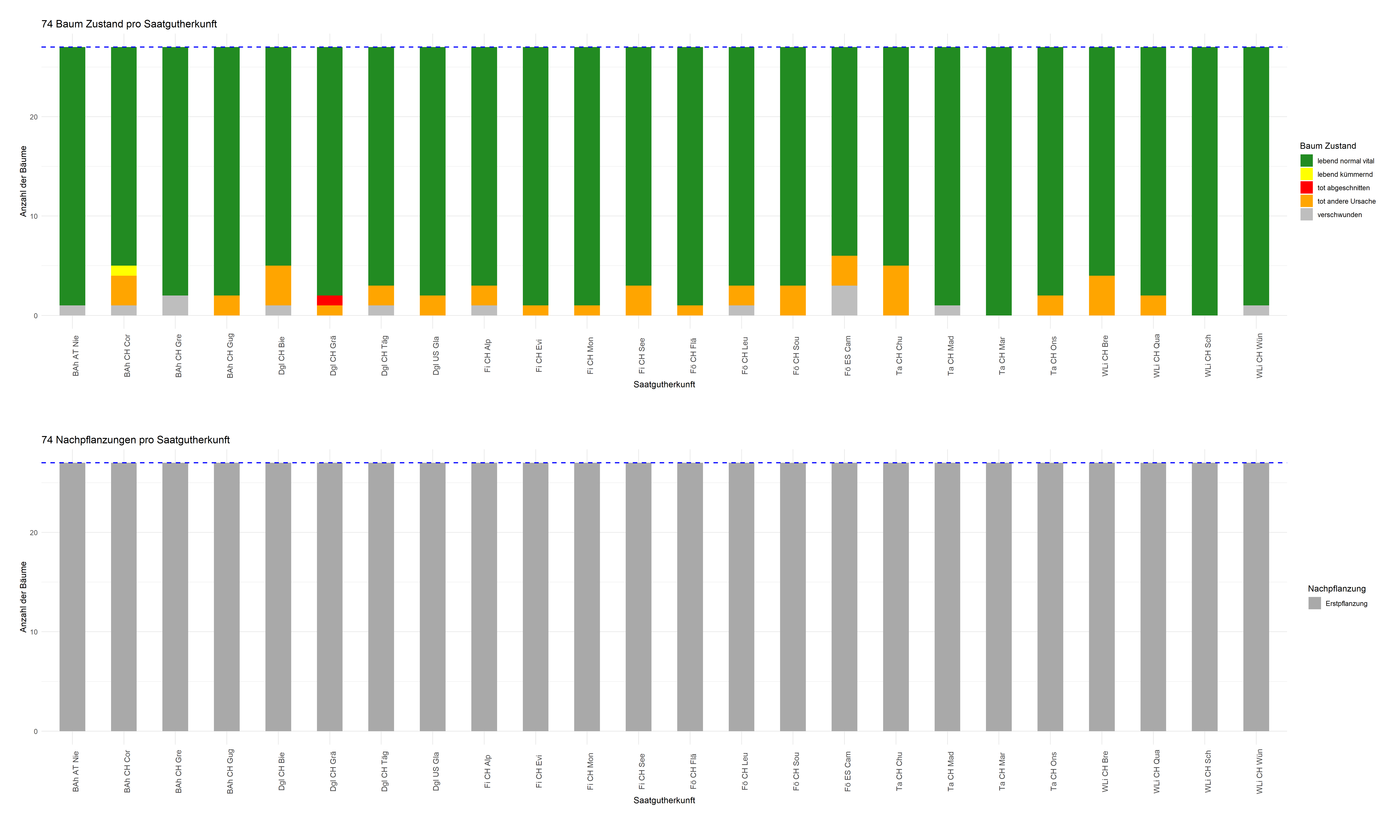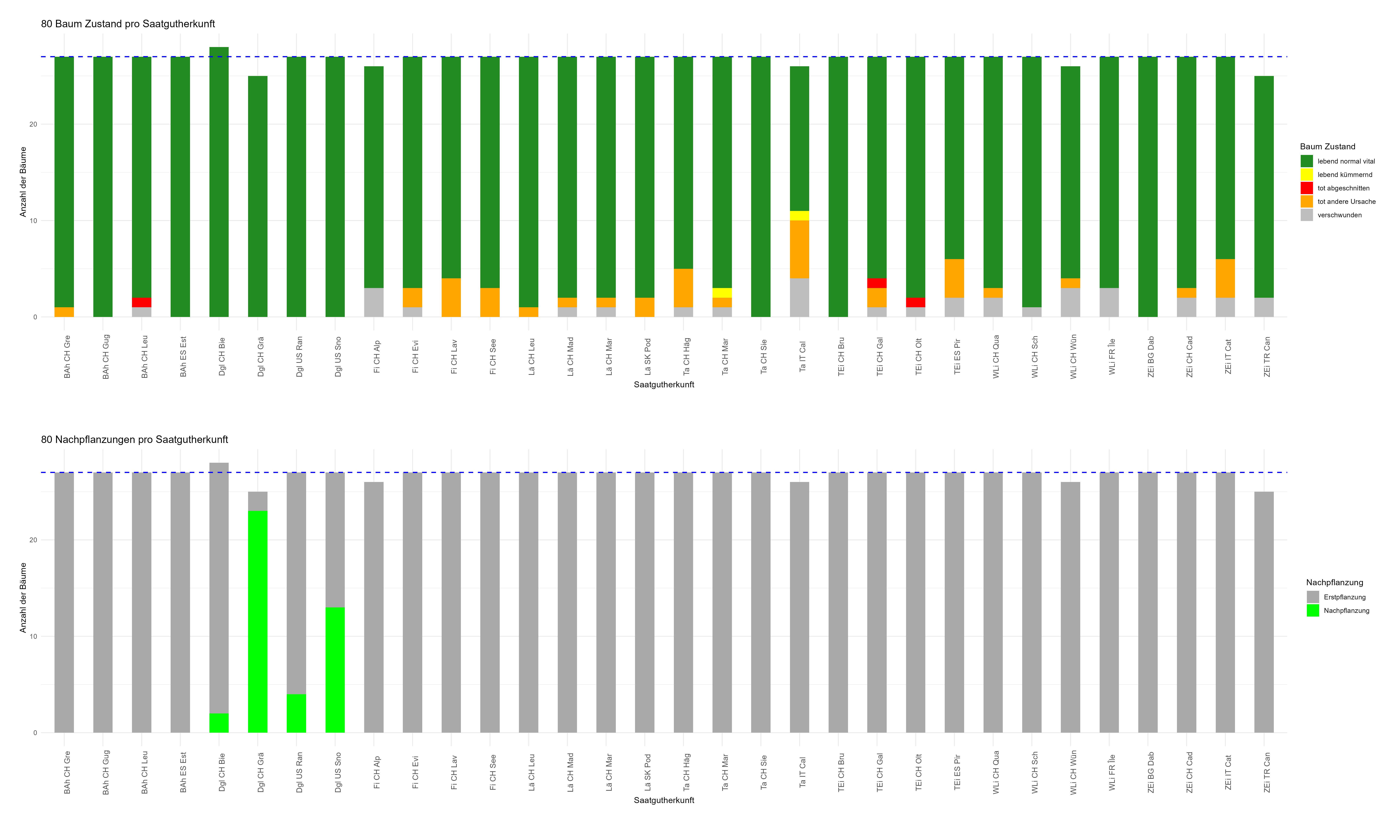 Anzahl BA = Anzahl der in einer Testpflanzung getesteten Baumarten, PP = Pflanzperiode, in welcher eine Testpflanzung eingerichtet wurde: 1 bedeutet Herbst 20 - Frühjahr 21, 2 bedeutet Herbst 21 - Frühjahr 22, 3 bedeutet Herbst 22 - Frühjahr 23. Flächendoku: Folien zu Boden und Klima pro Fläche. Zustand: pro Inventurzeitpunkt (Jahreszahl) Link zu 2 Figuren: Fig 1 Beurteilung des Zustands aller Pflanzen pro Saatgutherkunft pro Fläche (3 Wiederholungsblöcke x 9 Pflanzen= 27 Pflanzen pro Saatgutherkunft pro Fläche) Kategorien: lebend normal vital, lebend kümmernd, tot, abgeschnitten und verschwunden; Fig 2 Anzahl Pflanzen welche zum Inventurzeitpunkt bereits nachgepflanzt waren. Die Bezeichnung der Saatgutherkunft setzt sich auch dem Baumartenkürzel dem Herkunftsland und den ersten 3 Buchstaben der Herkunftsgemeinde zusammen. Baumartenkürzel: BAh Bergahorn, BHa Baumhasel, Bu Buche, Dgl Douglasie, EBe Elsbeere, Fi Fichte, Fö Föhre, Ki Kirsche, Lä Lärche, Nu Nussbaum, SAh Spitzahorn, SchAh Schneeballblättriger Ahorn, SEi Stieleiche, Ta Tanne, TEi Traubeneiche, WLi Winterlinde, Ze Zeder, ZEi Zerreiche