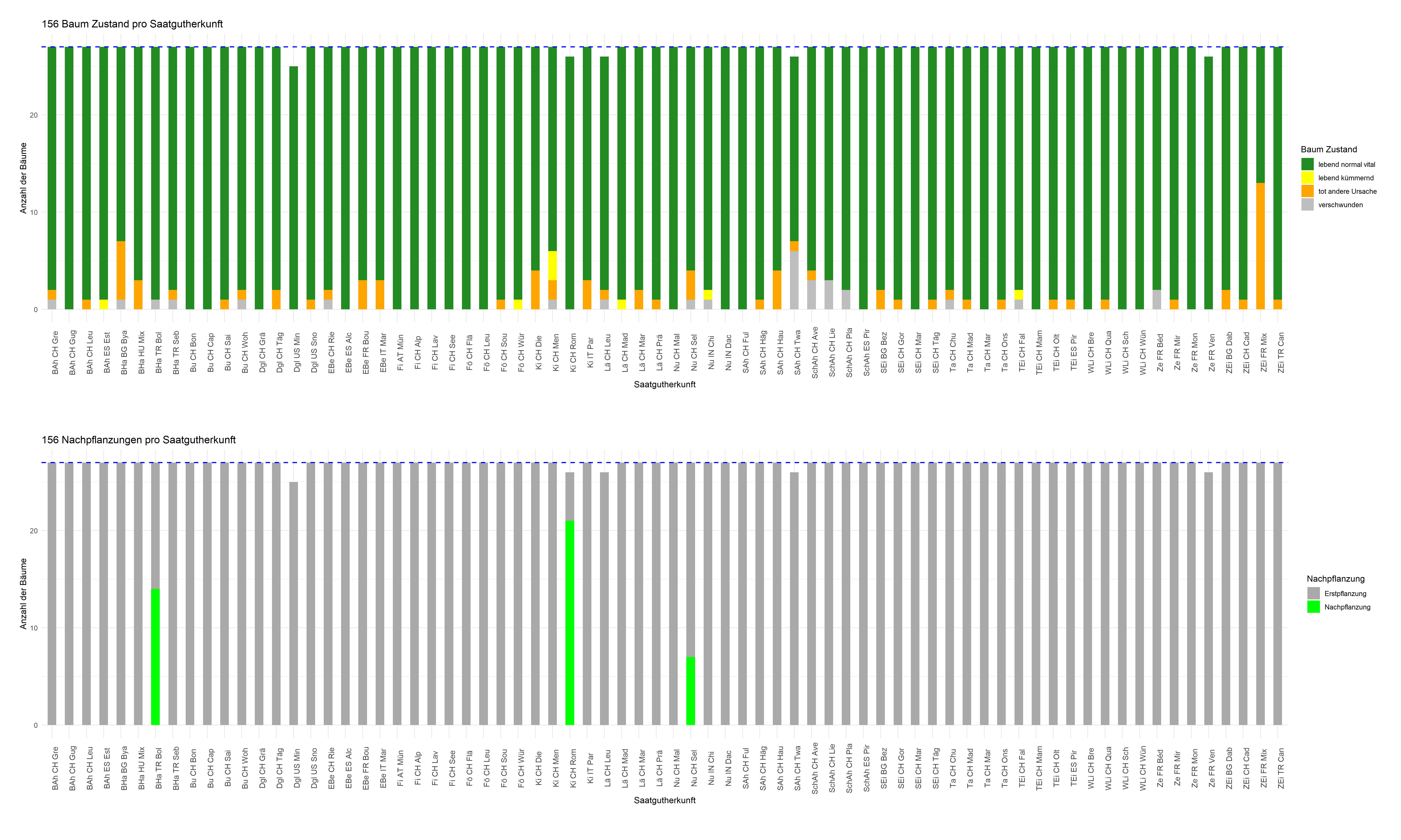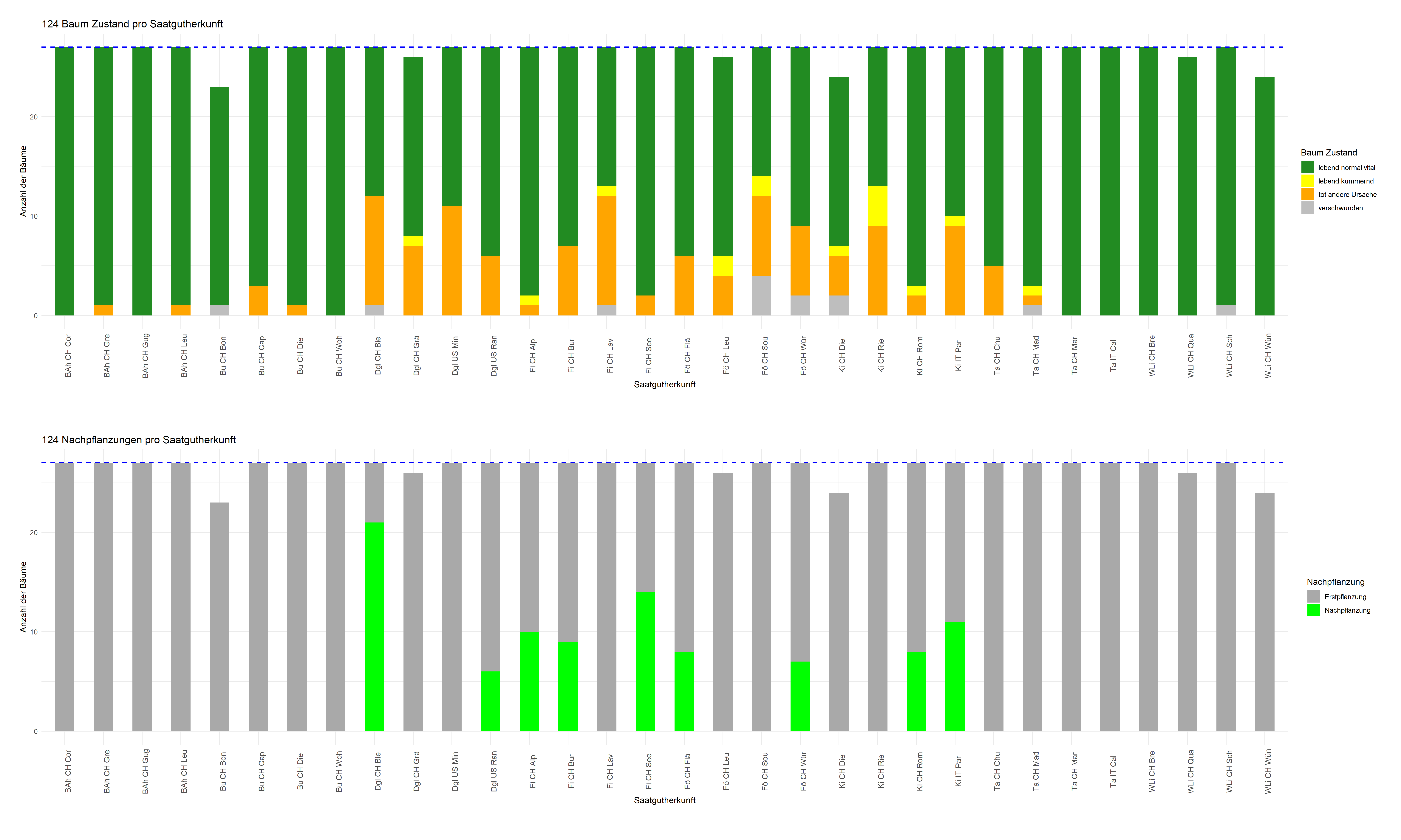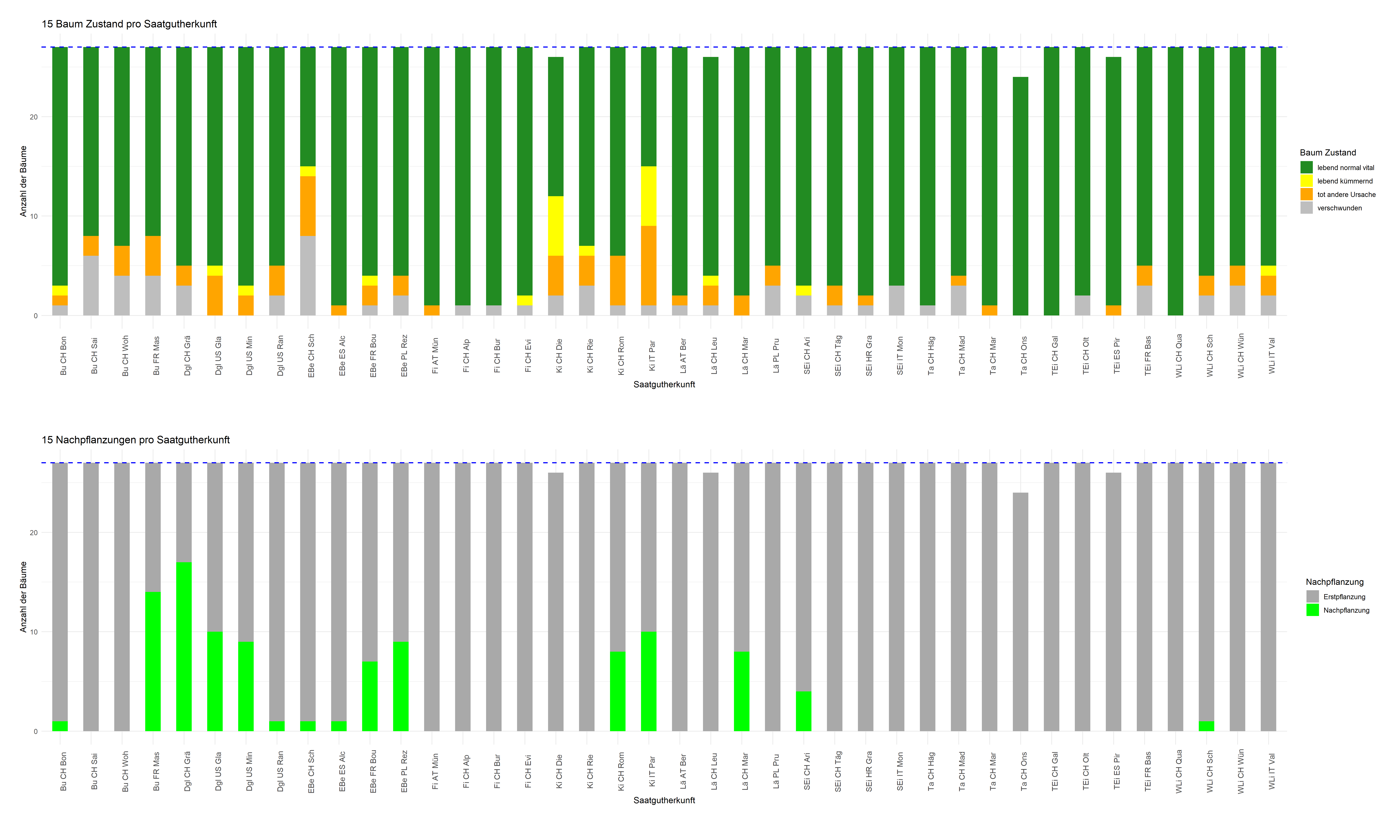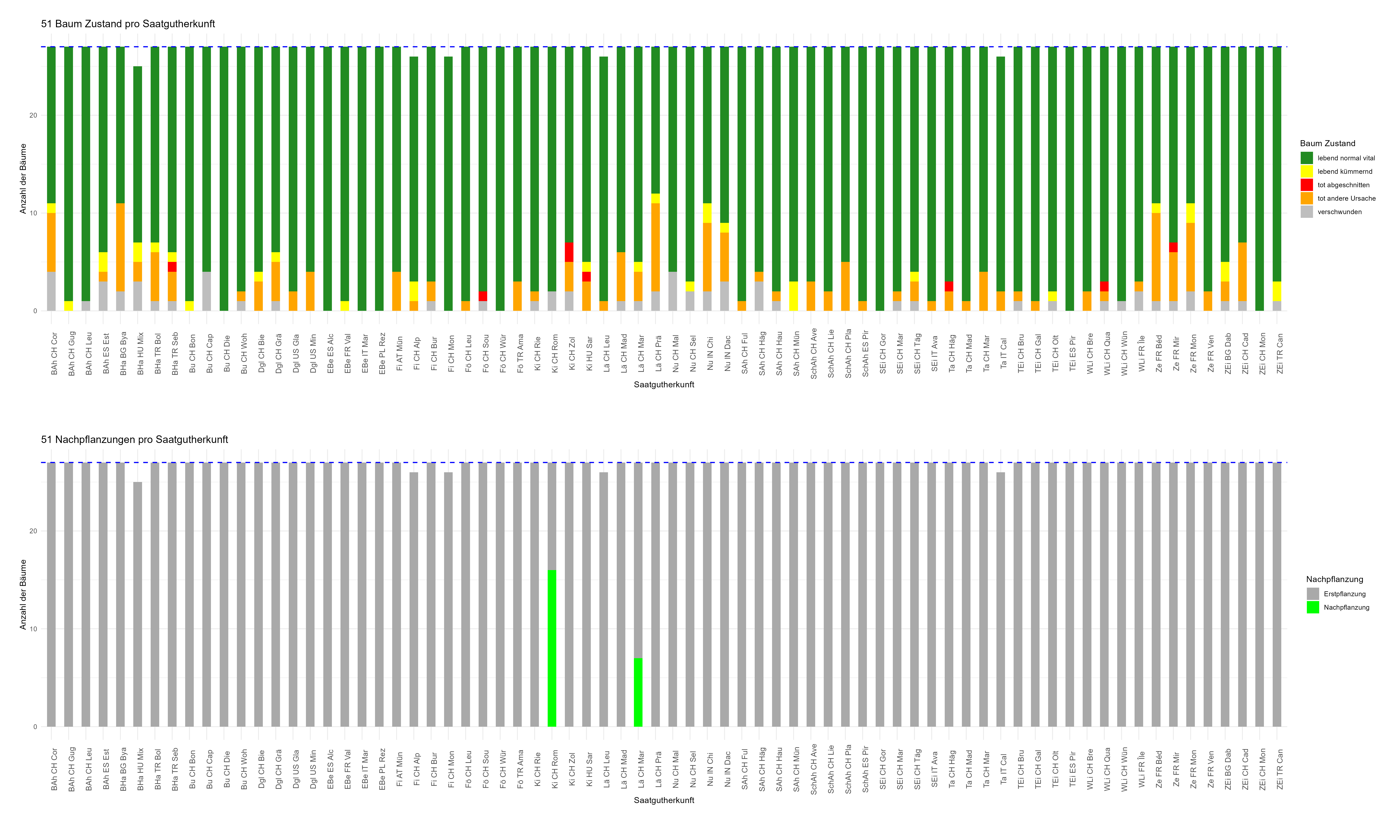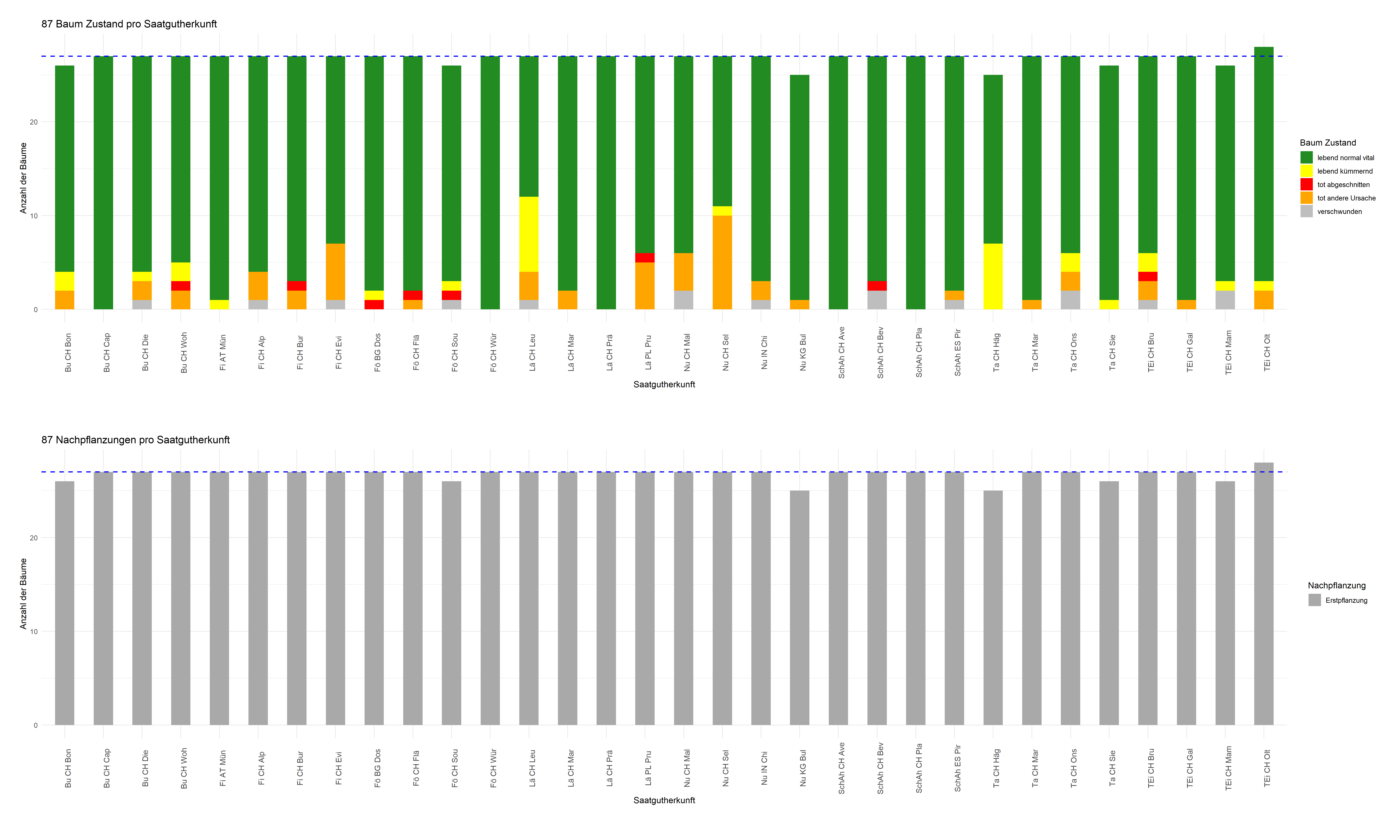 Anzahl BA = Anzahl der in einer Testpflanzung getesteten Baumarten, PP = Pflanzperiode, in welcher eine Testpflanzung eingerichtet wurde: 1 bedeutet Herbst 20 - Frühjahr 21, 2 bedeutet Herbst 21 - Frühjahr 22, 3 bedeutet Herbst 22 - Frühjahr 23. Flächendoku: Folien zu Boden und Klima pro Fläche. Zustand: pro Inventurzeitpunkt (Jahreszahl) Link zu 2 Figuren: Fig 1 Beurteilung des Zustands aller Pflanzen pro Saatgutherkunft pro Fläche (3 Wiederholungsblöcke x 9 Pflanzen= 27 Pflanzen pro Saatgutherkunft pro Fläche) Kategorien: lebend normal vital, lebend kümmernd, tot, abgeschnitten und verschwunden; Fig 2 Anzahl Pflanzen welche zum Inventurzeitpunkt bereits nachgepflanzt waren. Die Bezeichnung der Saatgutherkunft setzt sich auch dem Baumartenkürzel dem Herkunftsland und den ersten 3 Buchstaben der Herkunftsgemeinde zusammen. Baumartenkürzel: BAh Bergahorn, BHa Baumhasel, Bu Buche, Dgl Douglasie, EBe Elsbeere, Fi Fichte, Fö Föhre, Ki Kirsche, Lä Lärche, Nu Nussbaum, SAh Spitzahorn, SchAh Schneeballblättriger Ahorn, SEi Stieleiche, Ta Tanne, TEi Traubeneiche, WLi Winterlinde, Ze Zeder, ZEi Zerreiche