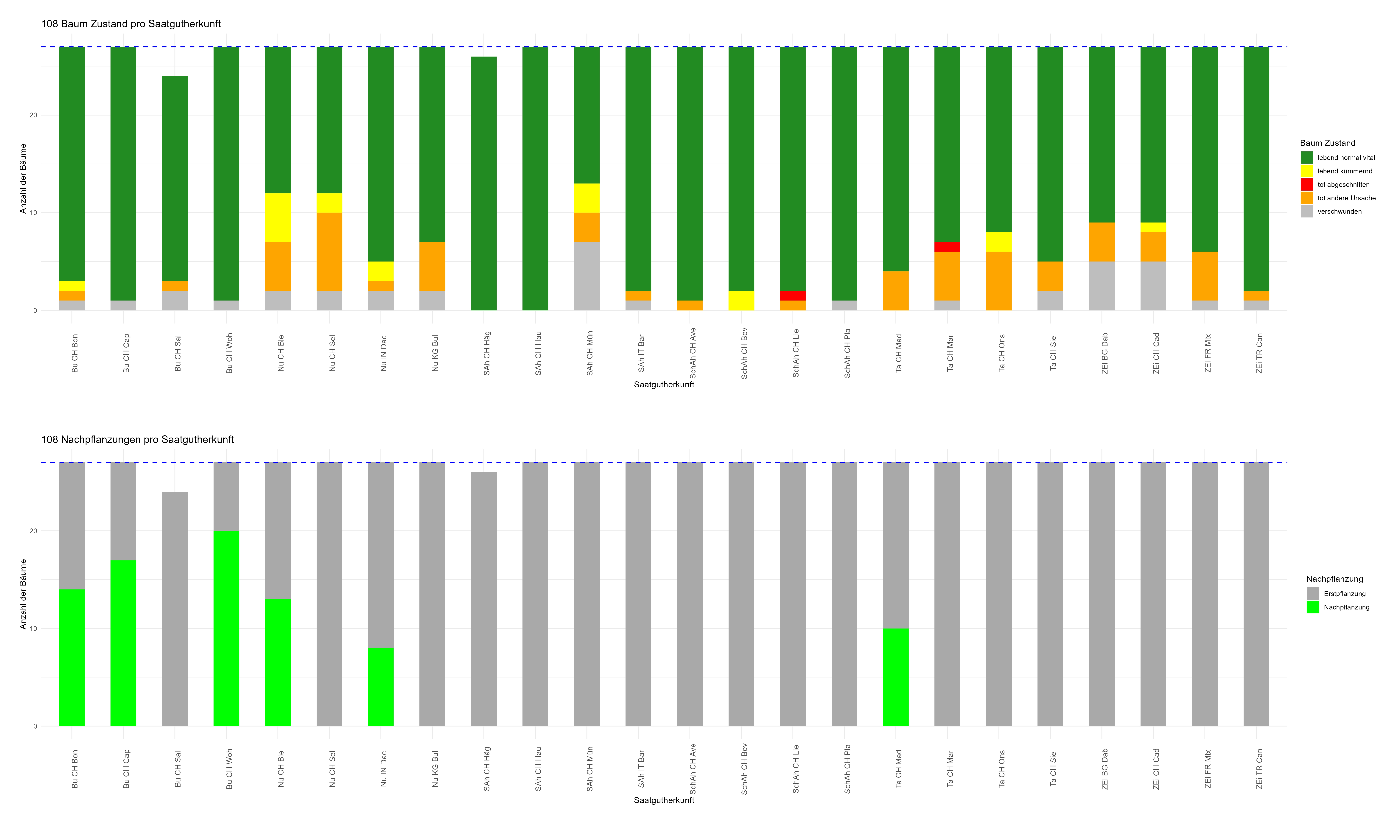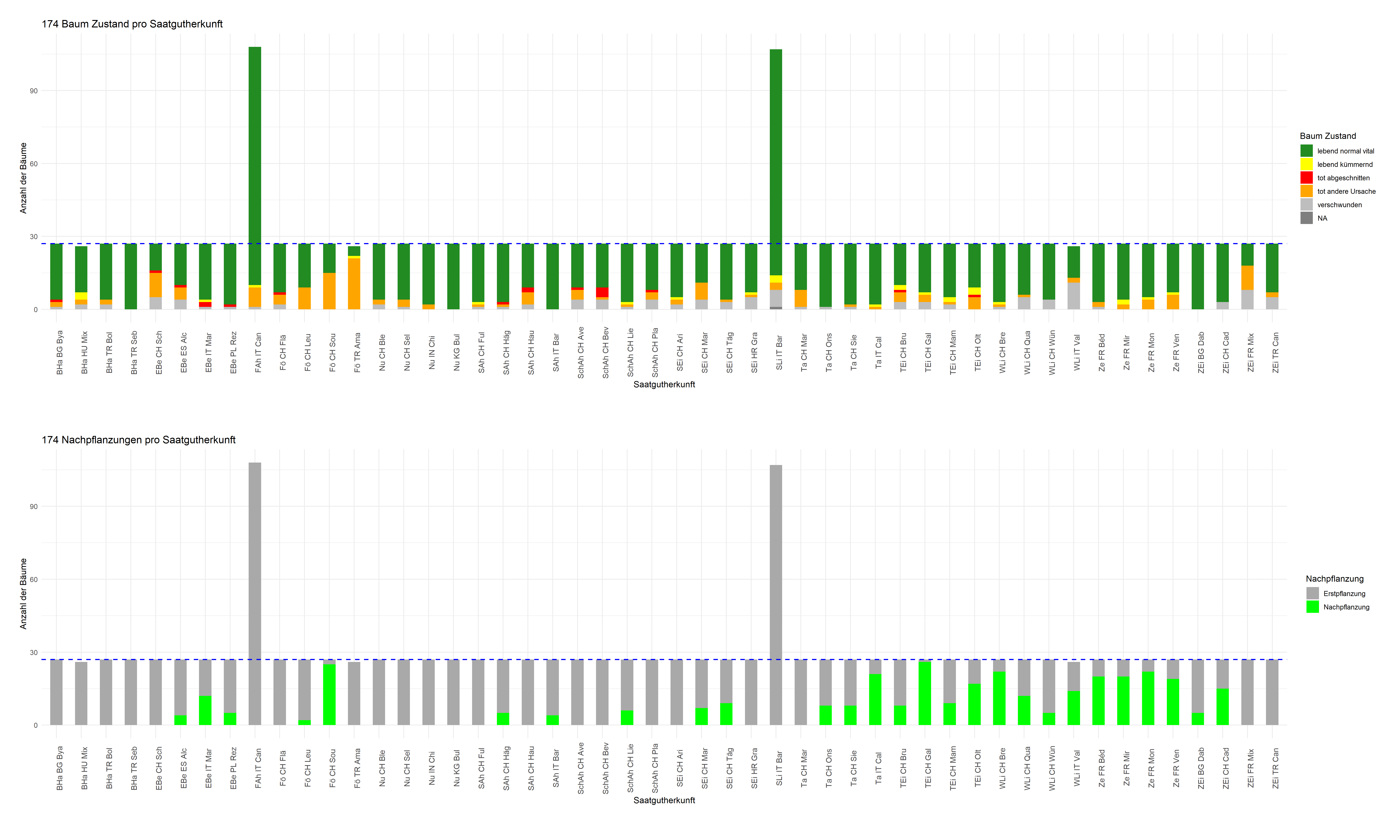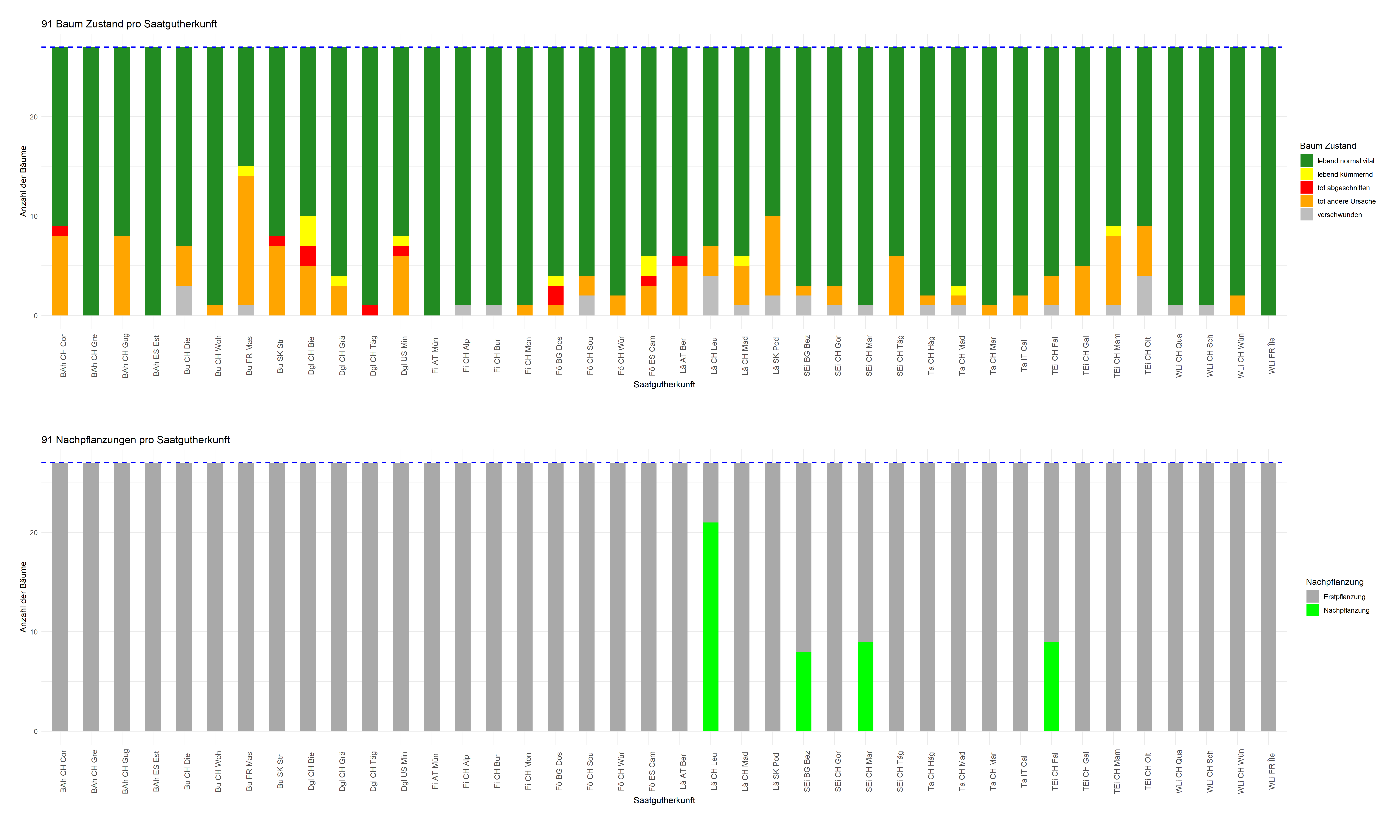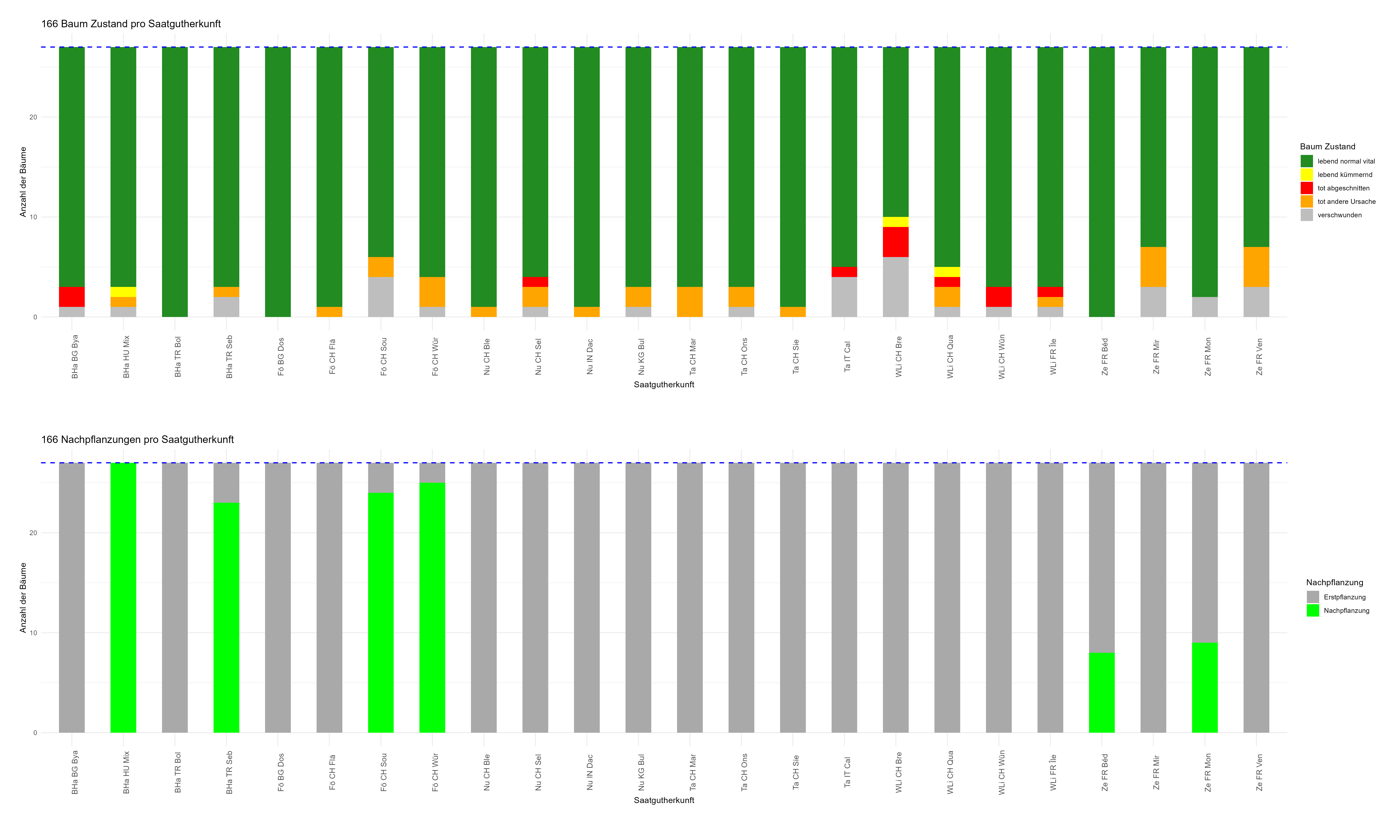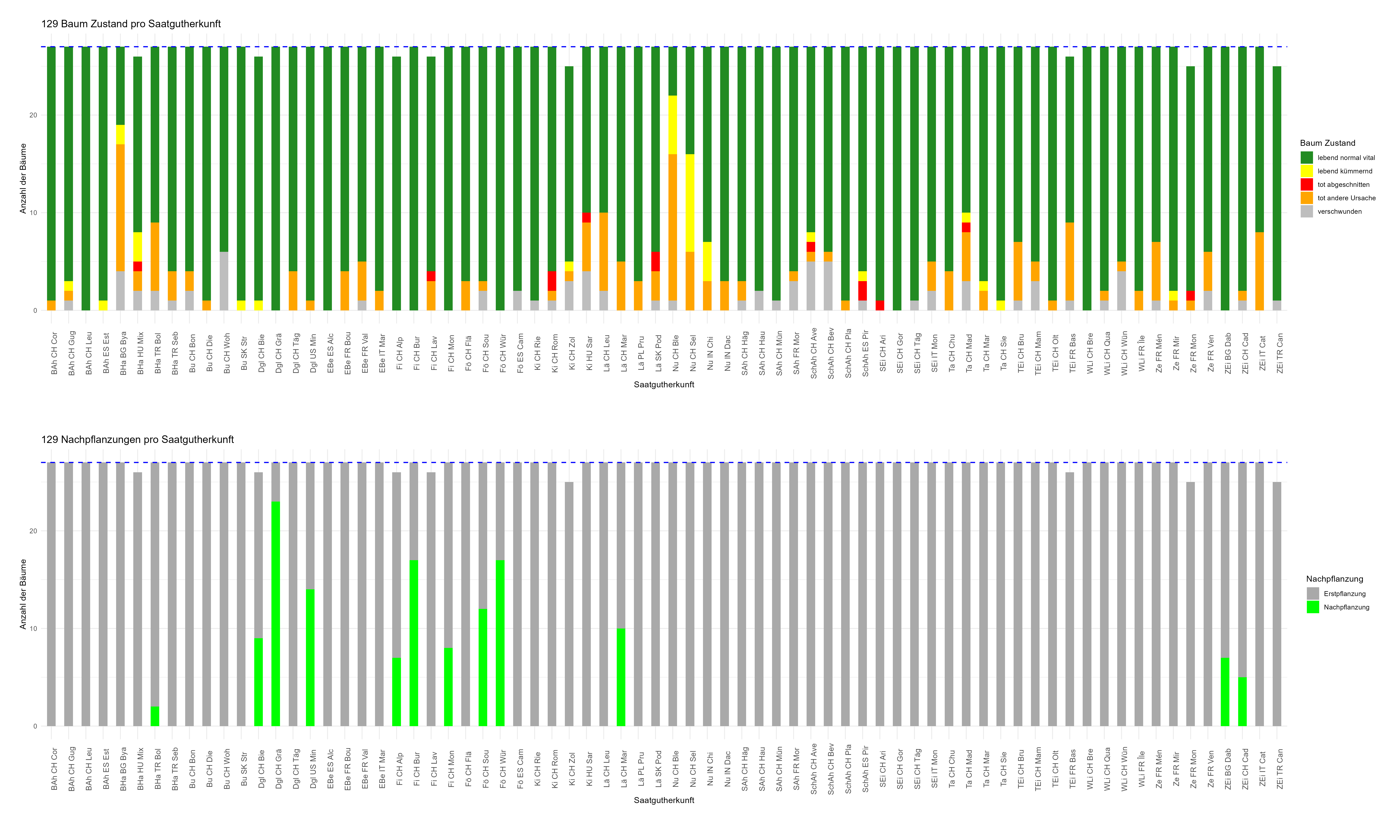 Anzahl BA = Anzahl der in einer Testpflanzung getesteten Baumarten, PP = Pflanzperiode, in welcher eine Testpflanzung eingerichtet wurde: 1 bedeutet Herbst 20 - Frühjahr 21, 2 bedeutet Herbst 21 - Frühjahr 22, 3 bedeutet Herbst 22 - Frühjahr 23. Flächendoku: Folien zu Boden und Klima pro Fläche. Zustand: pro Inventurzeitpunkt (Jahreszahl) Link zu 2 Figuren: Fig 1 Beurteilung des Zustands aller Pflanzen pro Saatgutherkunft pro Fläche (3 Wiederholungsblöcke x 9 Pflanzen= 27 Pflanzen pro Saatgutherkunft pro Fläche) Kategorien: lebend normal vital, lebend kümmernd, tot, abgeschnitten und verschwunden; Fig 2 Anzahl Pflanzen welche zum Inventurzeitpunkt bereits nachgepflanzt waren. Die Bezeichnung der Saatgutherkunft setzt sich auch dem Baumartenkürzel dem Herkunftsland und den ersten 3 Buchstaben der Herkunftsgemeinde zusammen. Baumartenkürzel: BAh Bergahorn, BHa Baumhasel, Bu Buche, Dgl Douglasie, EBe Elsbeere, Fi Fichte, Fö Föhre, Ki Kirsche, Lä Lärche, Nu Nussbaum, SAh Spitzahorn, SchAh Schneeballblättriger Ahorn, SEi Stieleiche, Ta Tanne, TEi Traubeneiche, WLi Winterlinde, Ze Zeder, ZEi Zerreiche