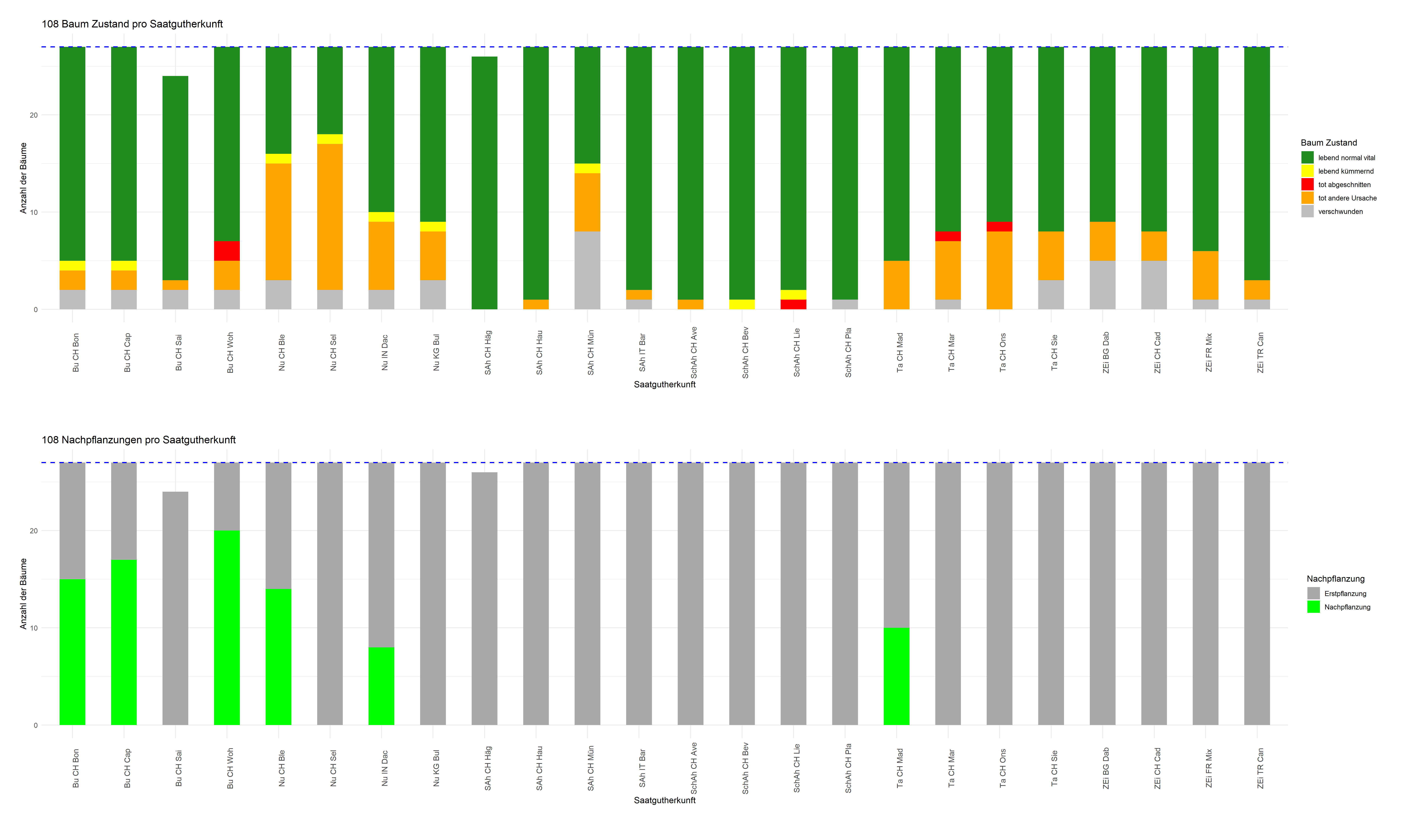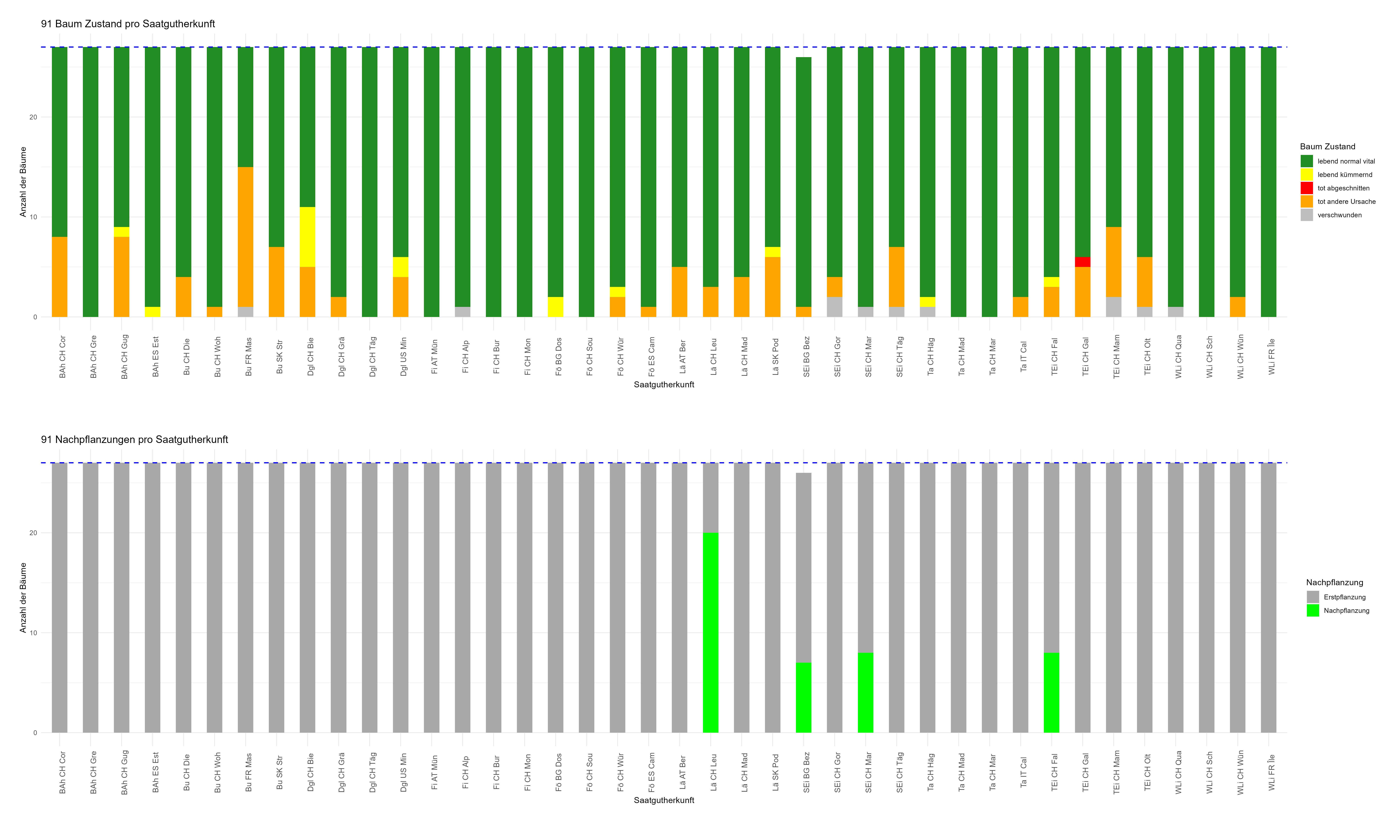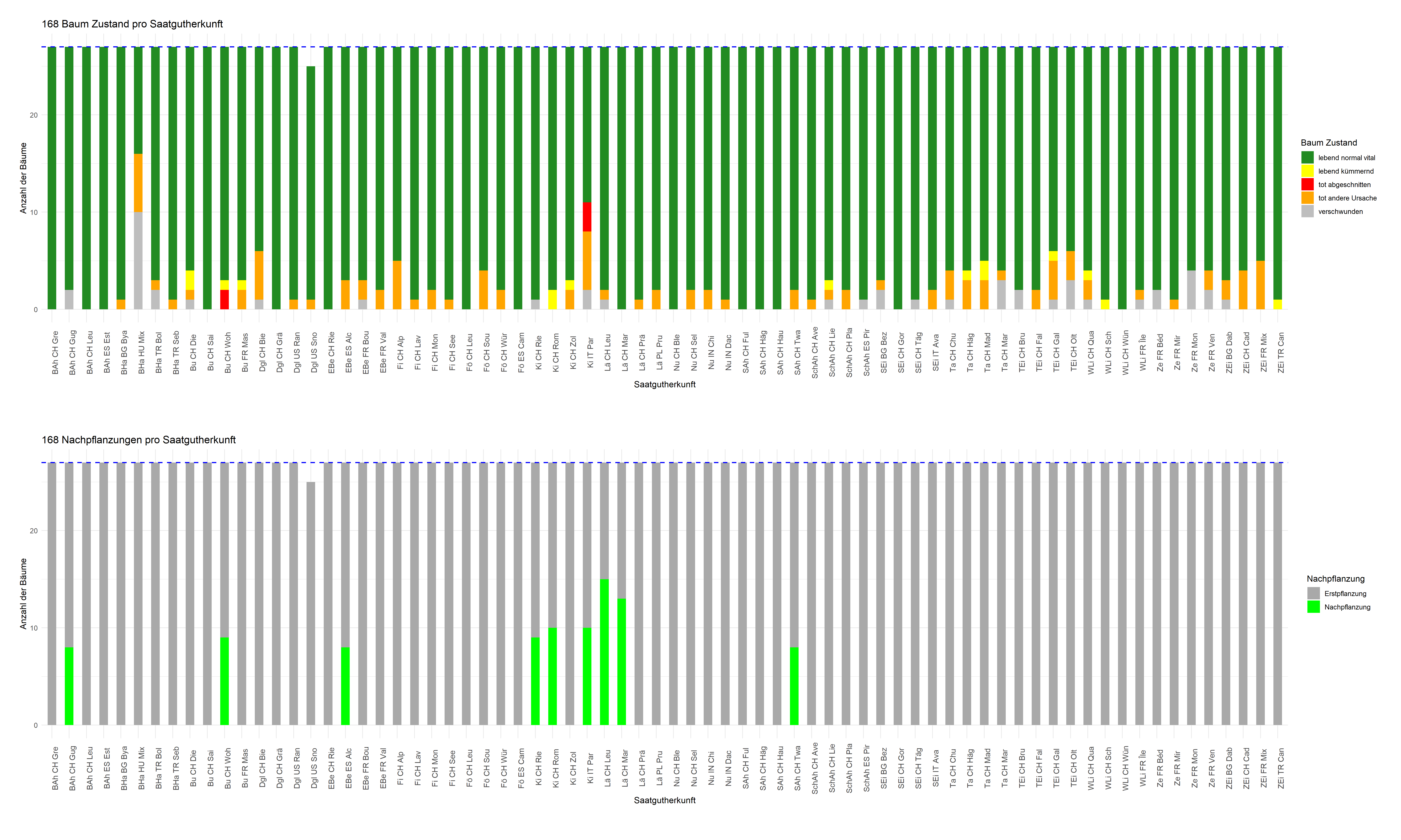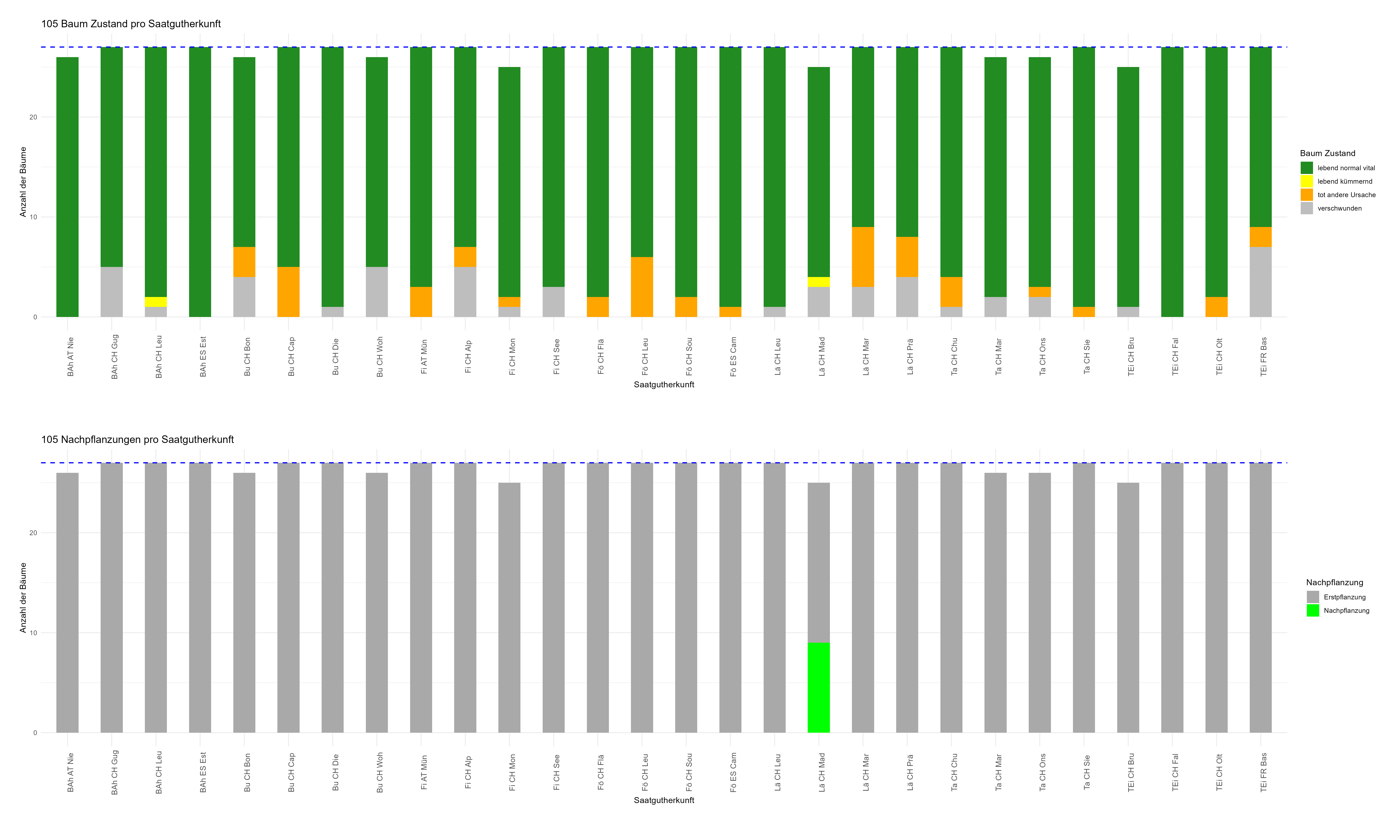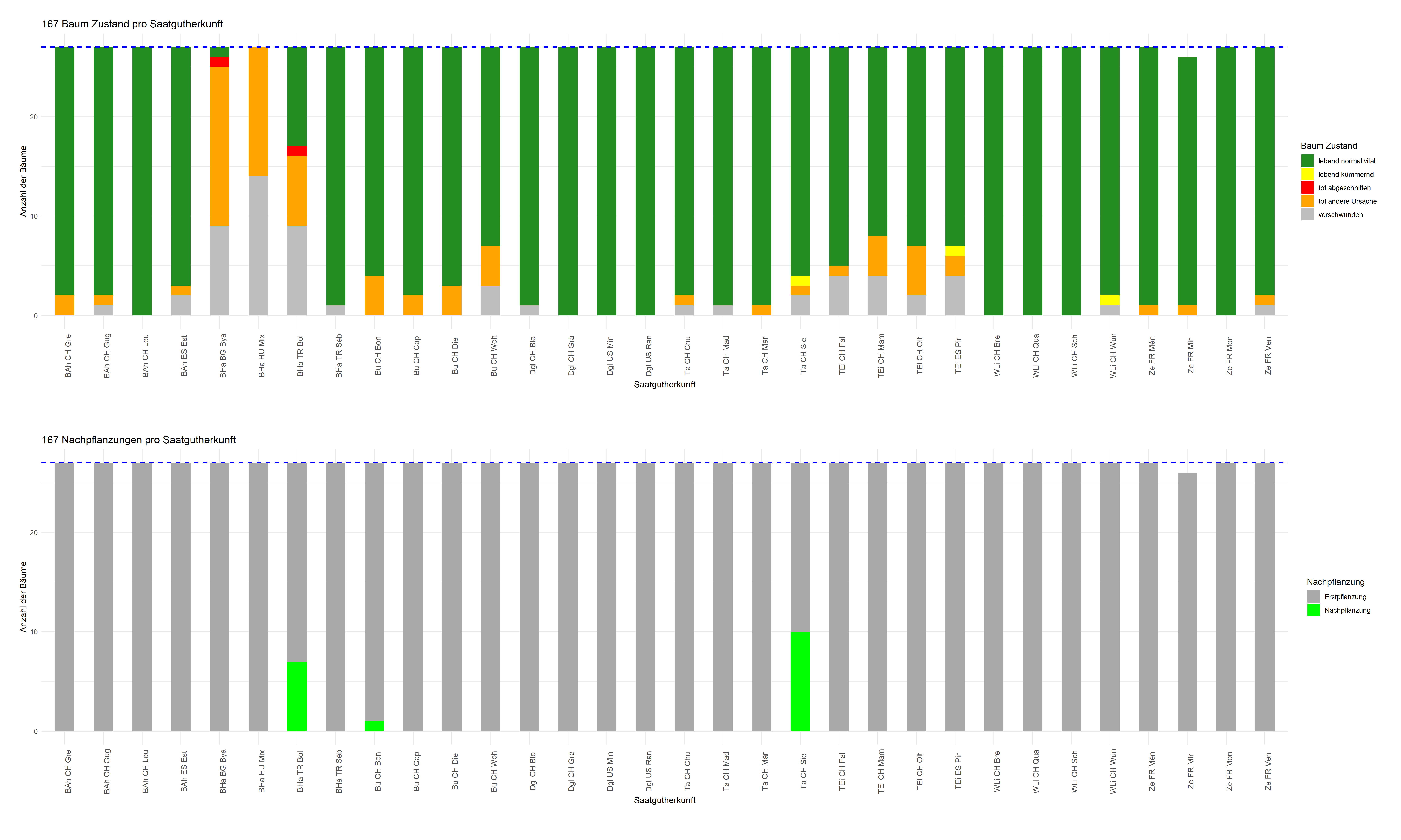 Anzahl BA = Anzahl der in einer Testpflanzung getesteten Baumarten, PP = Pflanzperiode, in welcher eine Testpflanzung eingerichtet wurde: 1 bedeutet Herbst 20 - Frühjahr 21, 2 bedeutet Herbst 21 - Frühjahr 22, 3 bedeutet Herbst 22 - Frühjahr 23. Flächendoku: Folien zu Boden und Klima pro Fläche. Zustand: pro Inventurzeitpunkt (Jahreszahl) Link zu 2 Figuren: Fig 1 Beurteilung des Zustands aller Pflanzen pro Saatgutherkunft pro Fläche (3 Wiederholungsblöcke x 9 Pflanzen= 27 Pflanzen pro Saatgutherkunft pro Fläche) Kategorien: lebend normal vital, lebend kümmernd, tot, abgeschnitten und verschwunden; Fig 2 Anzahl Pflanzen welche zum Inventurzeitpunkt bereits nachgepflanzt waren. Die Bezeichnung der Saatgutherkunft setzt sich auch dem Baumartenkürzel dem Herkunftsland und den ersten 3 Buchstaben der Herkunftsgemeinde zusammen. Baumartenkürzel: BAh Bergahorn, BHa Baumhasel, Bu Buche, Dgl Douglasie, EBe Elsbeere, Fi Fichte, Fö Föhre, Ki Kirsche, Lä Lärche, Nu Nussbaum, SAh Spitzahorn, SchAh Schneeballblättriger Ahorn, SEi Stieleiche, Ta Tanne, TEi Traubeneiche, WLi Winterlinde, Ze Zeder, ZEi Zerreiche