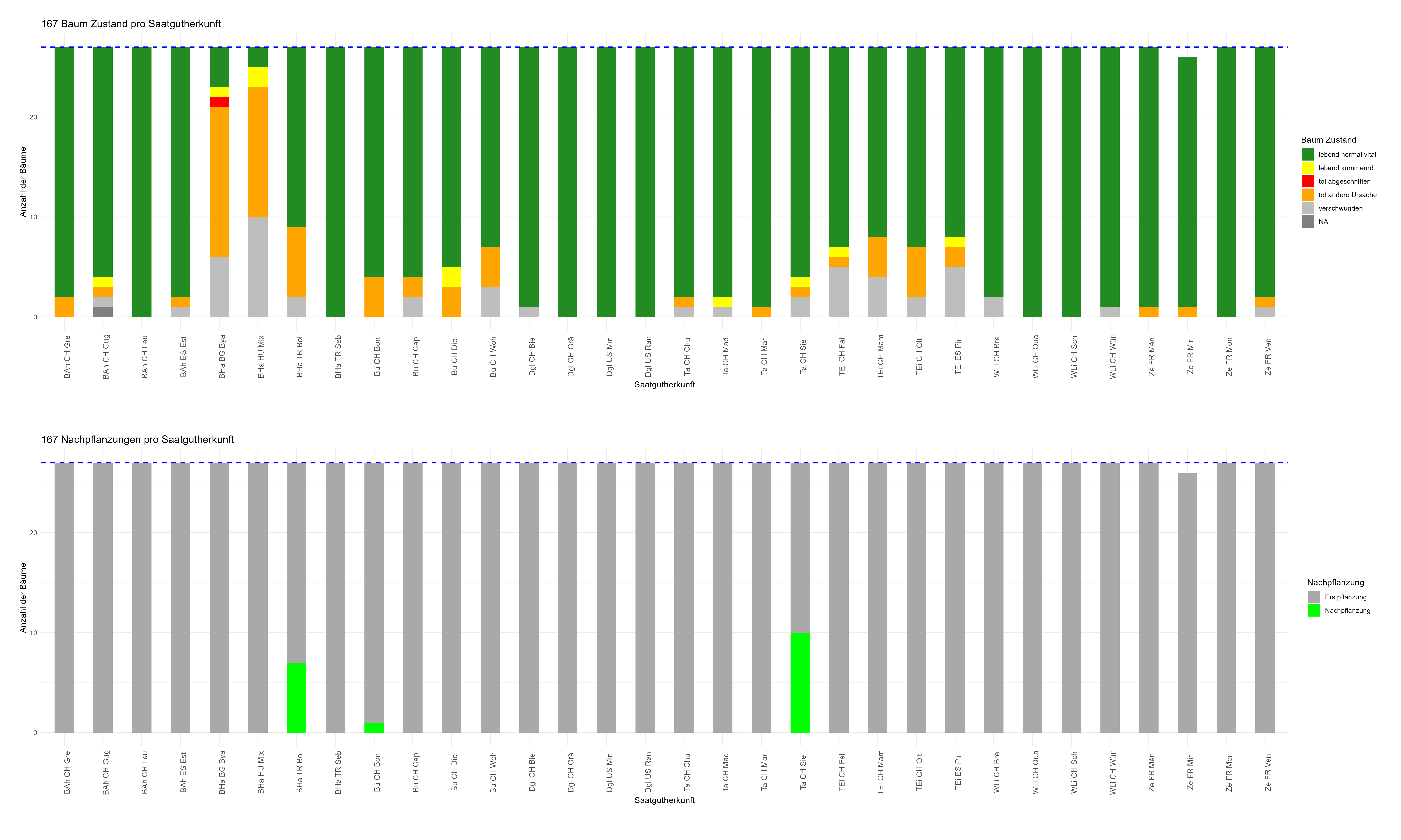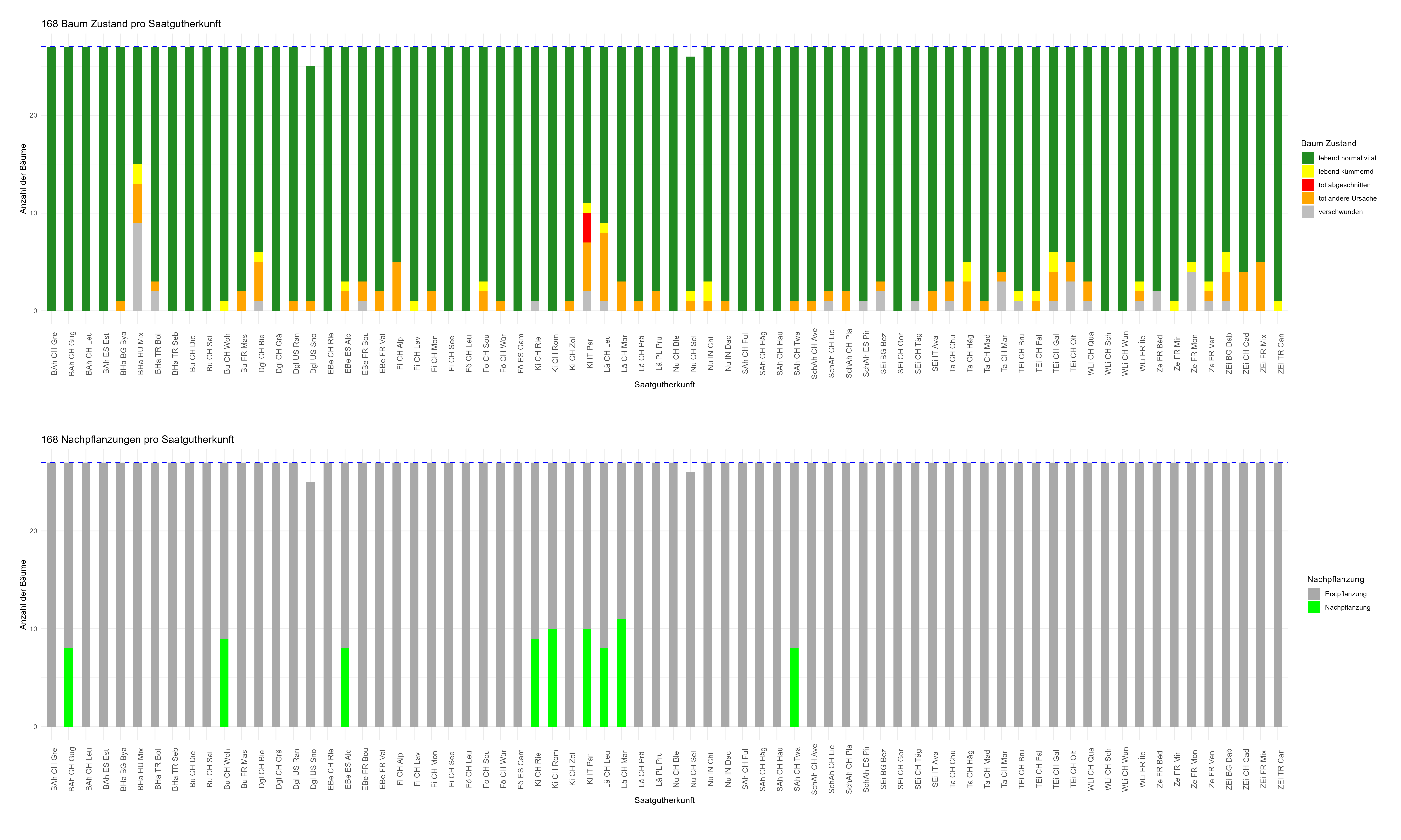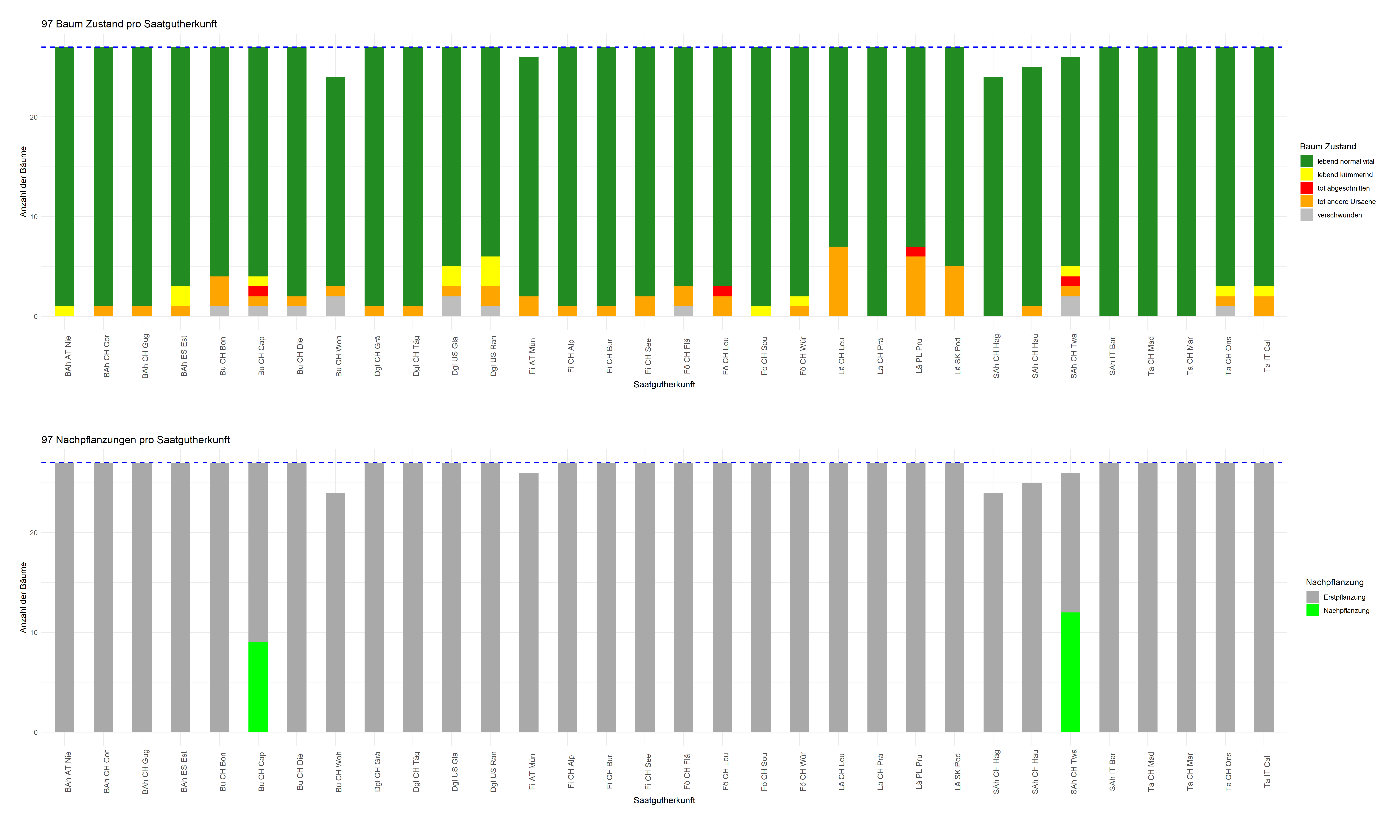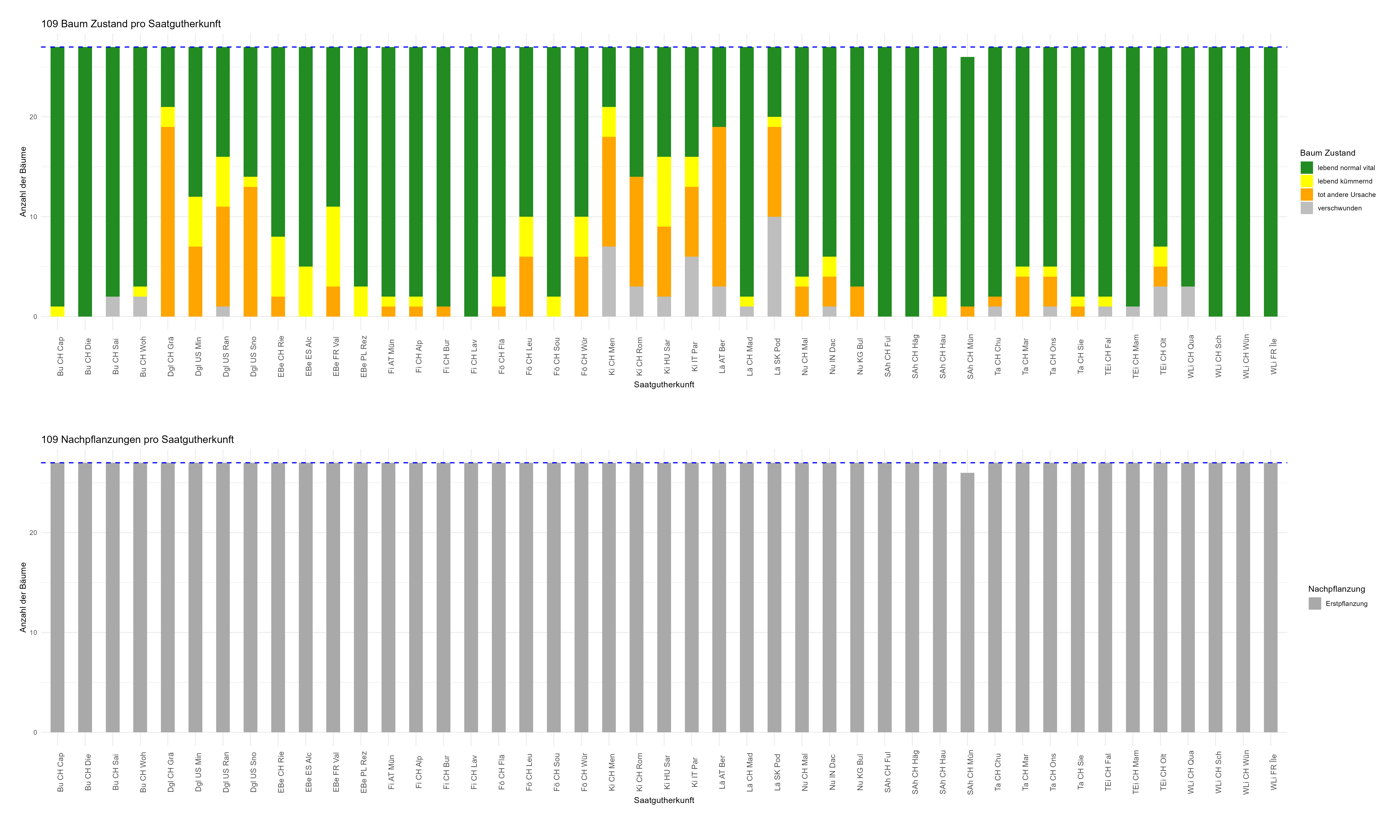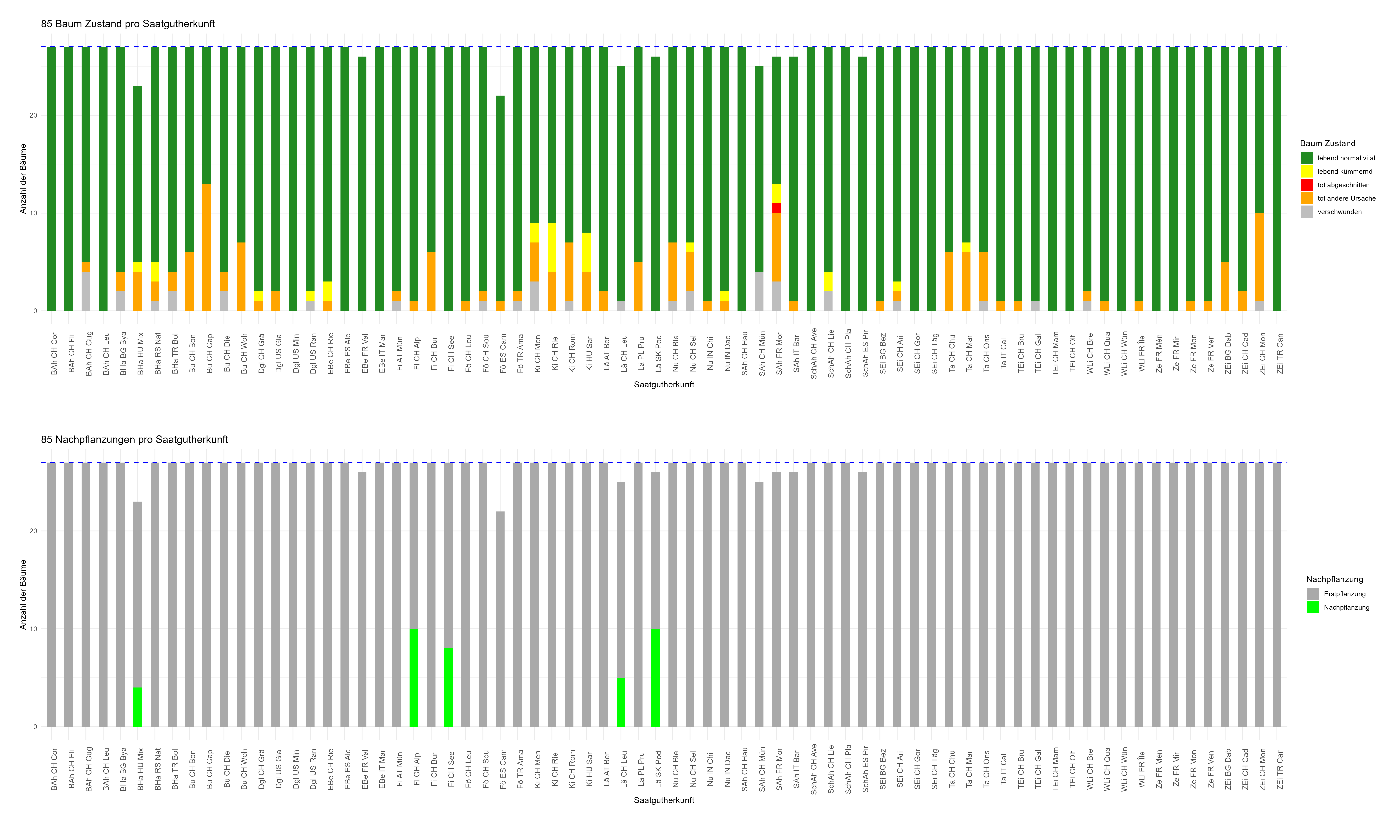 Anzahl BA = Anzahl der in einer Testpflanzung getesteten Baumarten, PP = Pflanzperiode, in welcher eine Testpflanzung eingerichtet wurde: 1 bedeutet Herbst 20 - Frühjahr 21, 2 bedeutet Herbst 21 - Frühjahr 22, 3 bedeutet Herbst 22 - Frühjahr 23. Flächendoku: Folien zu Boden und Klima pro Fläche. Zustand: pro Inventurzeitpunkt (Jahreszahl) Link zu 2 Figuren: Fig 1 Beurteilung des Zustands aller Pflanzen pro Saatgutherkunft pro Fläche (3 Wiederholungsblöcke x 9 Pflanzen= 27 Pflanzen pro Saatgutherkunft pro Fläche) Kategorien: lebend normal vital, lebend kümmernd, tot, abgeschnitten und verschwunden; Fig 2 Anzahl Pflanzen welche zum Inventurzeitpunkt bereits nachgepflanzt waren. Die Bezeichnung der Saatgutherkunft setzt sich auch dem Baumartenkürzel dem Herkunftsland und den ersten 3 Buchstaben der Herkunftsgemeinde zusammen. Baumartenkürzel: BAh Bergahorn, BHa Baumhasel, Bu Buche, Dgl Douglasie, EBe Elsbeere, Fi Fichte, Fö Föhre, Ki Kirsche, Lä Lärche, Nu Nussbaum, SAh Spitzahorn, SchAh Schneeballblättriger Ahorn, SEi Stieleiche, Ta Tanne, TEi Traubeneiche, WLi Winterlinde, Ze Zeder, ZEi Zerreiche