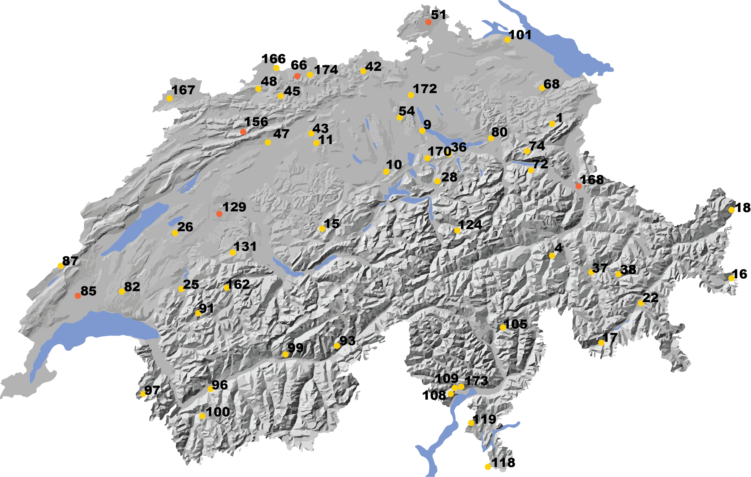 Zur Untersuchung dieser Frage wurde das Projekt «Testpflanzungen zukunftsfähiger Baumarten» gestartet. Im Rahmen dieses Projektes ist ein Netzwerk von 56 koordinierten Testpflanzungen in der ganzen Schweiz entstanden (Abbildung rechts). An über 55'000 Bäumchen wird über 30 bis 50 Jahre untersucht, wie sich Baumarten und Samenherkünfte in unterschiedlichen Umweltbedingungen bewähren. Dies dient als Grundlage für standortsspezifische Baumartenempfehlungen. Die wissenschaftliche Fragestellung lautet, welche Umweltfaktoren das Überleben, die Vitalität und das Wachstum der untersuchten Baumarten und Provenienzen (Synonym: Herkünfte) entlang von grossen Umweltgradienten bestimmen.