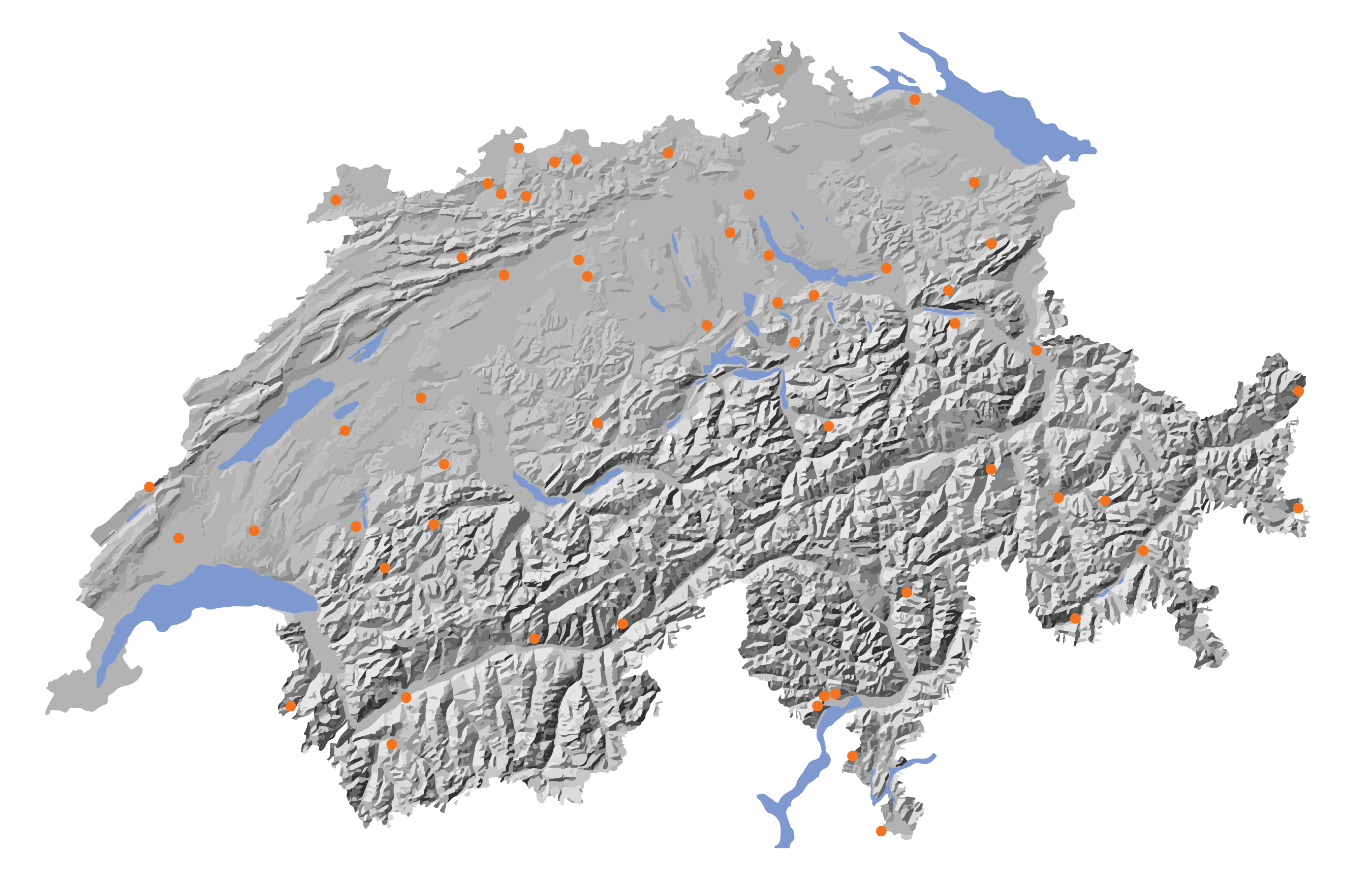 Die Kantone wurden Mitte März 2018 eingeladen, Versuchsflächen vorzuschlagen, die den beschriebenen Anforderungen genügen (Bericht «Auswahl der Versuchsflächen für Testpflanzungen»). Zwischen November 2018 und Juli 2019 hat das Projektteam WSL 125 der insgesamt 172 von den kantonalen Forstdiensten vorgeschlagenen Flächen besucht. Im Juli 2019 wurden 57 Versuchsflächen ausgewählt, und die zu testenden Baumarten zugeteilt (Bericht: „Auswahl der Versuchsflächen für Testpflanzungen“). Vor der Einrichtung kam es zu Änderungen an der Flächenauswahl und Baumartenzuteilung. Es sind 2 weitere Versuchsflächen im Kanton Baselland hinzugekommen, während im Kanton Bern zwei Flächen gestrichen werden mussten. Leider musste 2024 eine weitere Versuchsfläche in Kanton Genf aufgegeben werden. Die Fläche ist stark von Staunässe betroffen und die Pflanzen sind eingegangen und konnten auch nicht nachgepflanzt werden. Zum Netzwerk gehören nun 56 Versuchsflächen. Alle Versuchsflächen sind vertraglich langfristig gesichert.