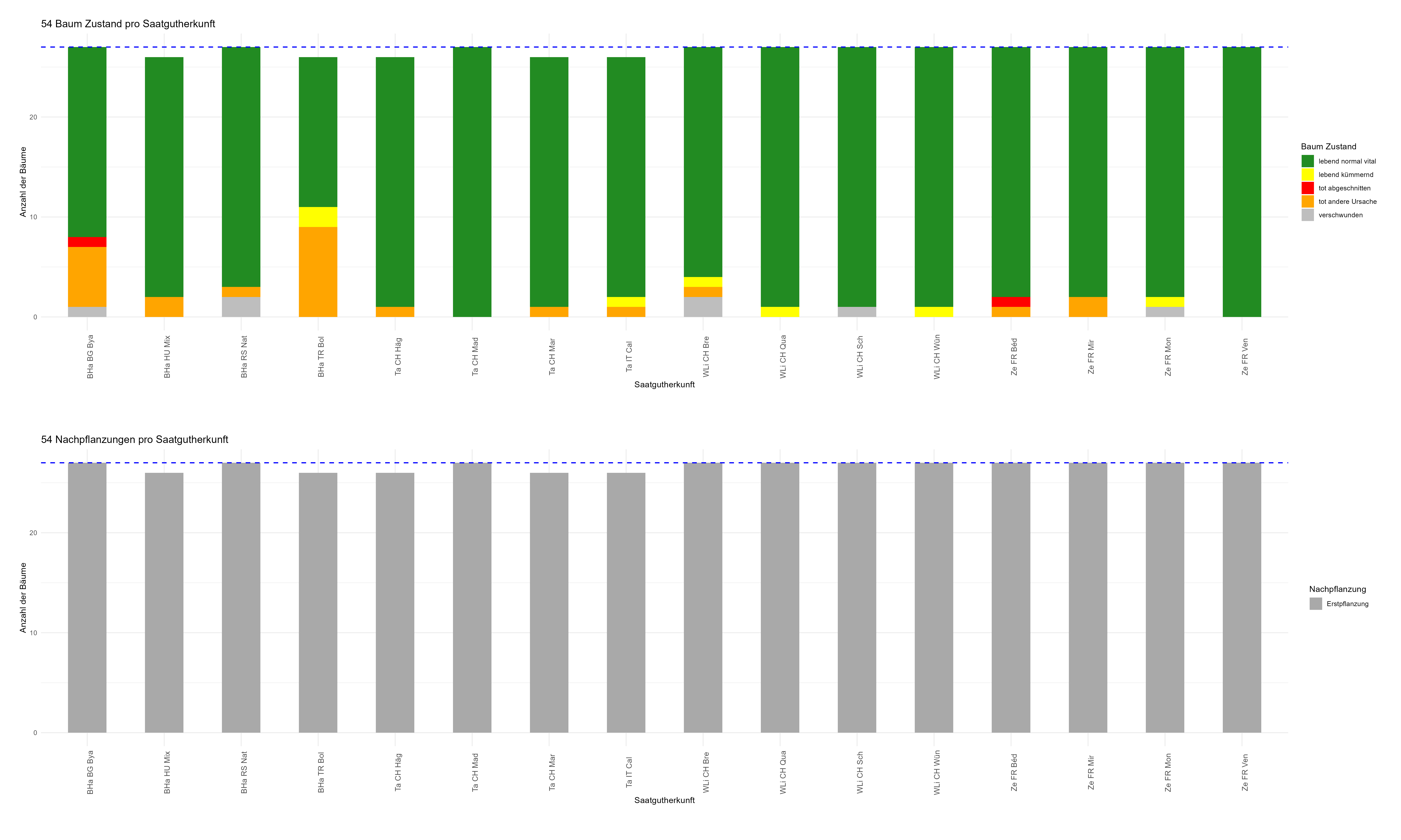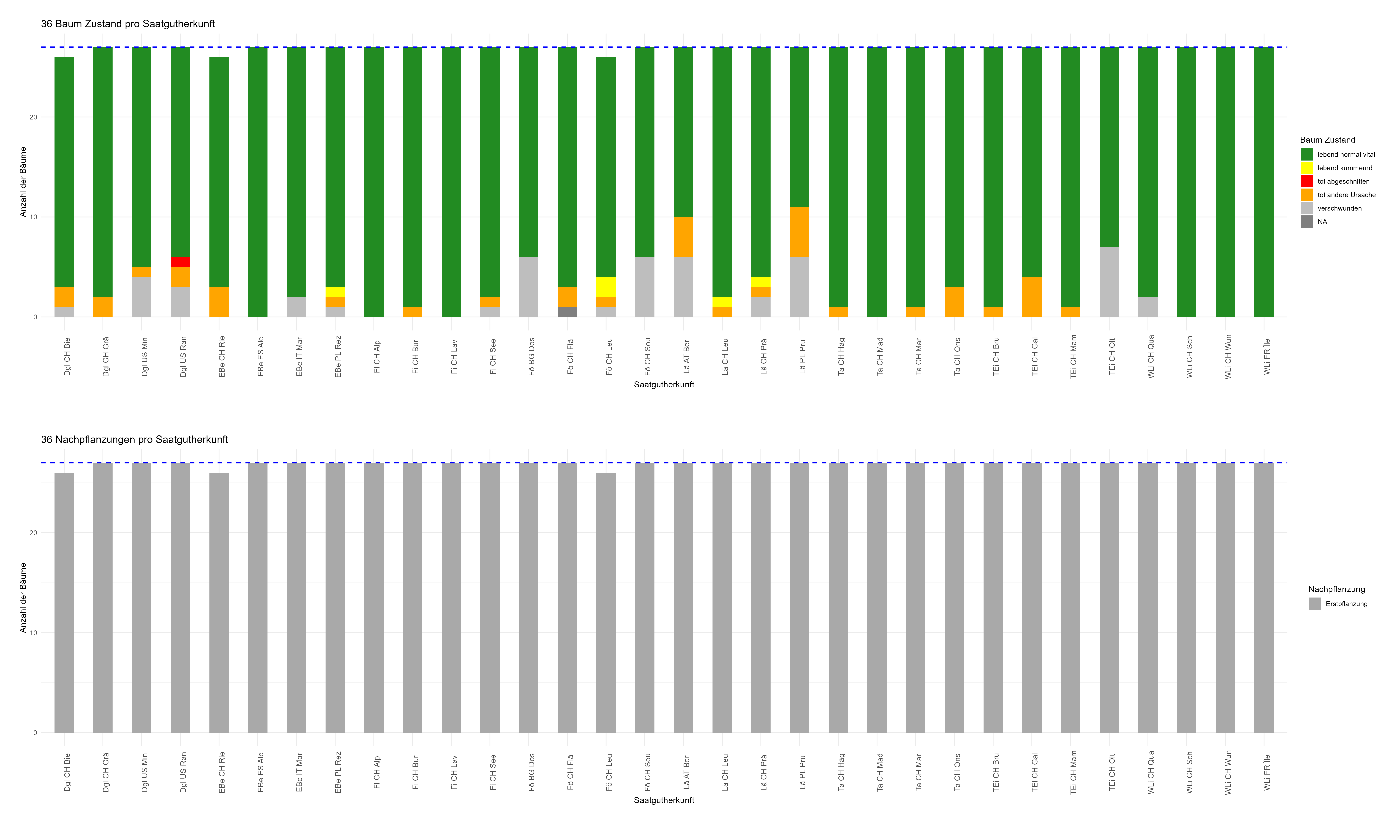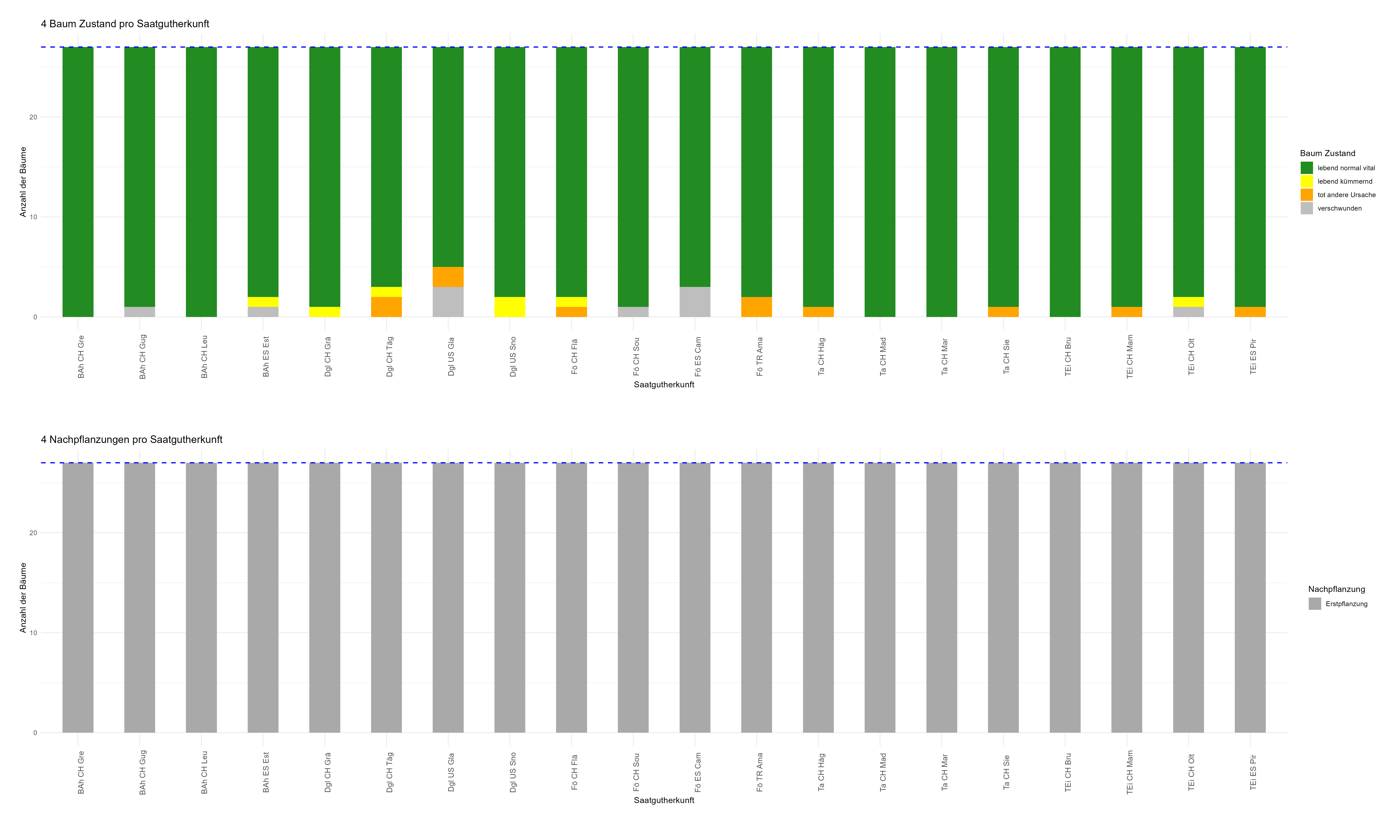 Anzahl BA = Anzahl der in einer Testpflanzung getesteten Baumarten, PP = Pflanzperiode, in welcher eine Testpflanzung eingerichtet wurde: 1 bedeutet Herbst 20 - Frühjahr 21, 2 bedeutet Herbst 21 - Frühjahr 22, 3 bedeutet Herbst 22 - Frühjahr 23. Zustand: pro Inventurzeitpunkt (Jahreszahl) Link zu 2 Figuren: Fig 1 Beurteilung des Zustands aller Pflanzen pro Saatgutherkunft pro Fläche (3 Wiederholungsblöcke x 9 Pflanzen= 27 Pflanzen pro Saatgutherkunft pro Fläche) Kategorien: lebend normal vital, lebend kümmernd, tot, abgeschnitten und verschwunden; Fig 2 Anzahl Pflanzen welche zum Inventurzeitpunkt bereits nachgepflanzt waren. Die Bezeichnung der Saatgutherkunft setzt sich auch dem Baumartenkürzel dem Herkunftsland und den ersten 3 Buchstaben der Herkunftsgemeinde zusammen. Baumartenkürzel: BAh Bergahorn, BHa Baumhasel, Bu Buche, Dgl Douglasie, EBe Elsbeere, Fi Fichte, Fö Föhre, Ki Kirsche, Lä Lärche, Nu Nussbaum, SAh Spitzahorn, SchAh Schneeballblättriger Ahorn, SEi Stieleiche, Ta Tanne, TEi Traubeneiche, WLi Winterlinde, Ze Zeder, ZEi Zerreiche