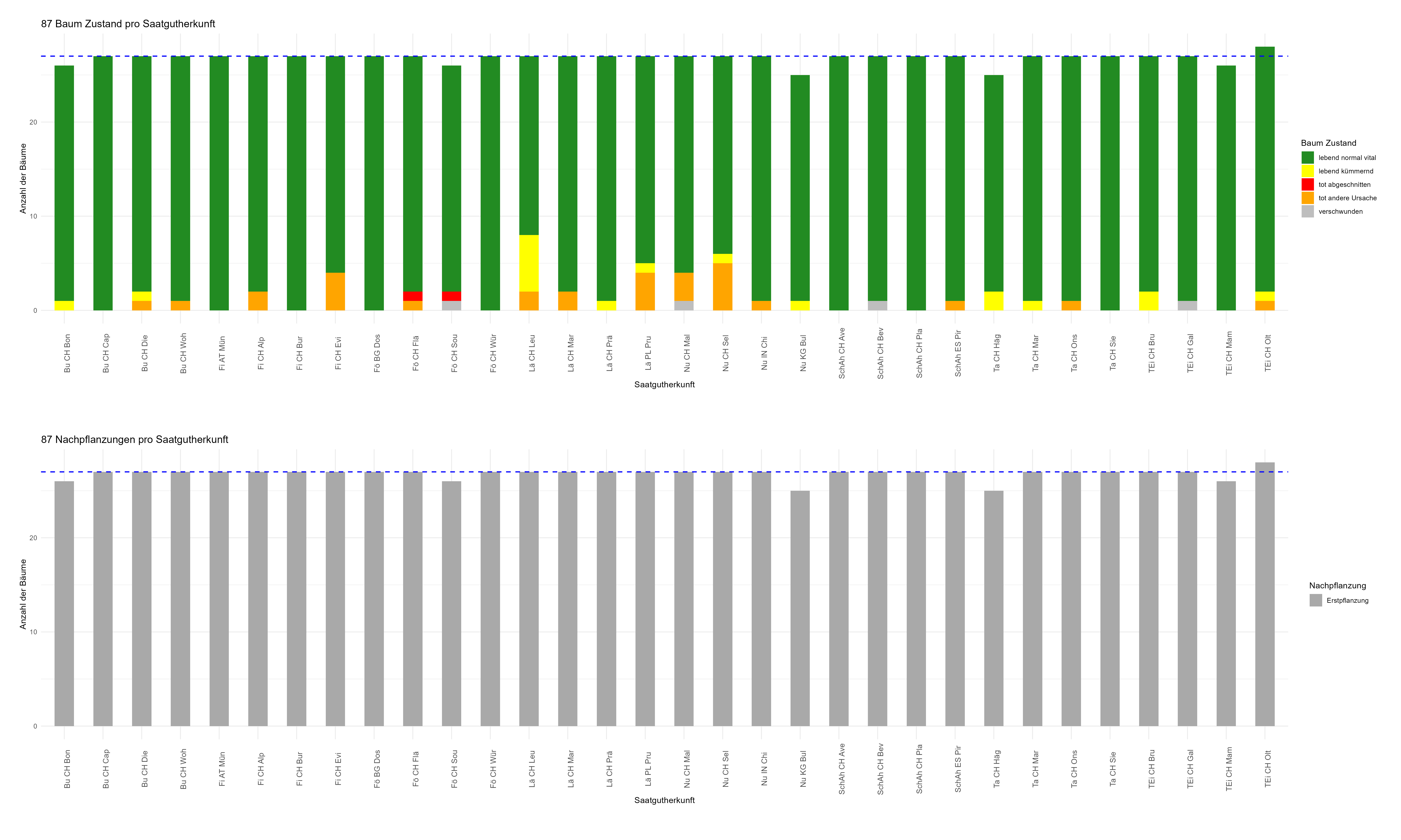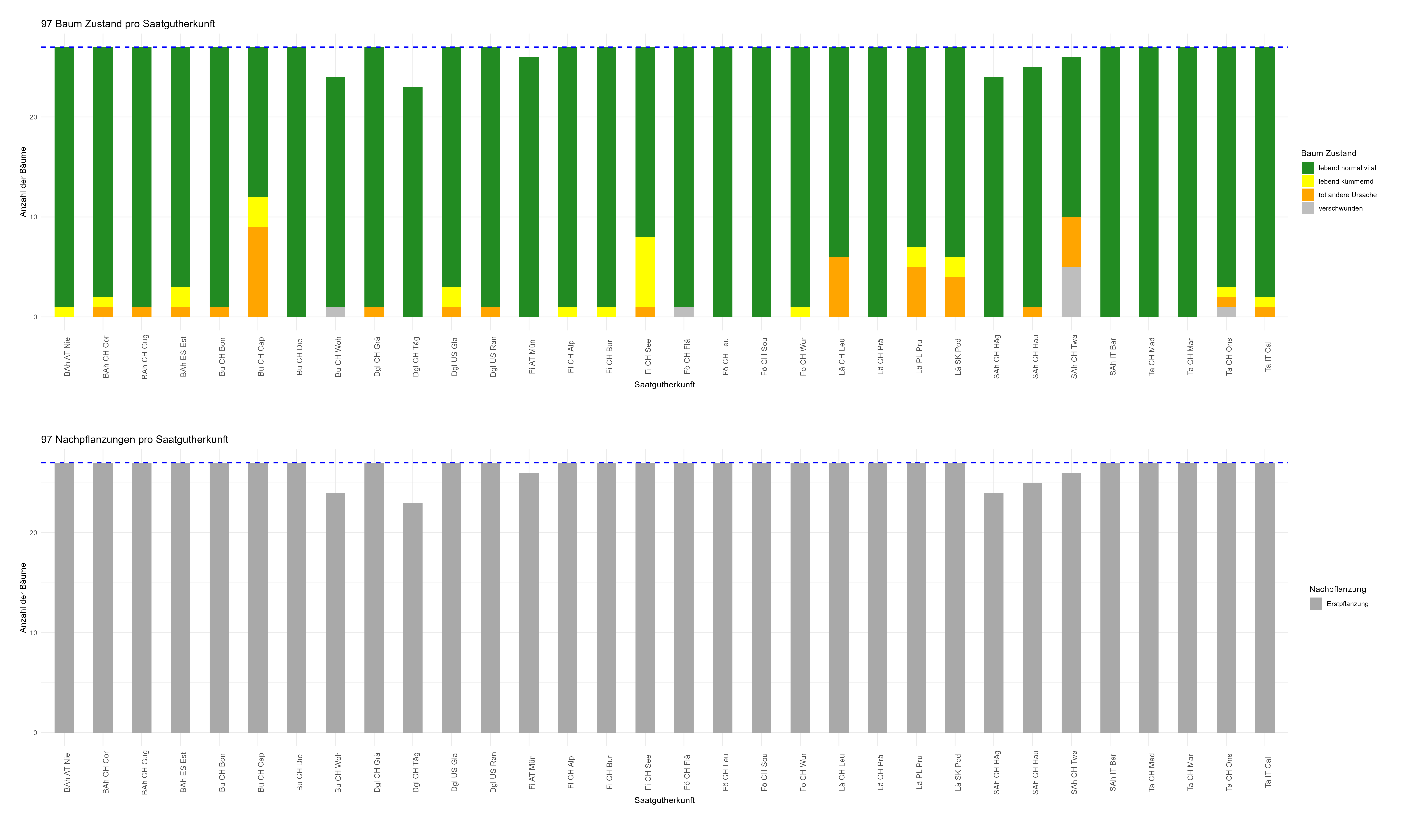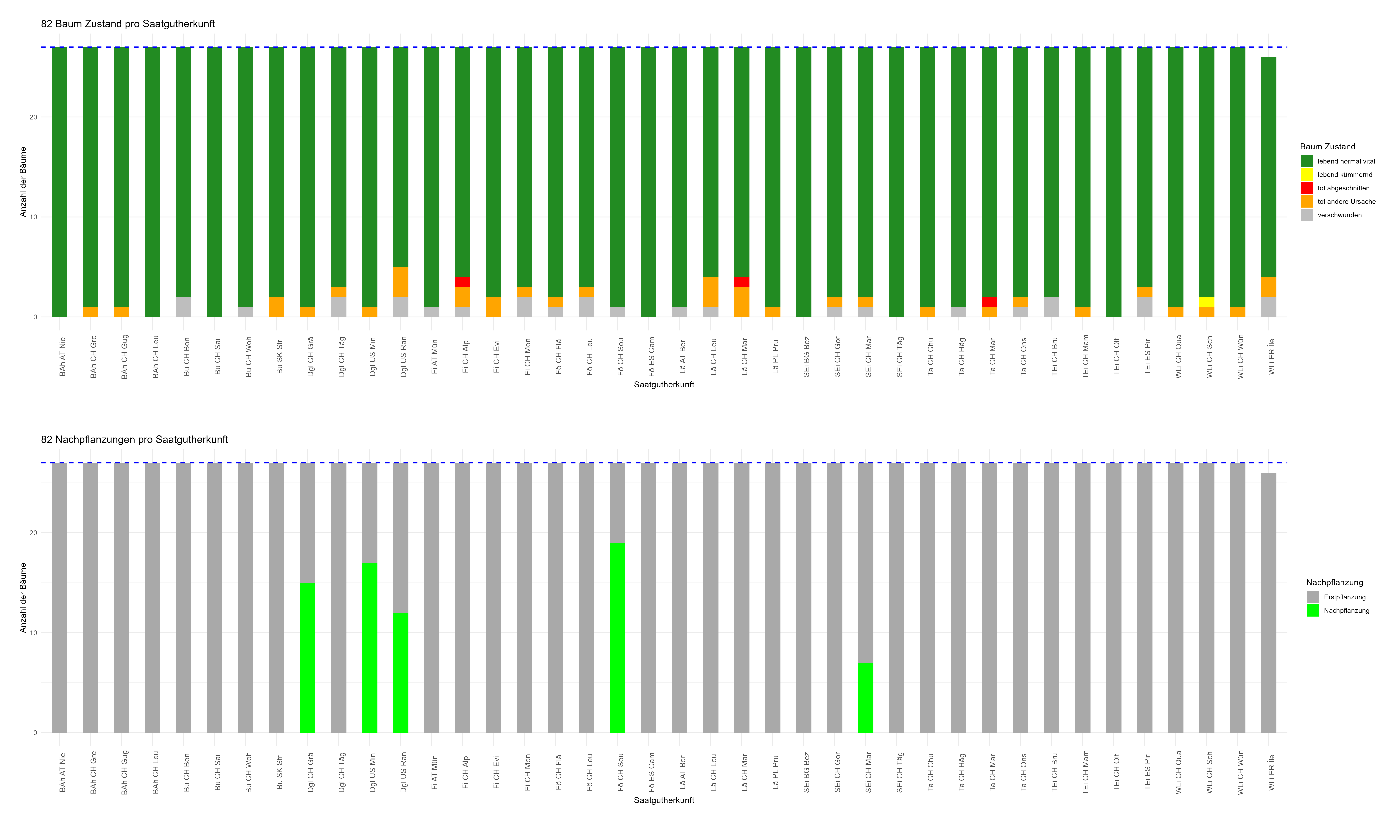 Anzahl BA = Anzahl der in einer Testpflanzung getesteten Baumarten, PP = Pflanzperiode, in welcher eine Testpflanzung eingerichtet wurde: 1 bedeutet Herbst 20 - Frühjahr 21, 2 bedeutet Herbst 21 - Frühjahr 22, 3 bedeutet Herbst 22 - Frühjahr 23. Zustand: pro Inventurzeitpunkt (Jahreszahl) Link zu 2 Figuren: Fig 1 Beurteilung des Zustands aller Pflanzen pro Saatgutherkunft pro Fläche (3 Wiederholungsblöcke x 9 Pflanzen= 27 Pflanzen pro Saatgutherkunft pro Fläche) Kategorien: lebend normal vital, lebend kümmernd, tot, abgeschnitten und verschwunden; Fig 2 Anzahl Pflanzen welche zum Inventurzeitpunkt bereits nachgepflanzt waren. Die Bezeichnung der Saatgutherkunft setzt sich auch dem Baumartenkürzel dem Herkunftsland und den ersten 3 Buchstaben der Herkunftsgemeinde zusammen. Baumartenkürzel: BAh Bergahorn, BHa Baumhasel, Bu Buche, Dgl Douglasie, EBe Elsbeere, Fi Fichte, Fö Föhre, Ki Kirsche, Lä Lärche, Nu Nussbaum, SAh Spitzahorn, SchAh Schneeballblättriger Ahorn, SEi Stieleiche, Ta Tanne, TEi Traubeneiche, WLi Winterlinde, Ze Zeder, ZEi Zerreiche