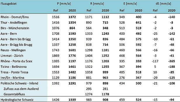 Natürlicher Wasserhaushalt der ganzen Schweiz und bedeutender Grosseinzugsgebiete für 2020 und die Normperiode 1981-2010 (mm pro Jahr). P: Niederschlag; R: Abfluss; E: Verdunstung; dS: Speicheränderungen.