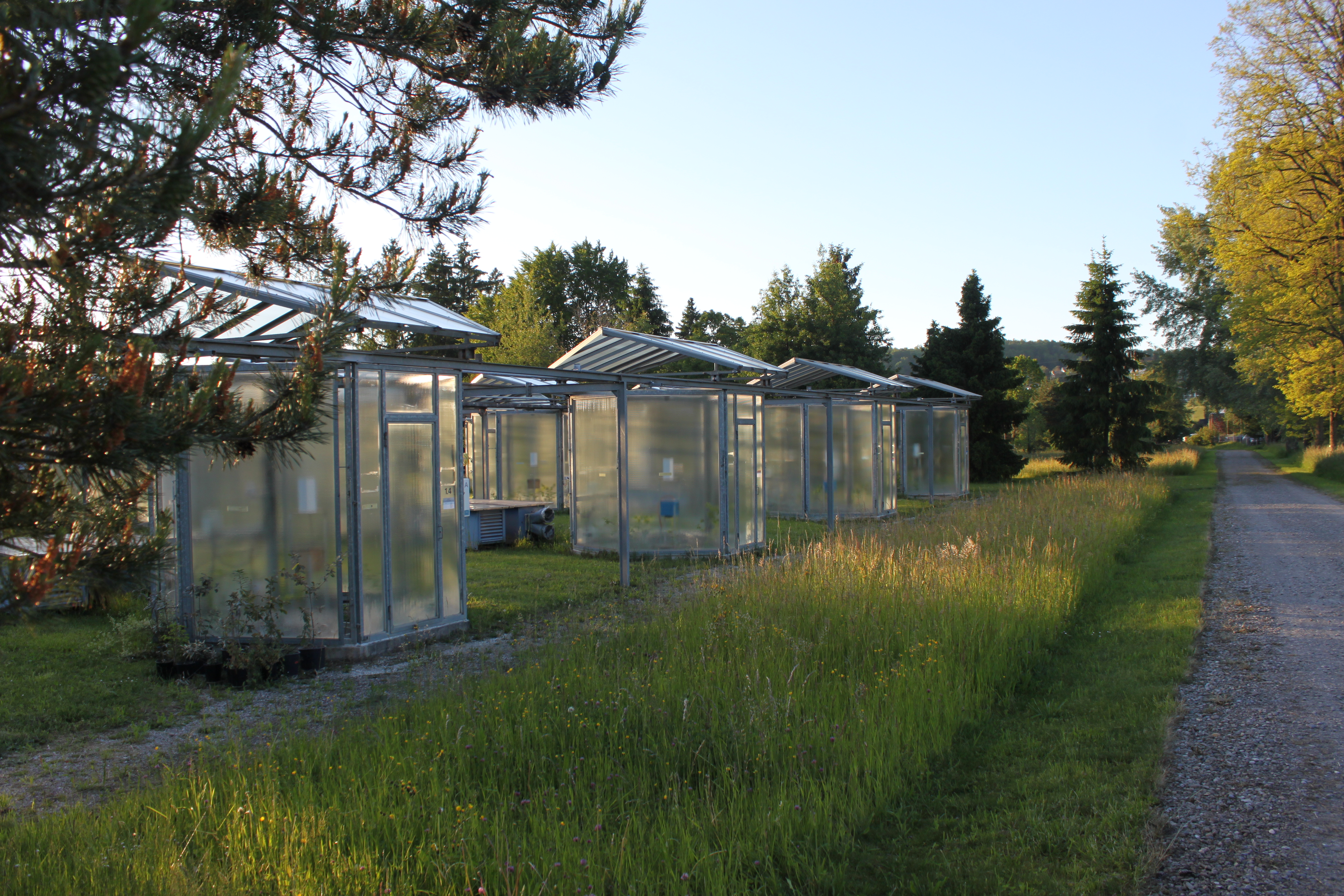 In der Modell-Ökosystem-Anlage (MODOEK) der WSL in Birmensdorf haben wir seit dem Frühjahr 2018 junge Bäume einer Kombination aus Erwärmung (+5°C relativ zur Umgebung) und Trockenheit (-50% relative Luftfeuchtigkeit im Boden gegenüber der Umgebung) ausgesetzt. Zwei Baumarten mit unterschiedlicher Toleranz gegenüber Hitze und Trockenheit wurden in die offenen Kammern gepflanzt: Rotbuche (Fagus sylvatica L.) und Flaumeiche (Quercus pubescens Willd.). Die Bäume wachsen in verschiedenen Kombinationen (Monokulturen bzw. Mischungen), so dass wir die Auswirkungen ihrer Interaktion bewerten können.