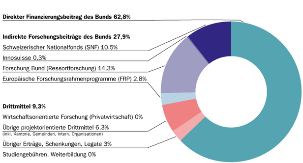 Im Jahr 2024 leistete der Bund 62,8 % an die Finanzierung der WSL über direkte Beiträge. Weitere 27,9 % steuerte er über die kompetitiven Forschungsmittel und die Ressortforschung (Zweitmittel) bei. Die verbleibenden 9,3 % des Ertrags verteilen sich auf die Drittmittel (Projekte mit Kantonen, Gemeinden und internationalen Organisationen sowie wirtschaftsorientierte Forschung), die übrigen Erträge, die Schenkungen und Legate sowie Studiengebühren und Weiterbildung.