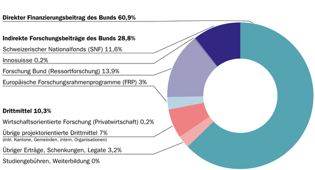 Im Jahr 2025 leistete der Bund 60,9 % zur Finanzierung der WSL über direkte Beiträge. Weitere 28,8 % steuerte er über die kompetitiven Forschungsmittel und die Ressortforschung (Zweitmittel) bei. Die verbleibenden 10,3 % des Ertrags verteilen sich auf die Drittmittel (Projekte mit Kantonen, Gemeinden und internationalen Organisationen sowie wirtschaftsorientierte Forschung), die übrigen Erträge, die Schenkungen und Legate sowie Studiengebühren und Weiterbildung.