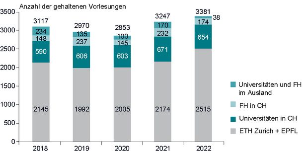 Die WSL-Vorlesungen und –Kurse ergänzen die Angebote der Hochschulen mit Themen, über die die WSL besondere fachliche Kompetenzen verfügt. Rund 140 Mitarbeiterinnen und Mitarbeiter der WSL hielten an den beiden Eidgenössischen Hochschulen, an den kantonalen Universitäten, an Schweizer Fachhochschulen sowie an Hochschulen im Ausland im Jahr 2022 insgesamt 3381 Stunden Vorlesungen. Der grösste Anteil – beinahe 75 Prozent – erfolgte im ETH-Bereich. Die Vorlesungen und Kurse der WSL-Dozierenden werden von den Hochschulen verwaltet und sind in den jeweiligen Vorlesungsverzeichnissen aufgeführt.