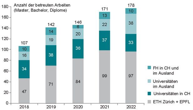 Ende 2022 zählte die WSL insgesamt 30 Professorinnen und Professoren in Hochschulen. Zusätzlich zu den universitären Vorlesungen hat die WSL 2022 mehrere Weiterbildungskurse für die Praxis, Summer und Winter Schools und diverse Veranstaltungen organisiert oder mitorganisiert. Die WSL betreut auch Bachelor-, Master- und Doktorarbeiten. 2022 haben WSL Forschende 178 Doktorarbeiten und 178 Bachelor- oder Masterarbeiten betreut.