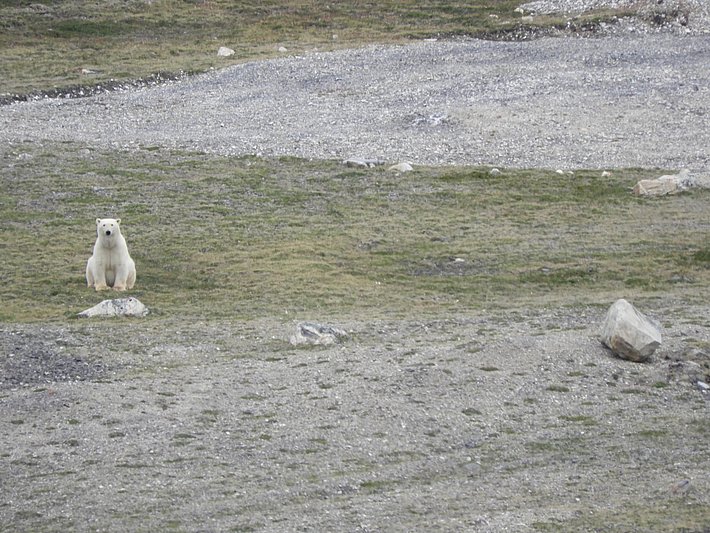 Eine der Vorbereitungen auf die Expedition beinhaltete ein Schiesstraining für den Fall einer Begegnung mit einem Eisbären. Man geht also durchaus mit gemischten Gefühlen nach Grönland – einerseits möchte man gerne einen Eisbären sehen, anderseits bitte nicht zu nah! Auf einer Insel namens Ella wurde angenommen, dass die Chance, auf einen Eisbären zu treffen, sehr gering seien. Prompt erblickte ich auf der Rückkehr von einer Wanderung einen knuffigen Eisbären zwischen uns und unserem Camp. Der Bär wirkte weder nervös noch hungrig, bewegte sich aber doch langsam auf unser Camp zu, wo unsere Kollegen mit Feldarbeiten beschäftigt waren. Dank Funkgerät waren aber alle rasch informiert, und der Bär konnte mit mehreren Schreckschüssen verjagt werden. Eigentlich schade, denn anfangs konnten wir den Bären friedlich in seinem Territorium beobachten. Aber noch besser, dass es eine Begegnung ohne jegliches Blutvergiessen war.