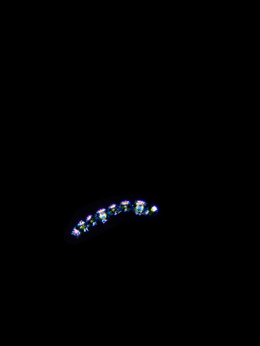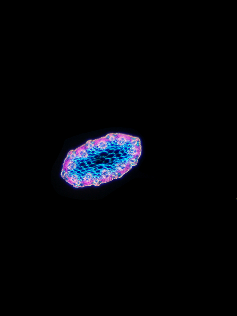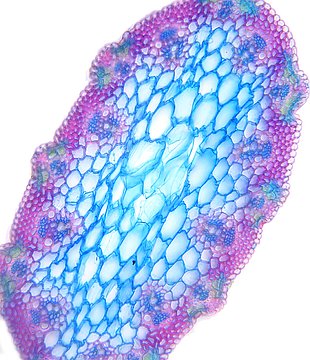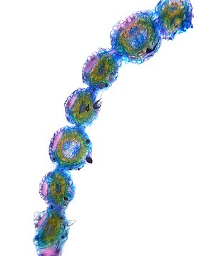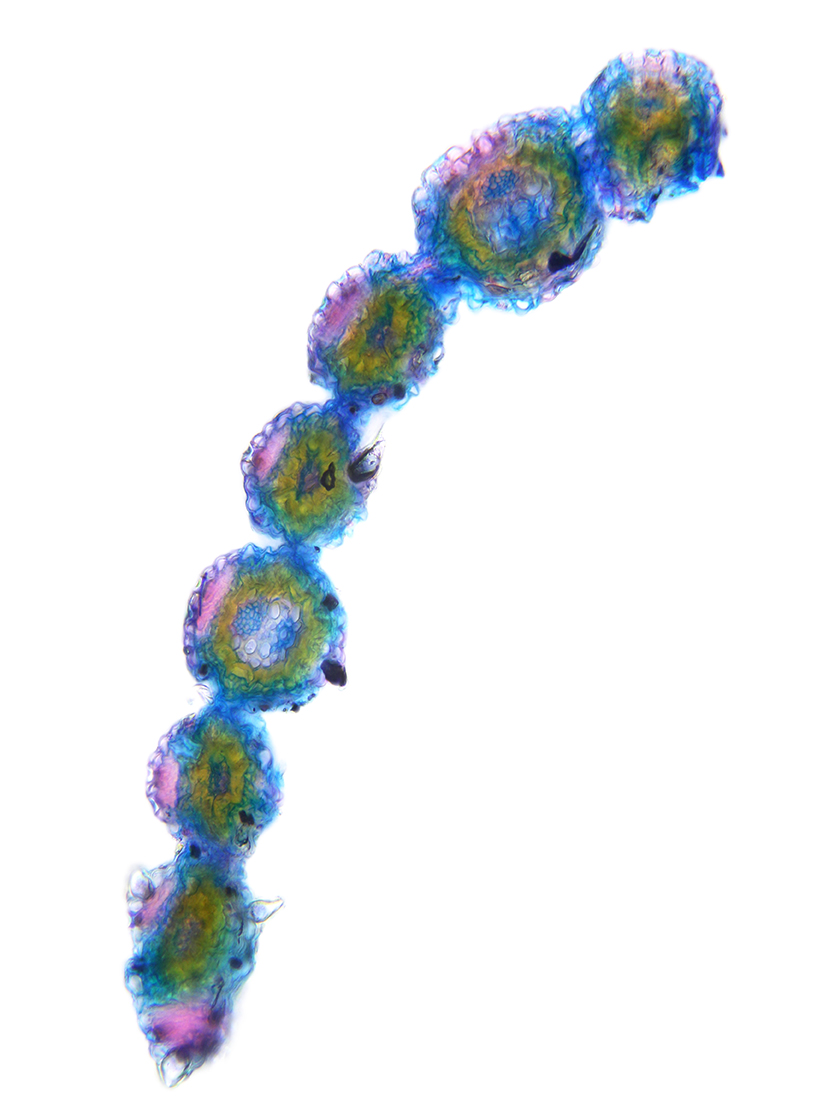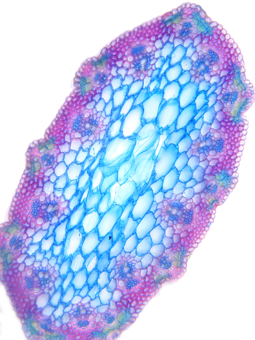 Outline with rips. Upper epidermis cells in one row. Epidermis with spikes. Vascular bundles centered between the upper and lower side of the leaf. Girders extending from the vascular bundle to both sides of the leaf.