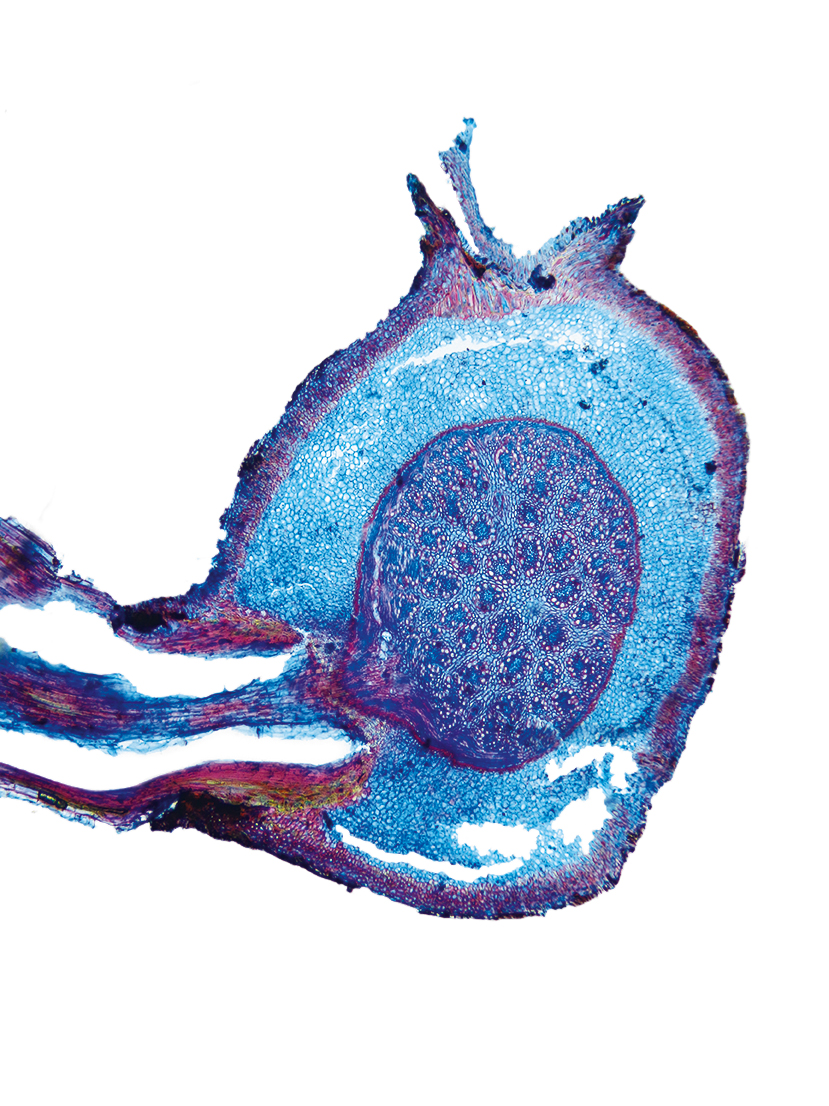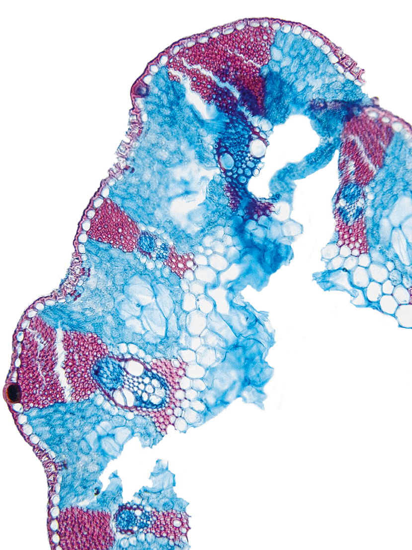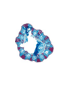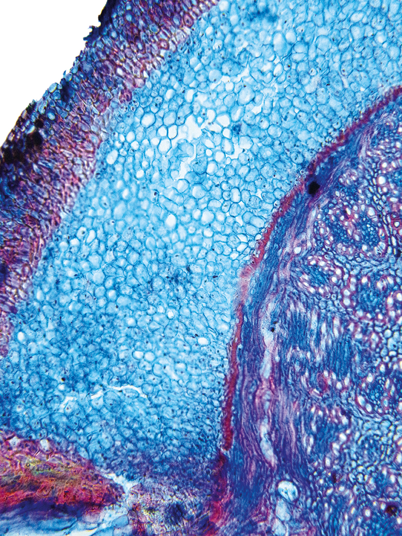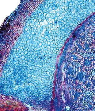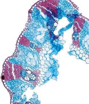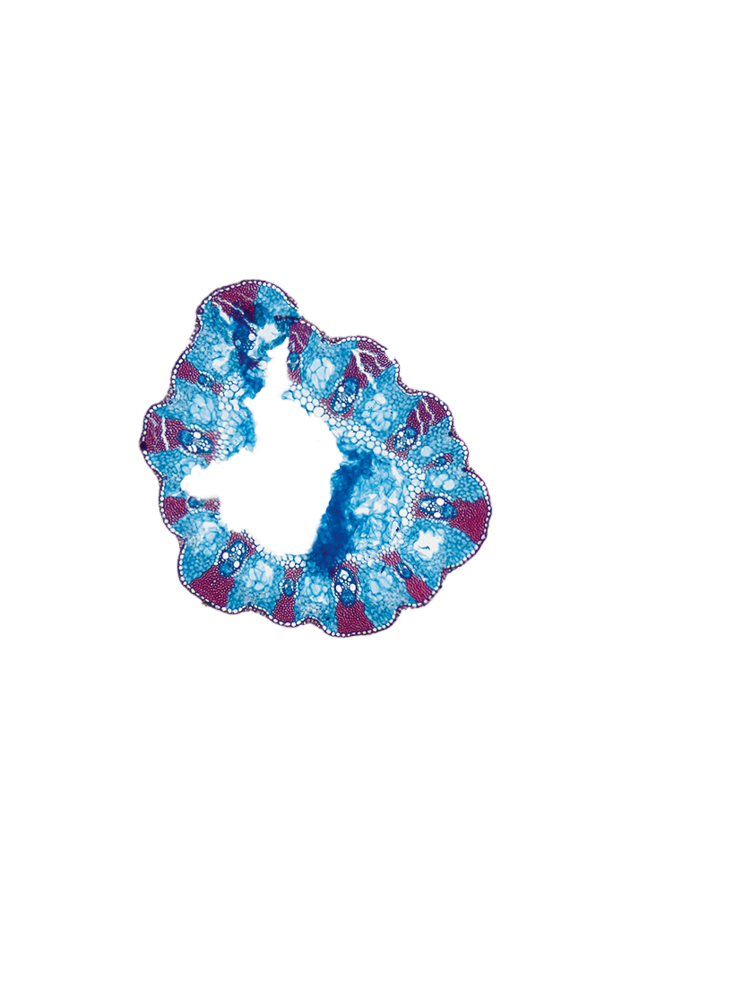 wall large, radius of culm in relation to wall thickness approximately 1: 0.5. Outline circular wavy. Culm-center hollow and surrounded by many large thin-walled, not lignified cells. Center with net-like aerenchyma (stellate). Epidermis cells inside thin