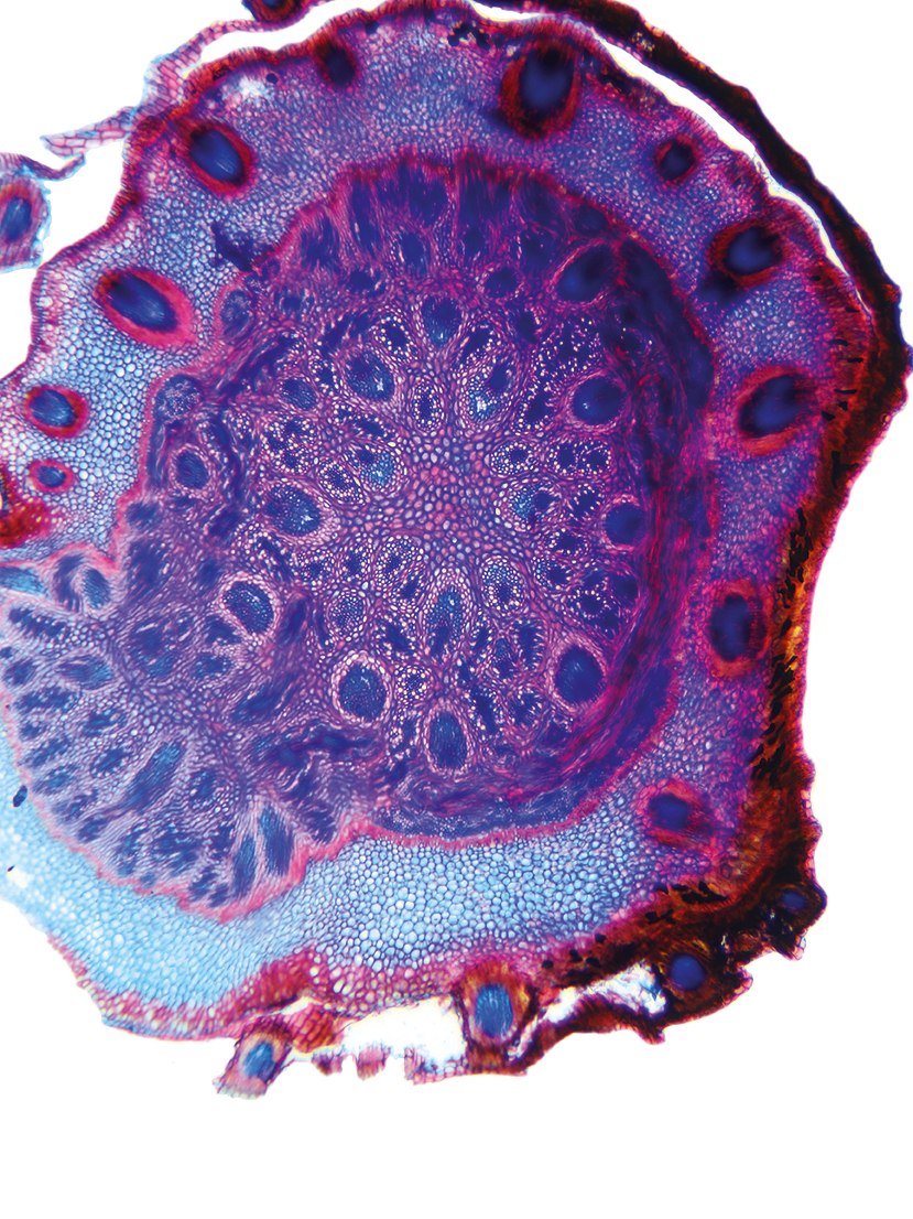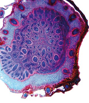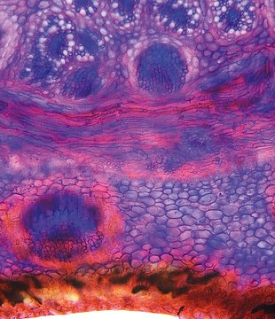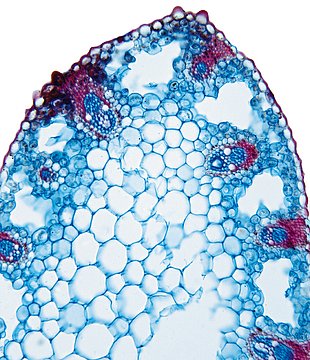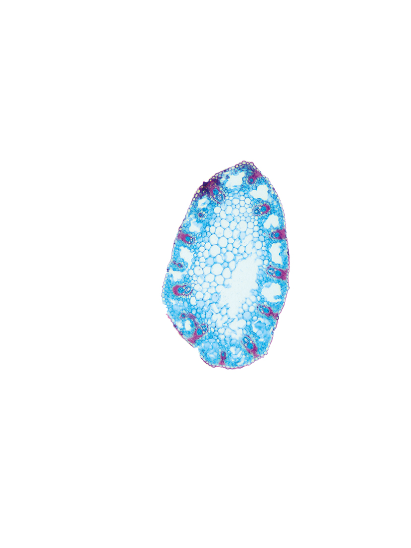 Rhizome diameter 2-4.99 mm, Rhizome center full, containing lignified cells. Endodermis absent.With cortex/central cylinder separation. Endodermis present. Endodermis as a sclerenchymatic belt. Cells in the cortex round. Vascular bundles in the cortex pre