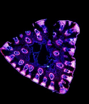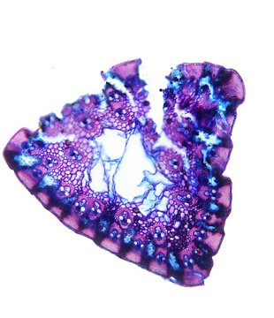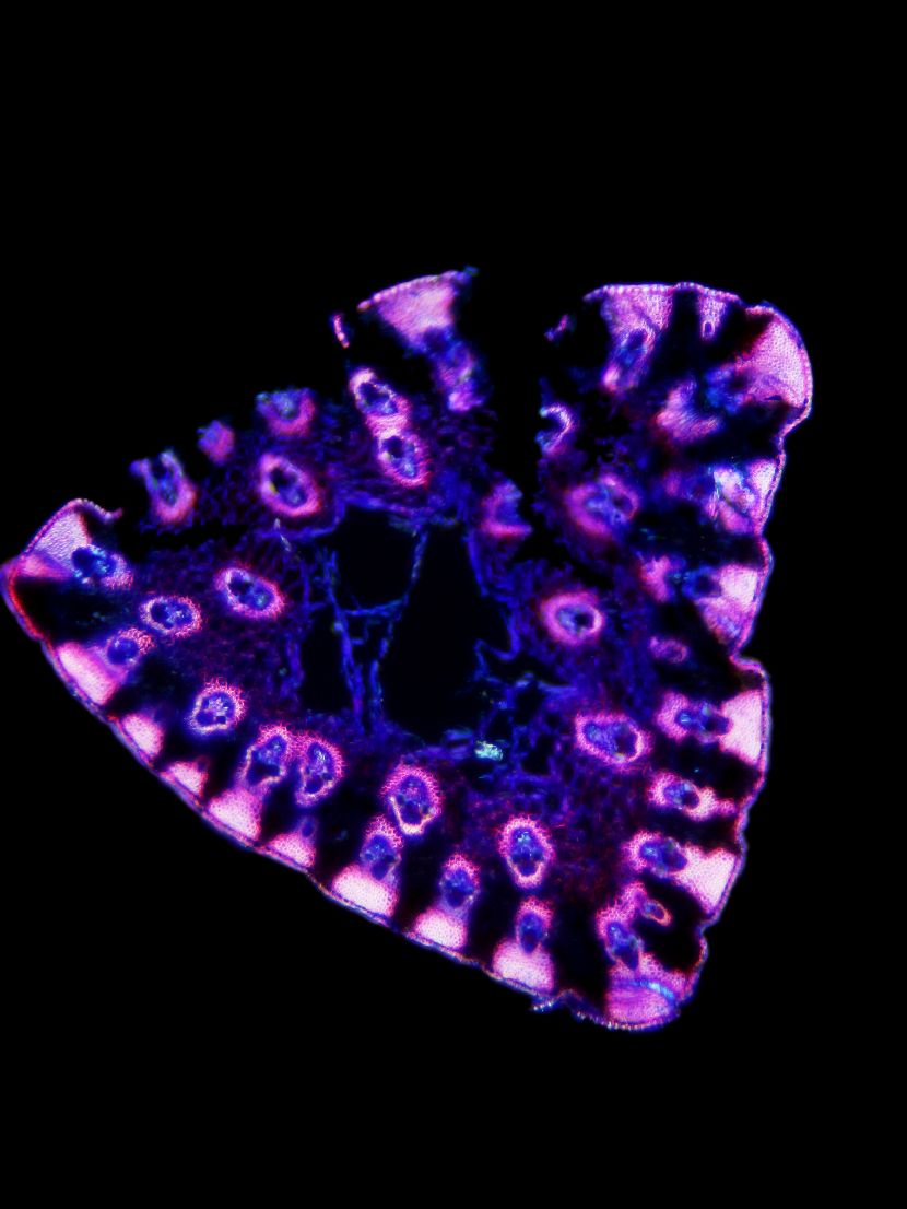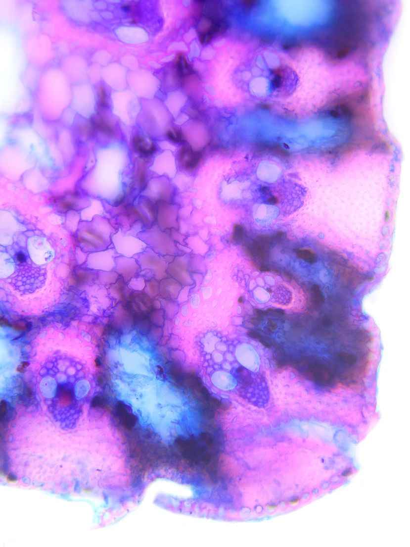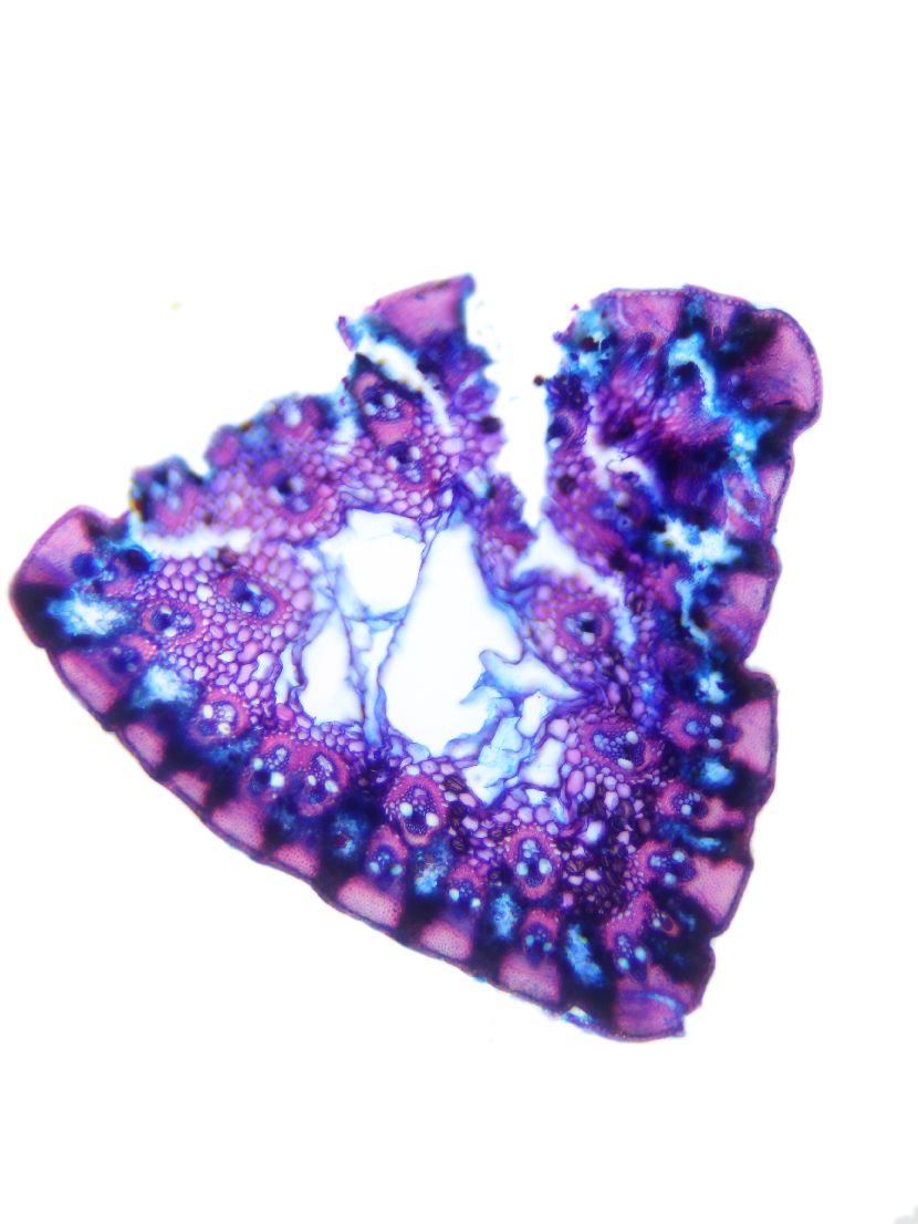 Cross-section triangular. Outline smooth. Outline with rips. Recognizable epidermis cells. Peripheral sclerenchymatic stabilisation structure (girders) conic. Large vascular bundles in 2-3 rows. Solitary large vascular bundles. Vascular bundles integrated