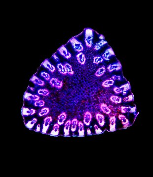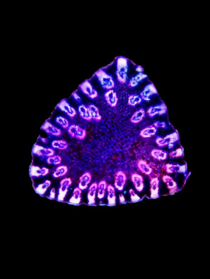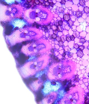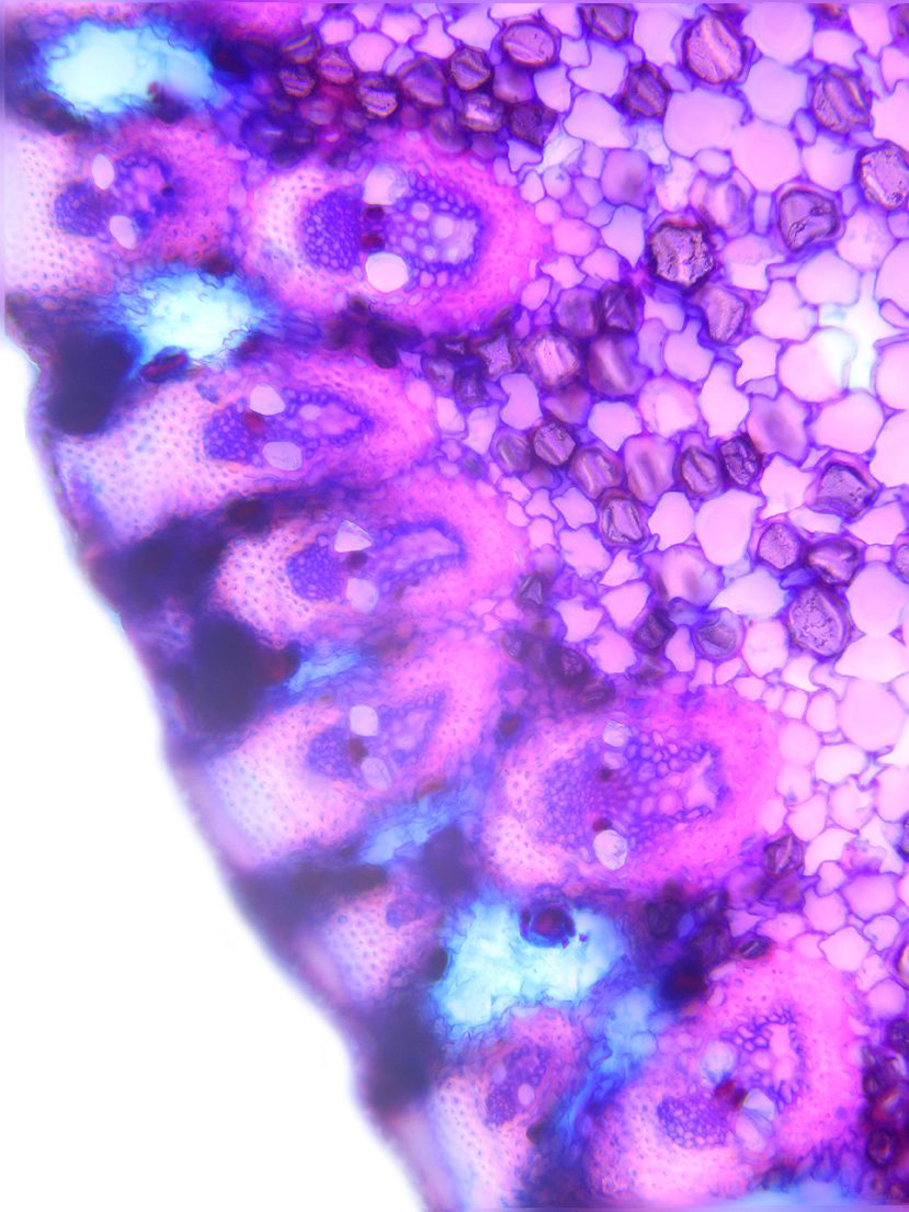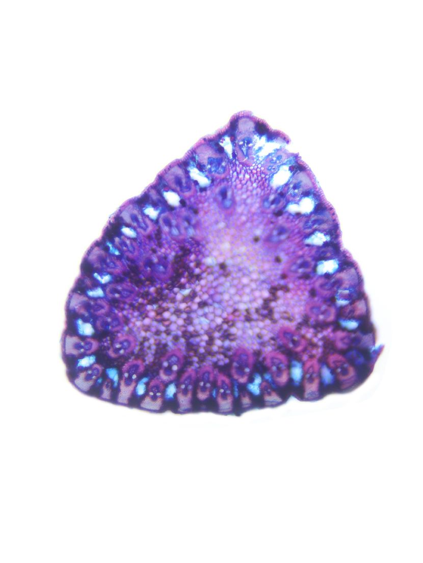 Cross-section triangular. Outline wavy. Culm center filled. Recognizable epidermis cells. Peripheral sclerenchymatic stabilisation structure (girders) rectangular. Large vascular bundles in one row. Vascular bundles integrated in peripheral stabilisation