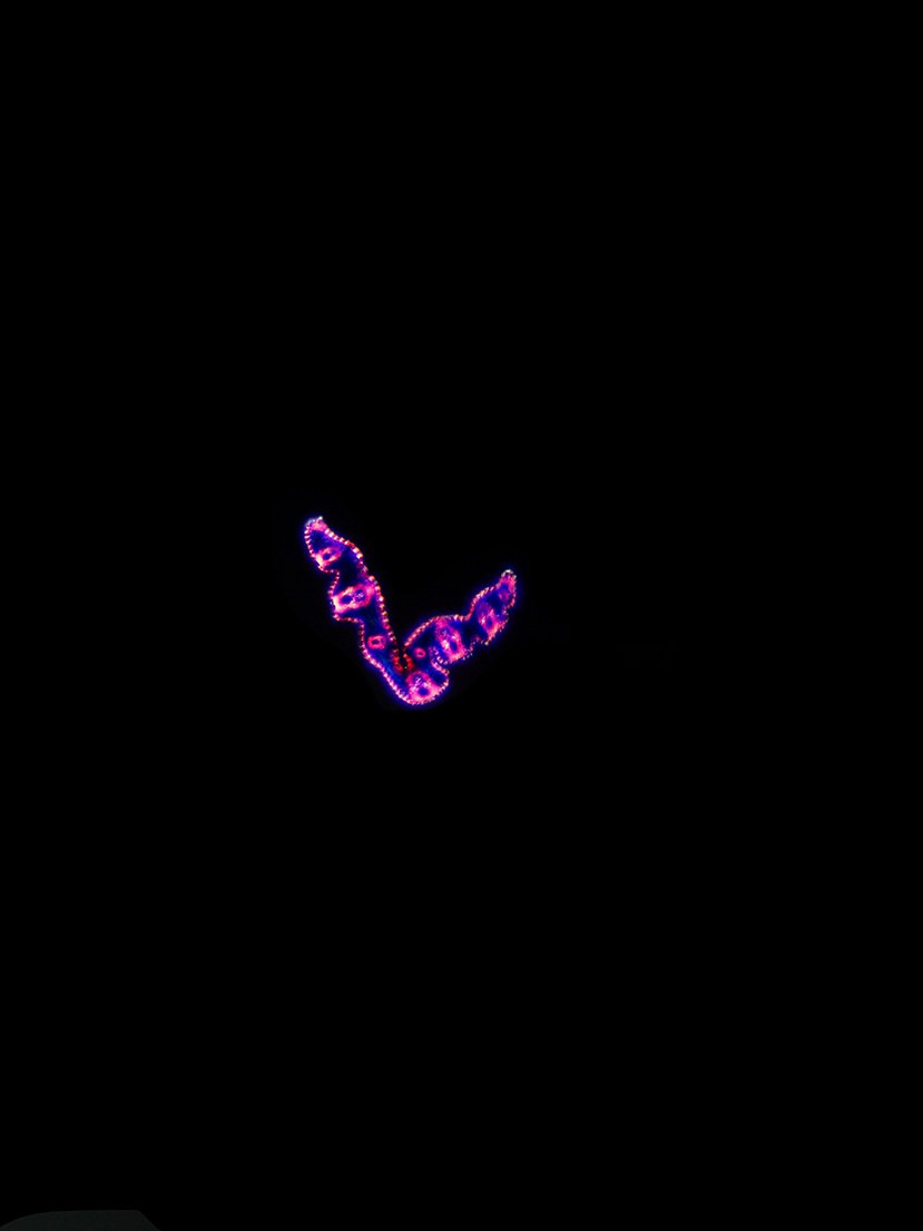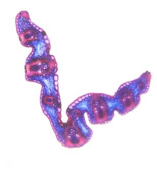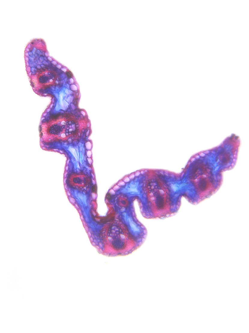 Outline with rips. Upper epidermis cells in one row. Vascular bundles centered between the upper and lower side of the leaf. Girders extending from the vascular bundle to both sides of the leaf.