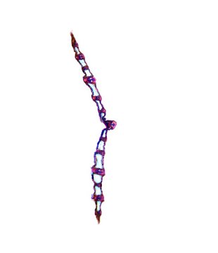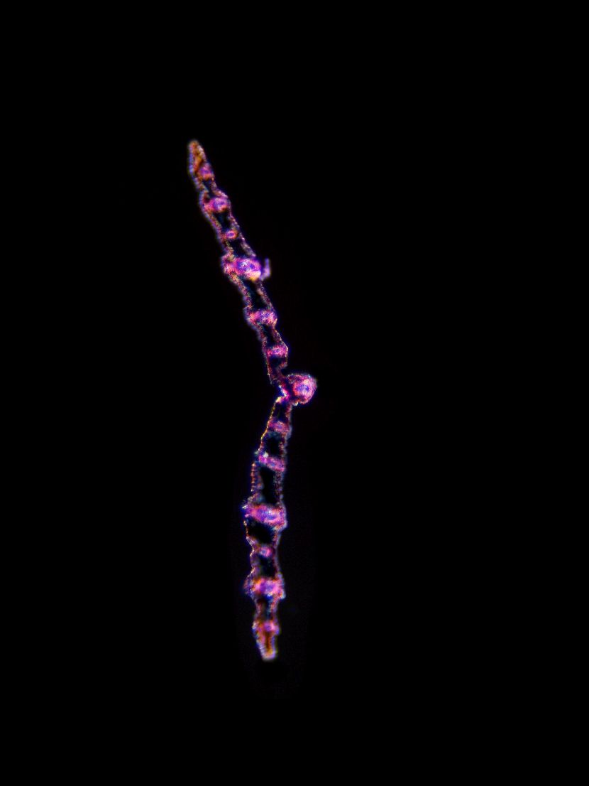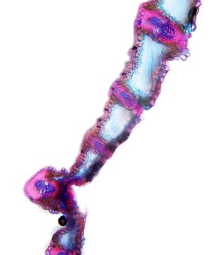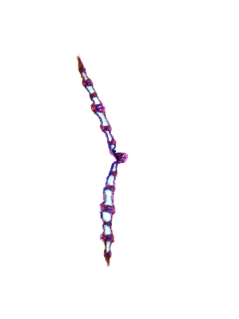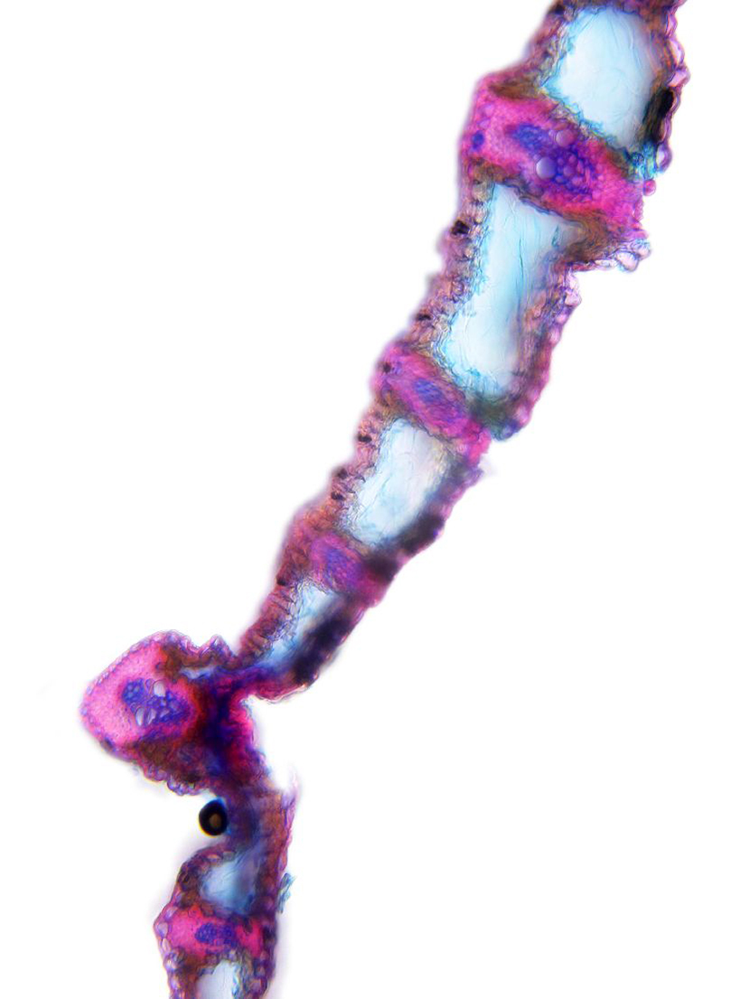 Outline wavy. Upper epidermis cells in one row. Vascular bundles centered between the upper and lower side of the leaf. Girders extending from the vascular bundle to both sides of the leaf.