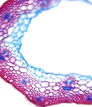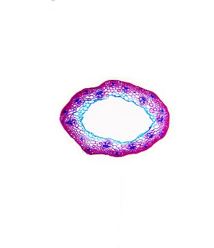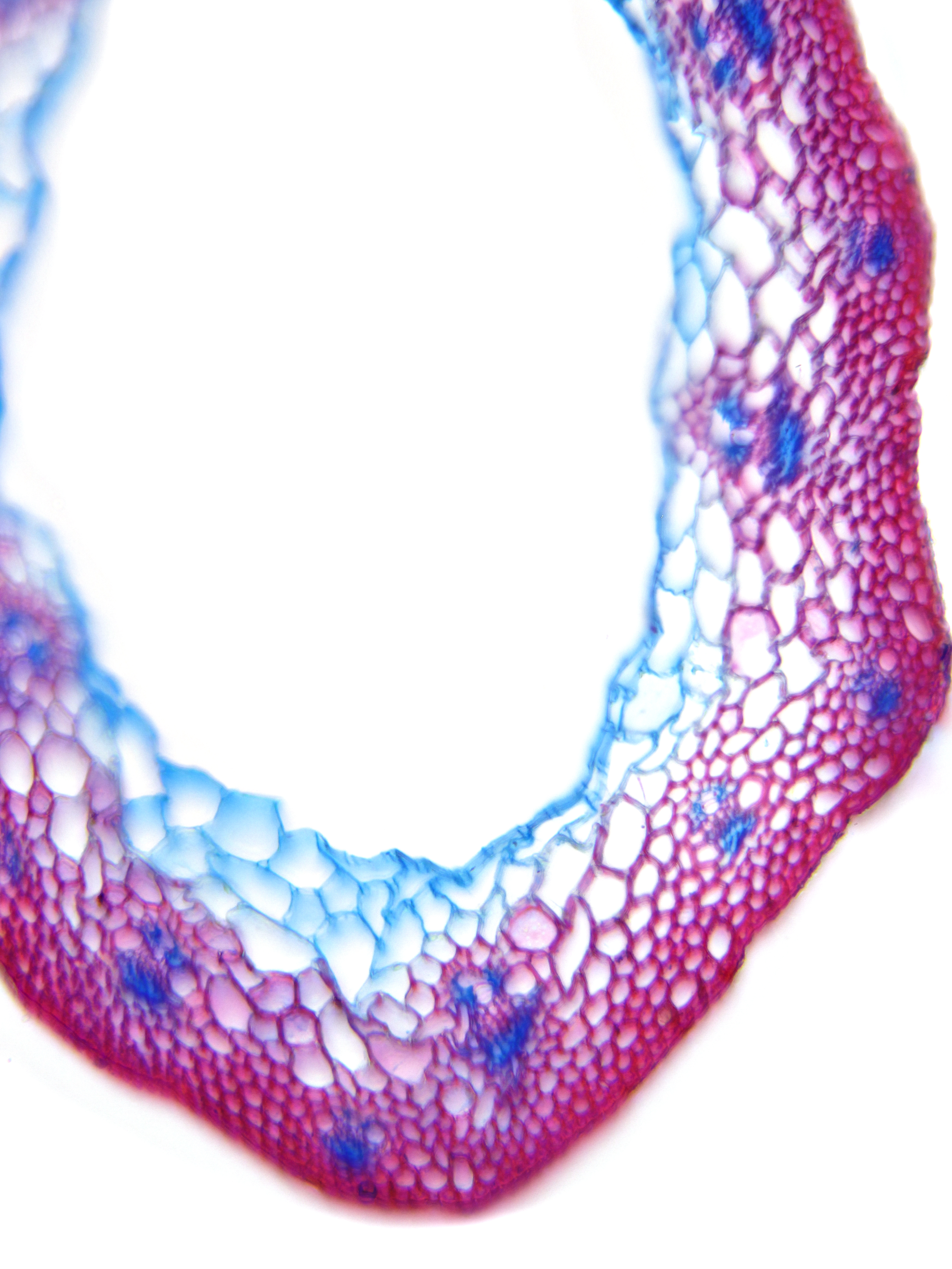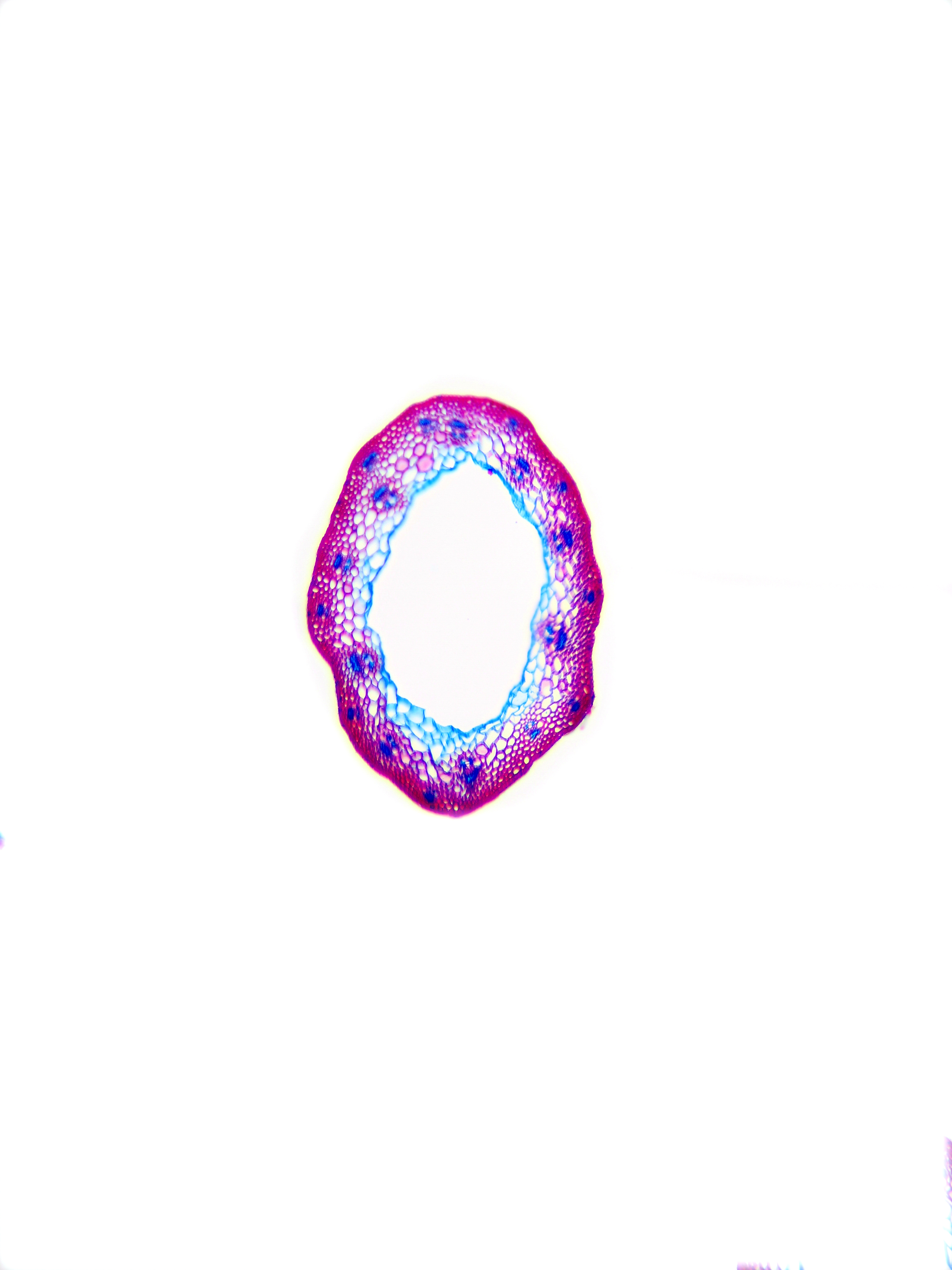 Culm-diameter 0.5-1 mm, wall large, radius of culm in relation to wall thickness 1:0.5. Outline circular with a smooth surface. Culm-center hollow and surrounded by a few thin-walled, not lignified cells. Epidermis-cells thick-walled all around. Large vas