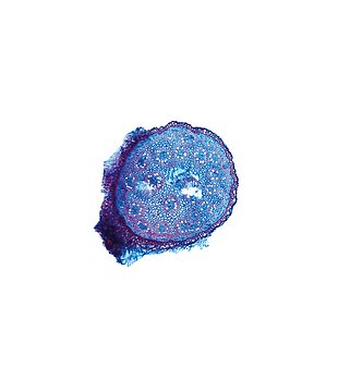 Rhizome diameter 0.5-0.99 mm, Rhizome center full, containing unlignified cells. Endodermis absent.With cortex/central cylinder separation. Endodermis present. Endodermis cells u-shaped, thick walled. Vascular bundles in central cylinde dispersed arranged