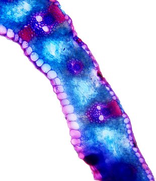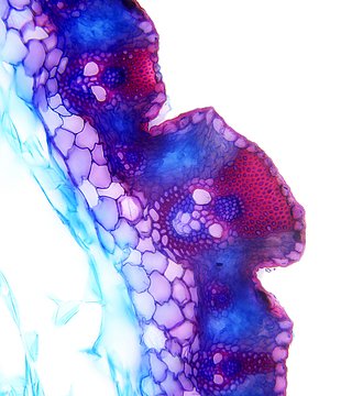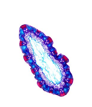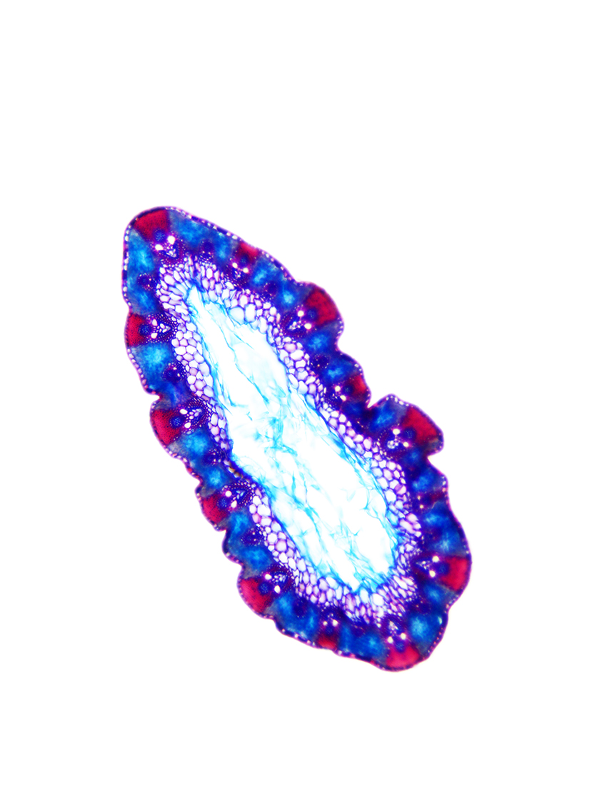 Outline wavy. Upper epidermis cells in several rows. Epdermis lignified. Vascular bundles near the lower side of the leaf. Girders extending from the vascular bundle to the lower side of the leaf.
