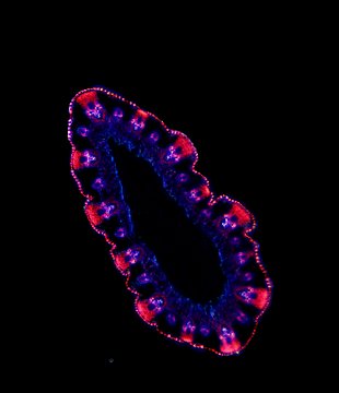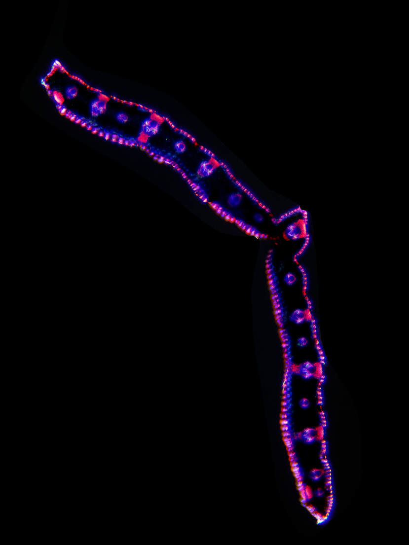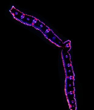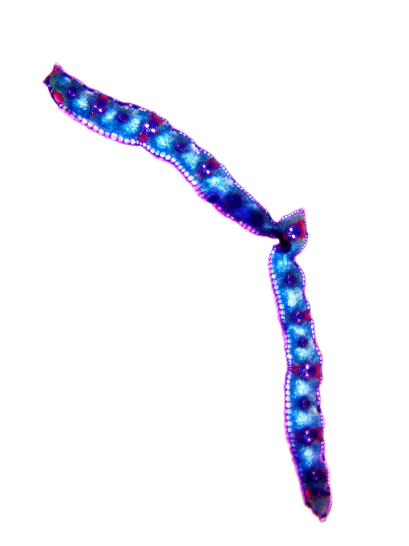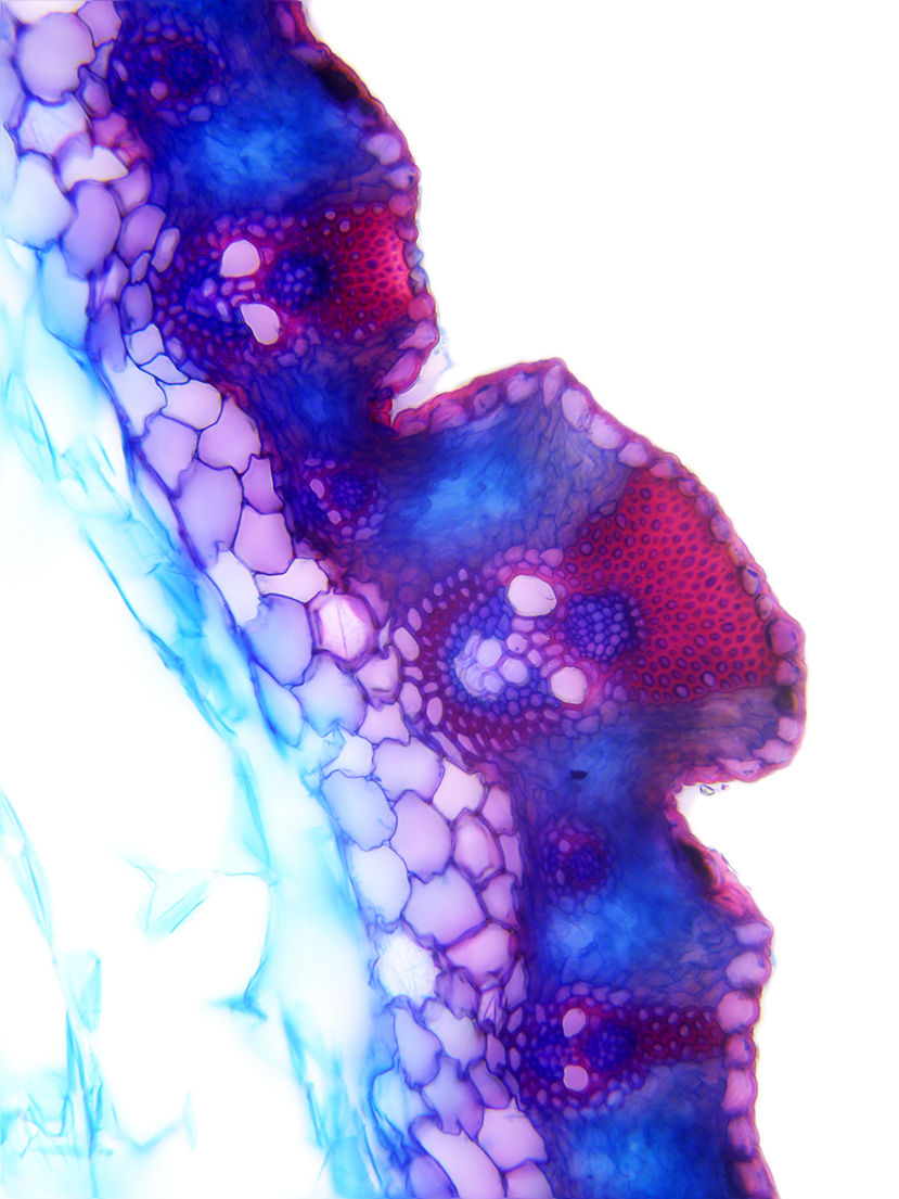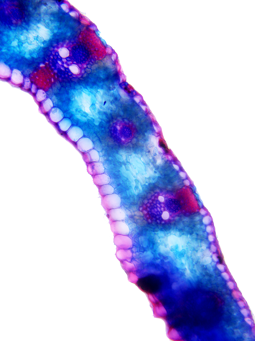 Cross-section round. Outline with rips. Culm center filled. Recognizable epidermis cells. Peripheral sclerenchymatic stabilisation structure (girders) rectangular. Large vascular bundles in one row. Vascular bundles integrated in peripheral stabilisation