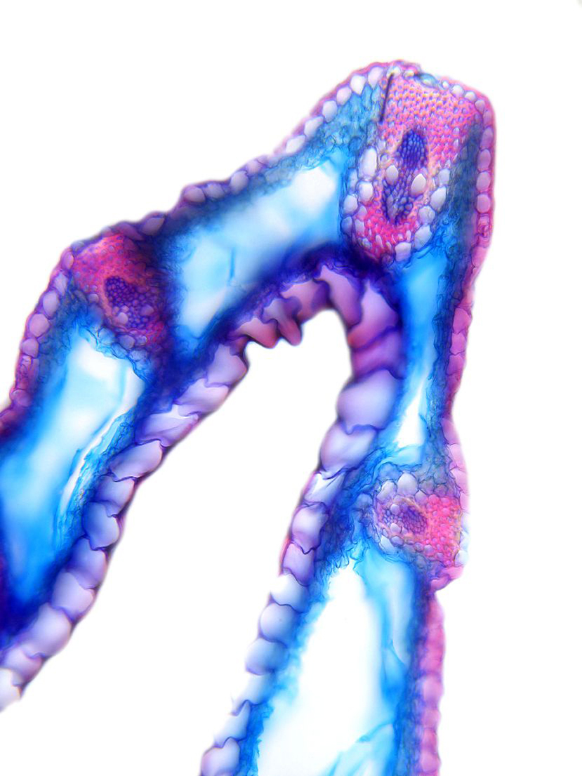 Outline wavy. Upper epidermis cells in one row. Vascular bundles centered between the upper and lower side of the leaf. Girders extending from the vascular bundle to the lower side of the leaf.
