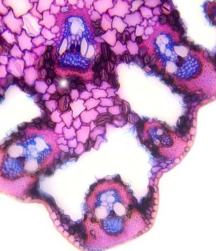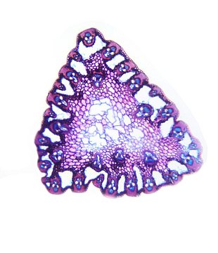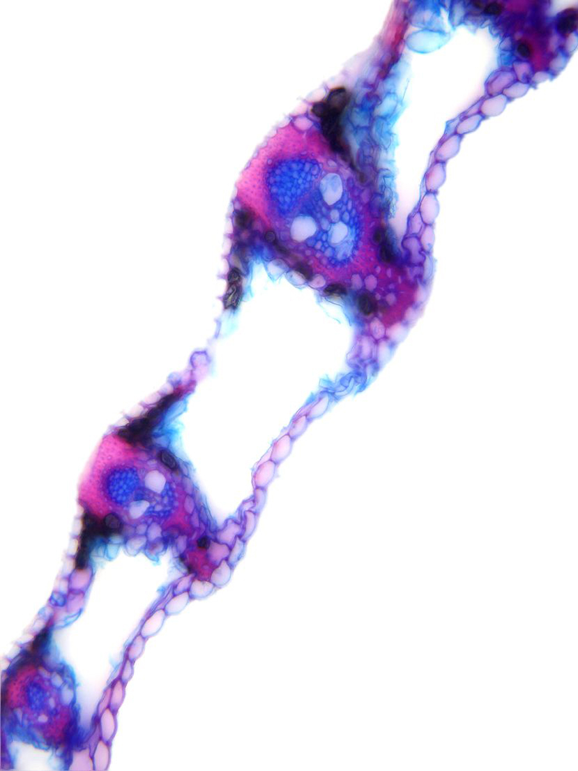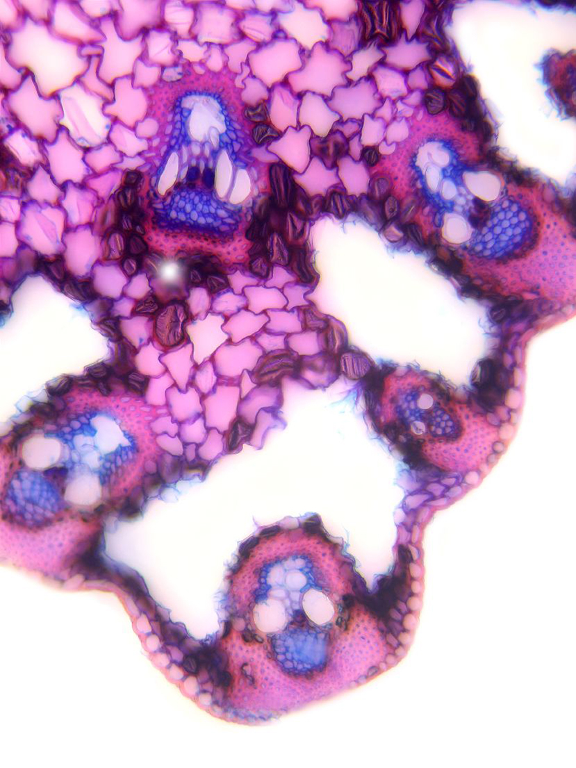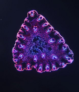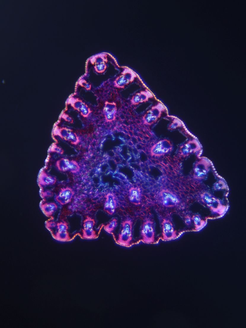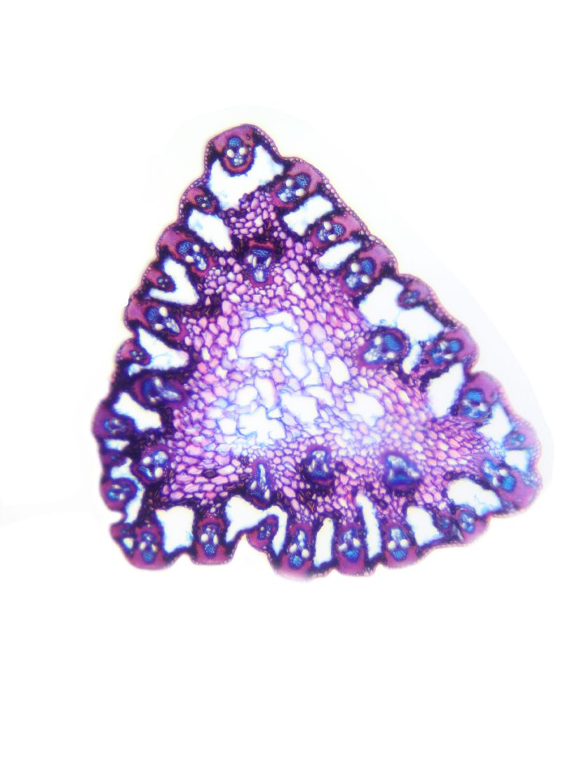 Cross-section triangular. Outline wavy. Culm center with net-like parenchyma cells (aerenchyma). Recognizable epidermis cells. Peripheral sclerenchymatic stabilisation structure (girders) rectangular. Large vascular bundles in 2-3 rows. Solitary large vas