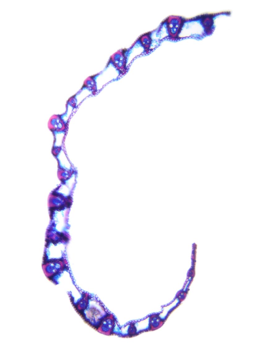 Outline wavy. Upper and lower epidermis cells of equal size and shape. Upper epidermis cells in several rows. Vascular bundles near the lower side of the leaf. Girders extending from the vascular bundle to the lower side of the leaf. Large cavities.