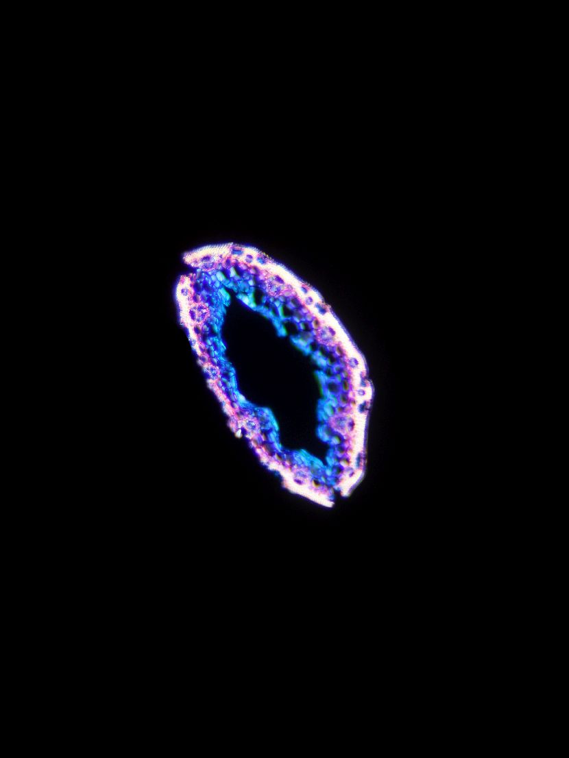 Outline smooth. Culm center hollow. No visual difference between epidermis cells and sclerenchyma cells. Continuous peripheral sclerenchymatic belt. Large vascular bundles in one row. Small vascular bundles integrated in the sclerenchymatic belt. Solitary