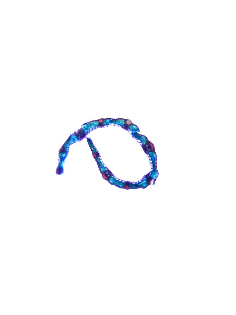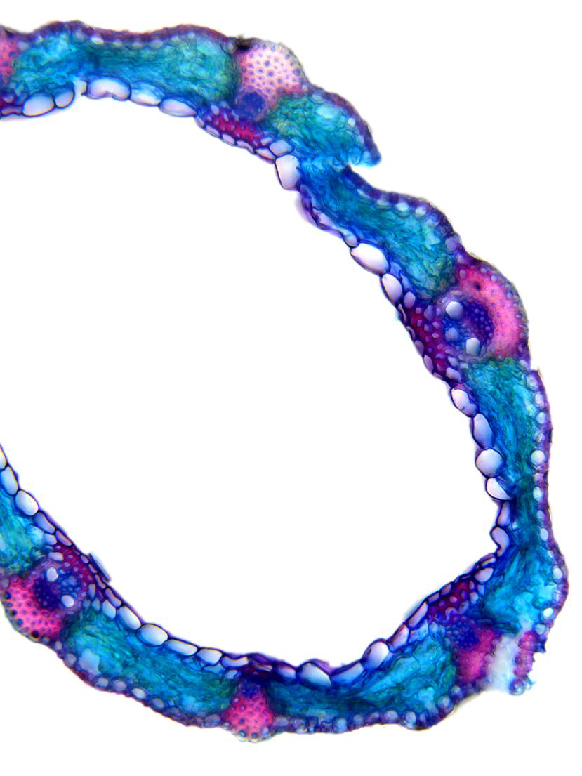 Outline wavy. Upper epidermis cells in one row. Vascular bundles near the upper side of the leaf. Girders extending from the vascular bundle to the lower side of the leaf.