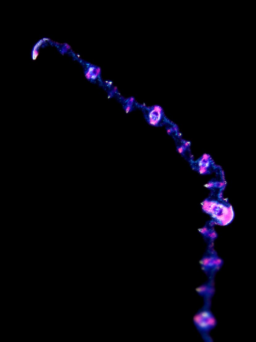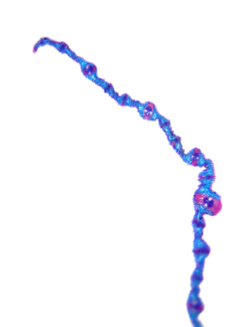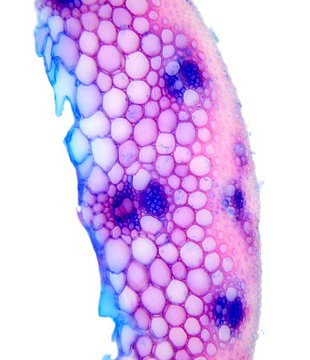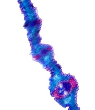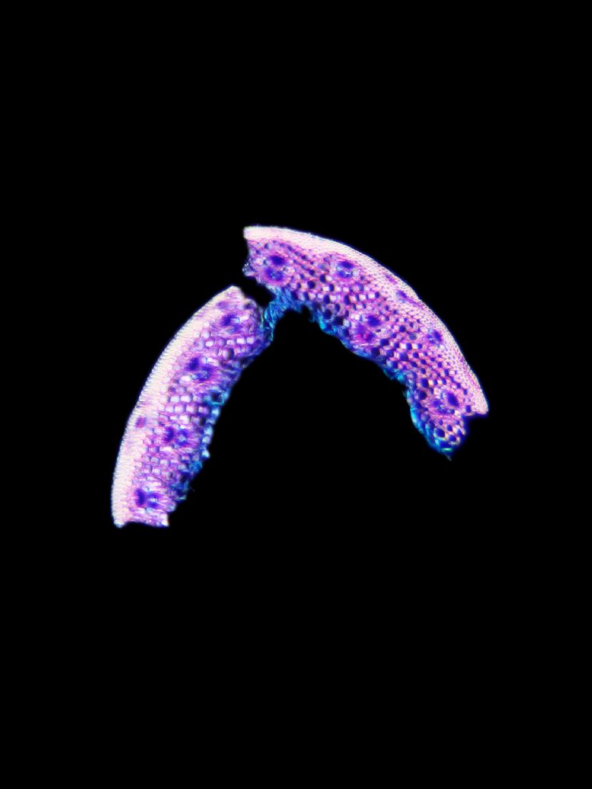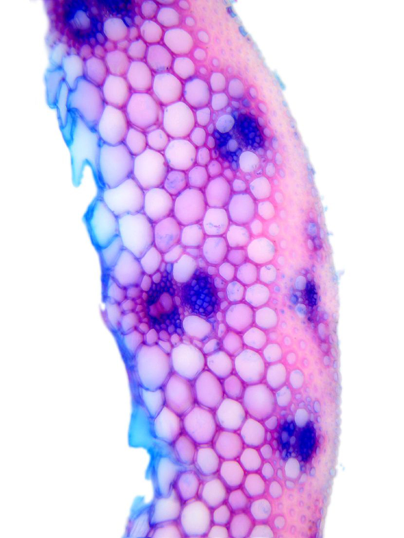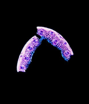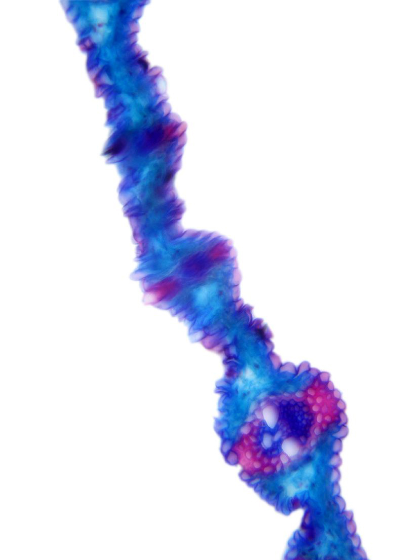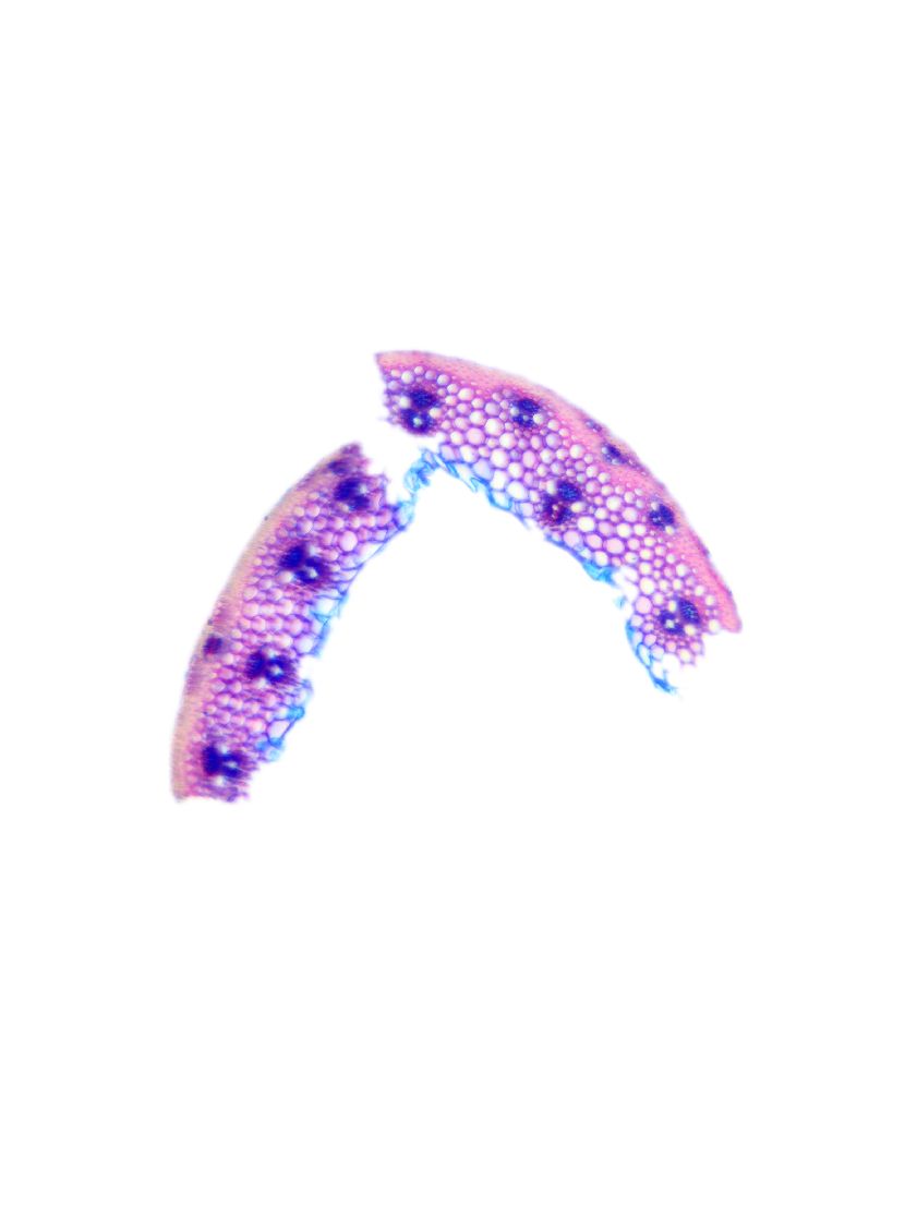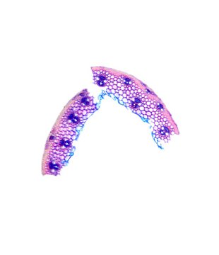 Outline with rips. Upper epidermis cells in one row. Vascular bundles near the lower side of the leaf. Girders extending from the vascular bundle to both sides of the leaf.